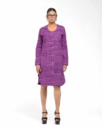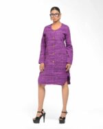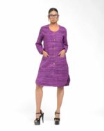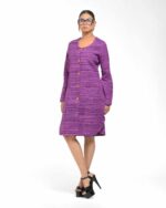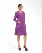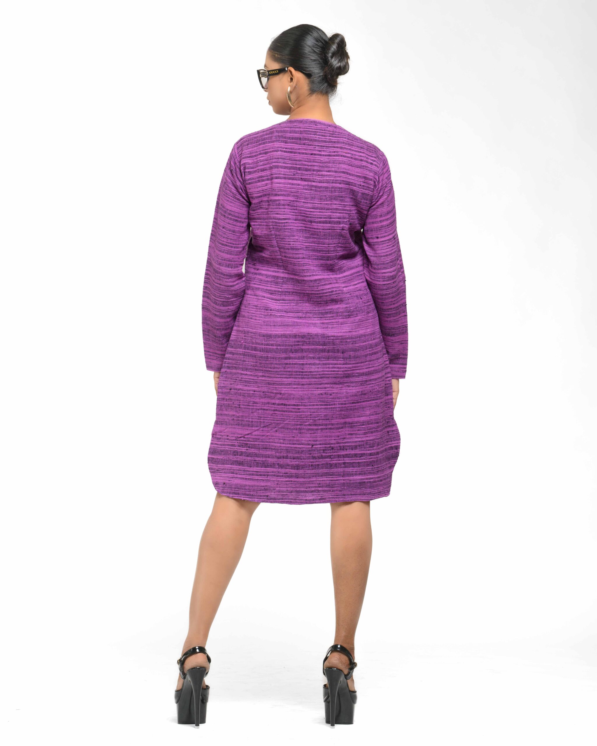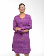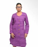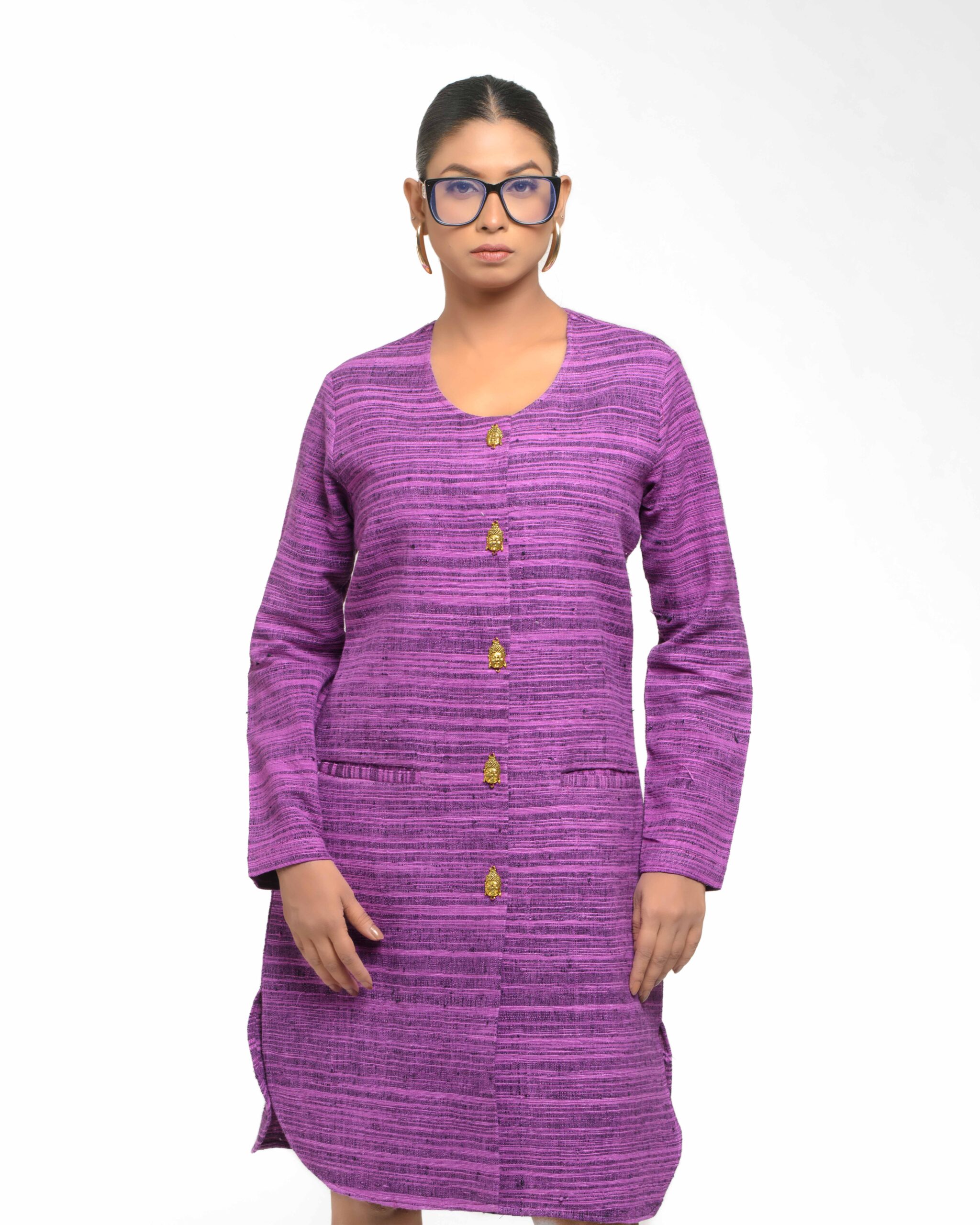 Radiant and bold: This fused coat, crafted from raw Khaddar Khadi, showcases a vibrant, certified azo-free purple dye. The structured silhouette is accented by striking Lord Buddha golden buttons, delivering chic Indo-Western fusion and ethical luxury, honoring the artisan’s “humane touch.”