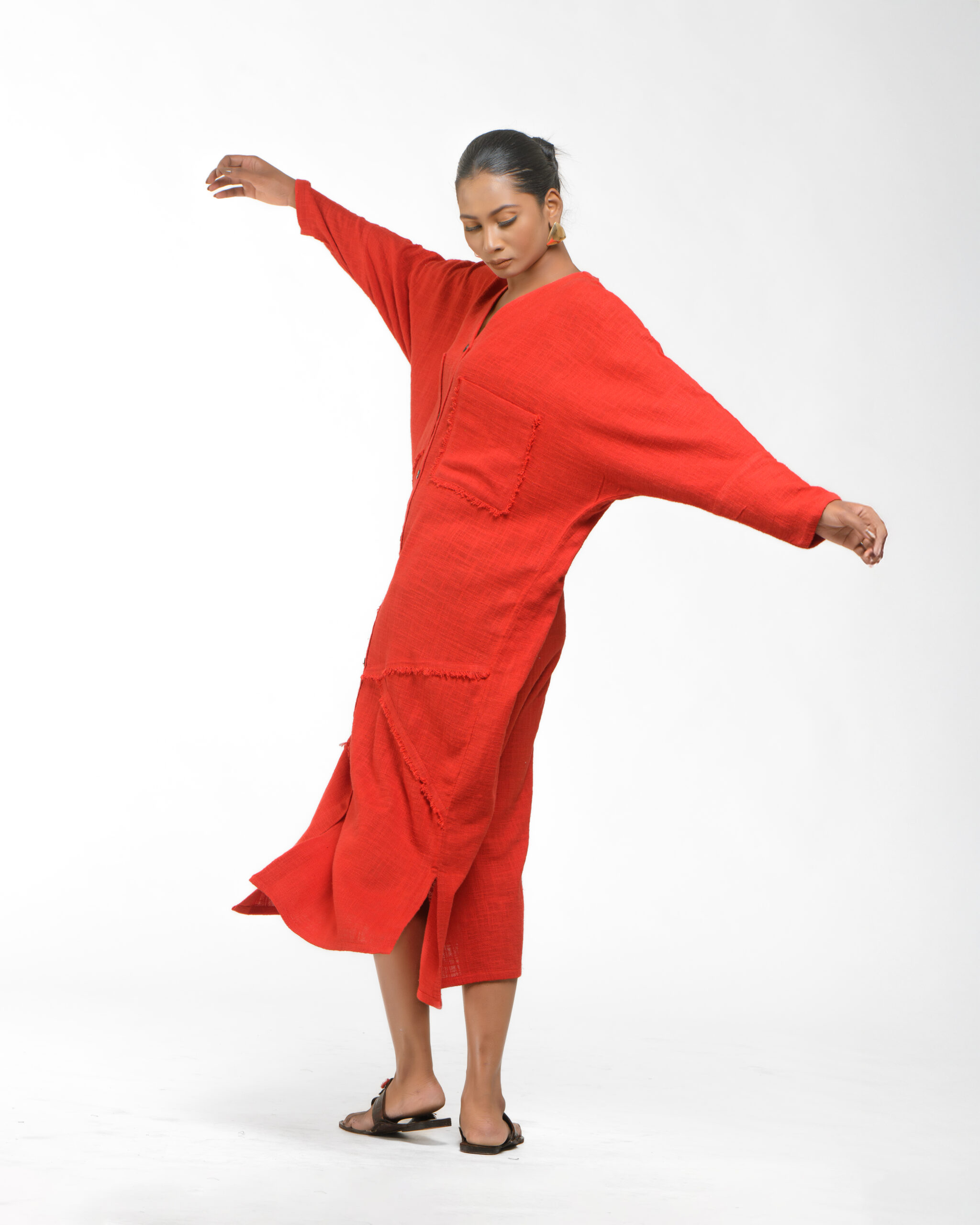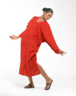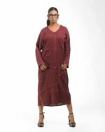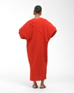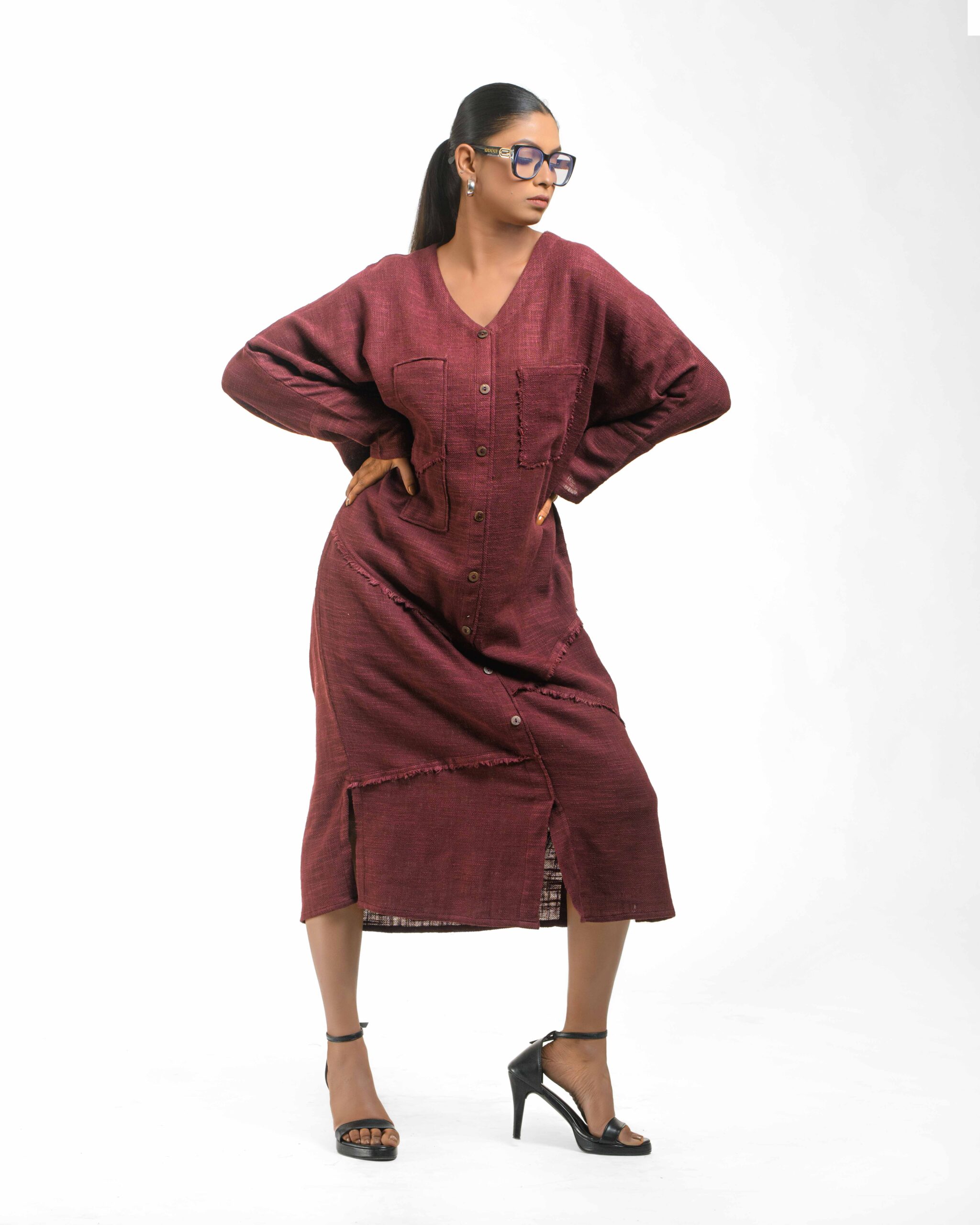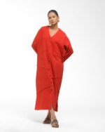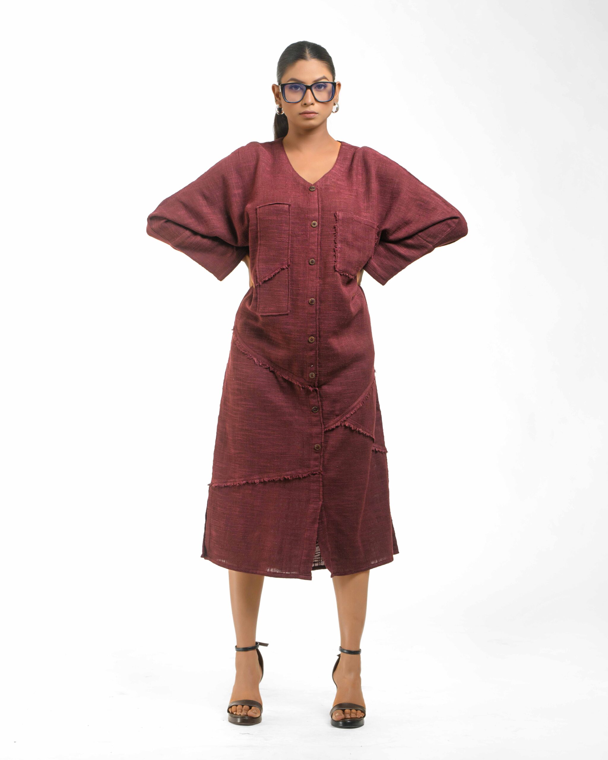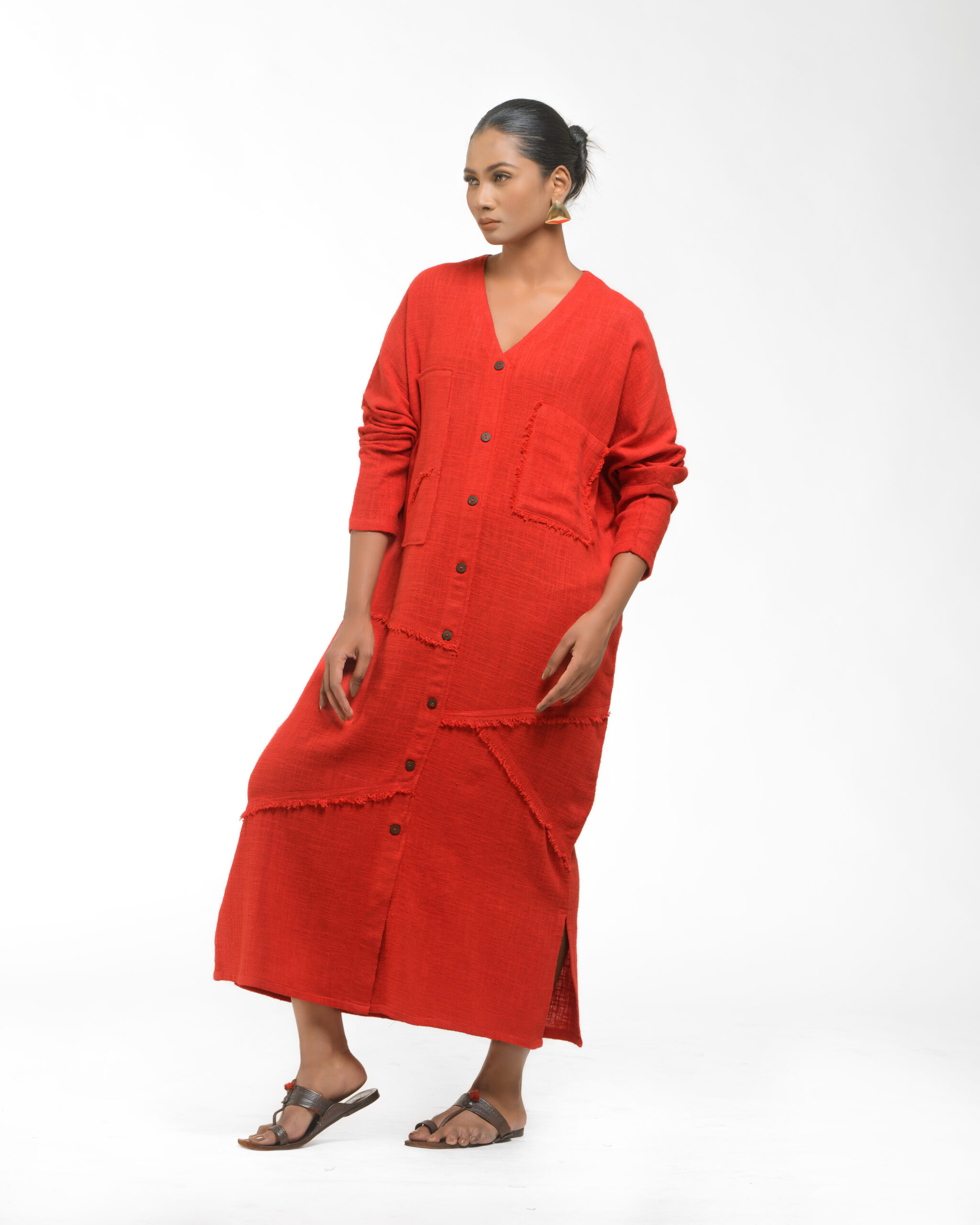Embracing the free spirit: This oversized Boho dress is crafted from super flowy, light slub Khadi and dyed with certified azo-free dyes for purity. The dramatic, multi-tiered fringe detailing and collarless neck ensure maximum comfort and effortless style, honoring the artisan’s “humane touch.”