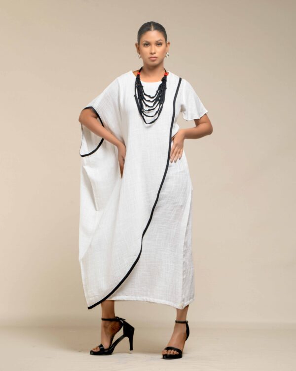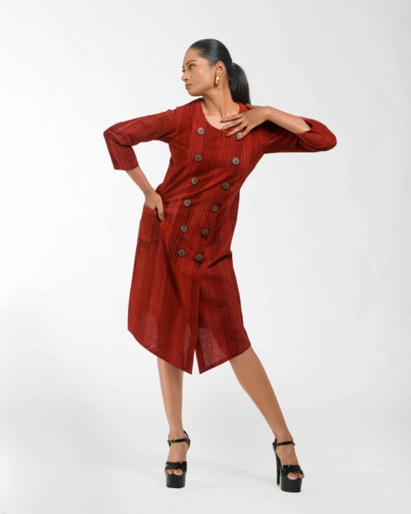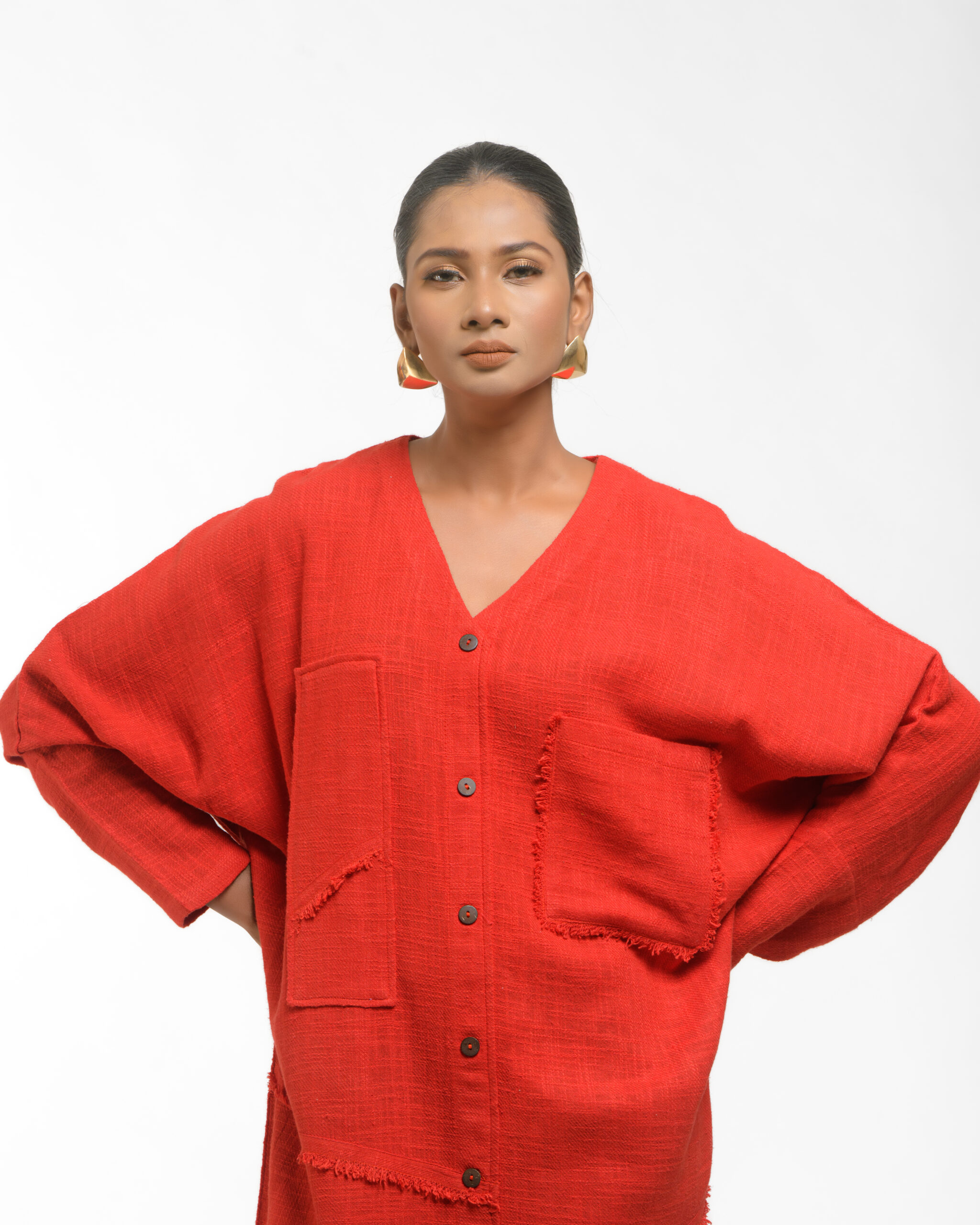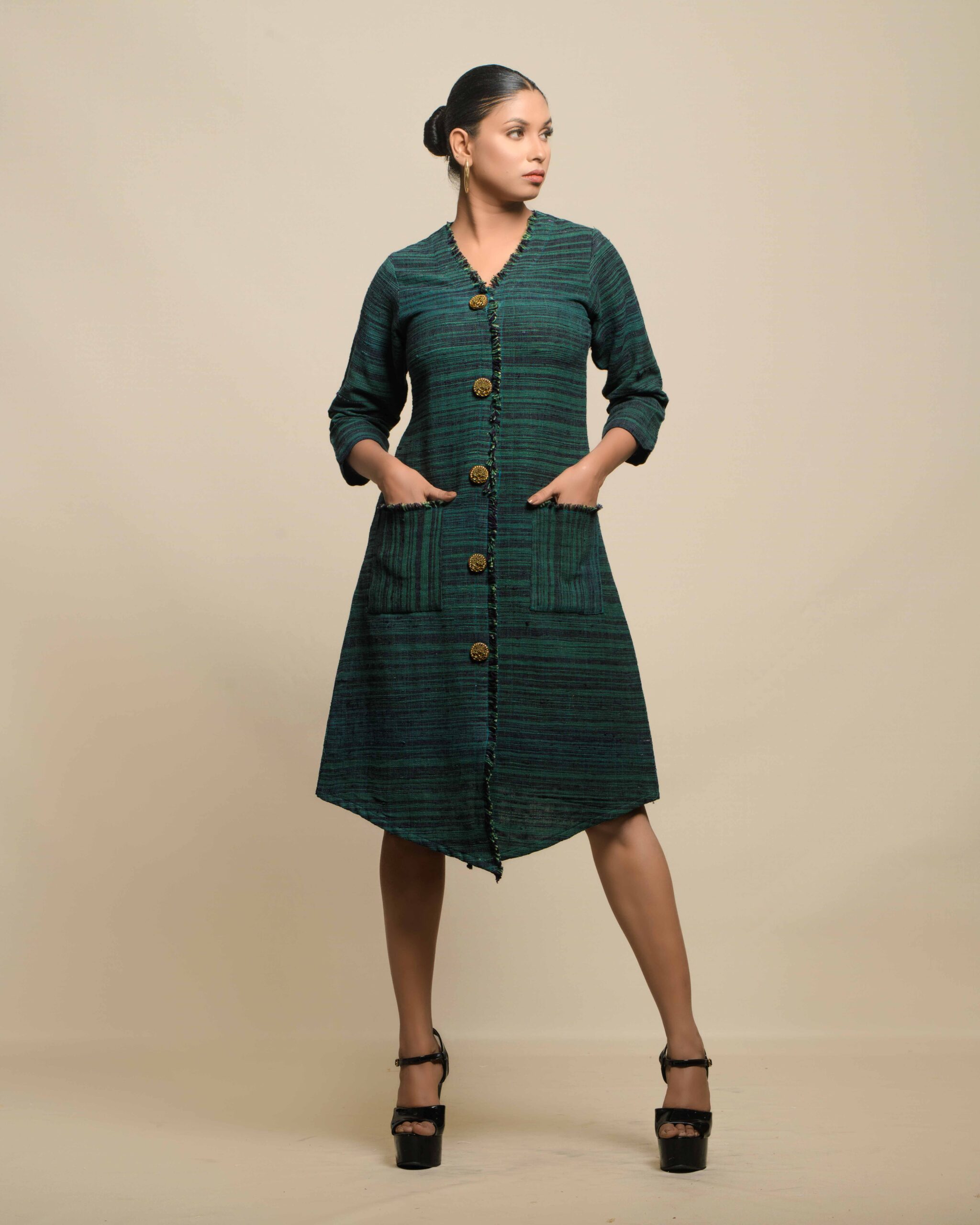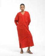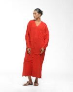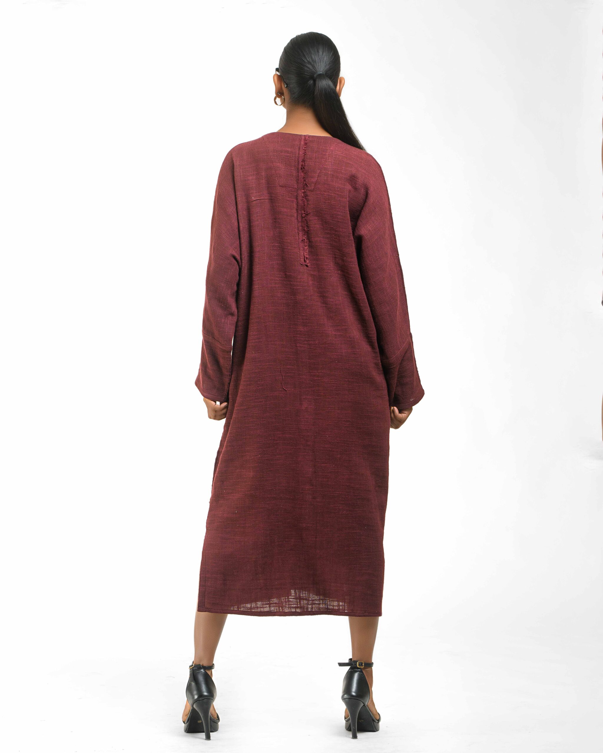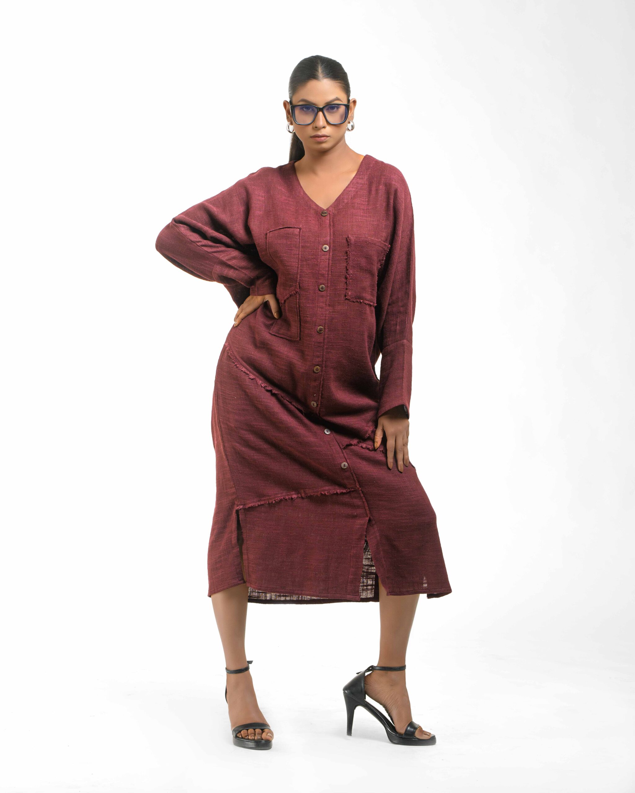 Embracing the free spirit: This oversized Boho dress is crafted from super flowy, light slub Khadi and dyed with certified azo-free dyes for purity. The dramatic, multi-tiered fringe detailing and collarless neck ensure maximum comfort and effortless style, honoring the artisan’s “humane touch.”