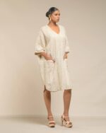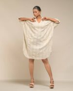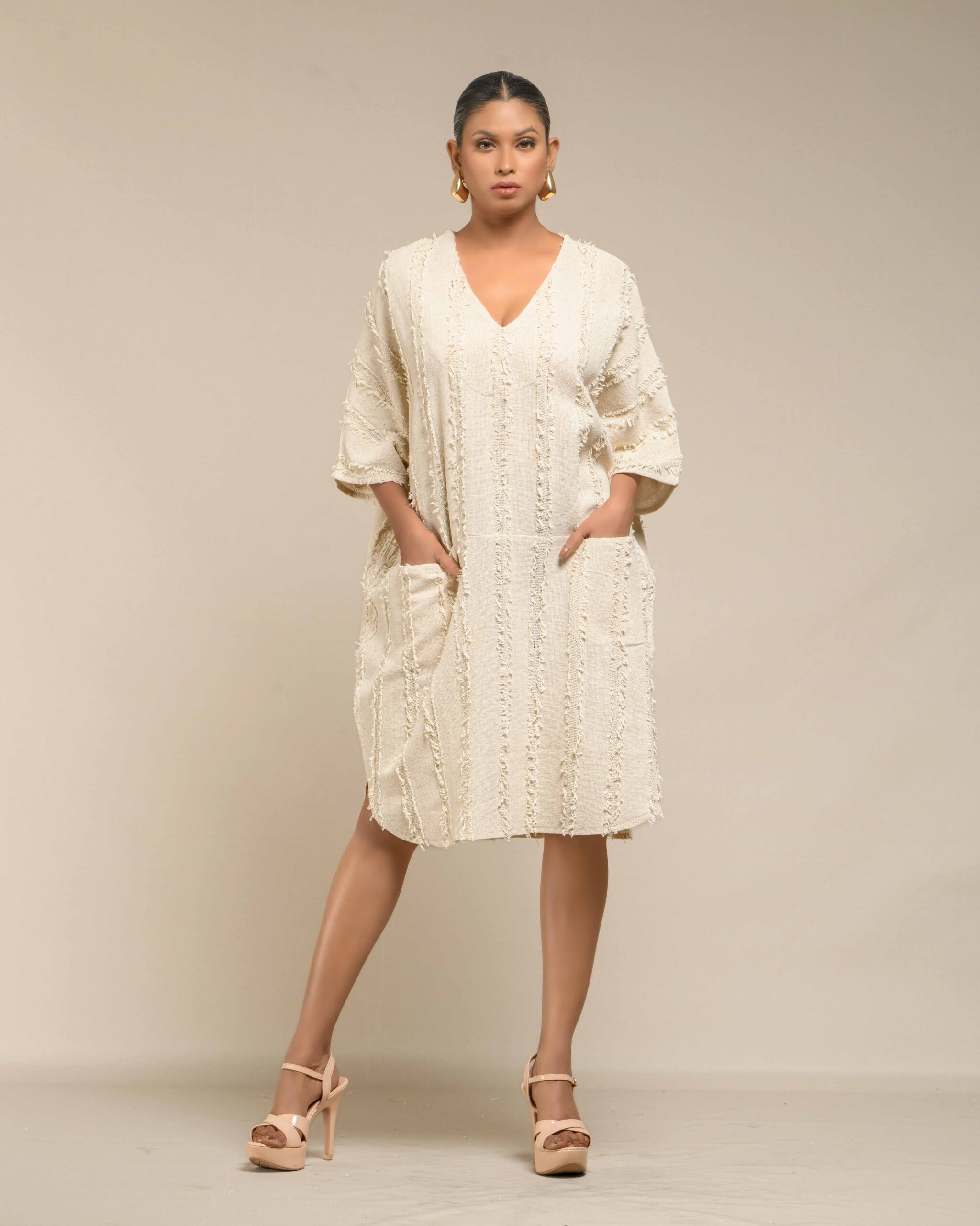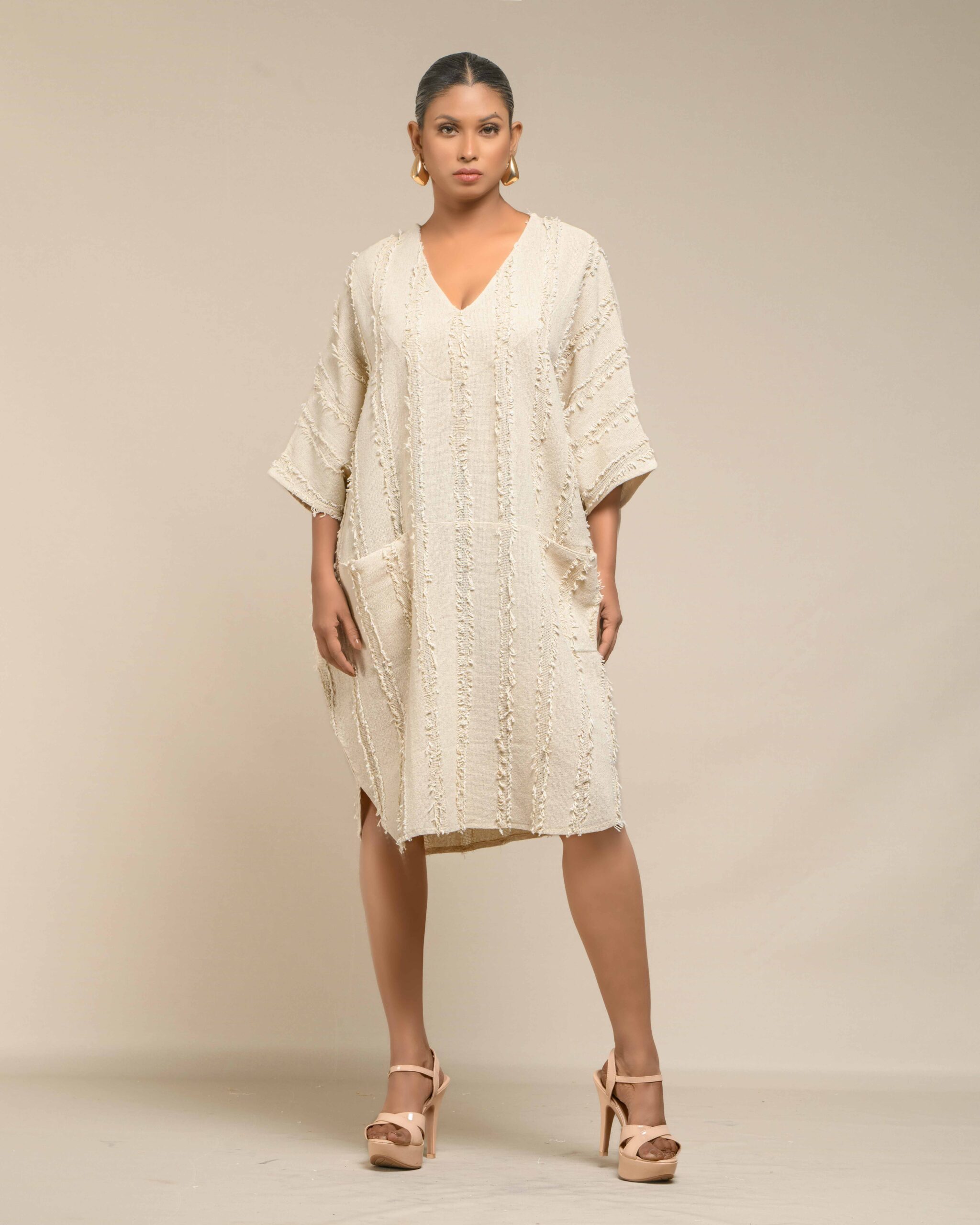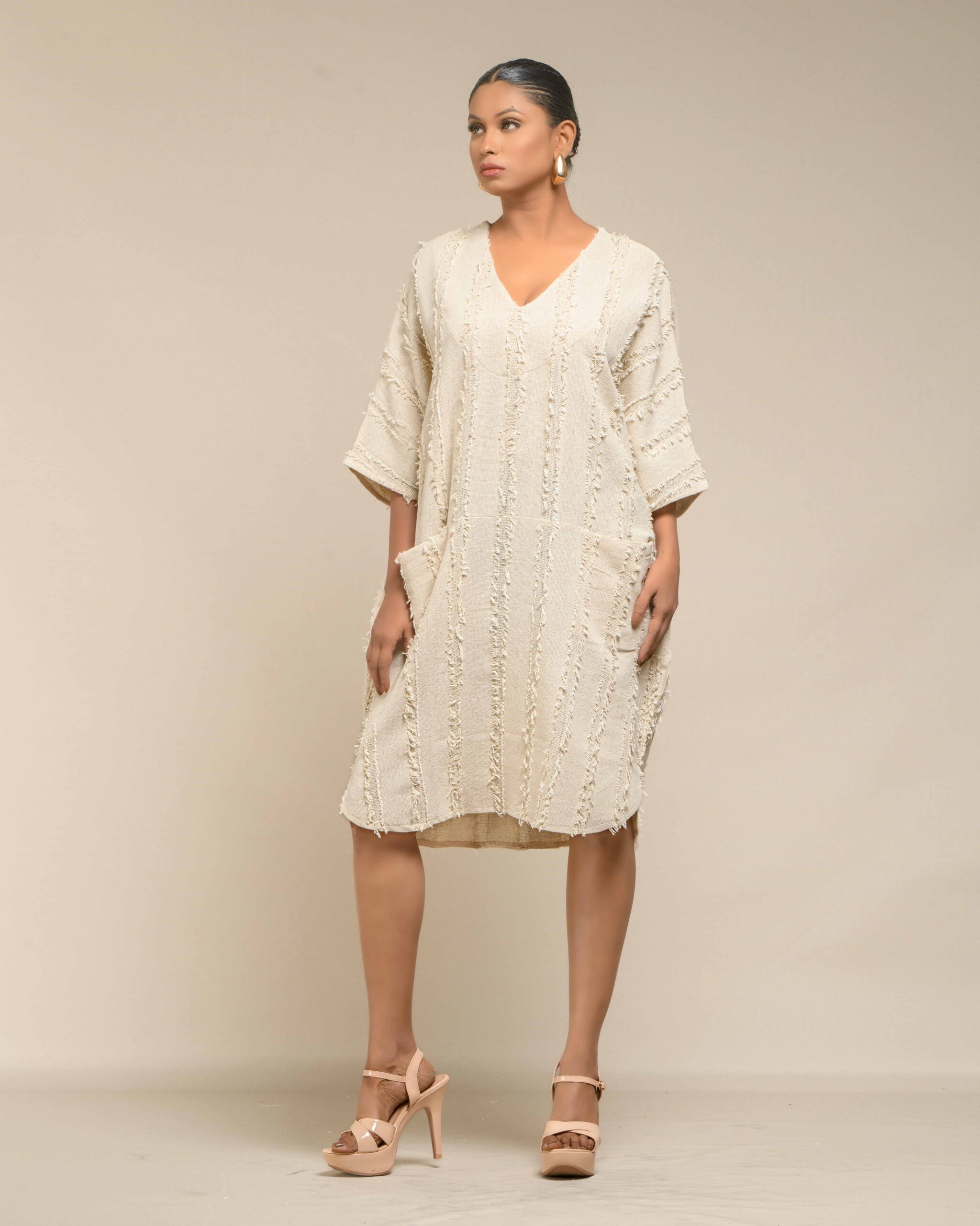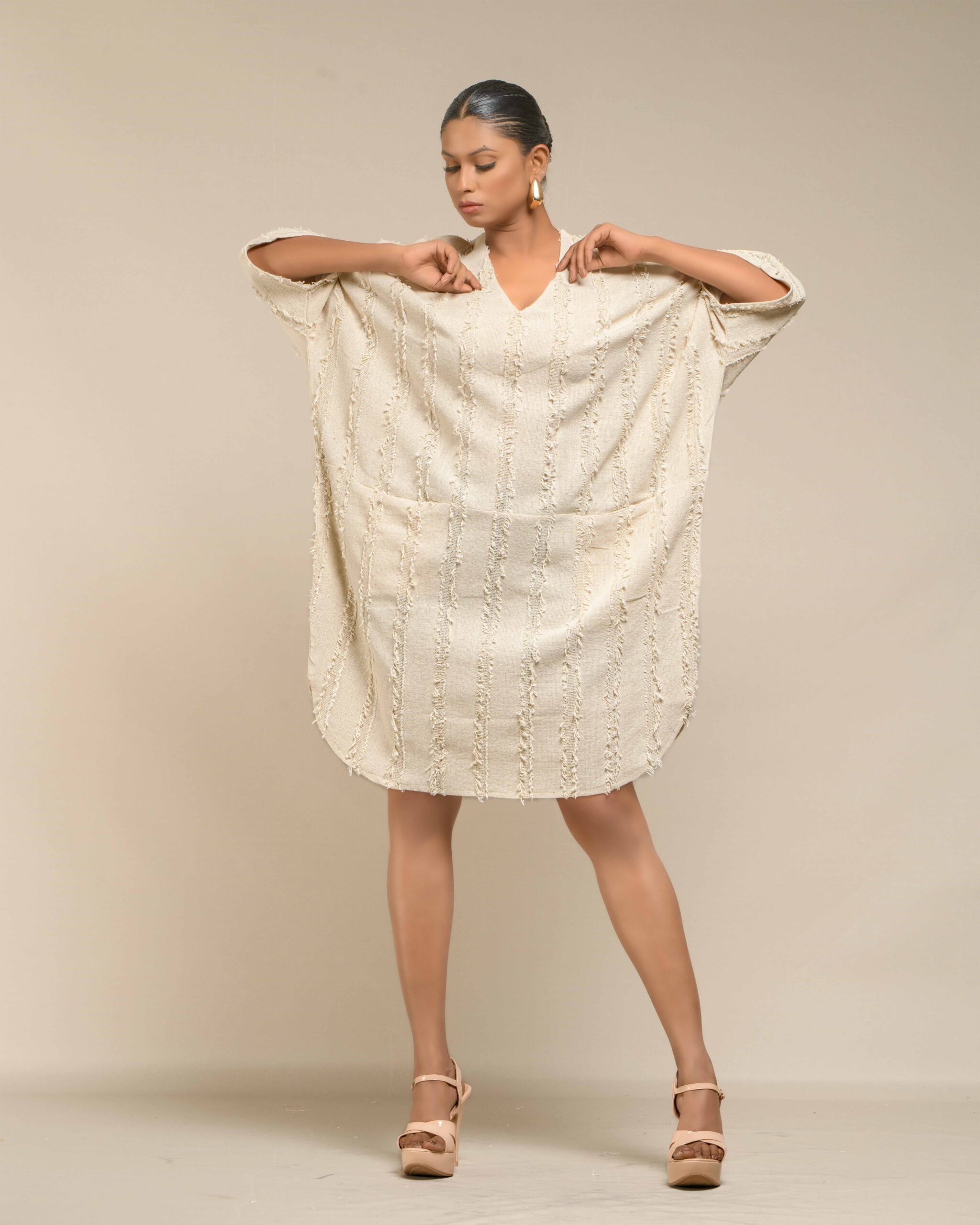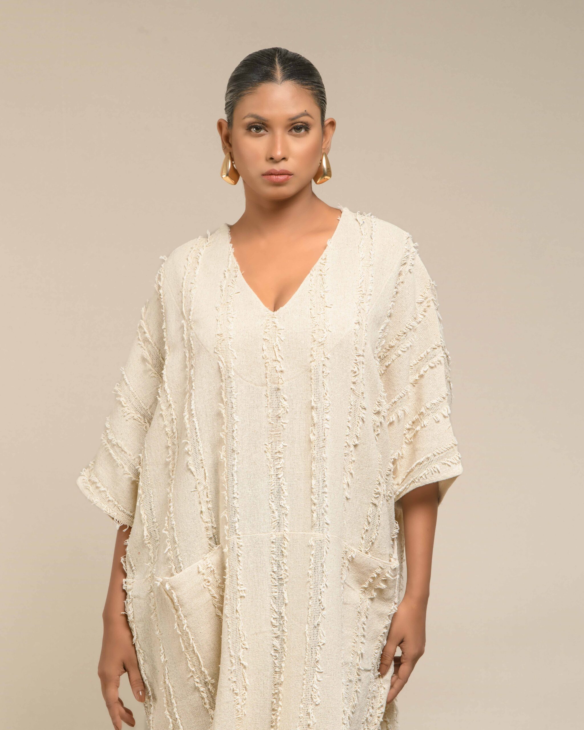 Silent luxury redefined: This undyed handloom cotton dress, featuring a free-size, baggy fit, prioritizes pure comfort and style. Our signature striped fringes (USP) create rich, all-over texture, perfectly merging authentic craft with a modern aesthetic. It’s a conscious statement, honoring the zero-chemical process and the artisan’s “humane touch.”