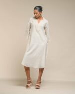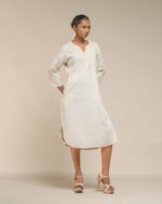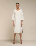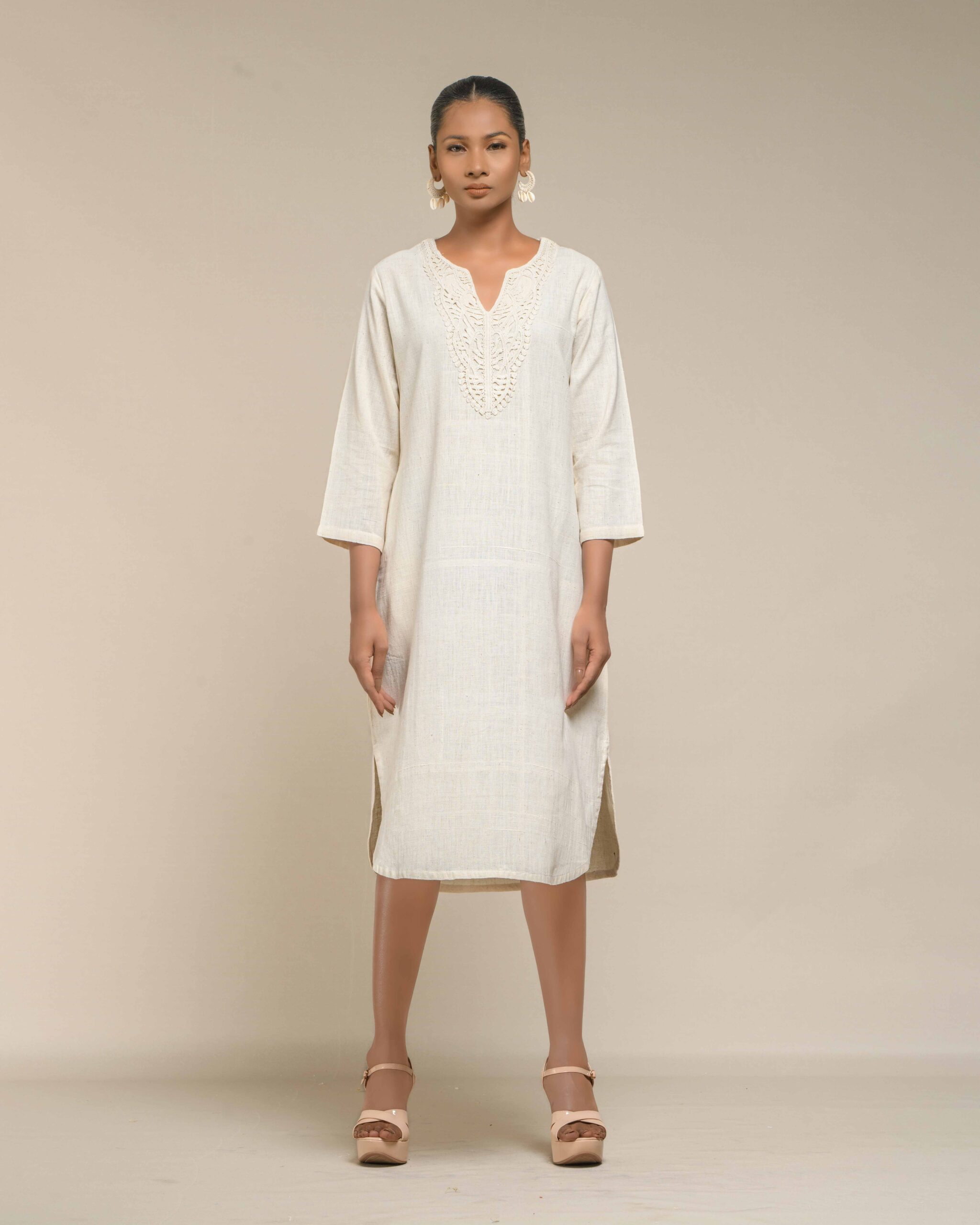 Minimalist luxury in pure undyed Kora Khadi, this soft kurta guarantees zero-irritation comfort. The intricate crochet neck detailing provides an impactful artisanal finish, perfectly blending elegance and heritage. It embodies the “humane touch” of sustainable, hand-spun craft.