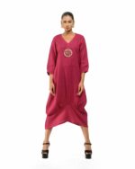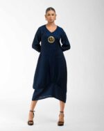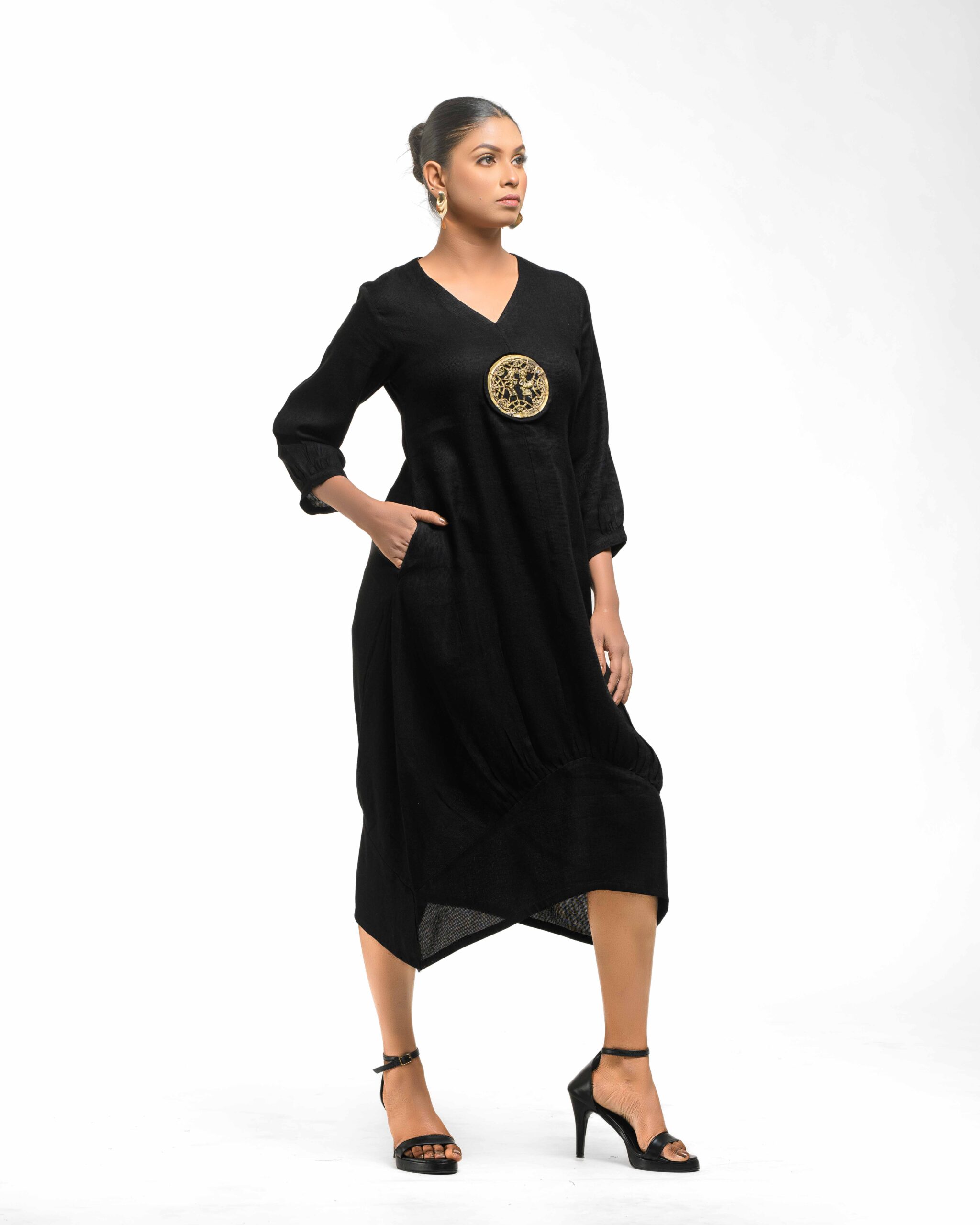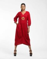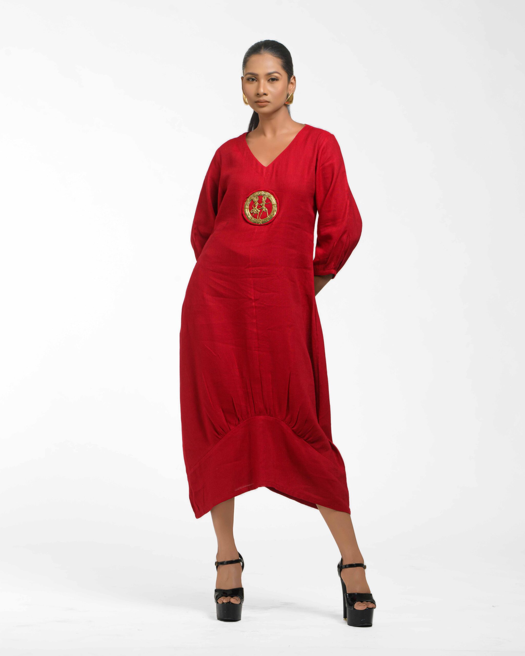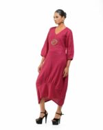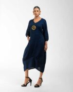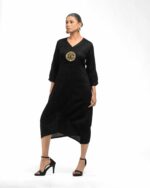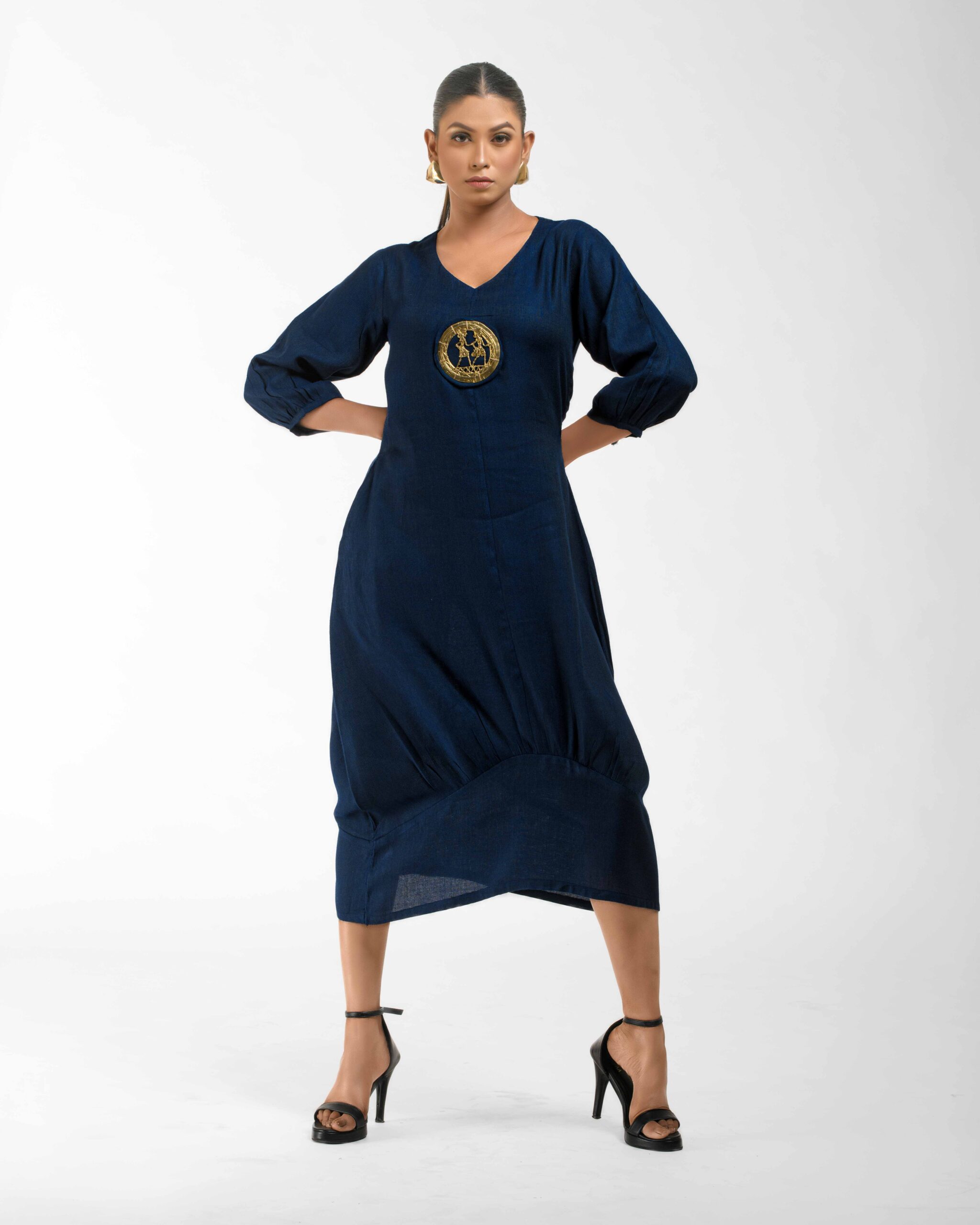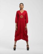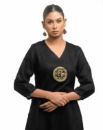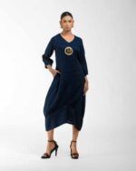 Sculpted in soft, breathable handloom cotton linen, this striking bottom gathered dress crafted with “novel and modern cuts”. The design is anchored by authentic, round Dokra metal art from Chhattisgarh, celebrating India’s rich craft heritage. Wearable elegance that honors the “humane touch” of the artisan in every detail.