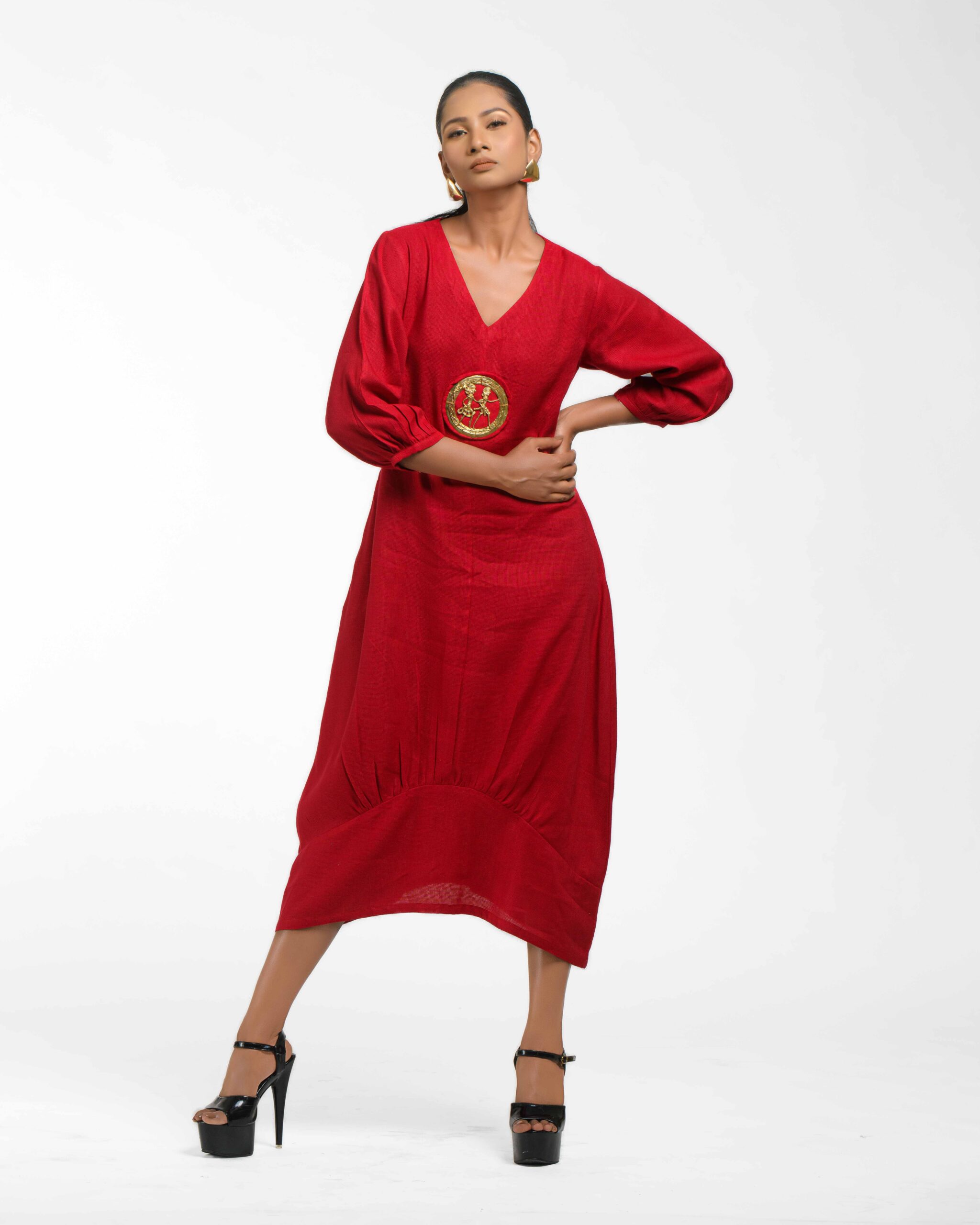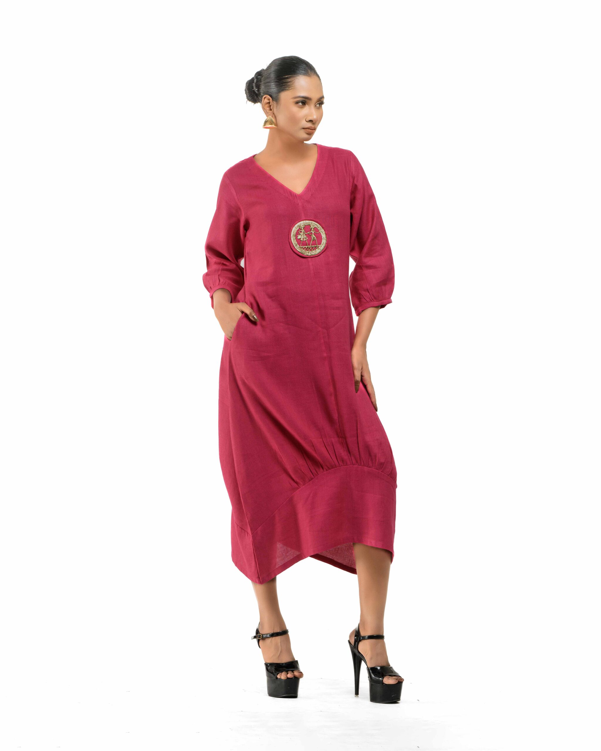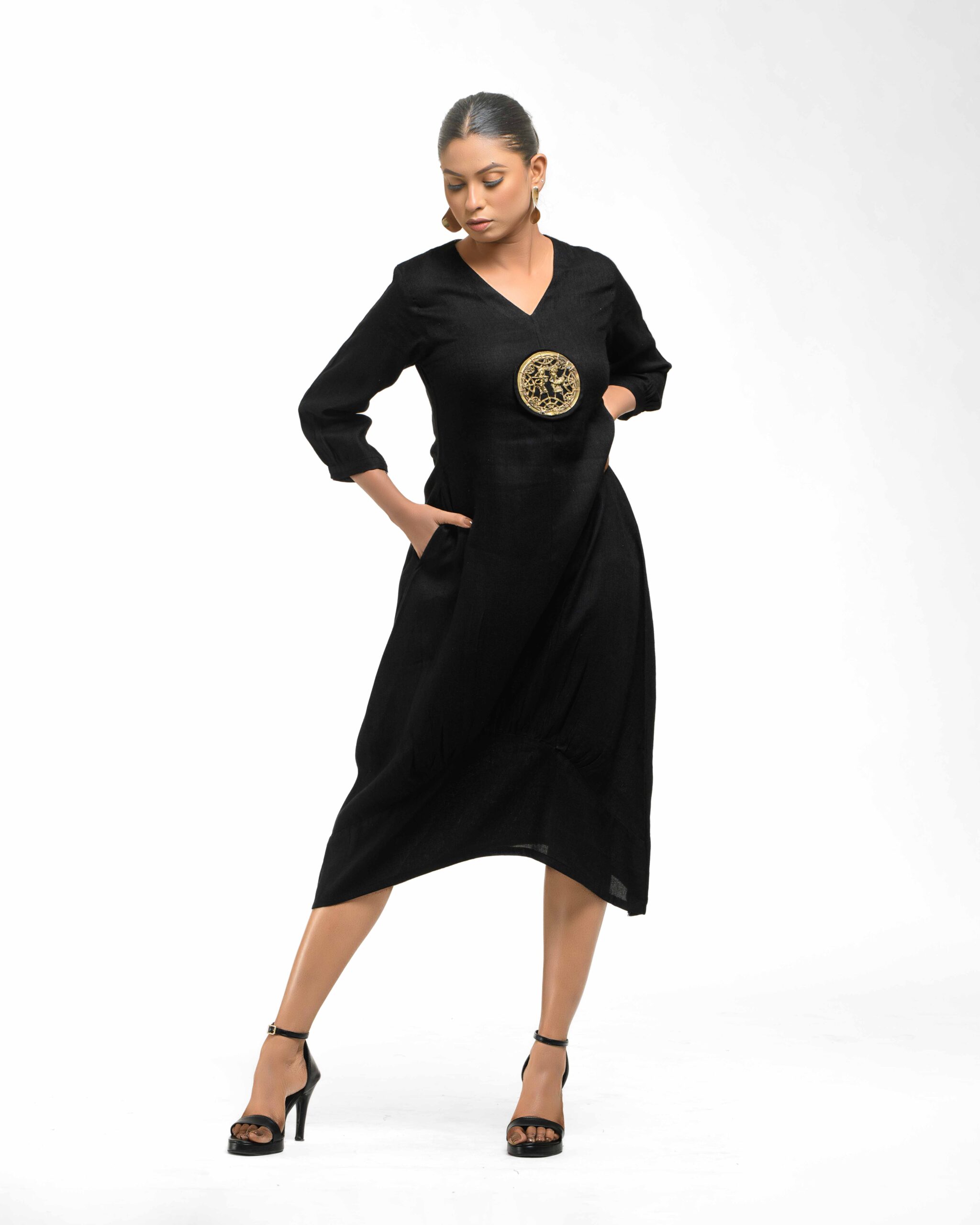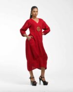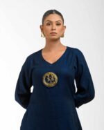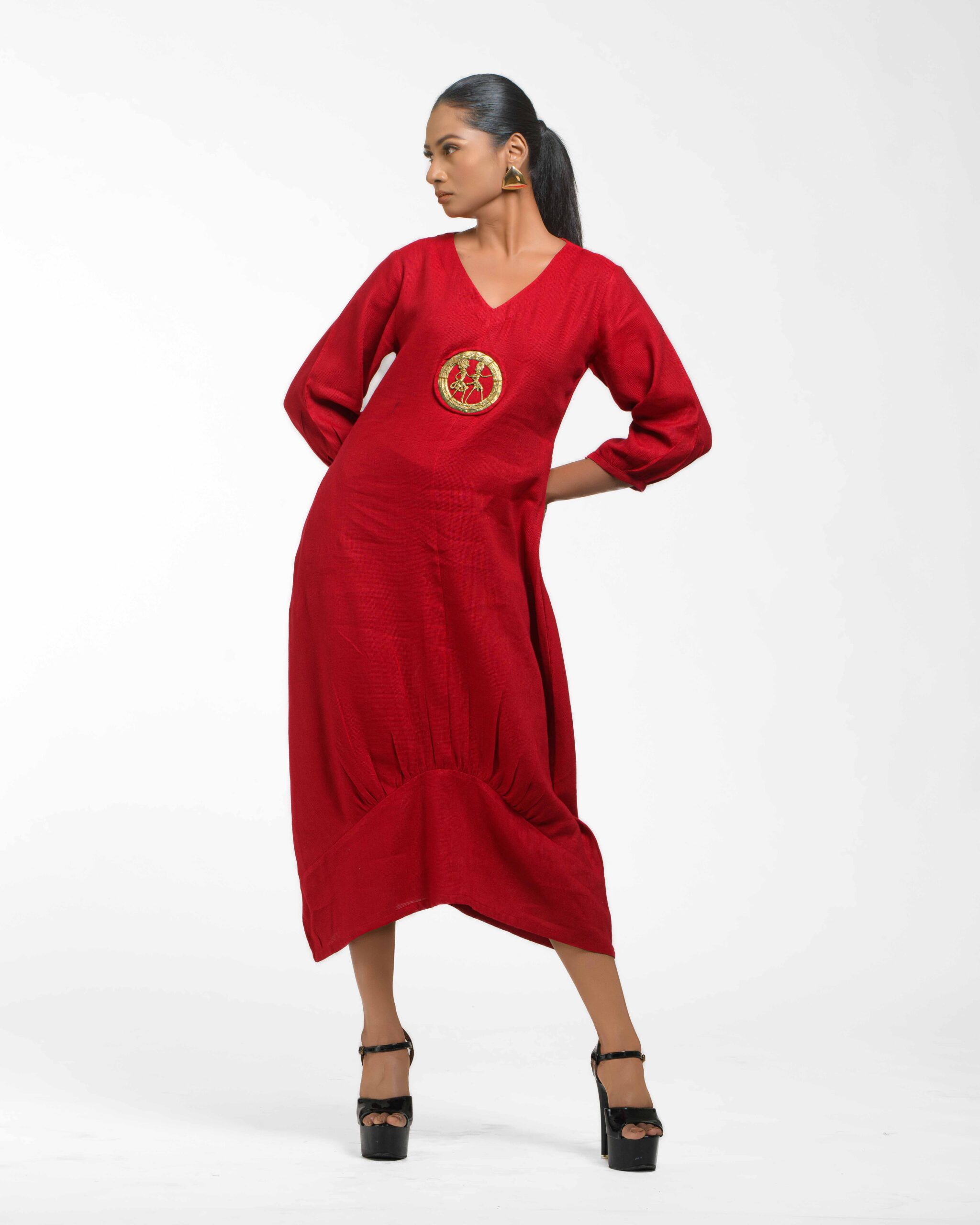 Sculpted in soft, breathable handloom cotton linen, this striking bottom gathered dress crafted with “novel and modern cuts”. The design is anchored by authentic, round Dokra metal art from Chhattisgarh, celebrating India’s rich craft heritage. Wearable elegance that honors the “humane touch” of the artisan in every detail.