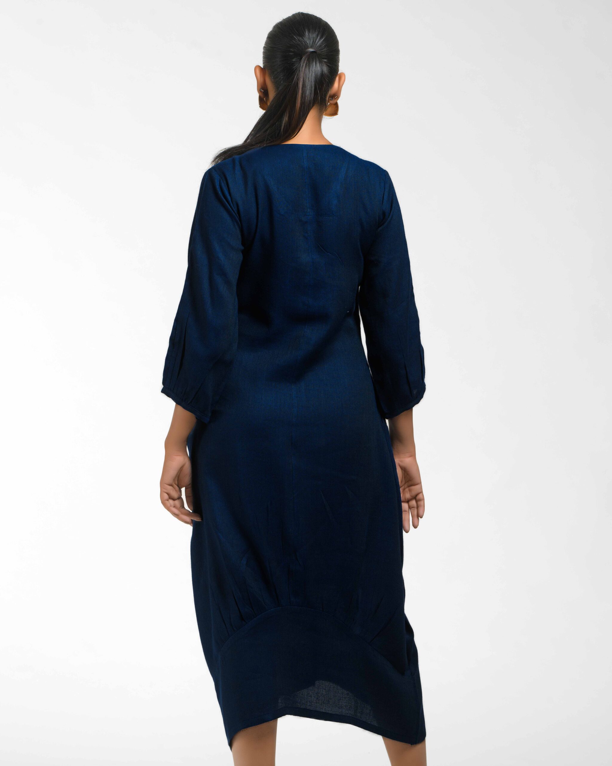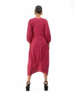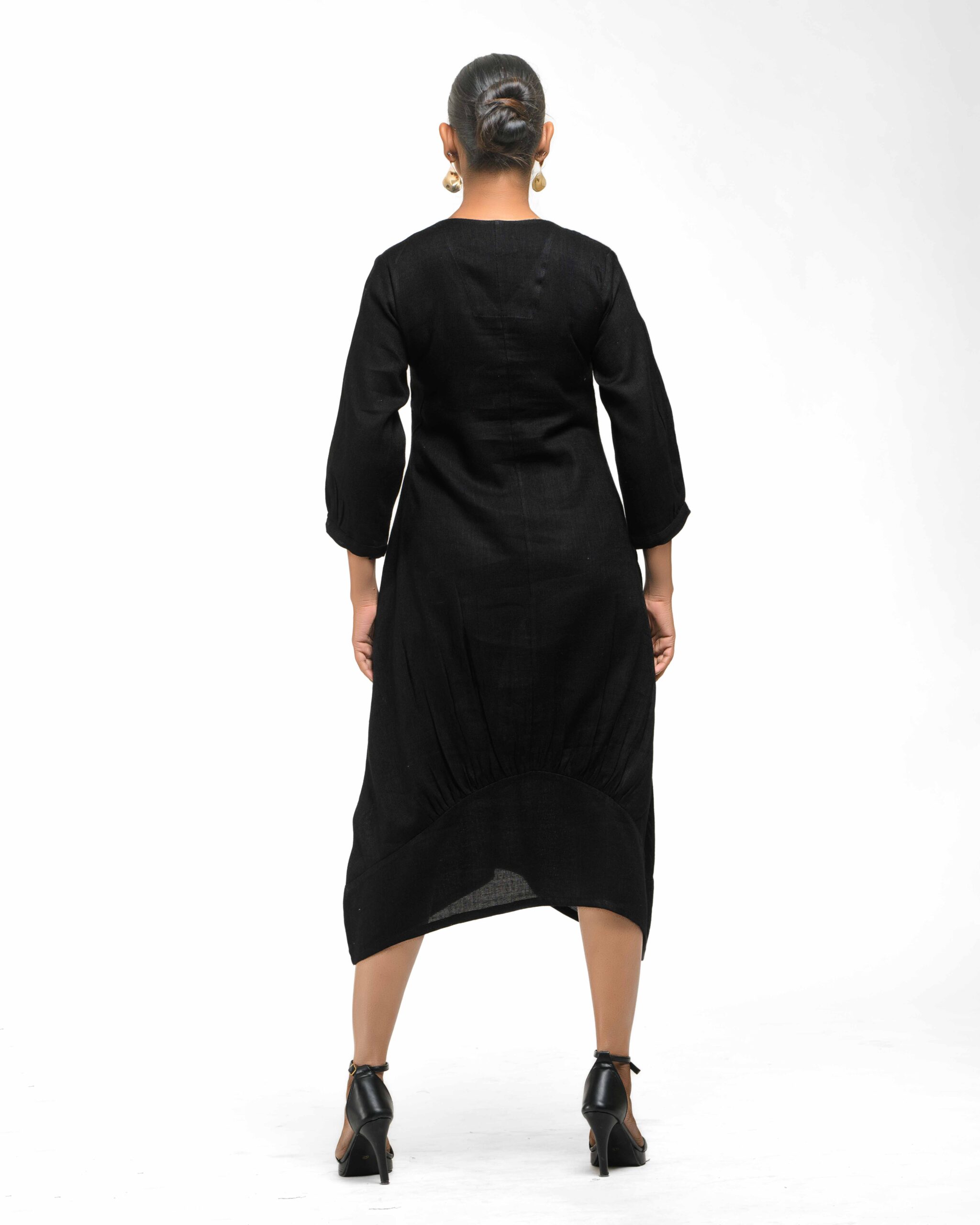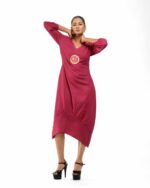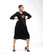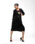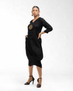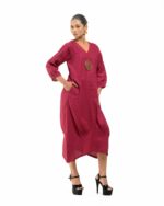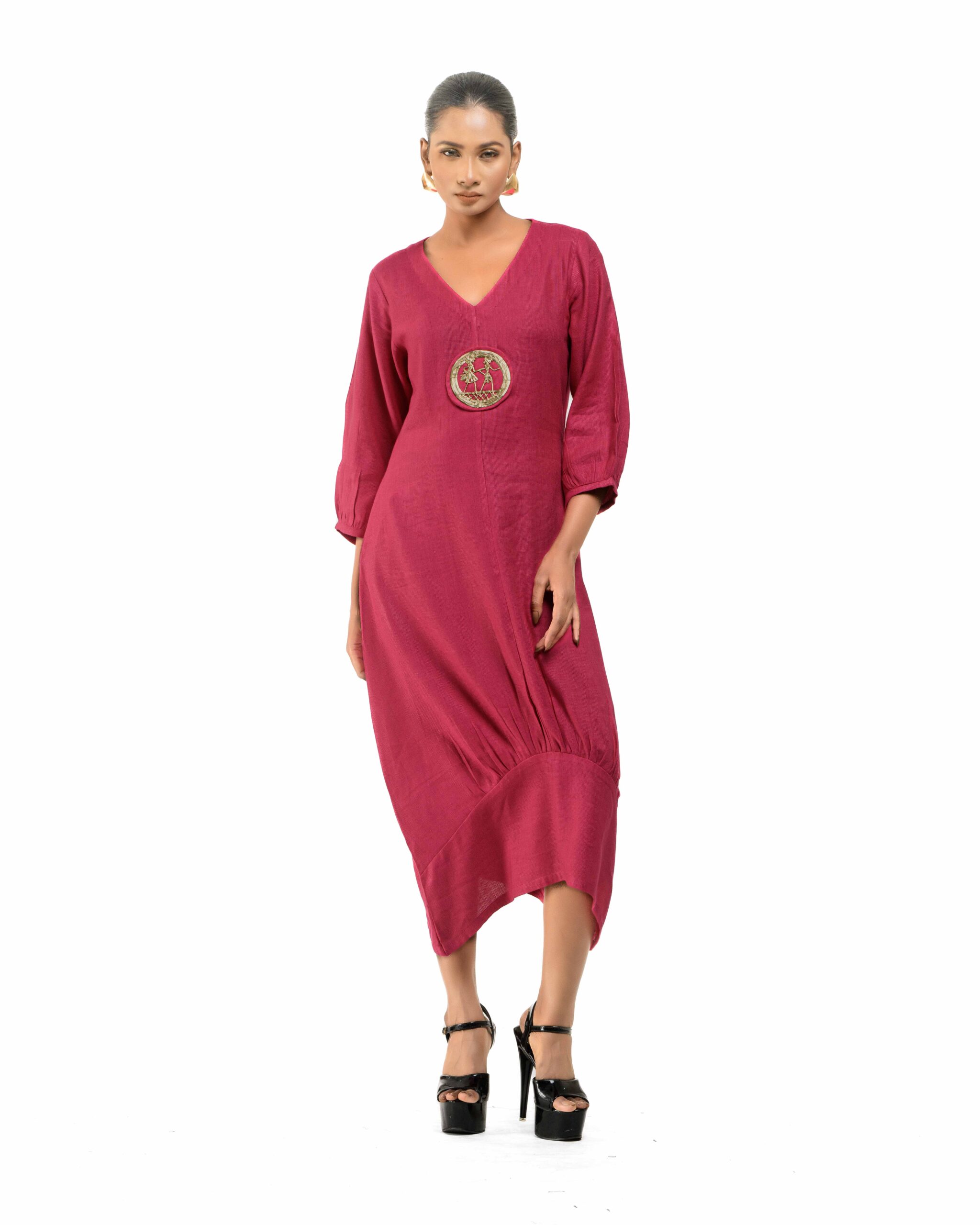 Sculpted in soft, breathable handloom cotton linen, this striking bottom gathered dress crafted with “novel and modern cuts”. The design is anchored by authentic, round Dokra metal art from Chhattisgarh, celebrating India’s rich craft heritage. Wearable elegance that honors the “humane touch” of the artisan in every detail.