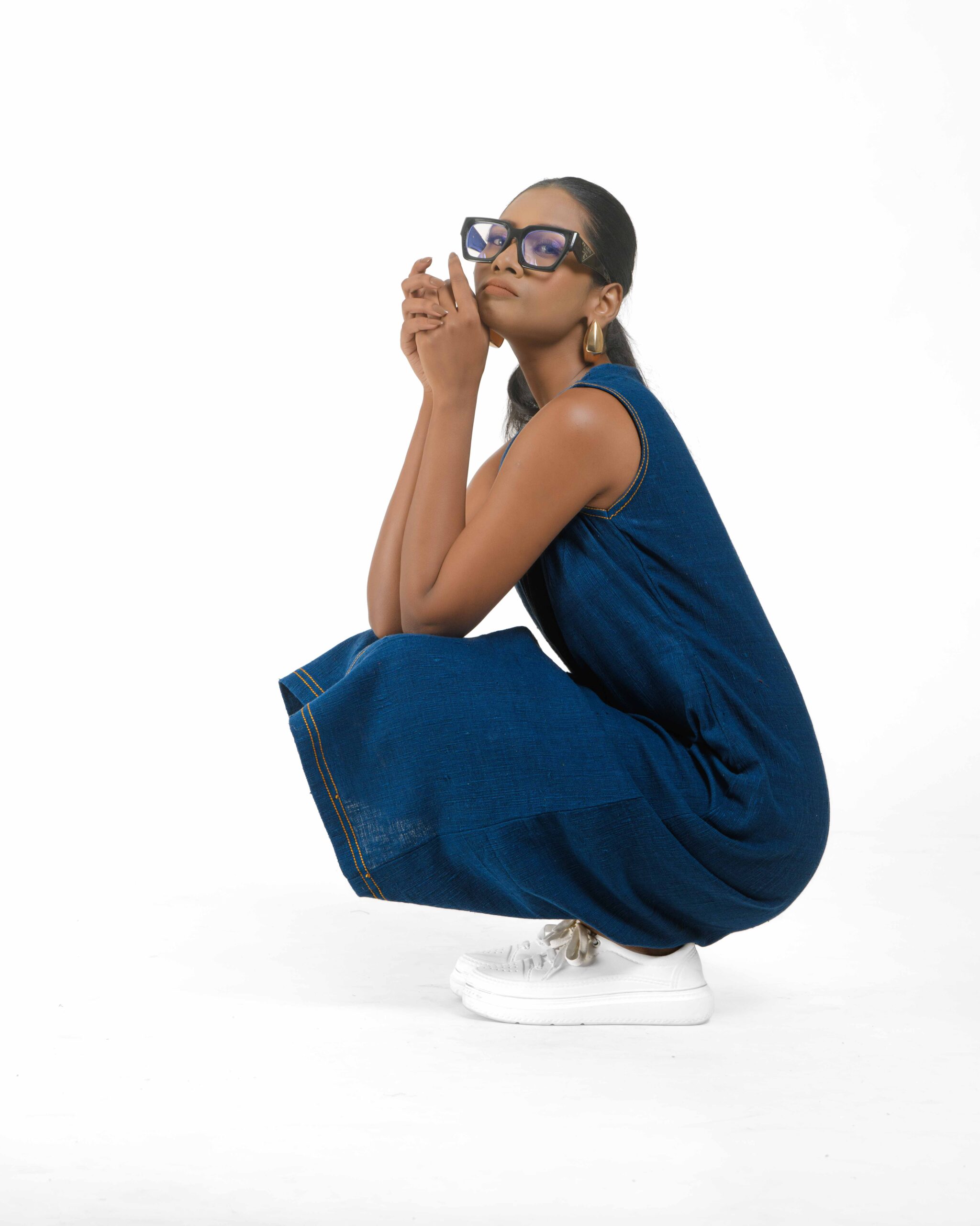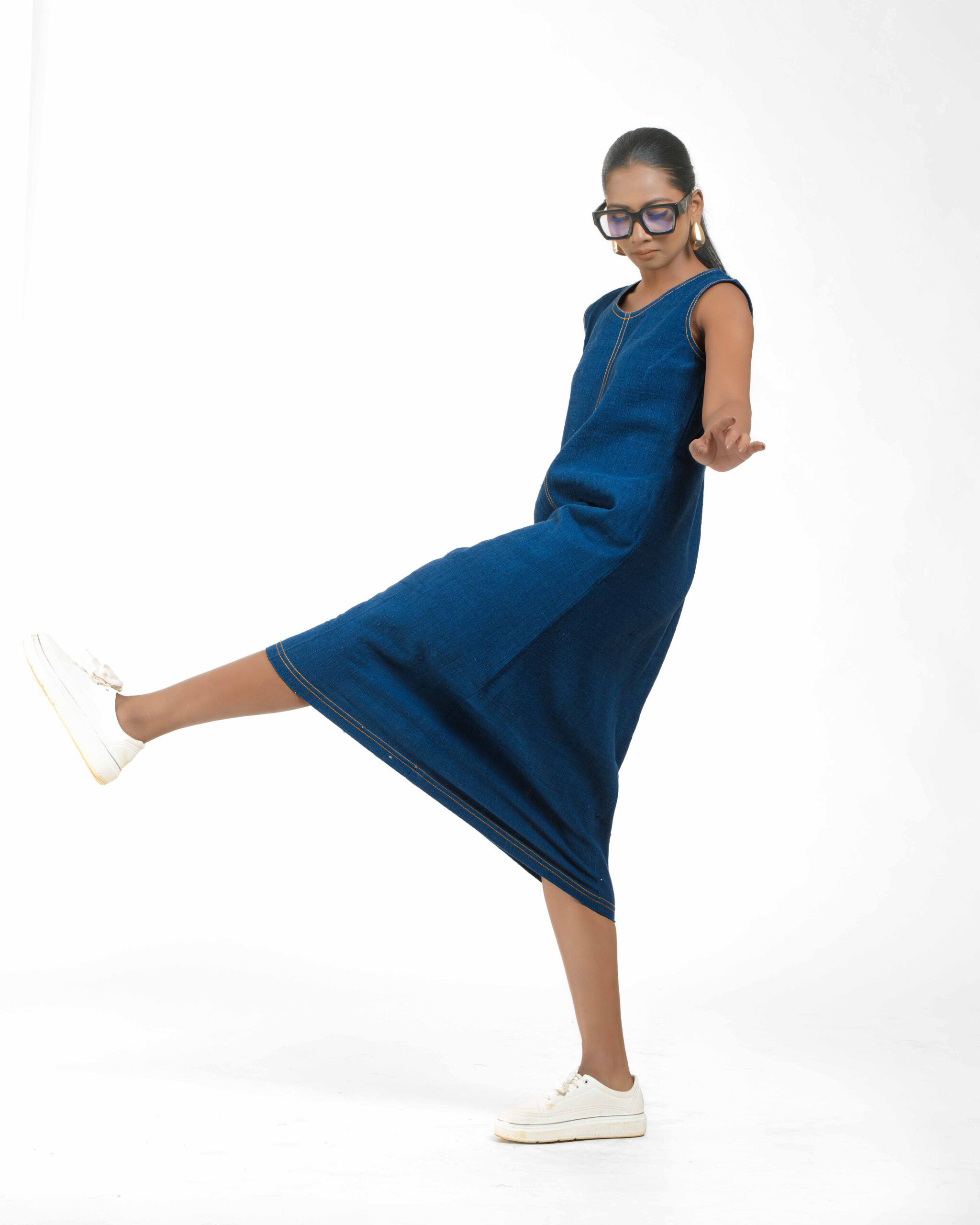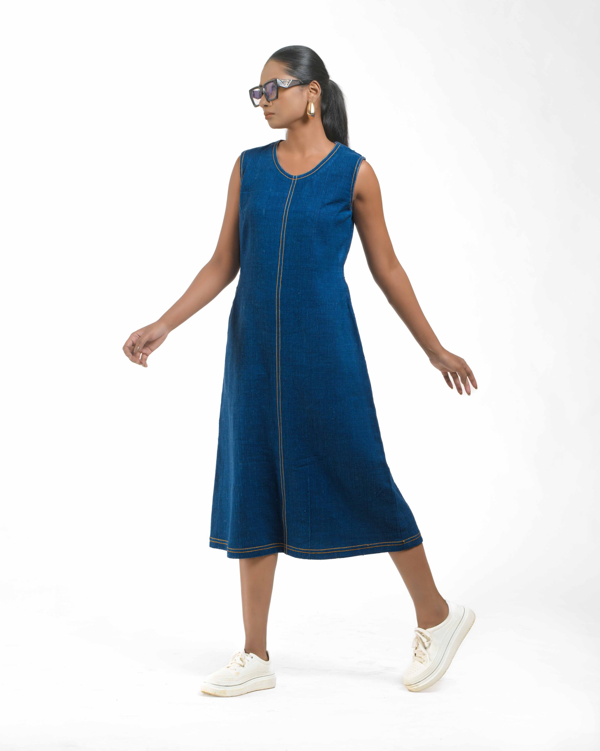 Introducing a uniquely modern concept: a pure Khaddar Khadi dress that perfectly mimics the look of denim. Coloured using ethical Azo-Free dyes, the contemporary silhouette is given its final signature finish by the crisp contrast double stitching. This is a freshly launched piece that offers comfort, sustainability, and a truly original style statement.