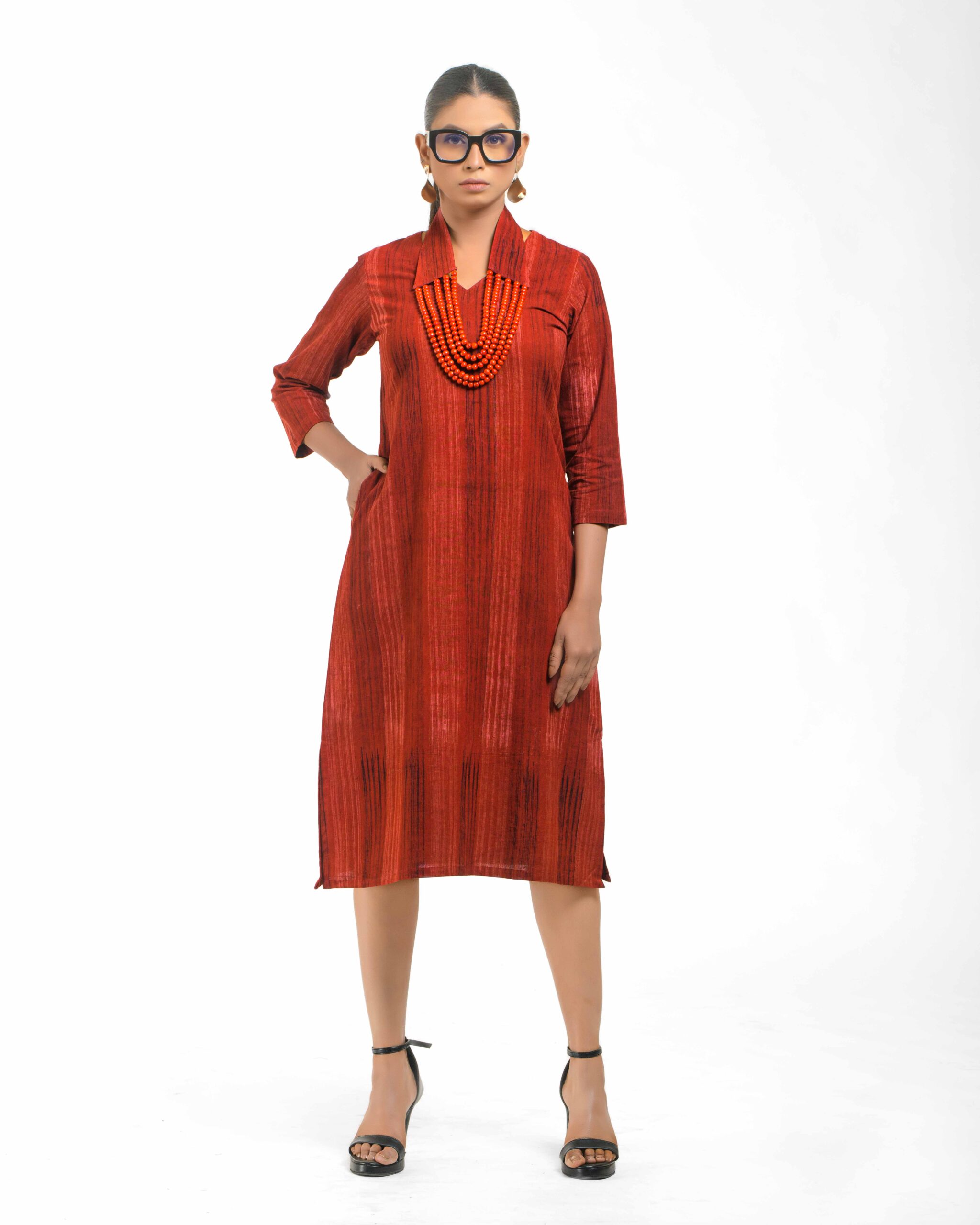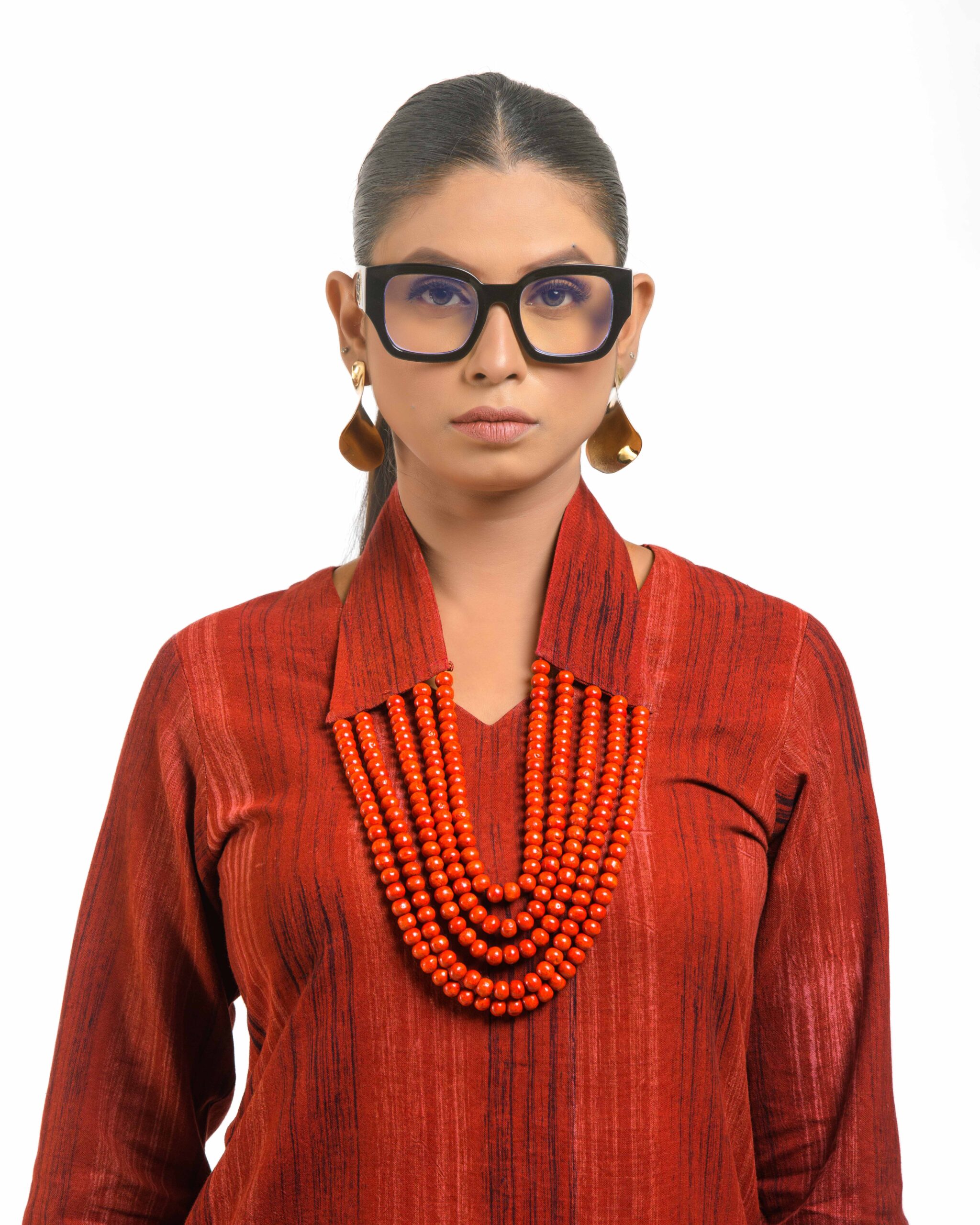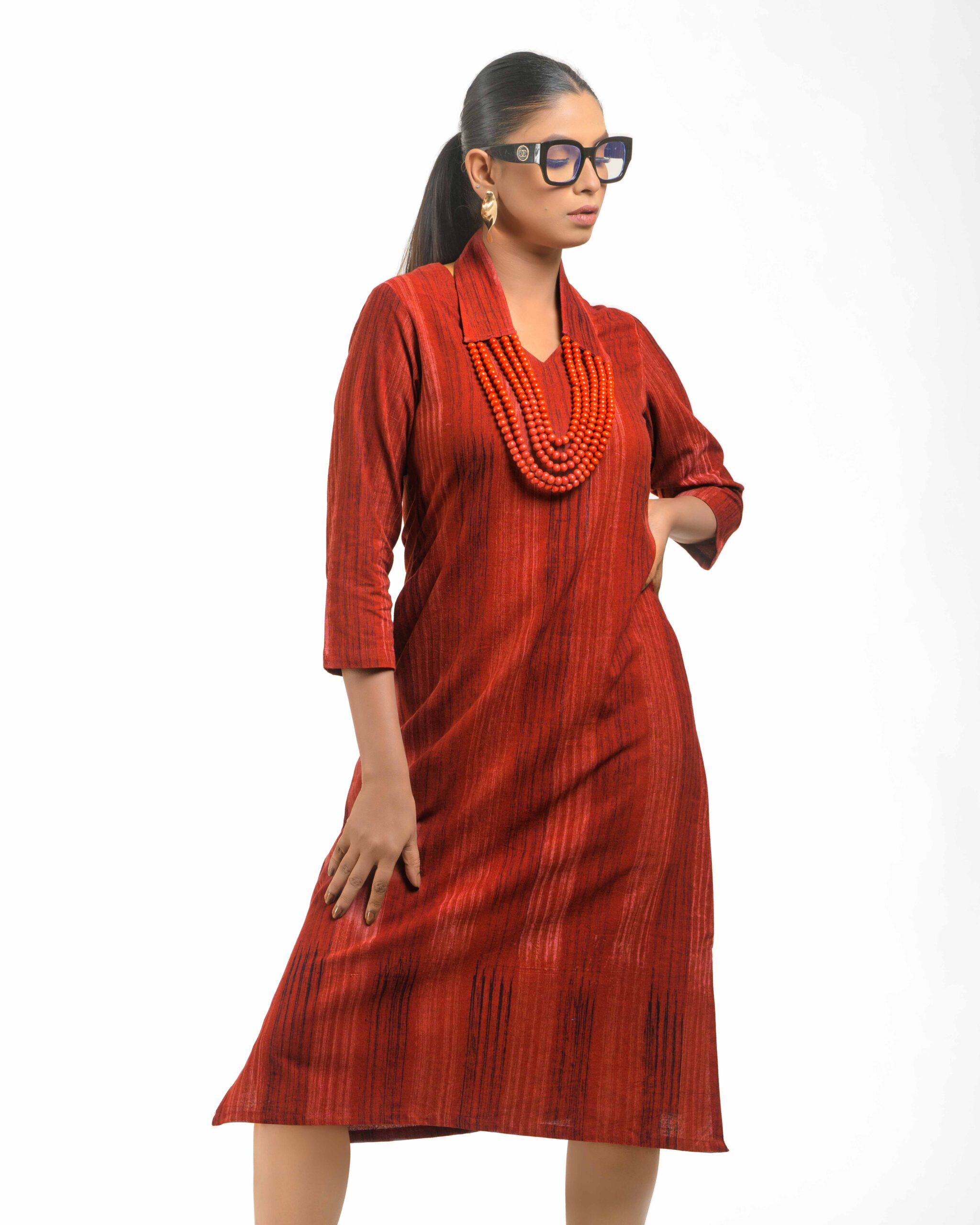 Crafted from soft, hand brush-printed Khadi, the Mitti Brushwood Tunic offers an earthy, artistic aesthetic. It comes with a detachable, handcrafted collar-style necklace featuring wooden beads, defining versatile, conscious luxury.
