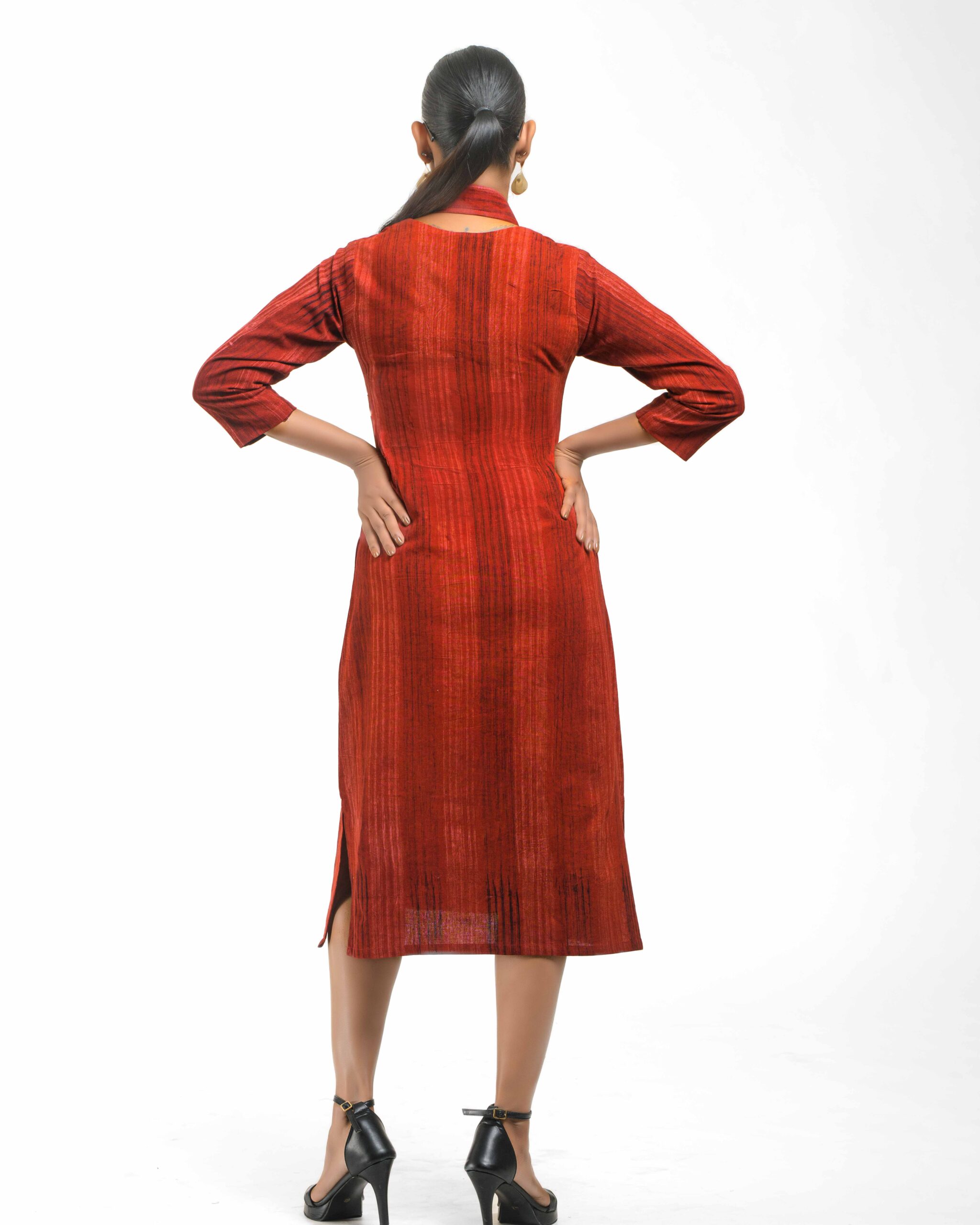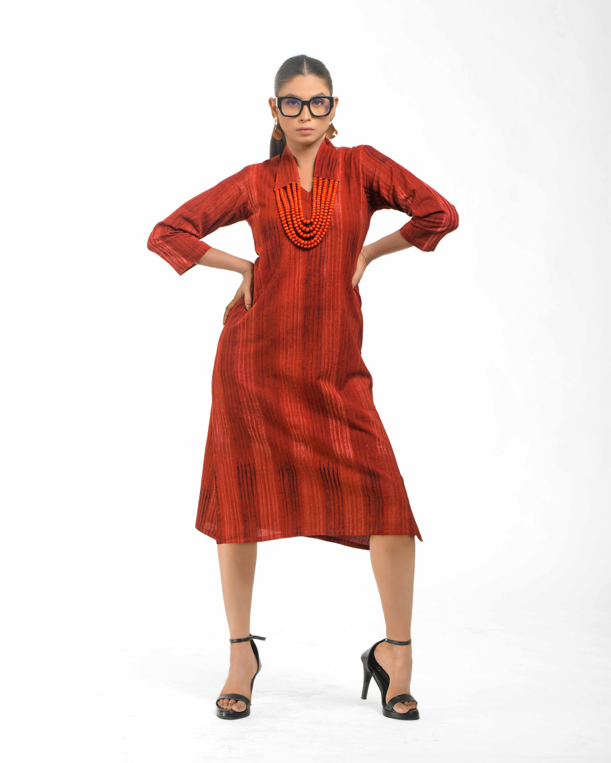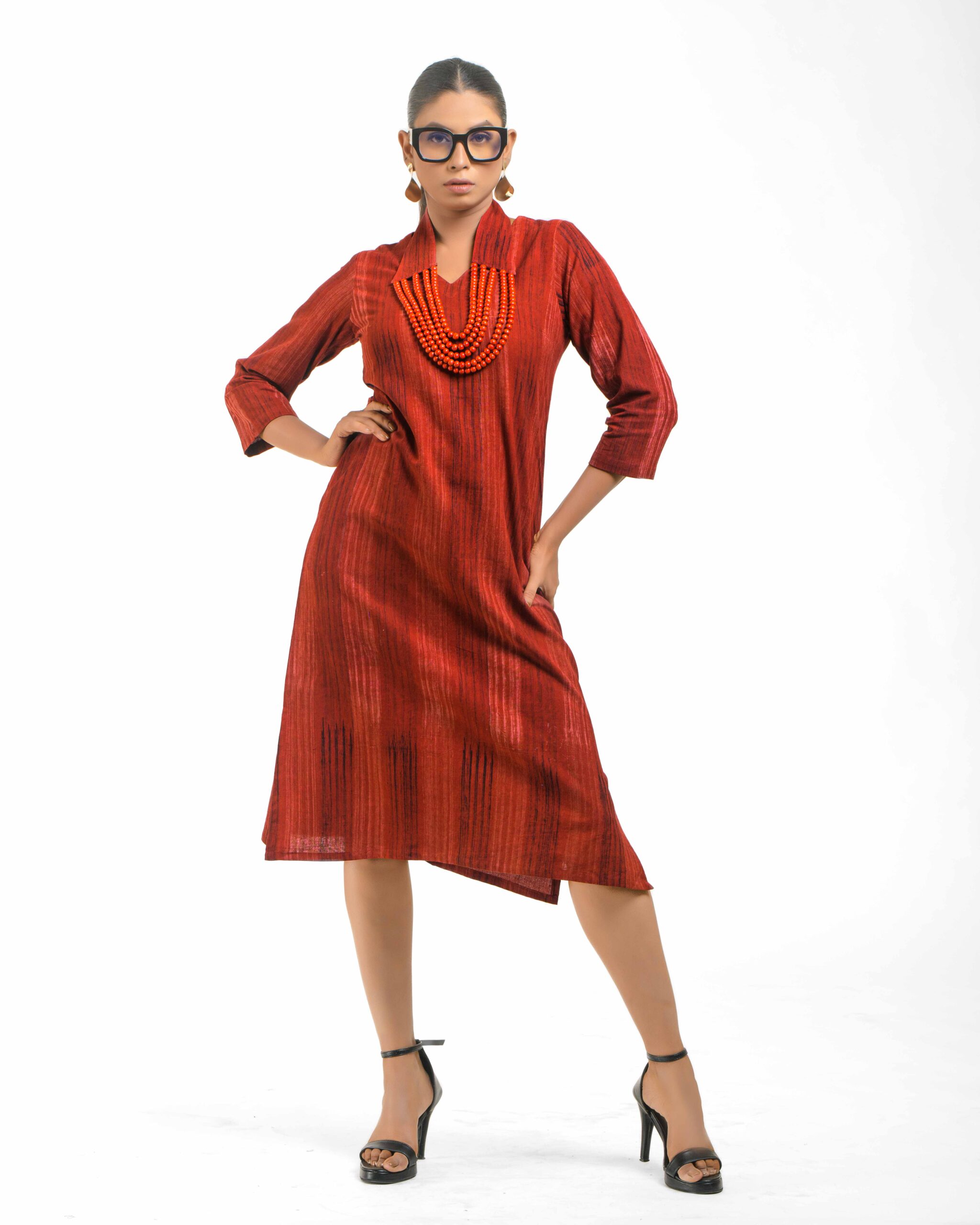 Crafted from soft, hand brush-printed Khadi, the Mitti Brushwood Tunic offers an earthy, artistic aesthetic. It comes with a detachable, handcrafted collar-style necklace featuring wooden beads, defining versatile, conscious luxury.