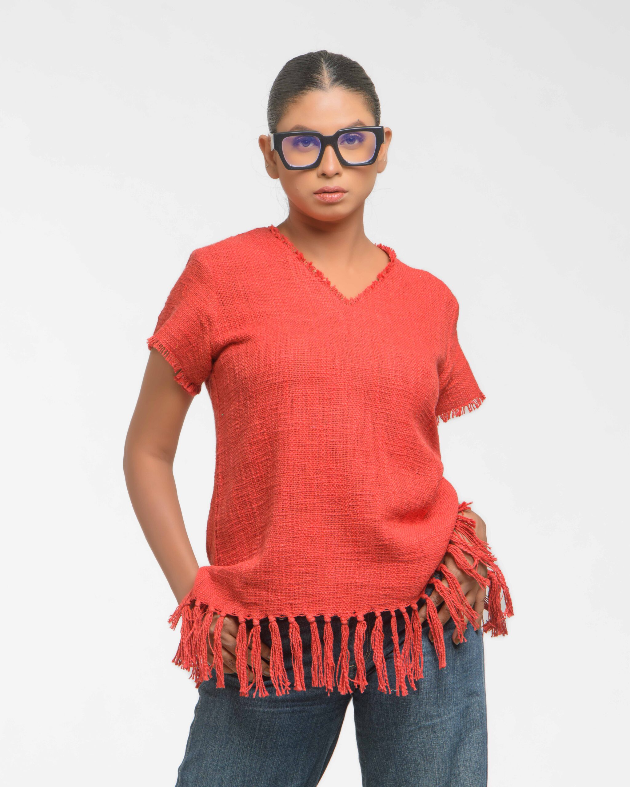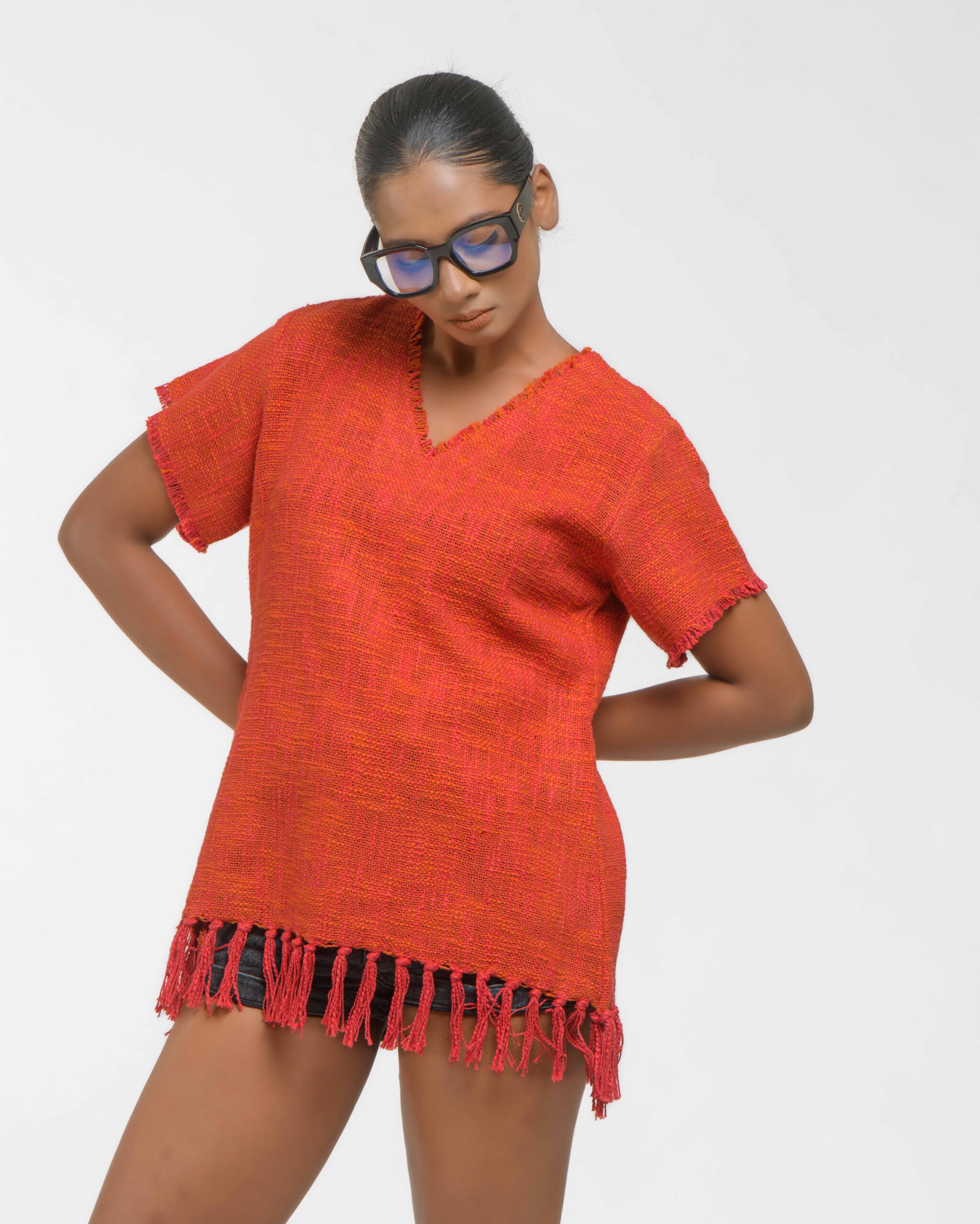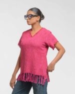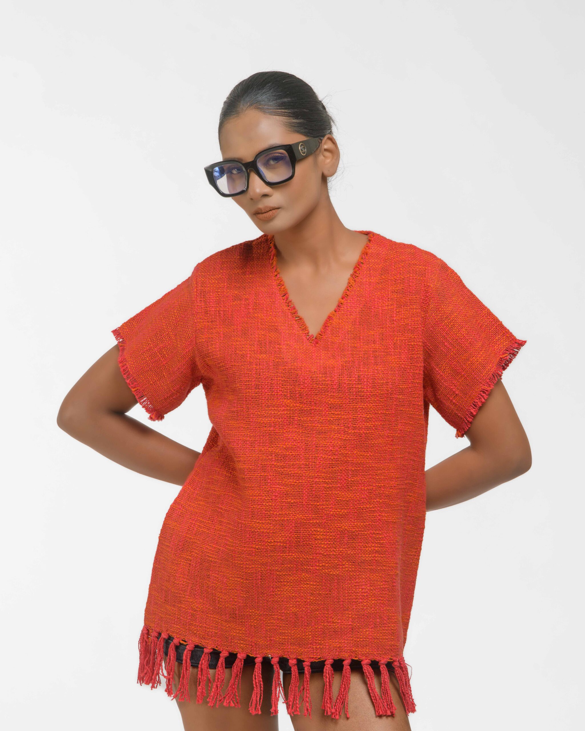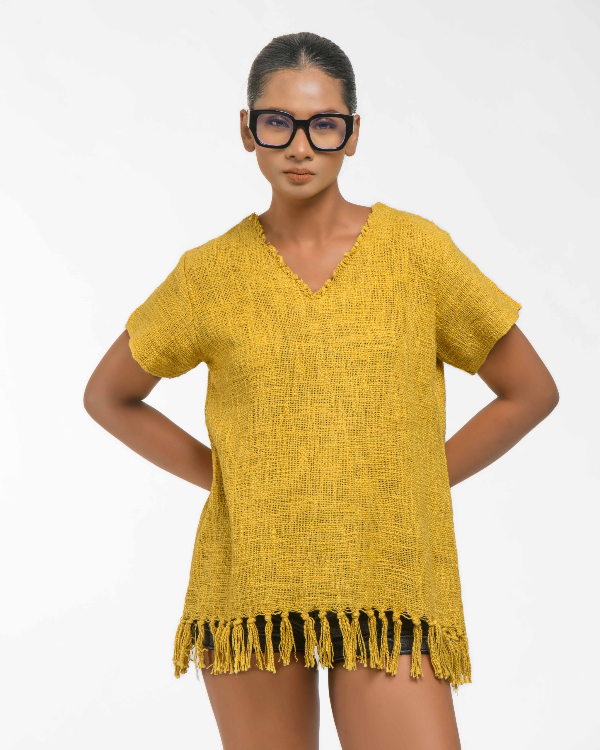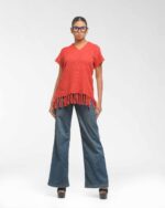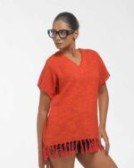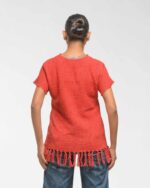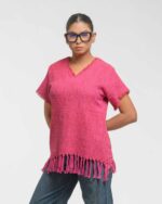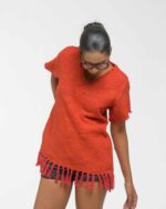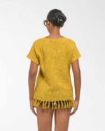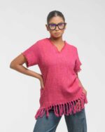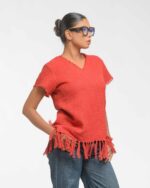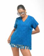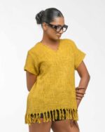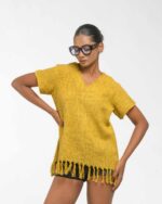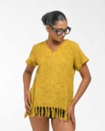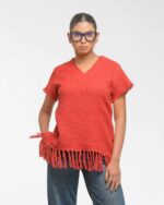 This vibrant, Azo-Free dyed top is made from a uniquely textured fabric, featuring irregular slub yarn and a loose weave for maximum breathability and comfort. Cut in a cool, casual silhouette and finished with playful fringes at the hem, this piece is the ultimate ethical statement for effortless, radiant style.