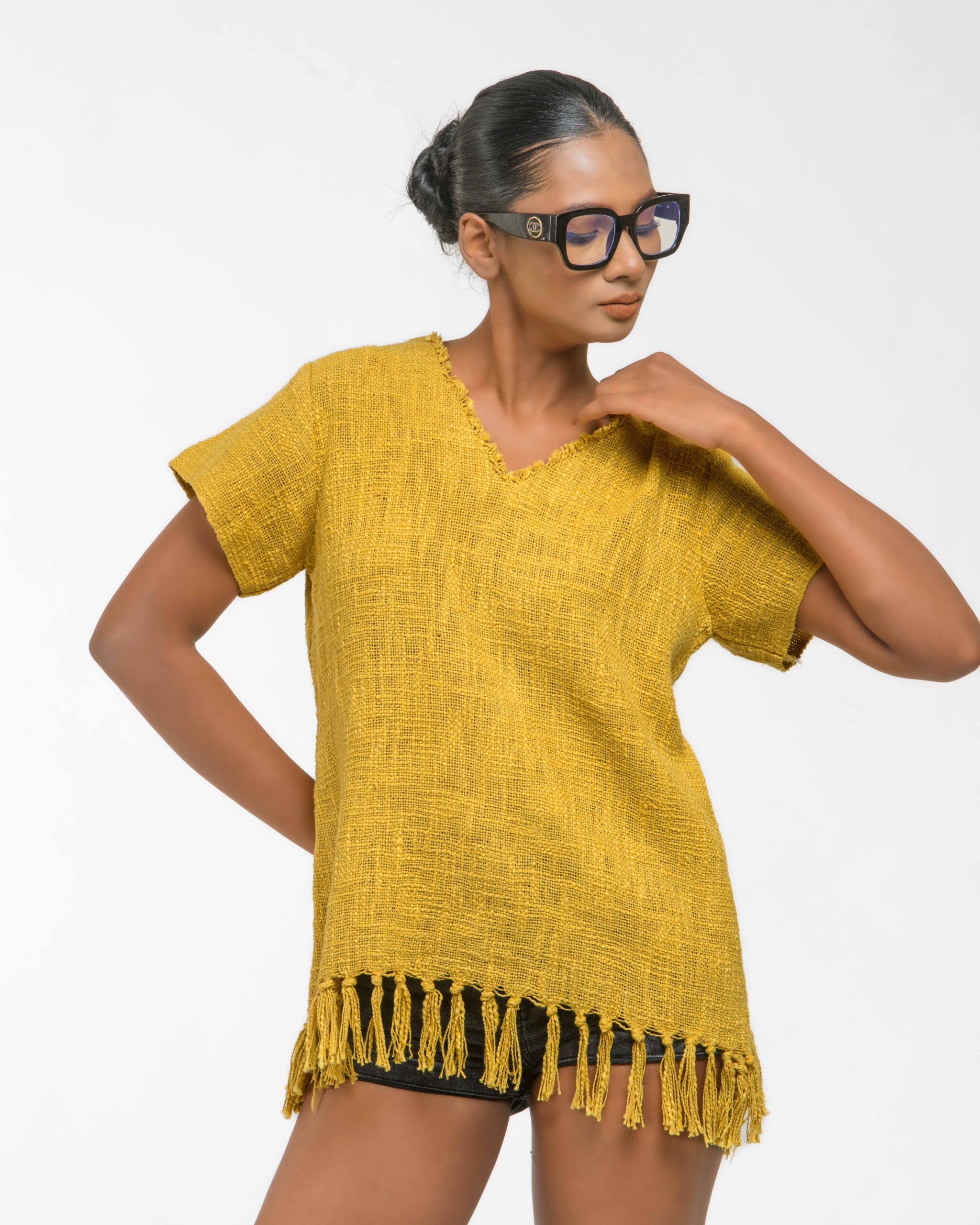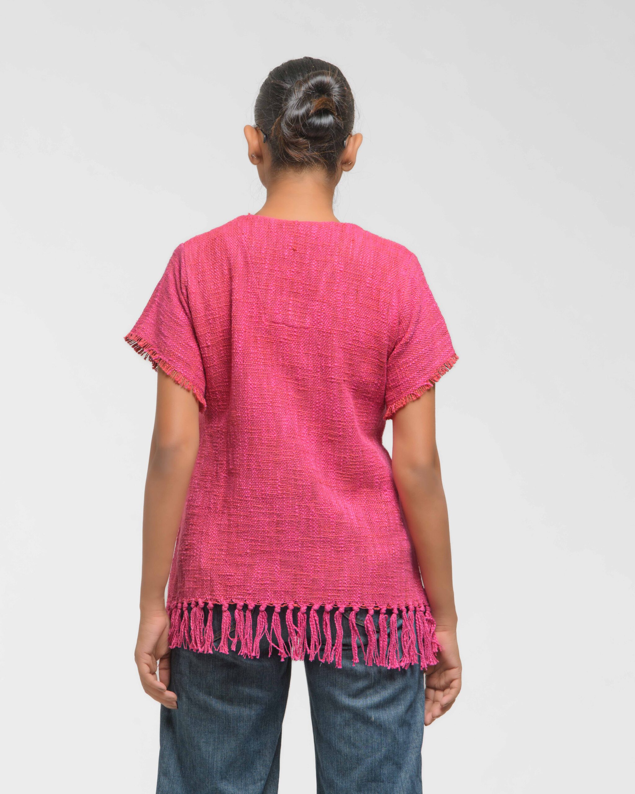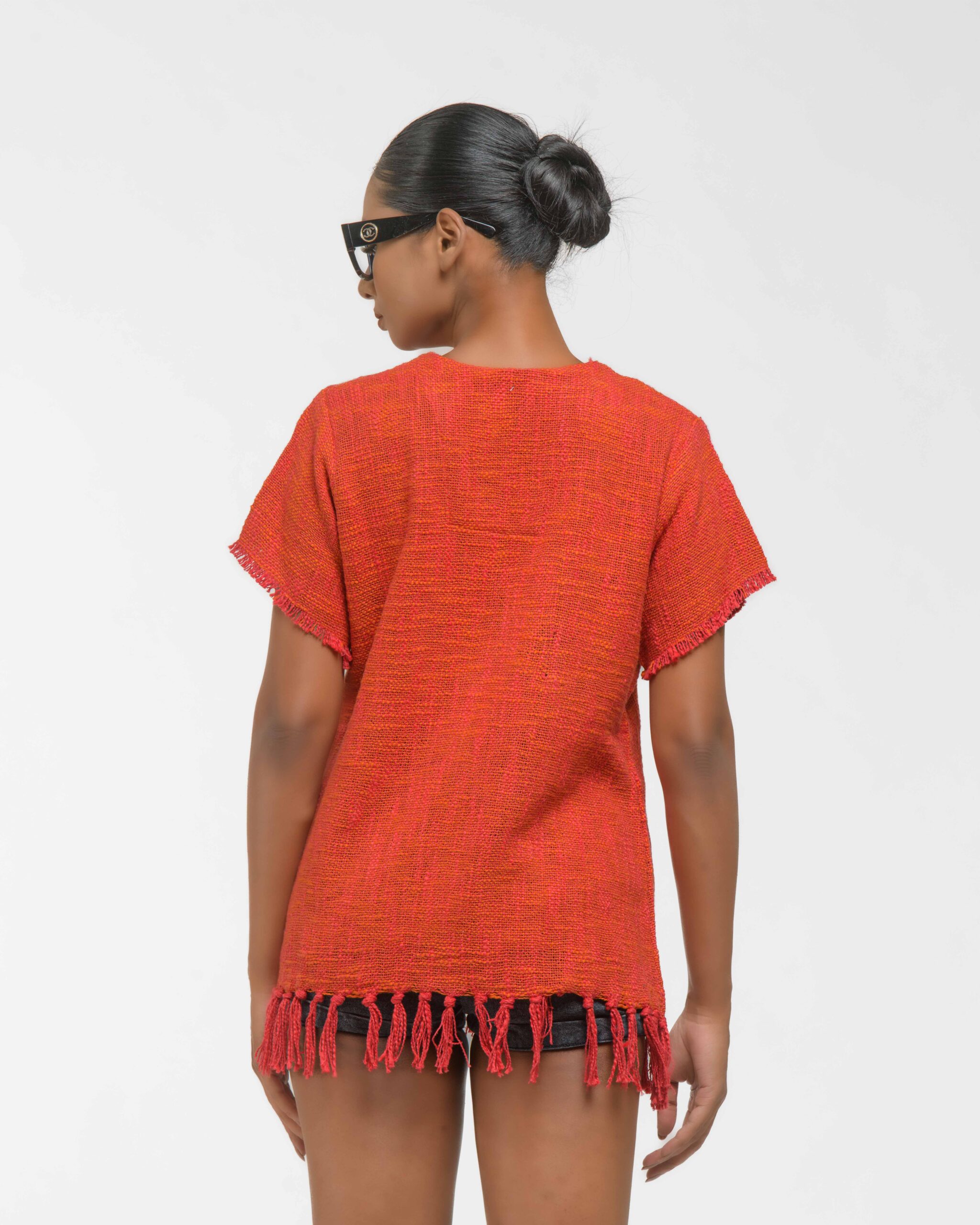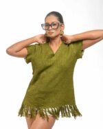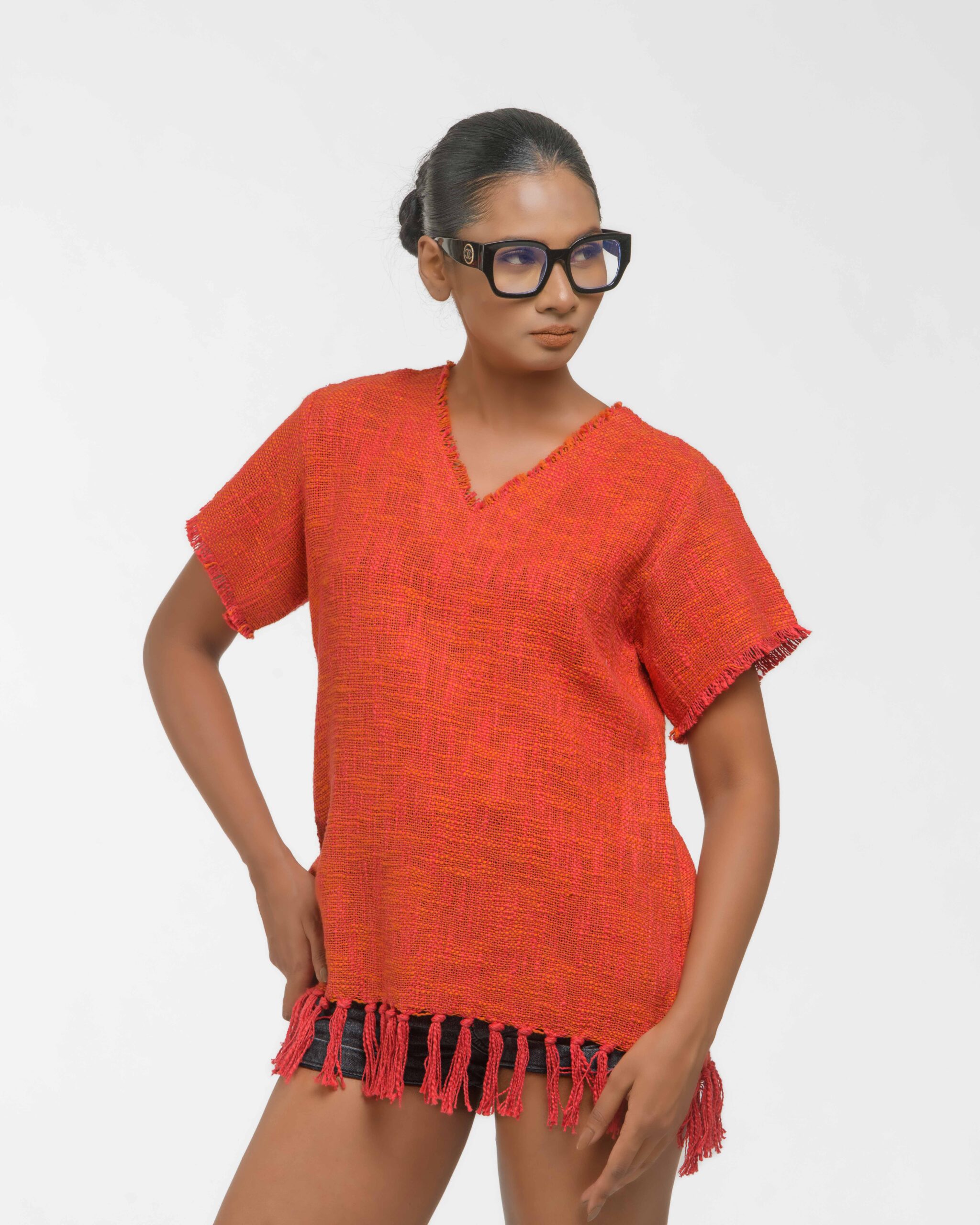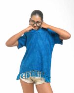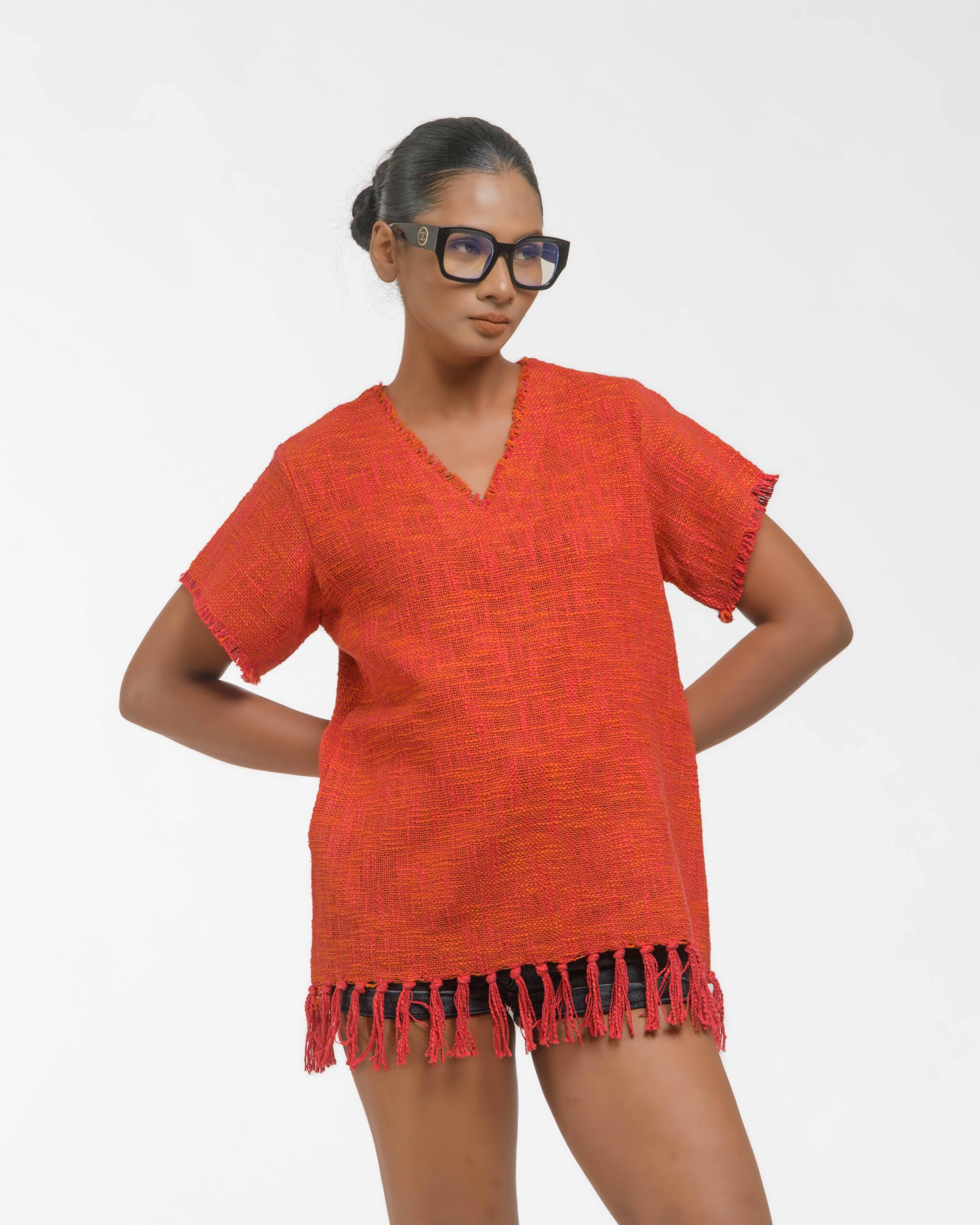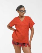 This vibrant, Azo-Free dyed top is made from a uniquely textured fabric, featuring irregular slub yarn and a loose weave for maximum breathability and comfort. Cut in a cool, casual silhouette and finished with playful fringes at the hem, this piece is the ultimate ethical statement for effortless, radiant style.