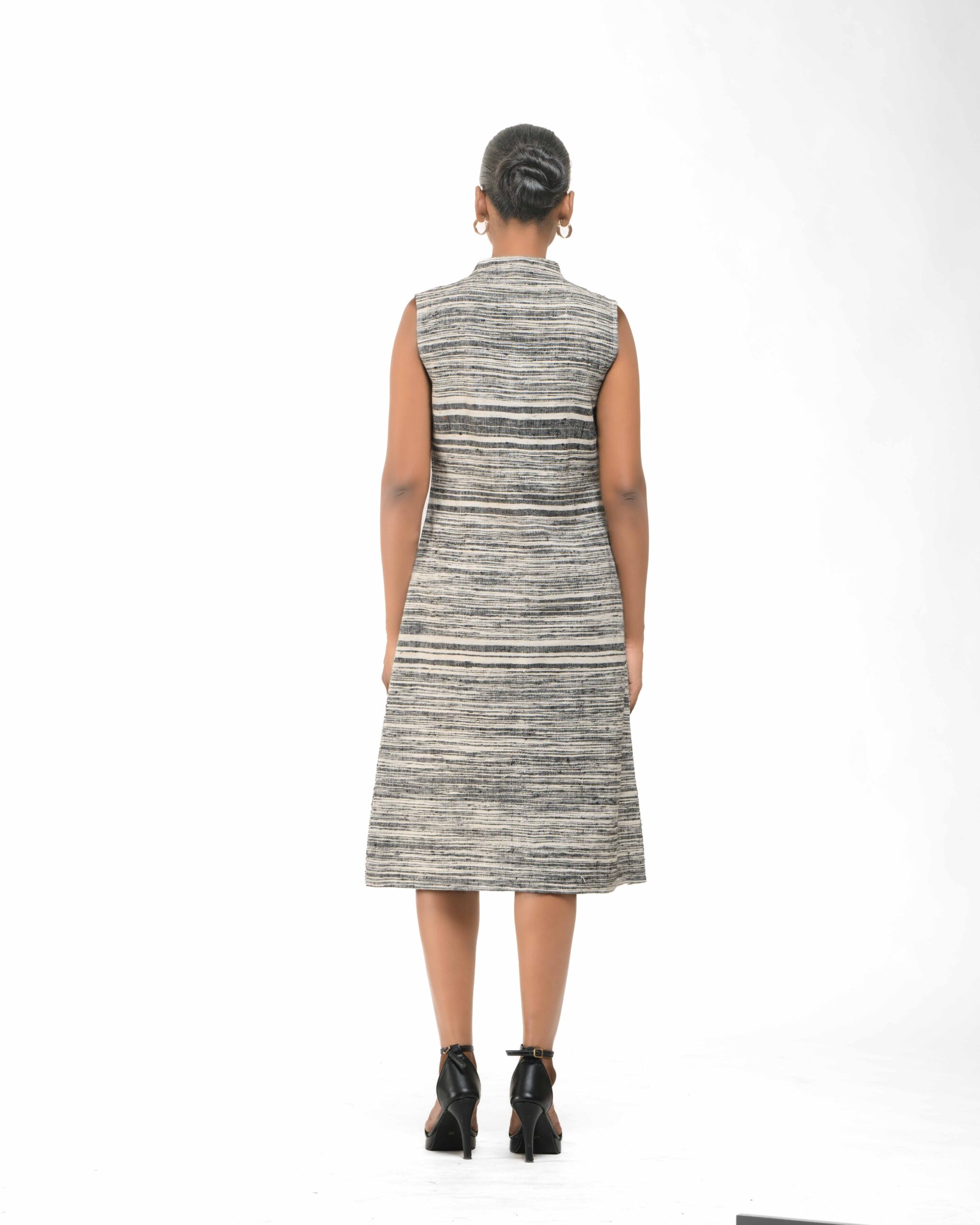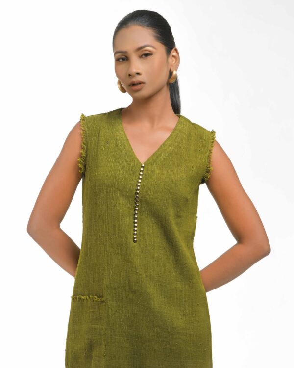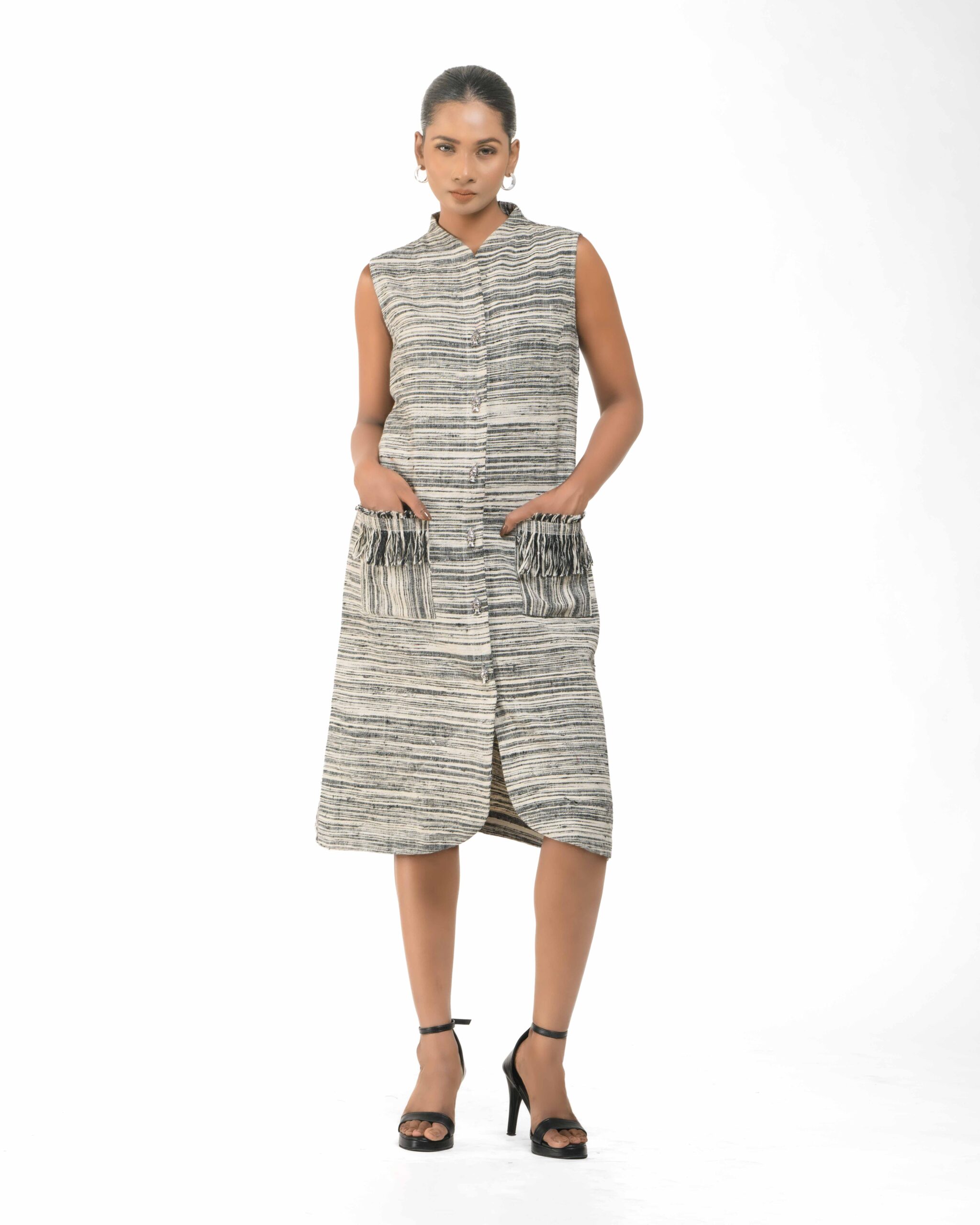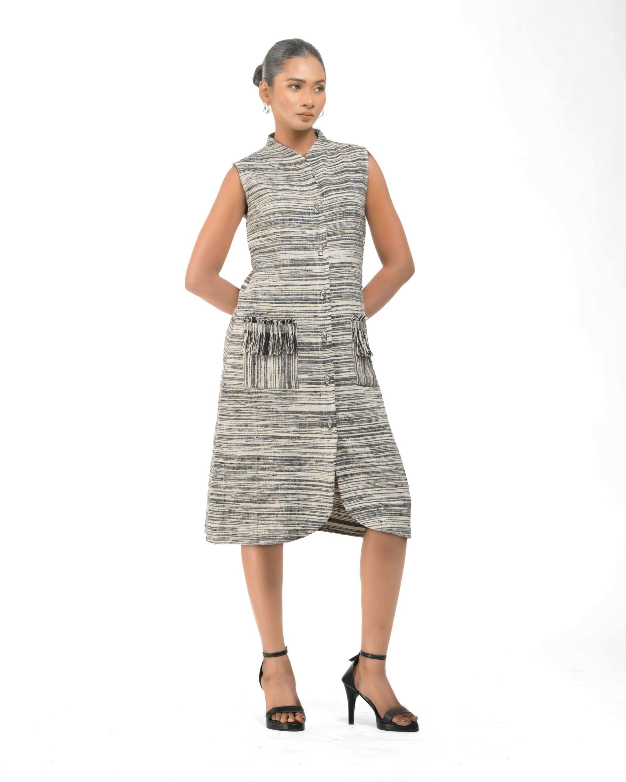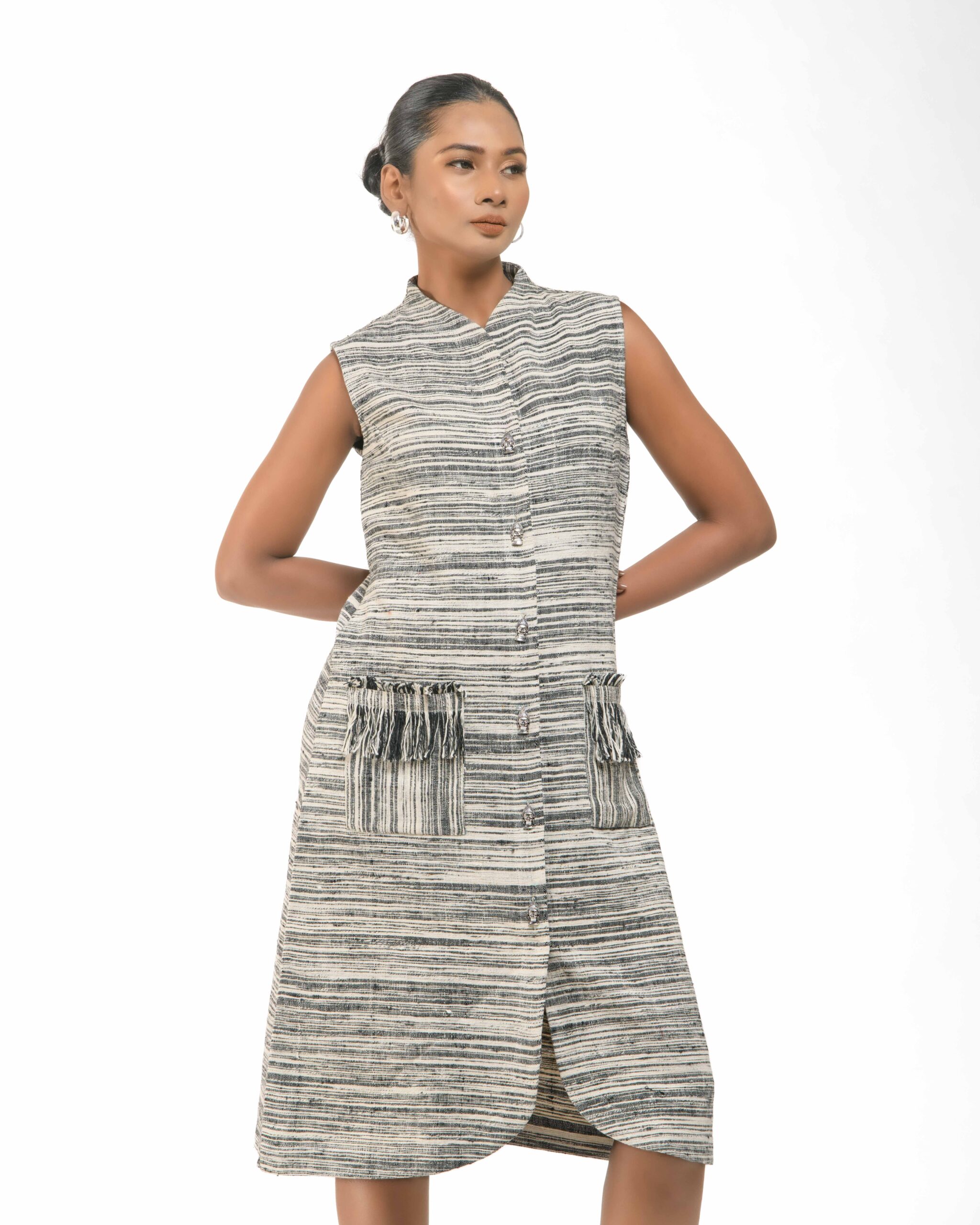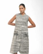 Spun from breathable Raw Khaddar, the Sattva Buddha Dress features a modern raised collar and unique artisan Buddha buttons for a conscious touch. Finished with our signature raw fringes, this effortless silhouette fuses traditional texture with contemporary, ethical luxu