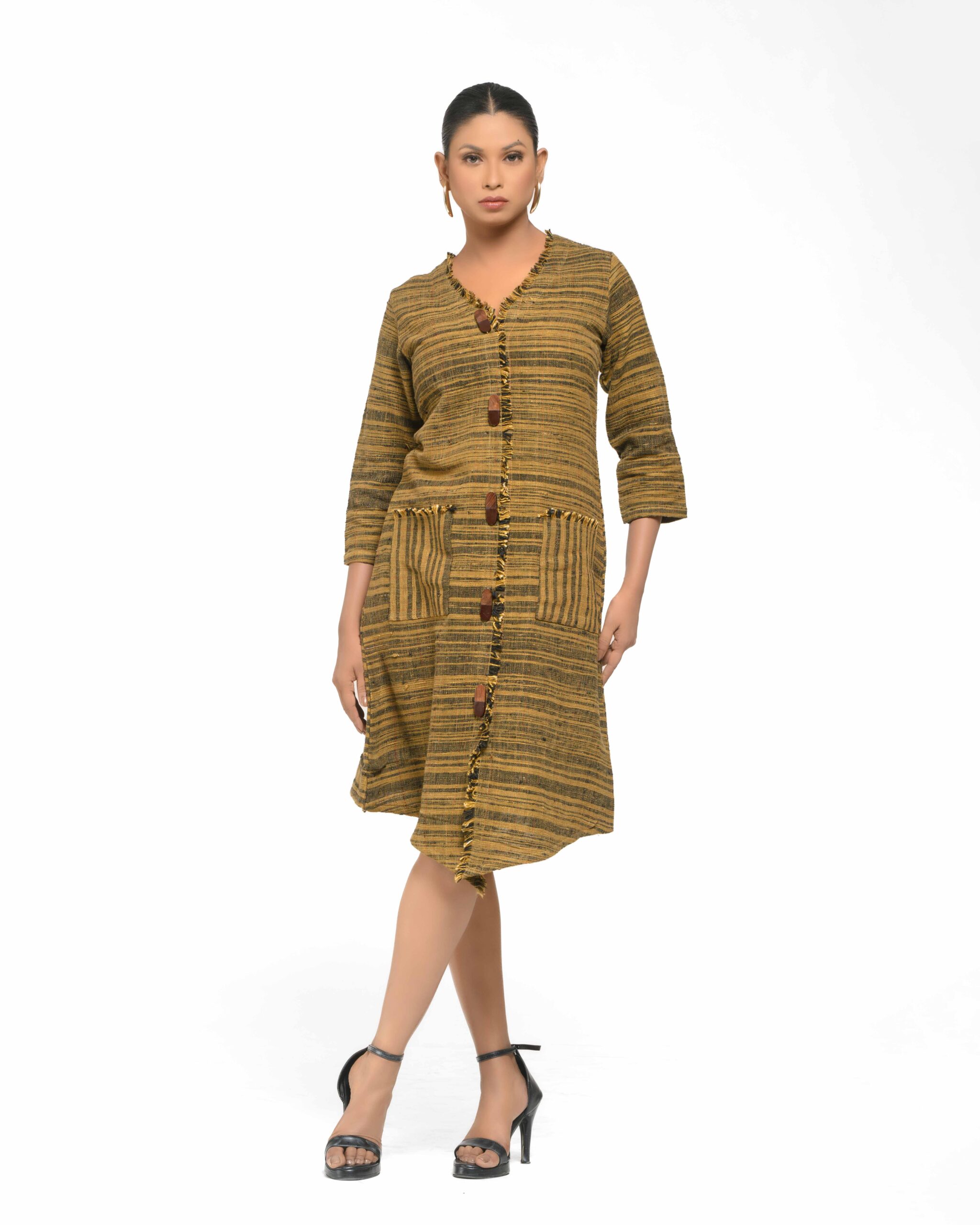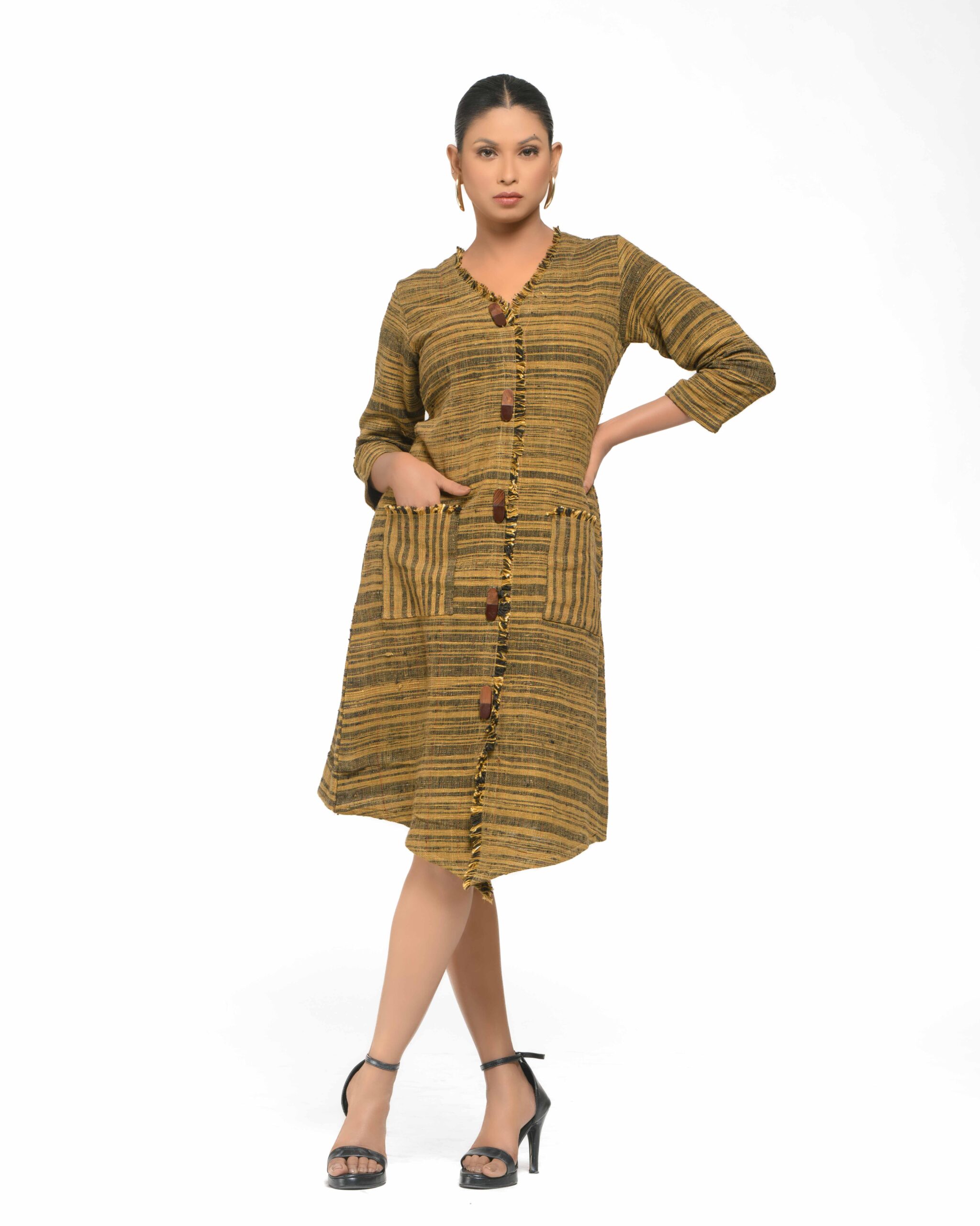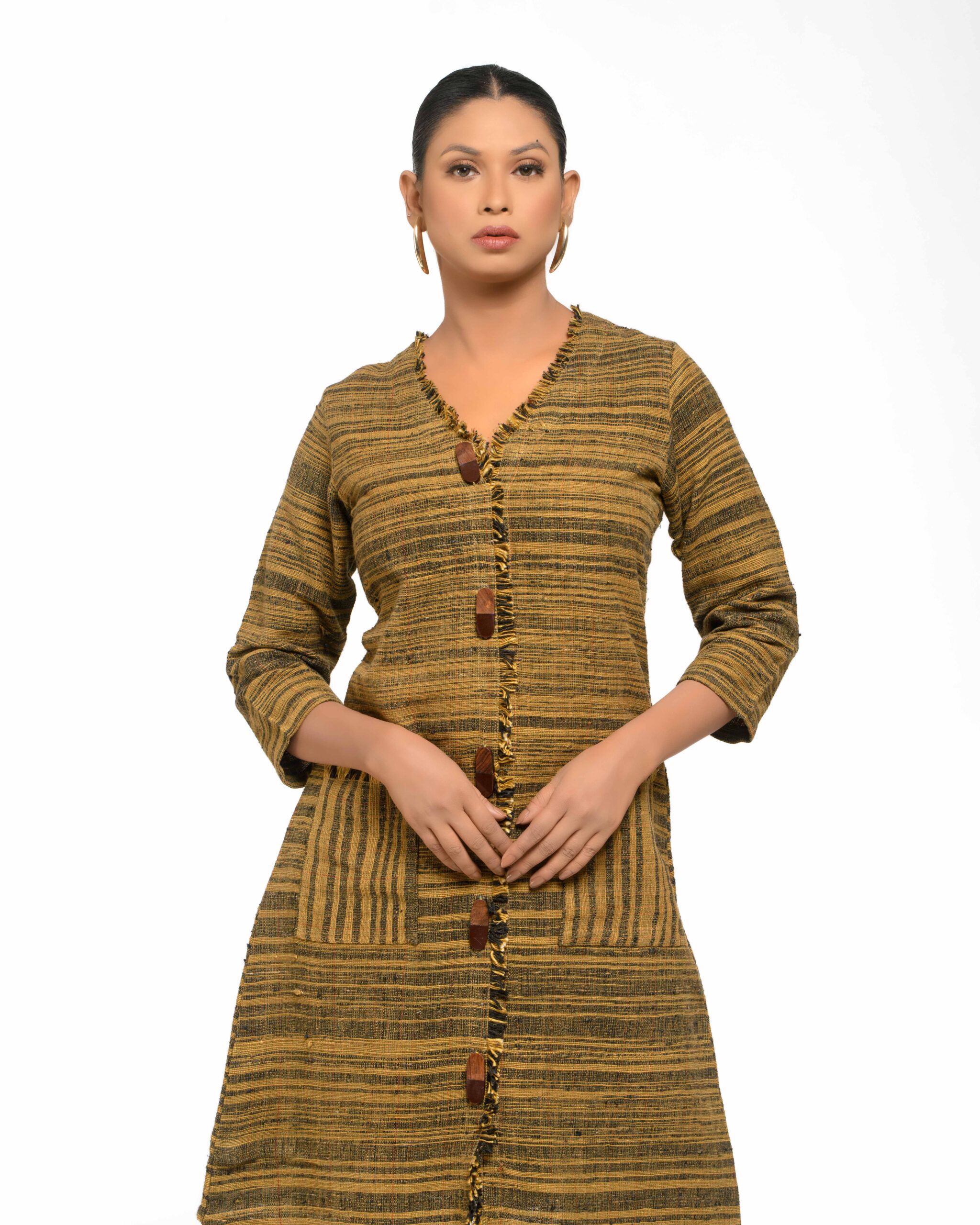 Textured elegance in raw Khaddar: The modern shirt-dress silhouette is defined by natural wooden buttons and our unique, fringed weave detailing. This Indo-Western piece is a confident expression of the artisan’s “humane touch” and sustainable craft.