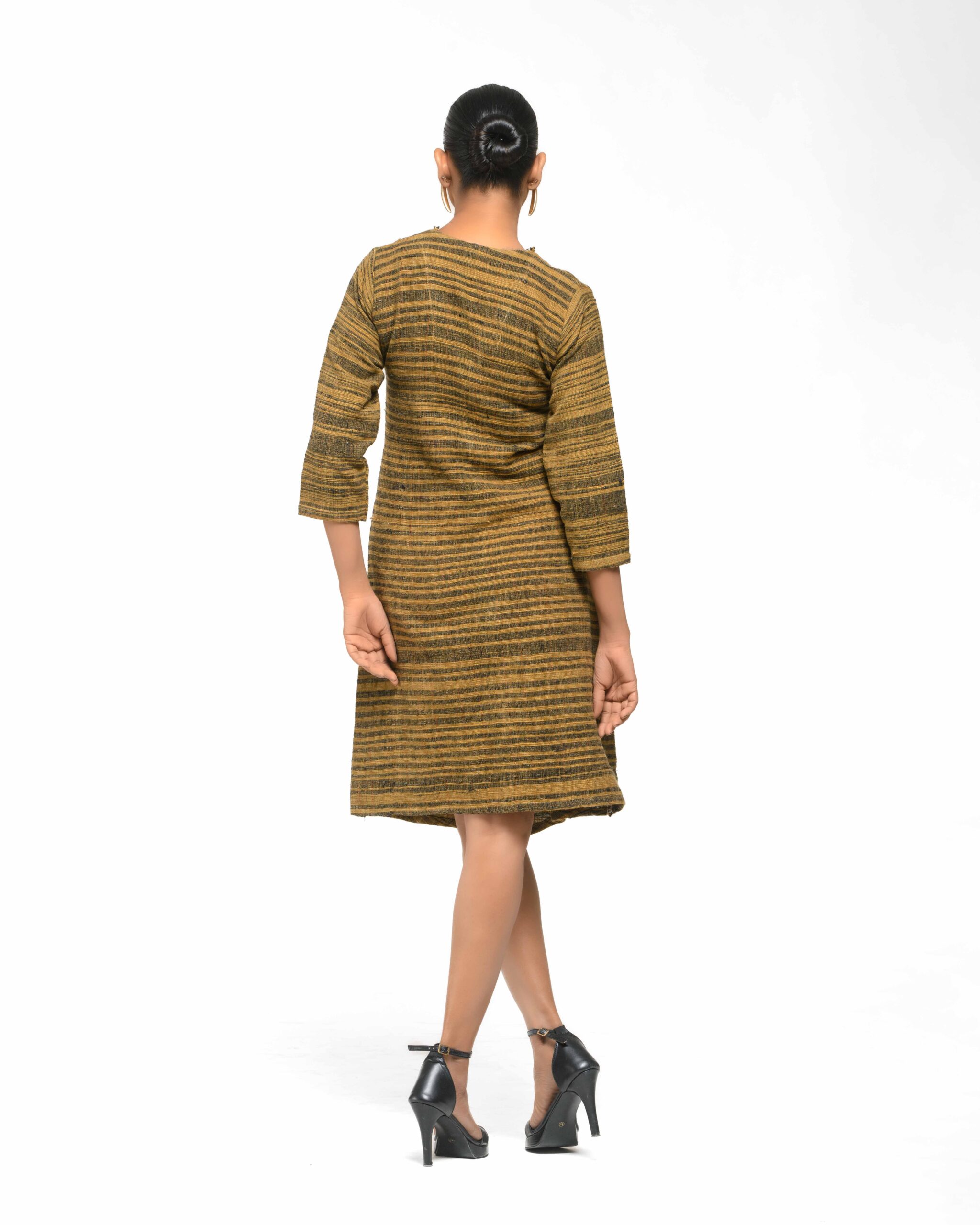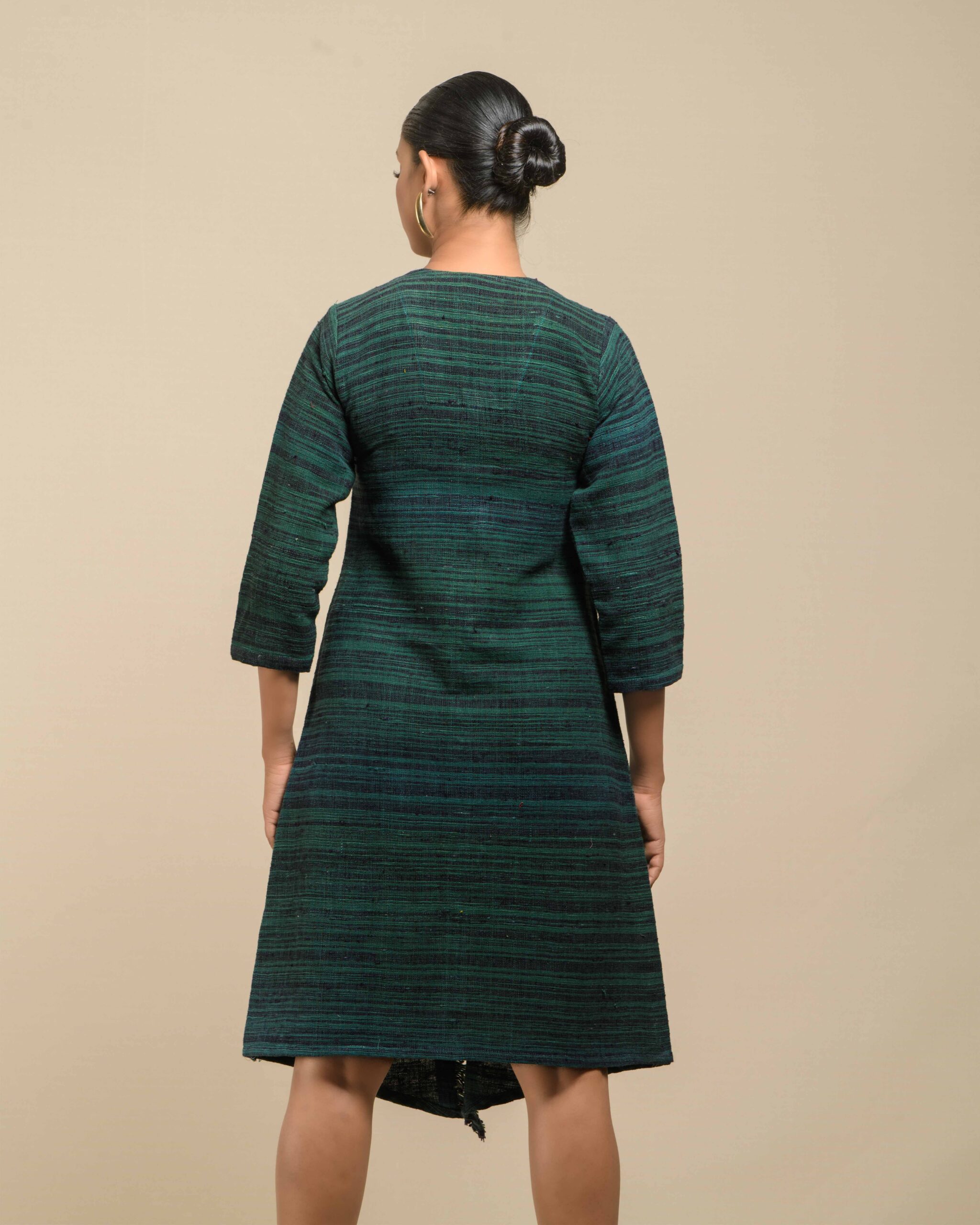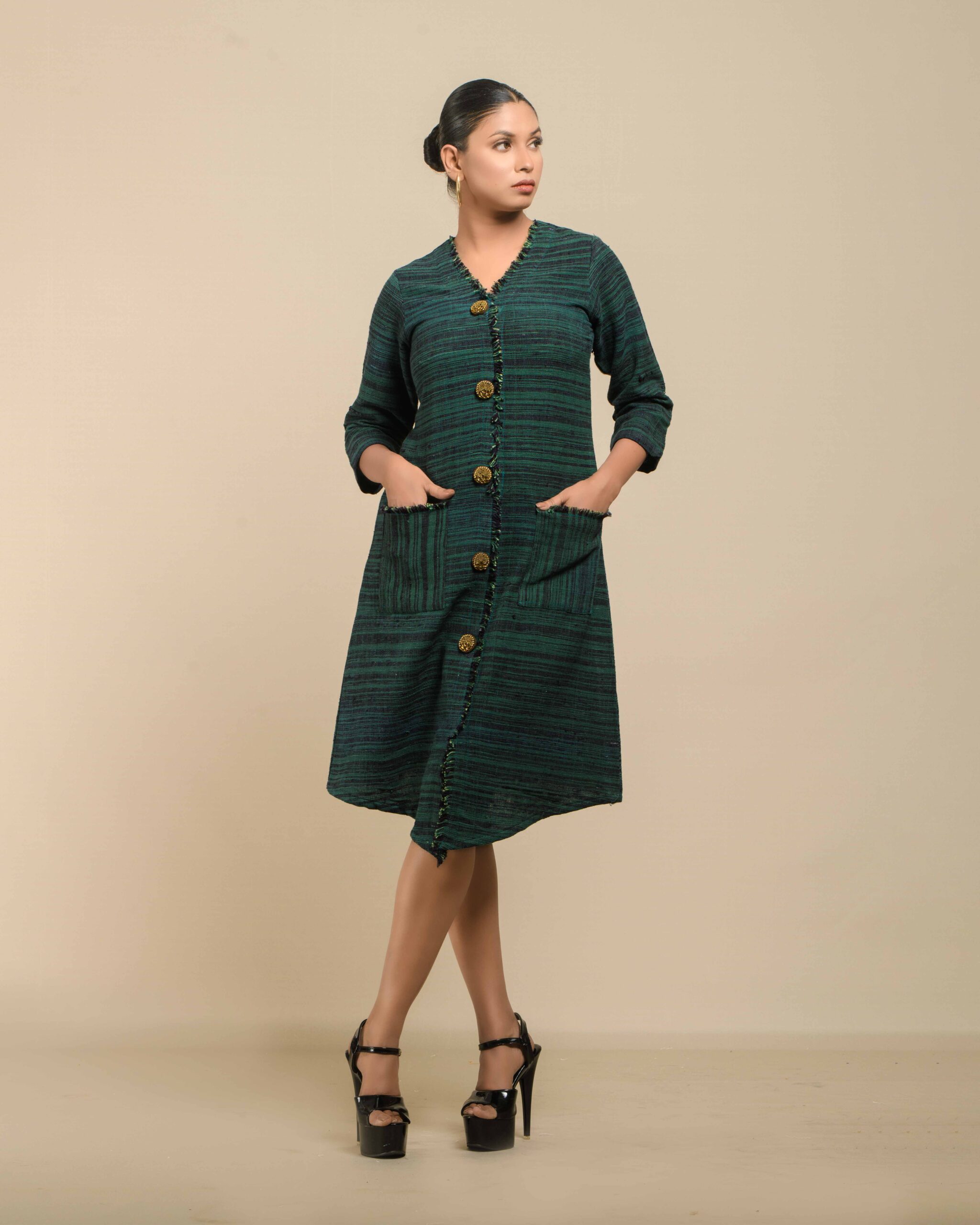Textured elegance in raw Khaddar: The modern shirt-dress silhouette is defined by natural wooden buttons and our unique, fringed weave detailing. This Indo-Western piece is a confident expression of the artisan’s “humane touch” and sustainable craft.