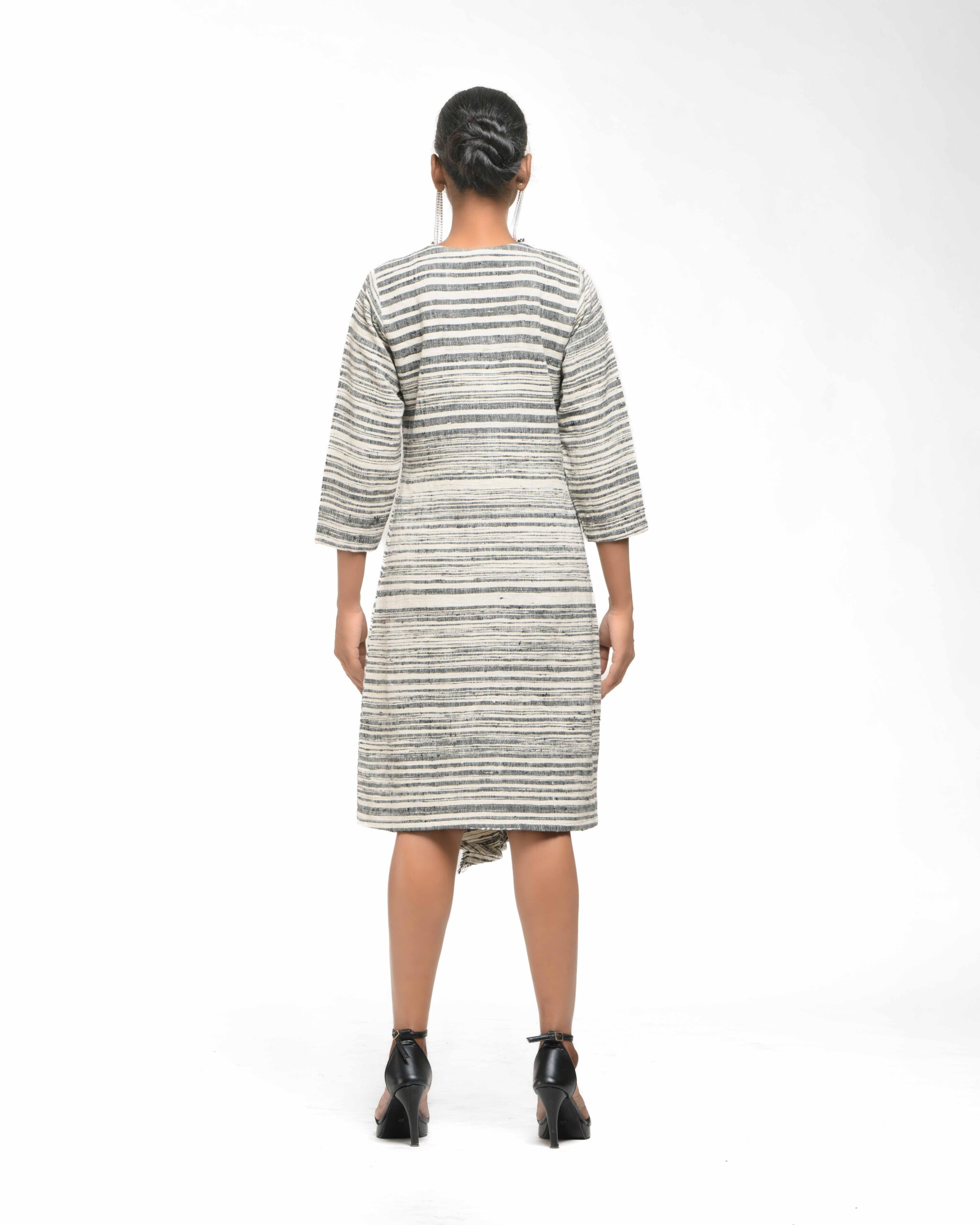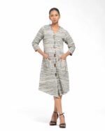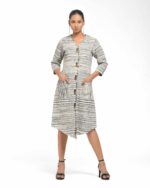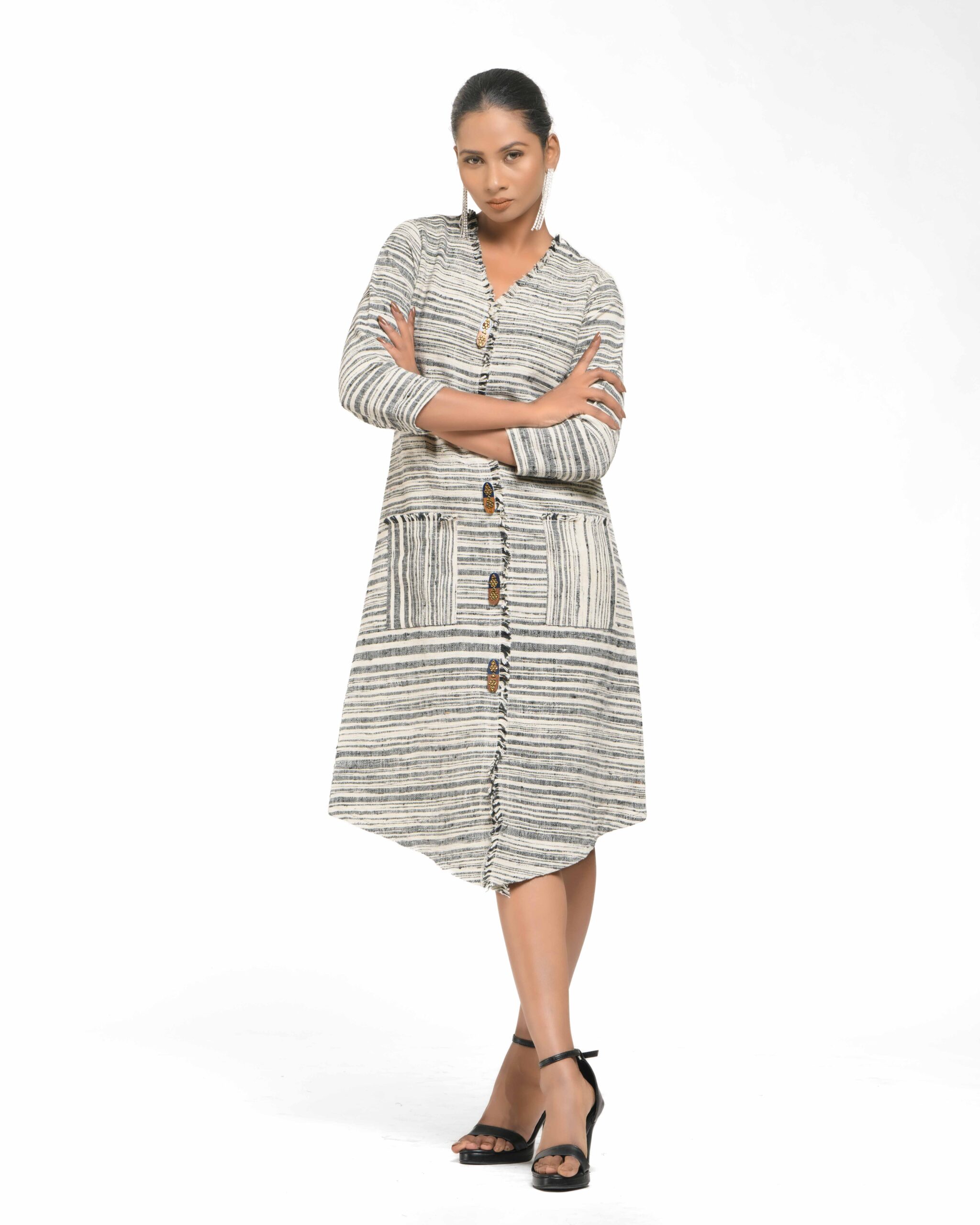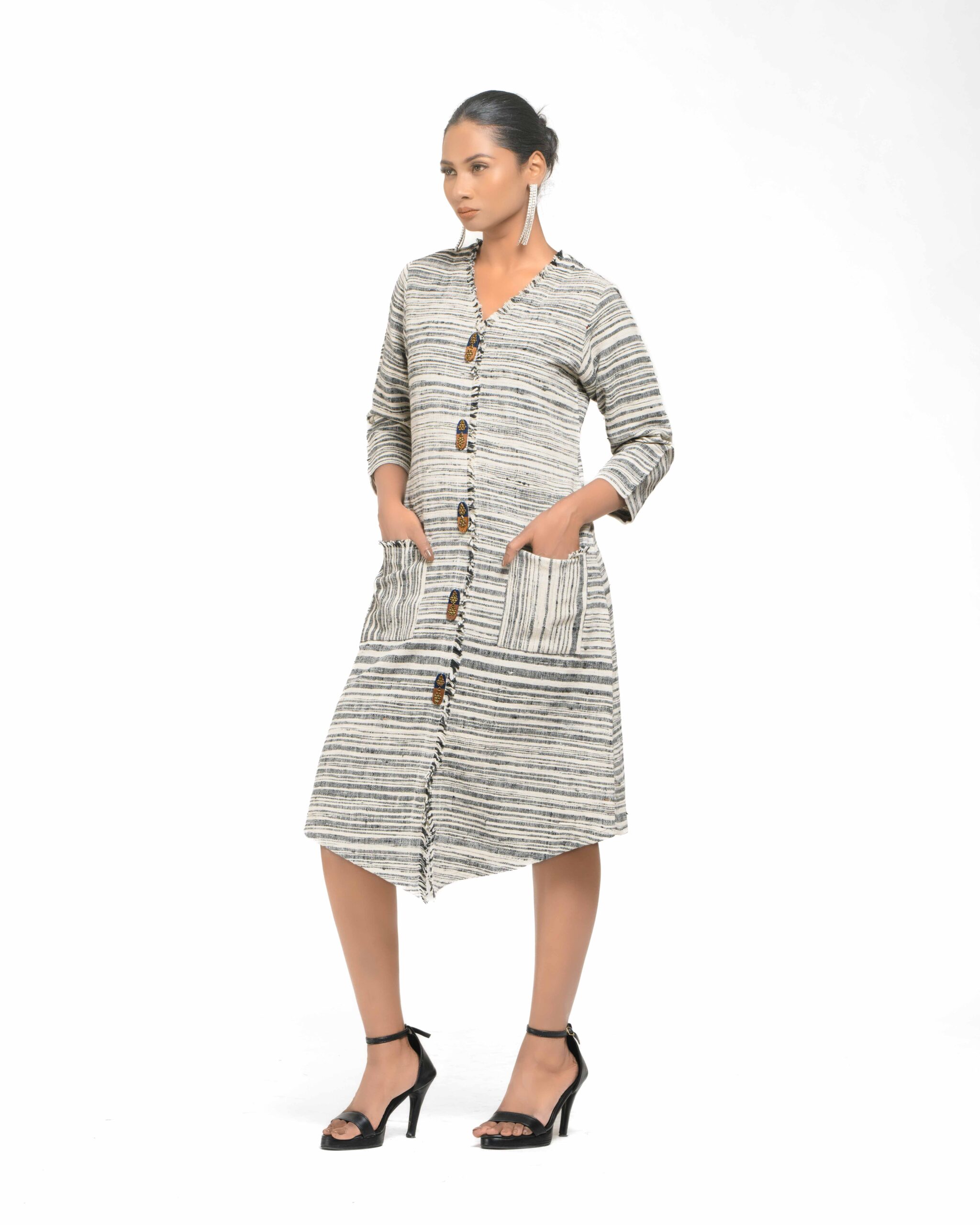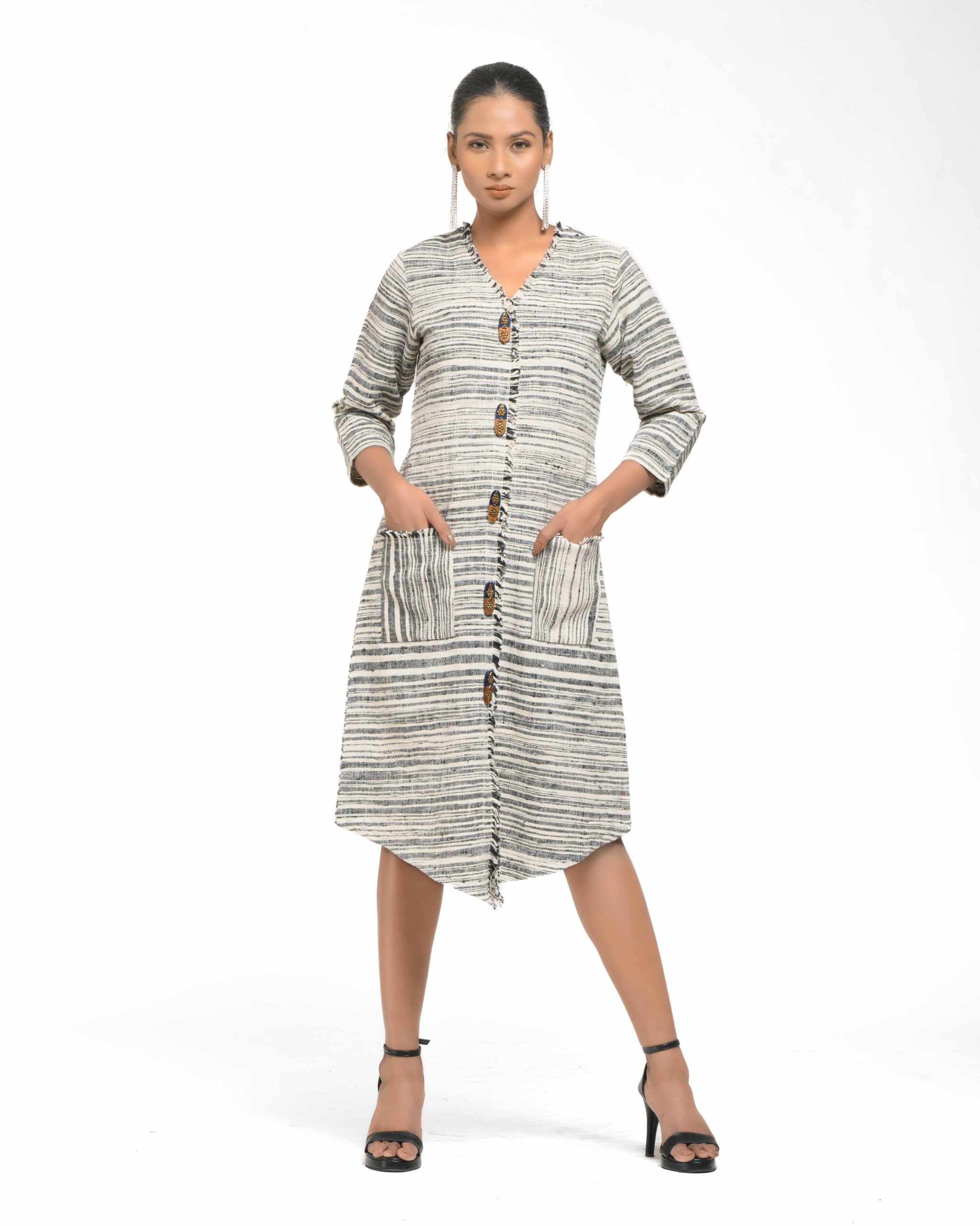 Textured elegance in raw Khaddar: The modern shirt-dress silhouette is defined by natural wooden buttons and our unique, fringed weave detailing. This Indo-Western piece is a confident expression of the artisan’s “humane touch” and sustainable craft.