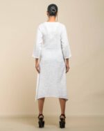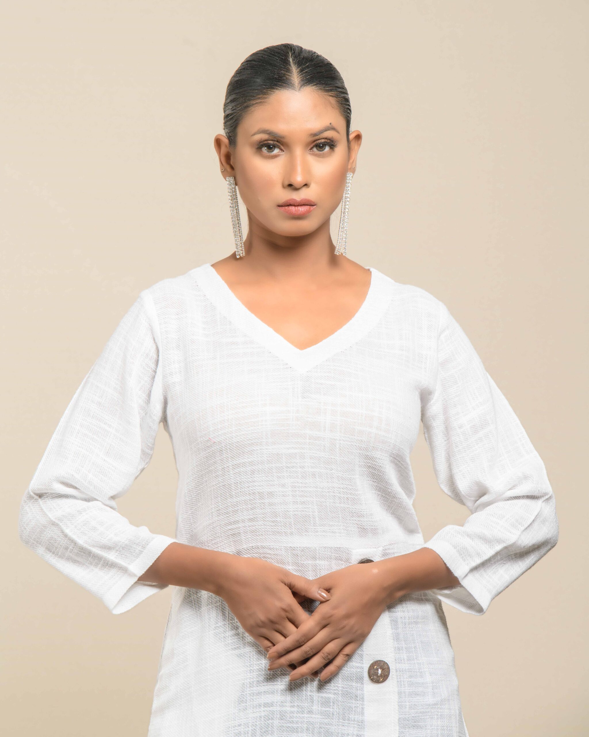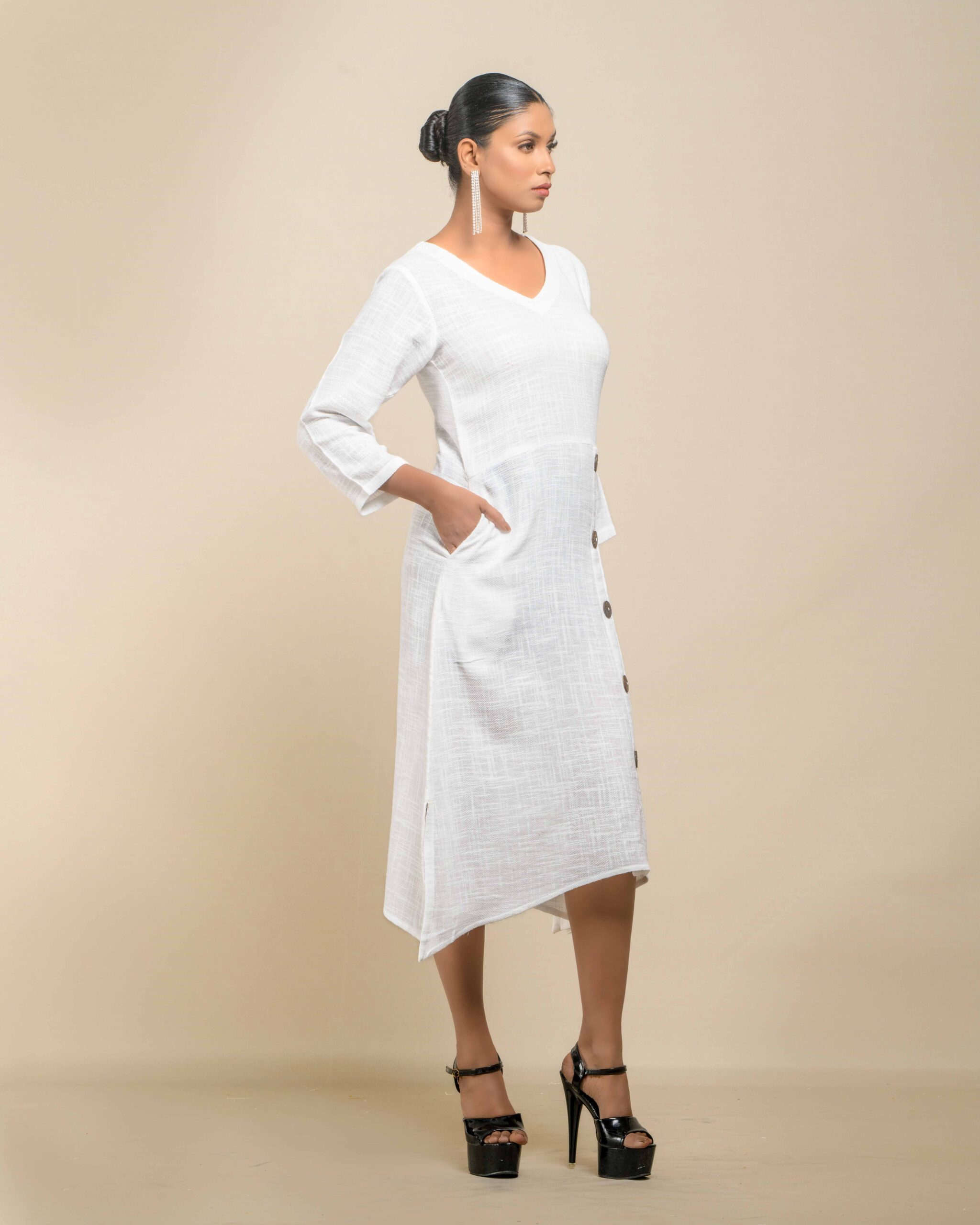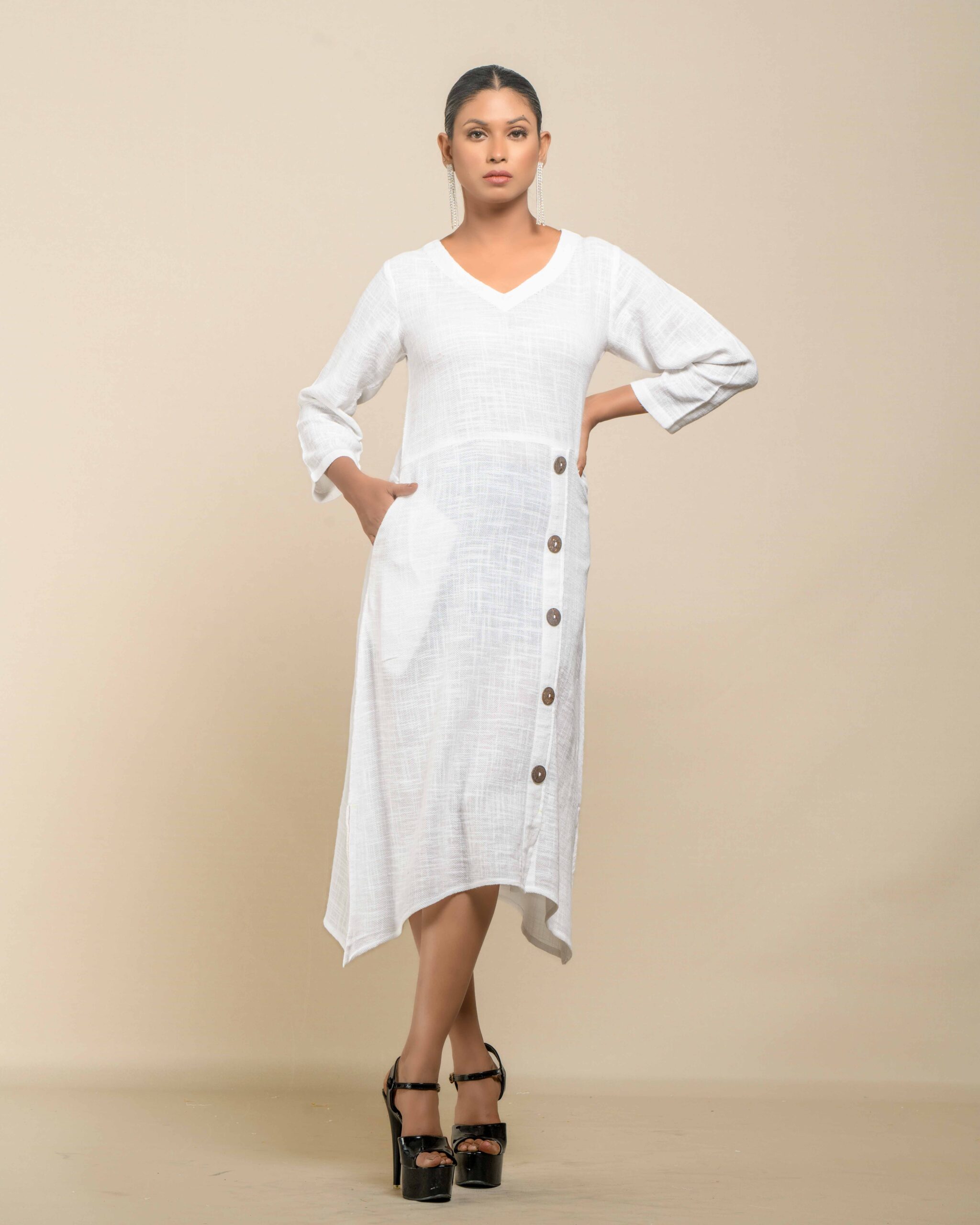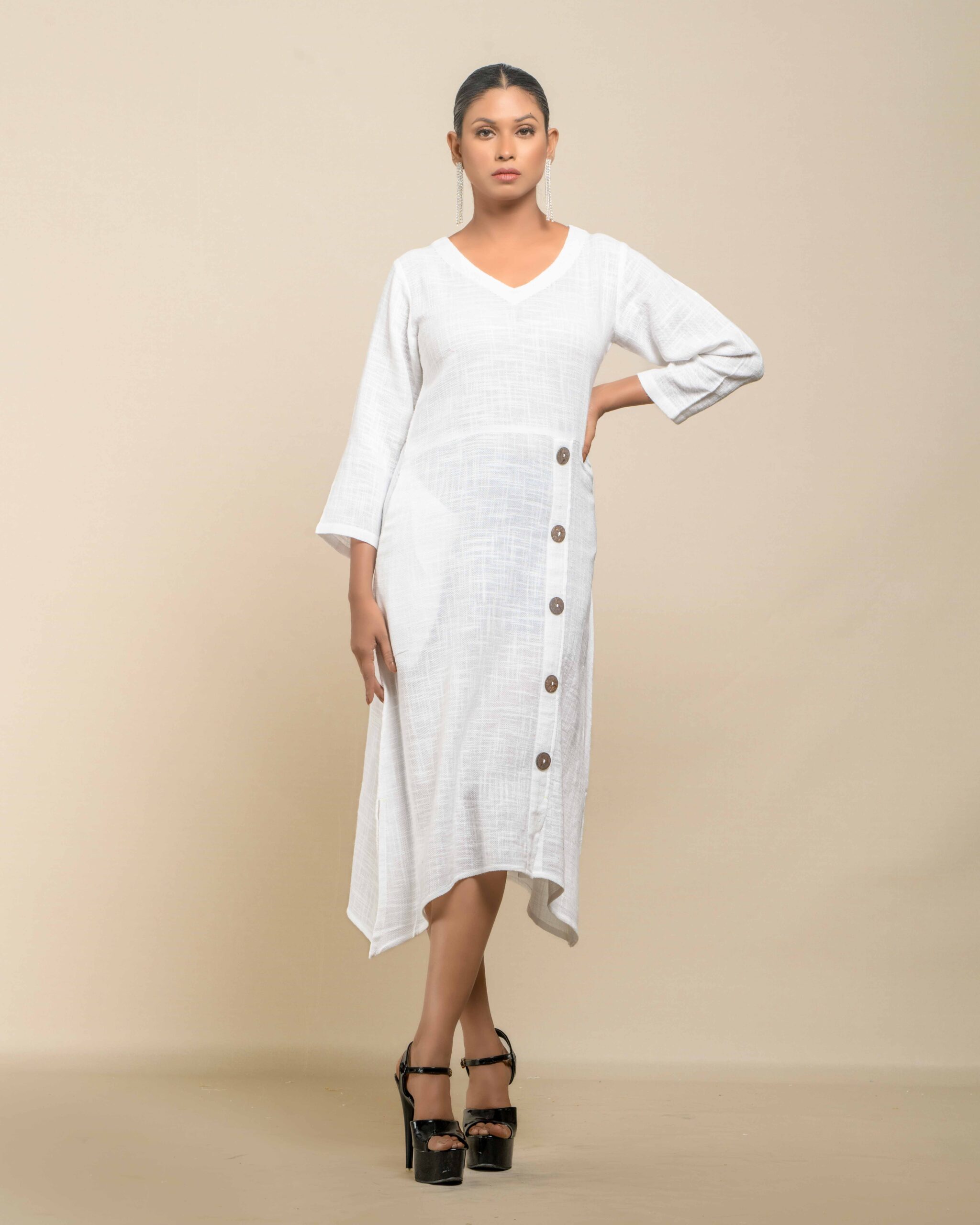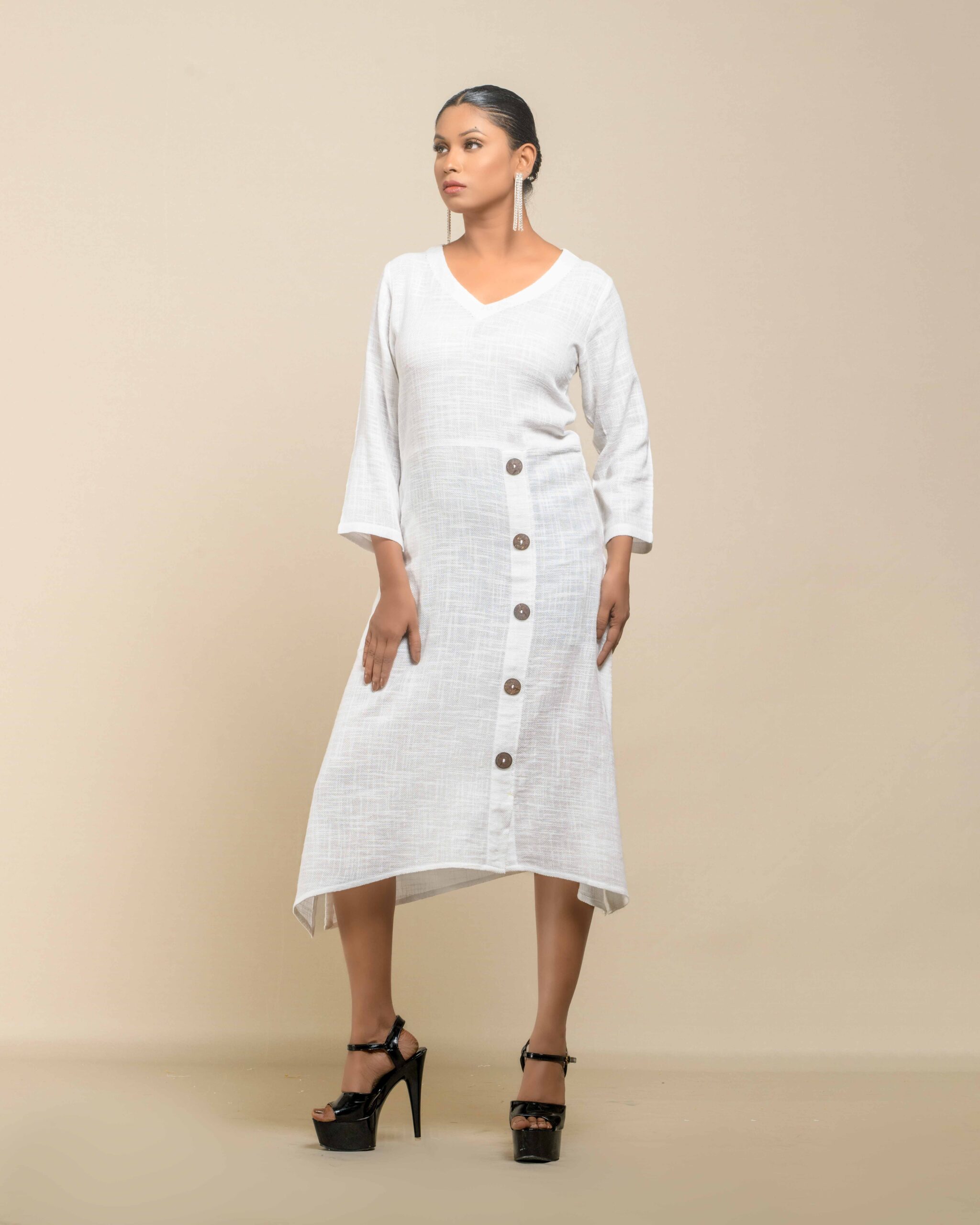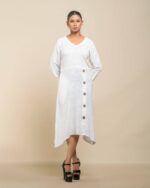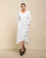This garment celebrates the inherent “flaws” of slub Khadi , turning soft texture into artisanal luxury. The modern, handkerchief hemline and side-cut closure with coconut shell buttons create a confident Indo-Western statement. It’s conscious fashion honoring the zero-electricity production model.