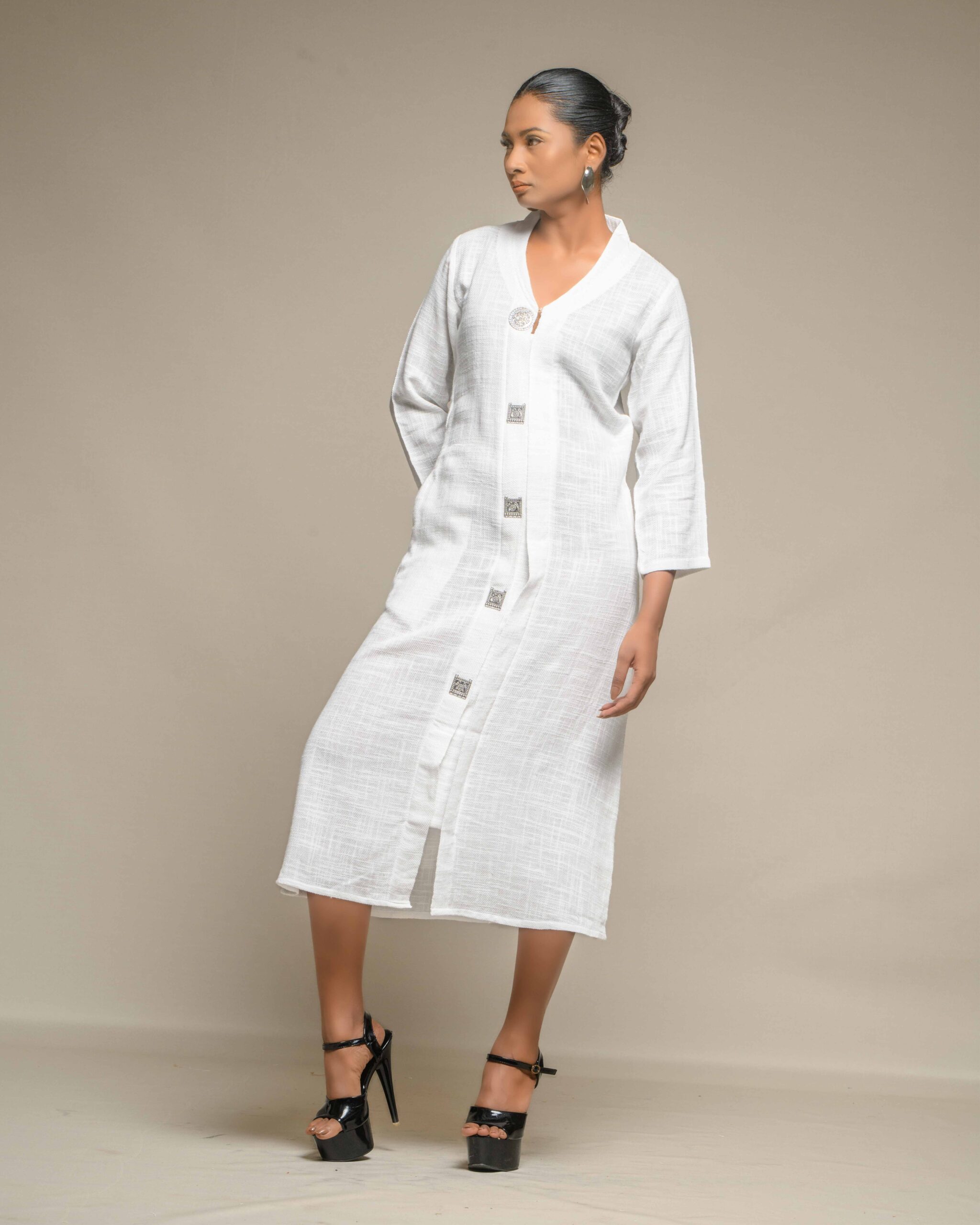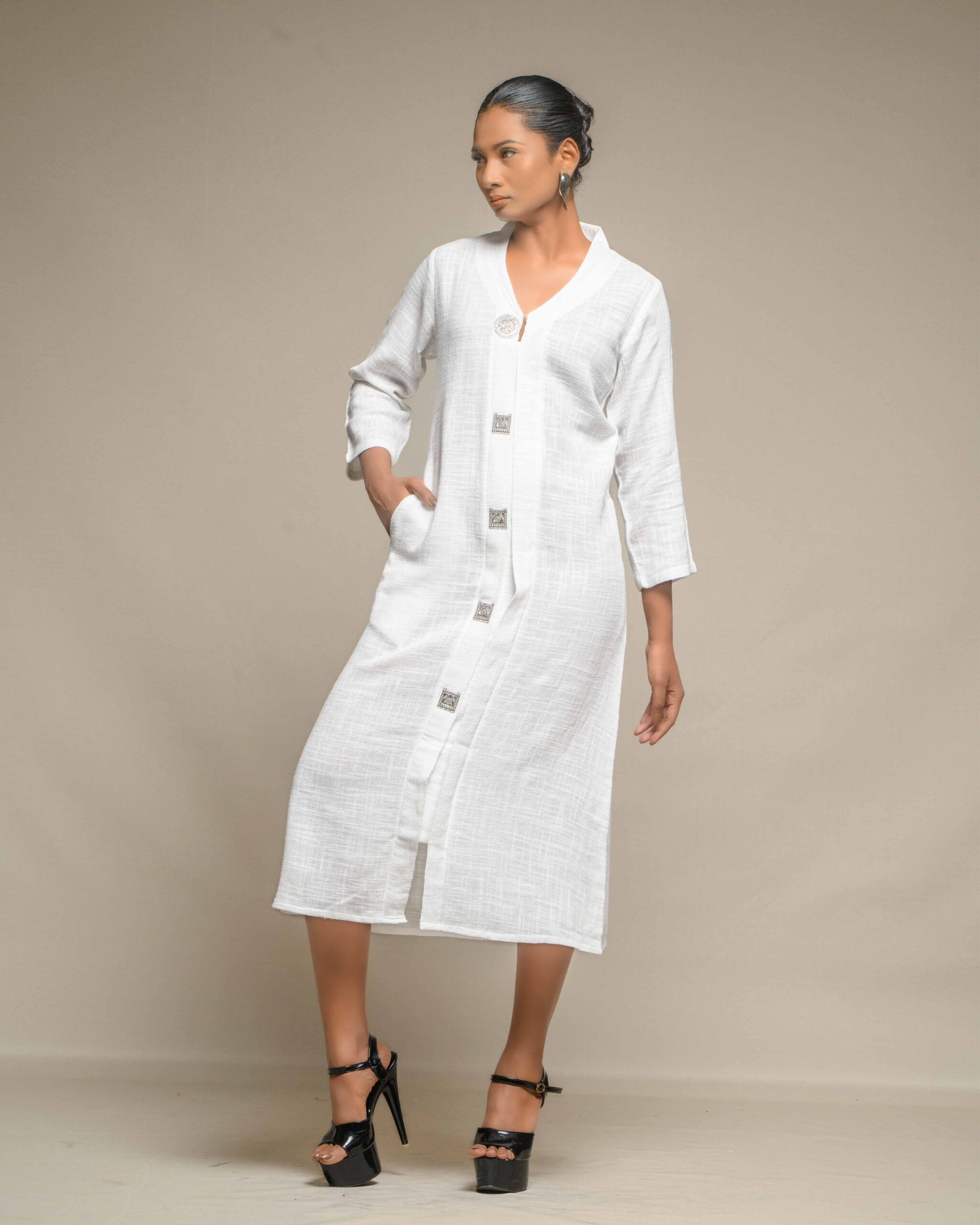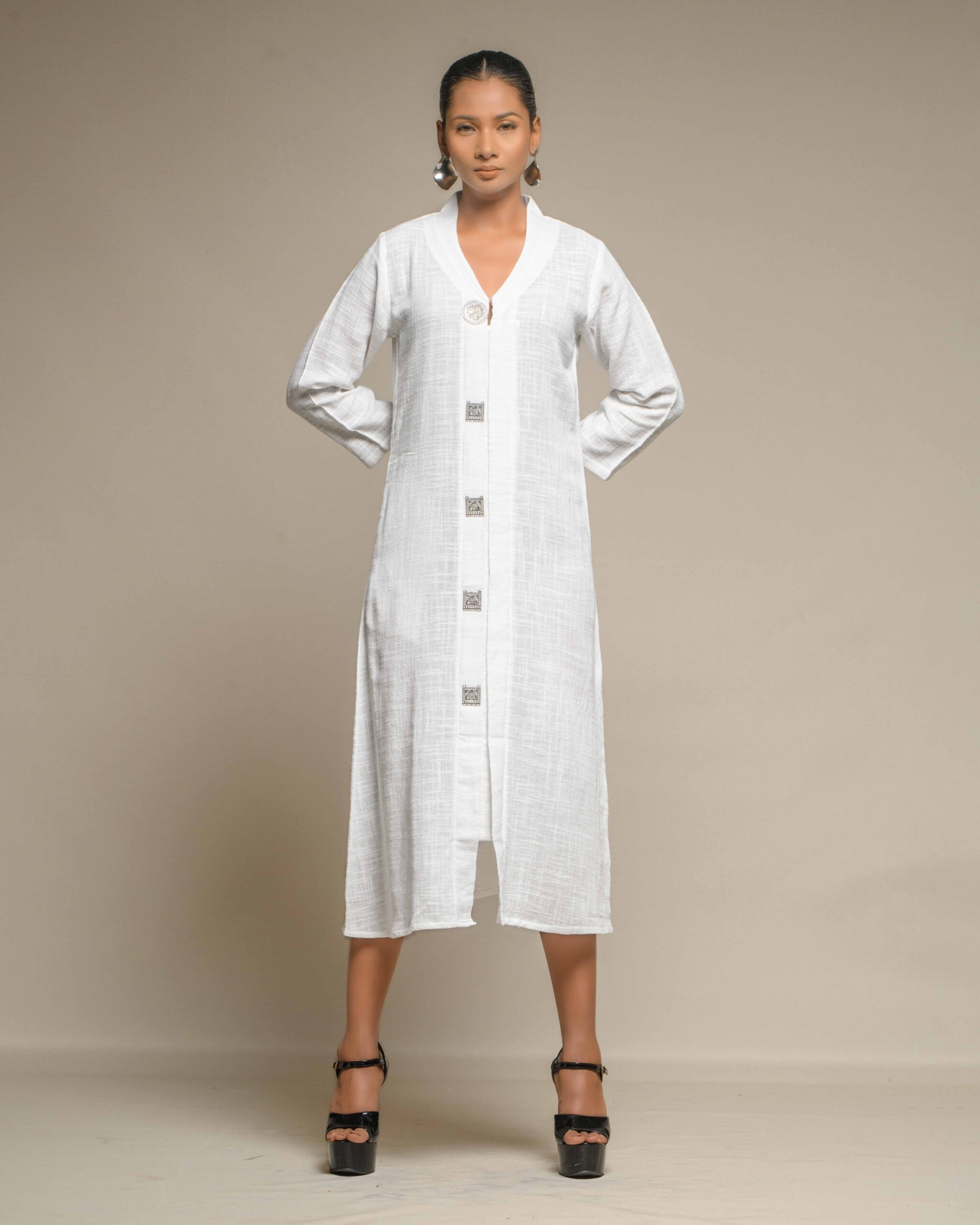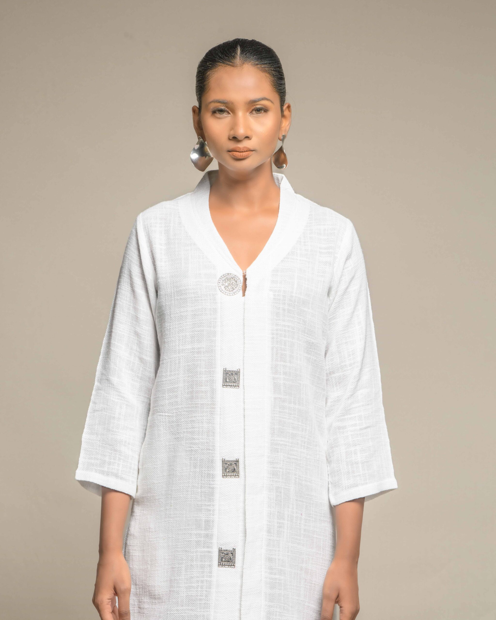 Elegant purity defines this long tunic, crafted from very thin, breathable white slub Khadi for exceptional comfort and a subtle, refined texture. The clean silhouette is modernized by a central placket adorned with striking oxidized metal buttons, creating a beautiful Indo-Western contrast. This conscious piece honors the zero-electricity craft and the artisan’s “humane touch.”