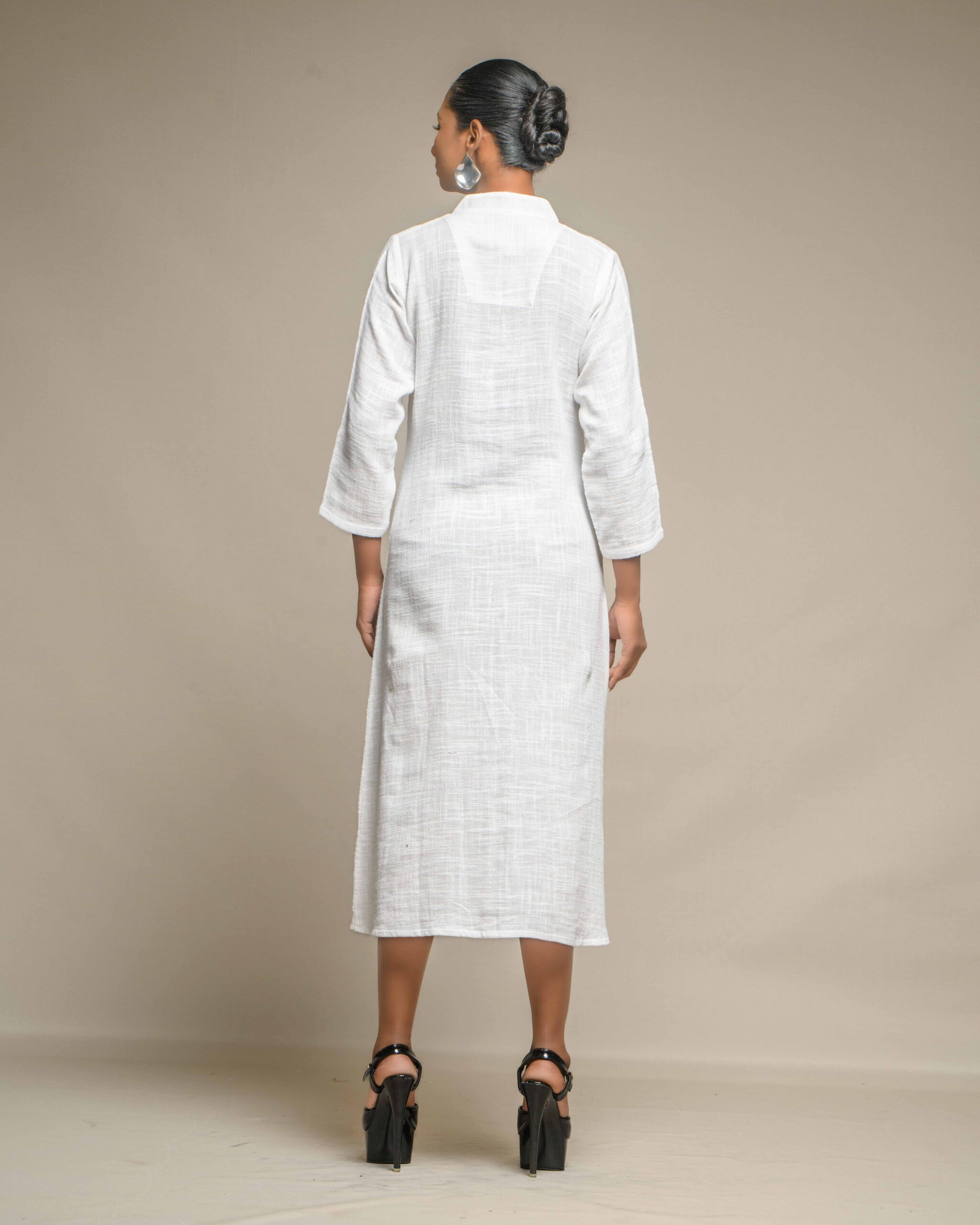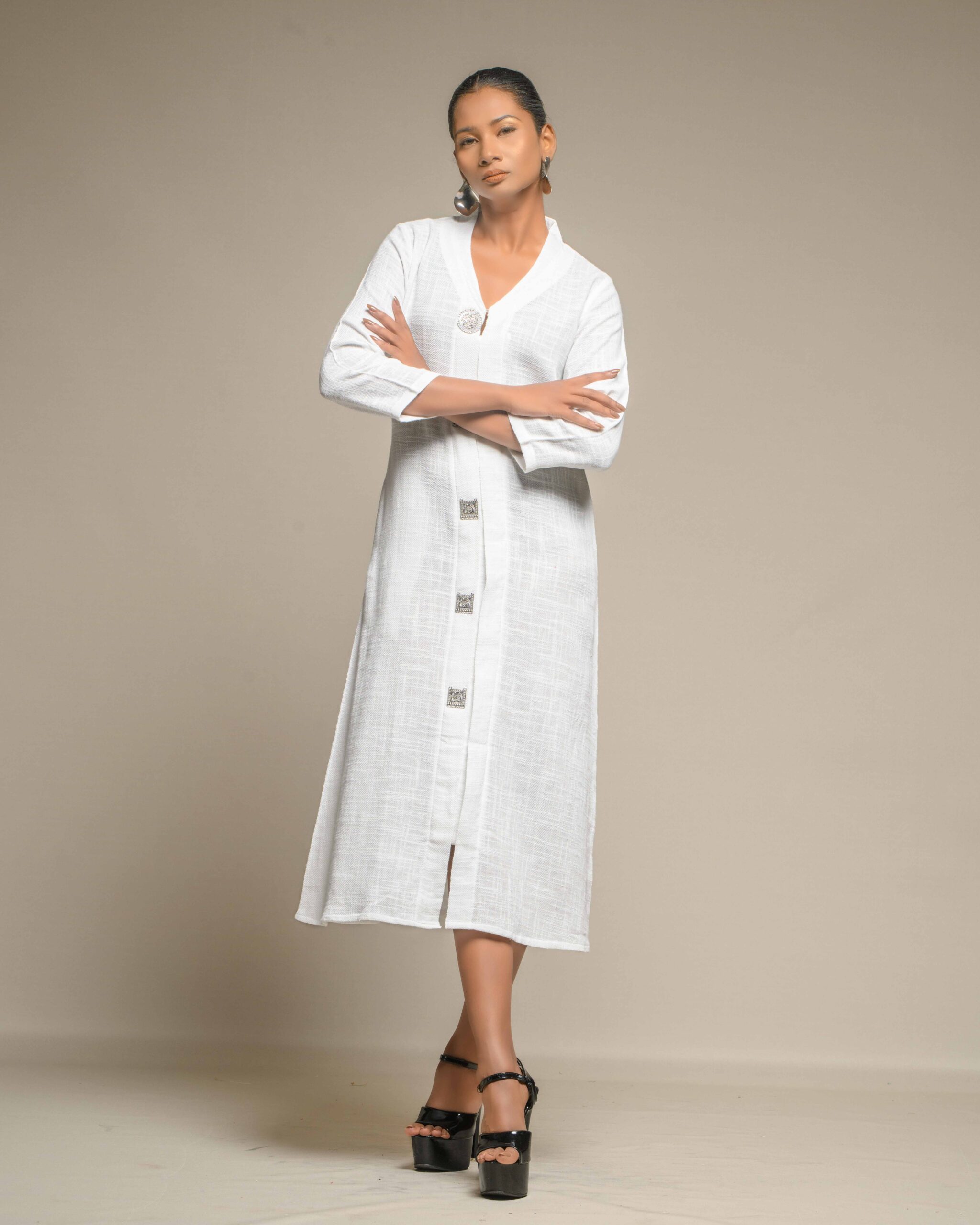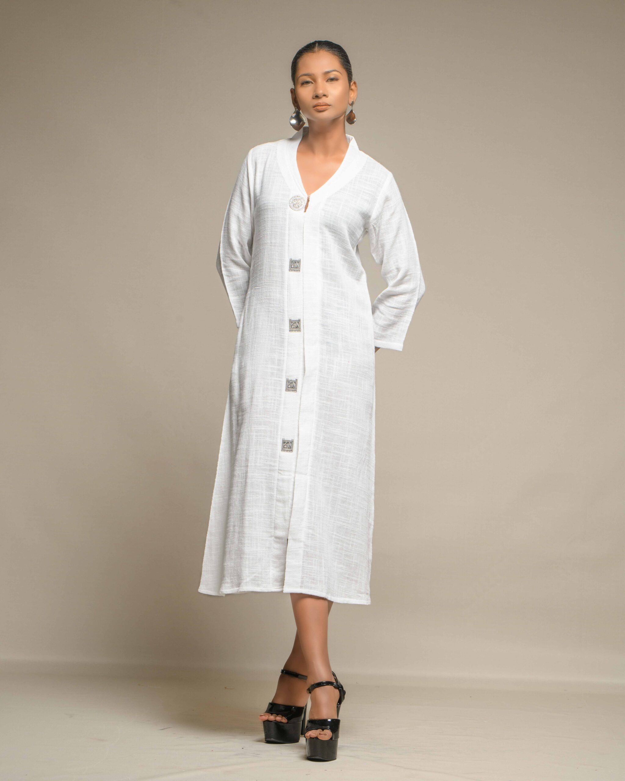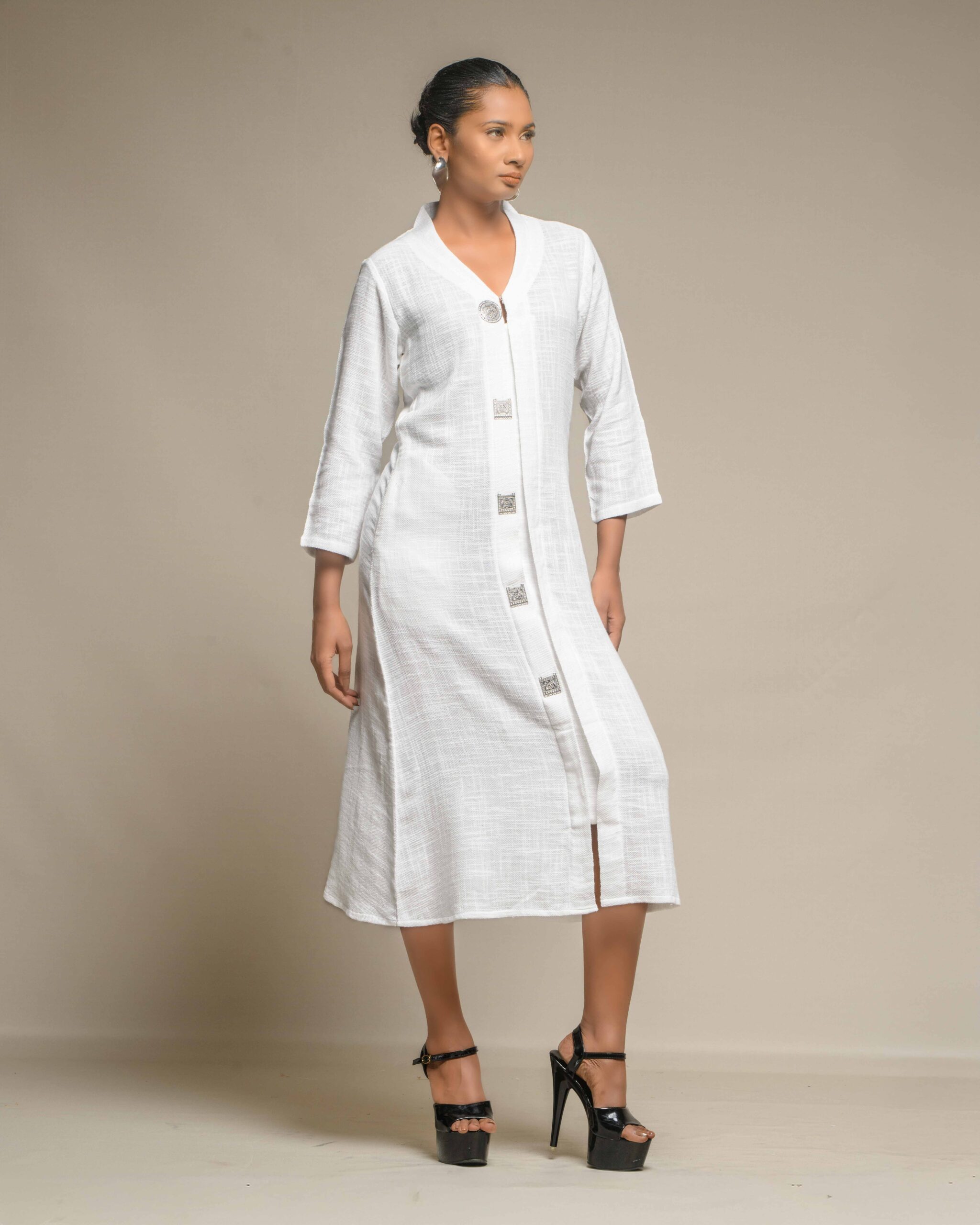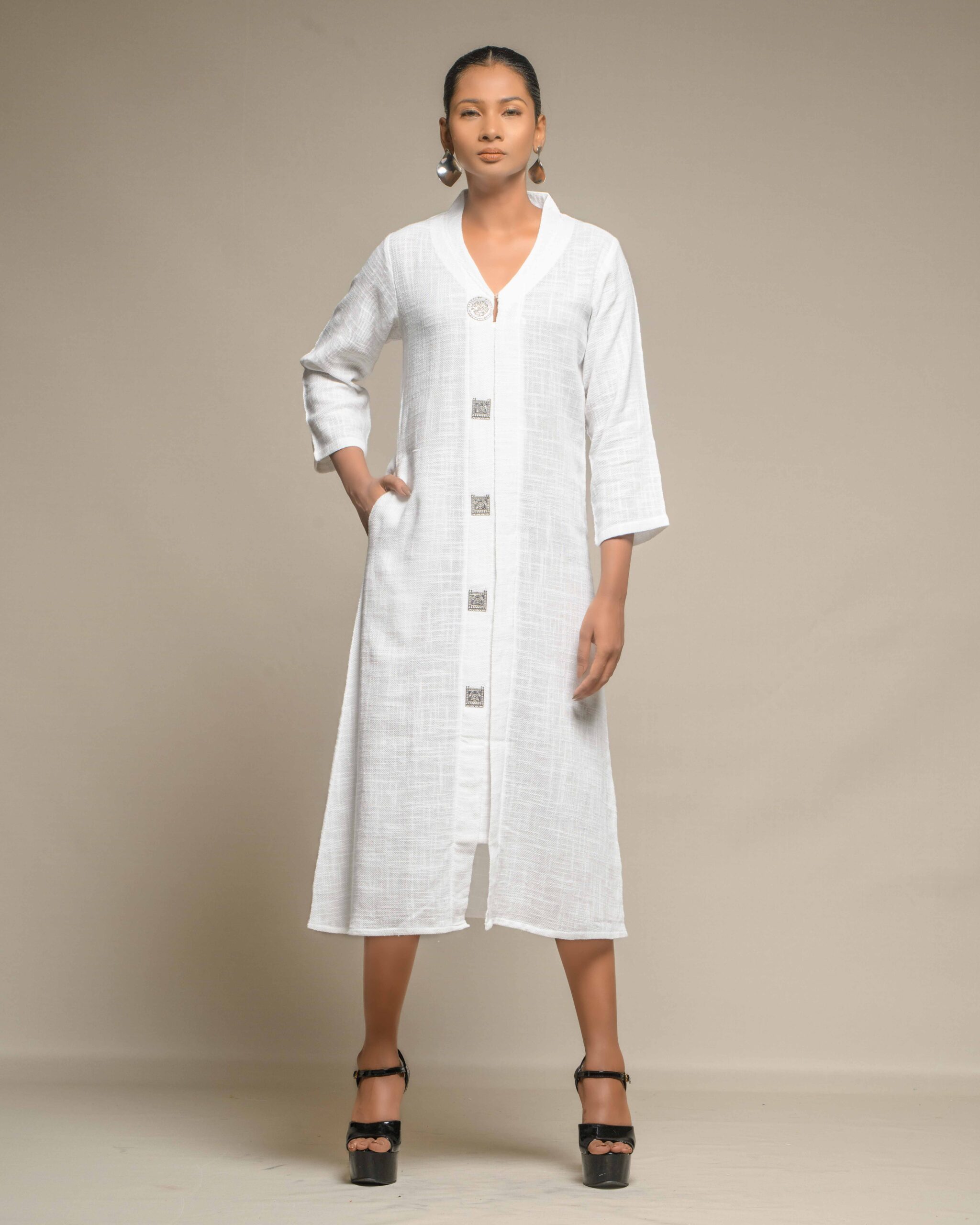 Elegant purity defines this long tunic, crafted from very thin, breathable white slub Khadi for exceptional comfort and a subtle, refined texture. The clean silhouette is modernized by a central placket adorned with striking oxidized metal buttons, creating a beautiful Indo-Western contrast. This conscious piece honors the zero-electricity craft and the artisan’s “humane touch.”