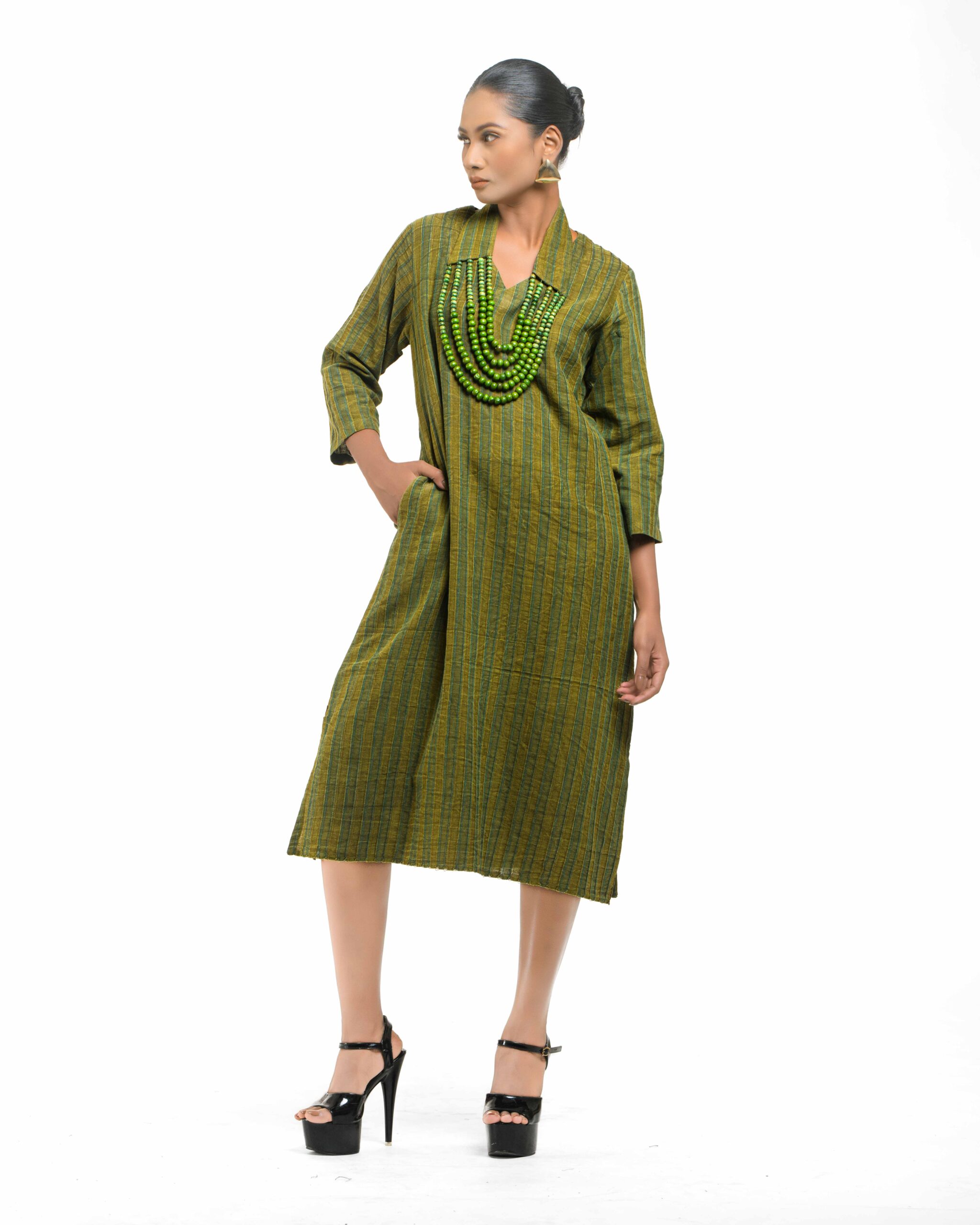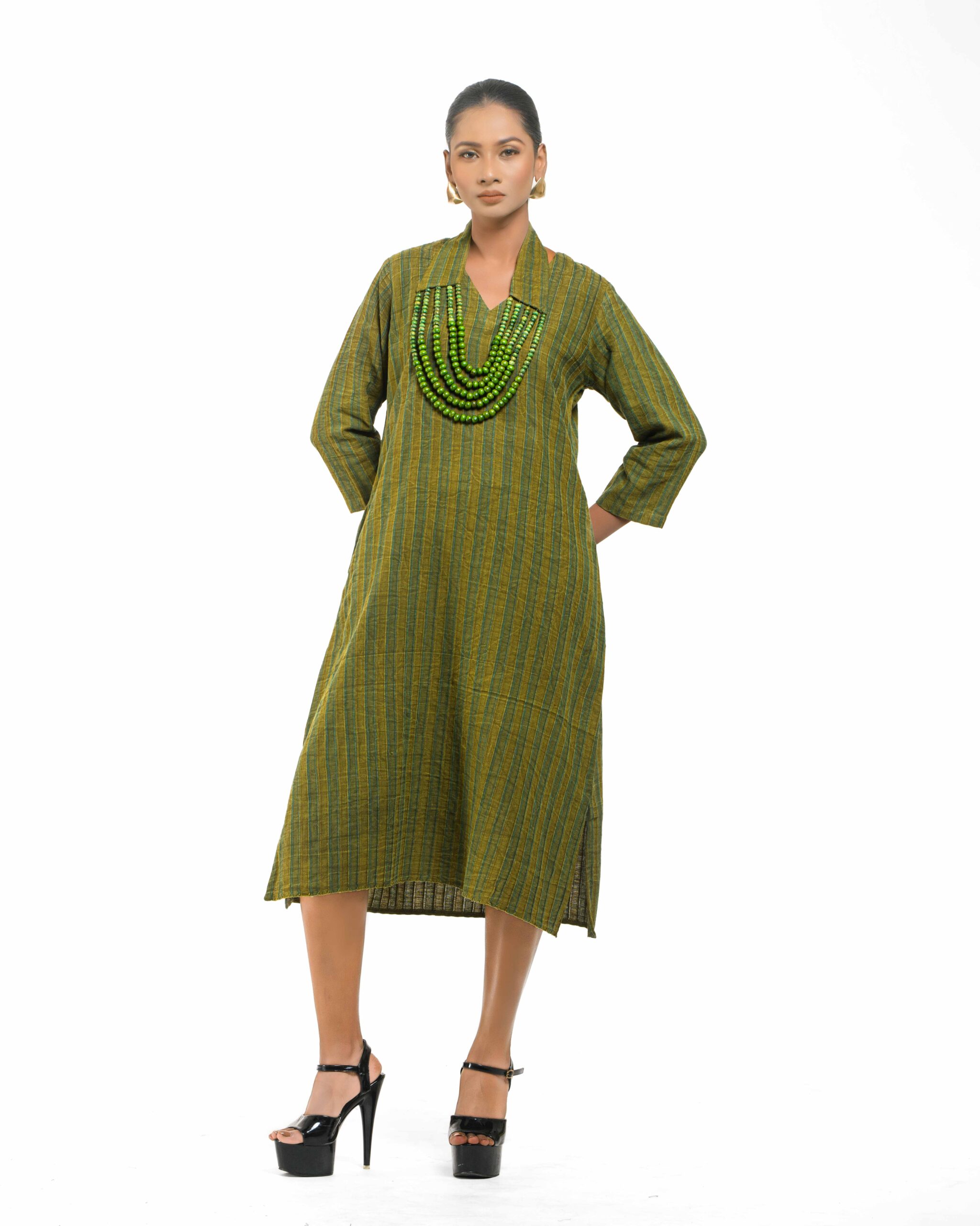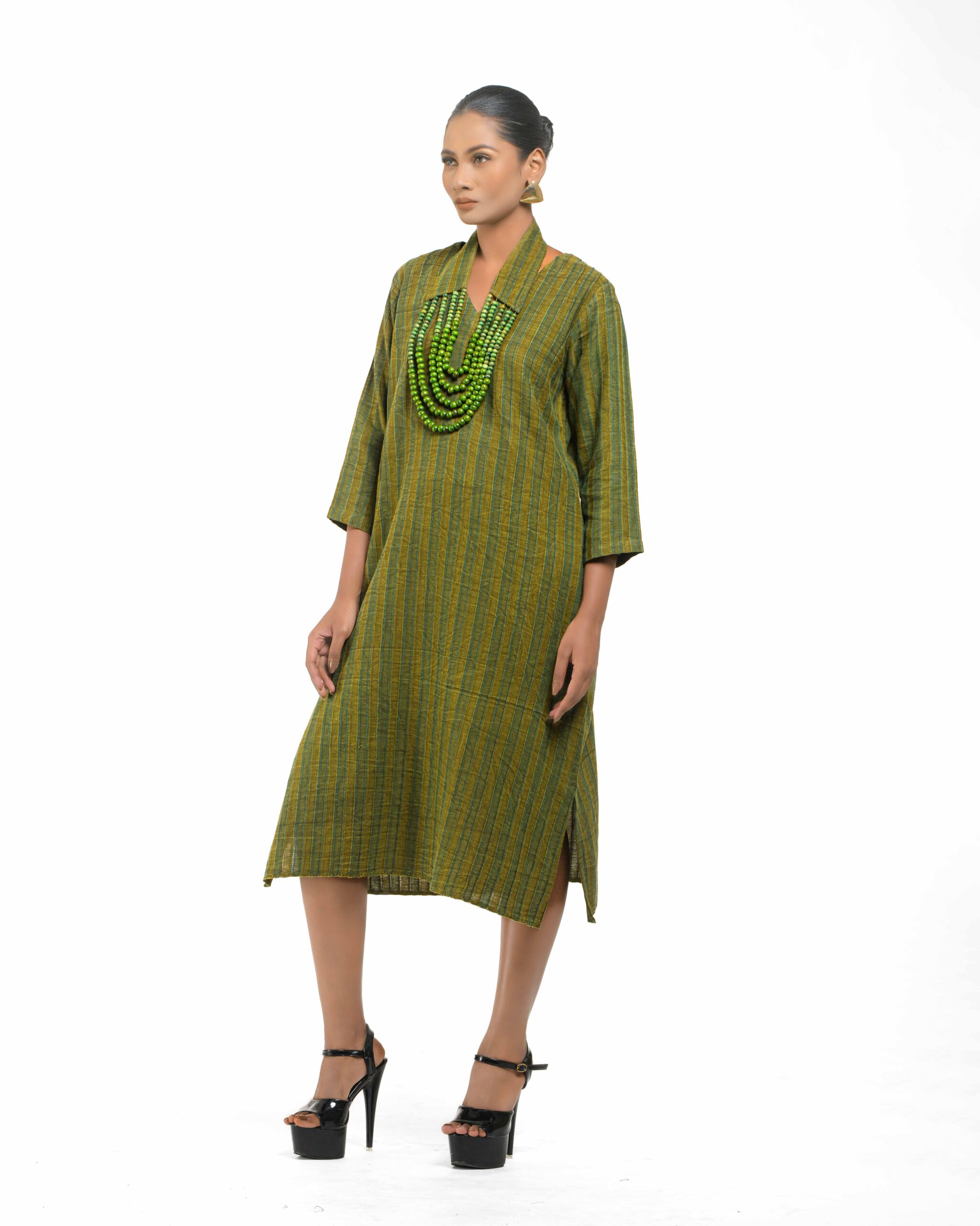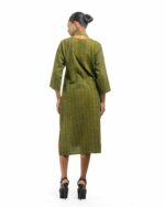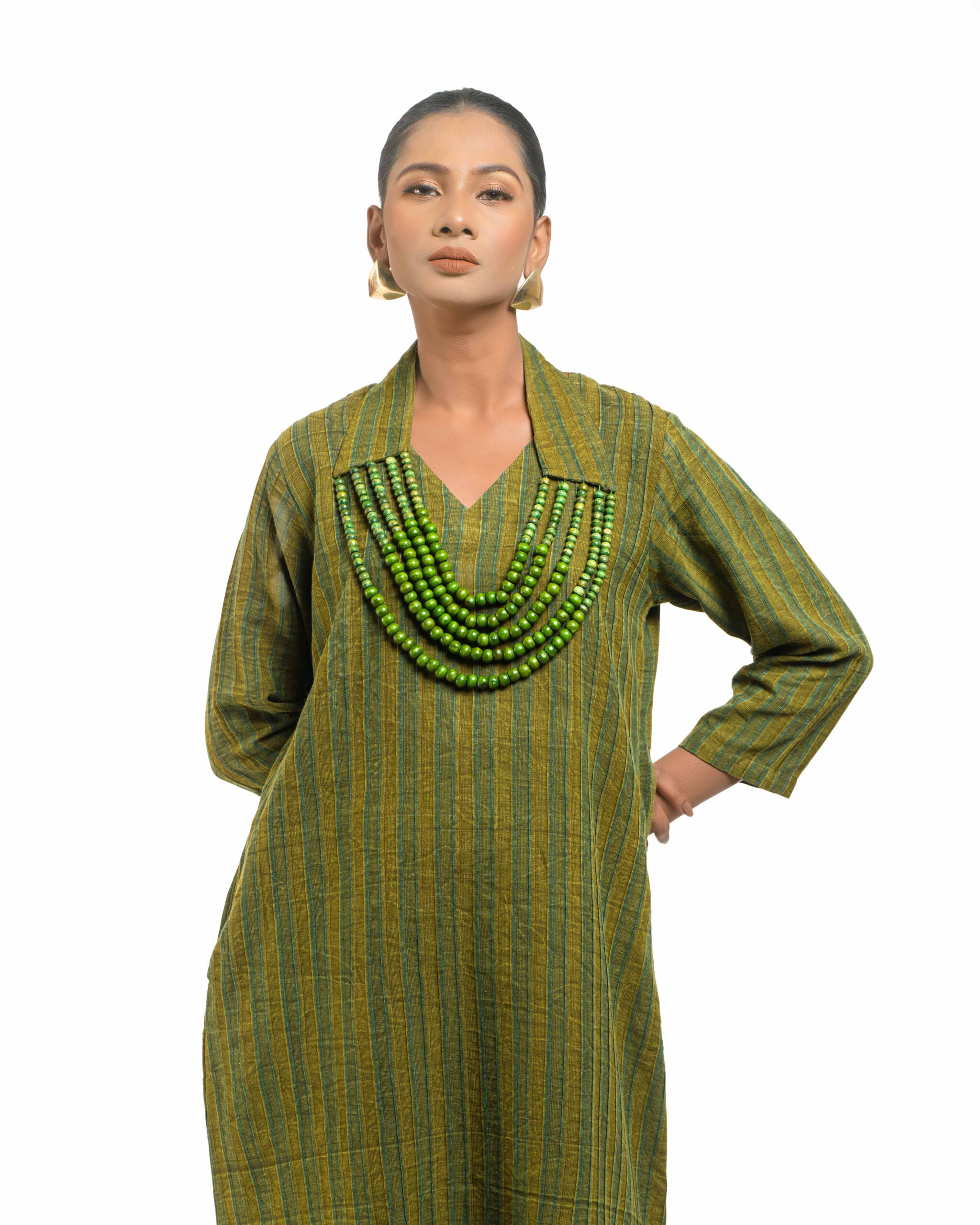 Raw elegance with a rustic edge: This stripe-textured Khadi dress is stone washed to achieve a desirable rustic finish. The garment features a crisp silhouette, perfectly paired with a unique, handmade collar-shaped neckpiece dangling with natural wooden beads. This piece is conscious Indo-Western fusion, woven with the artisan’s “humane touch.”