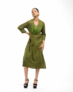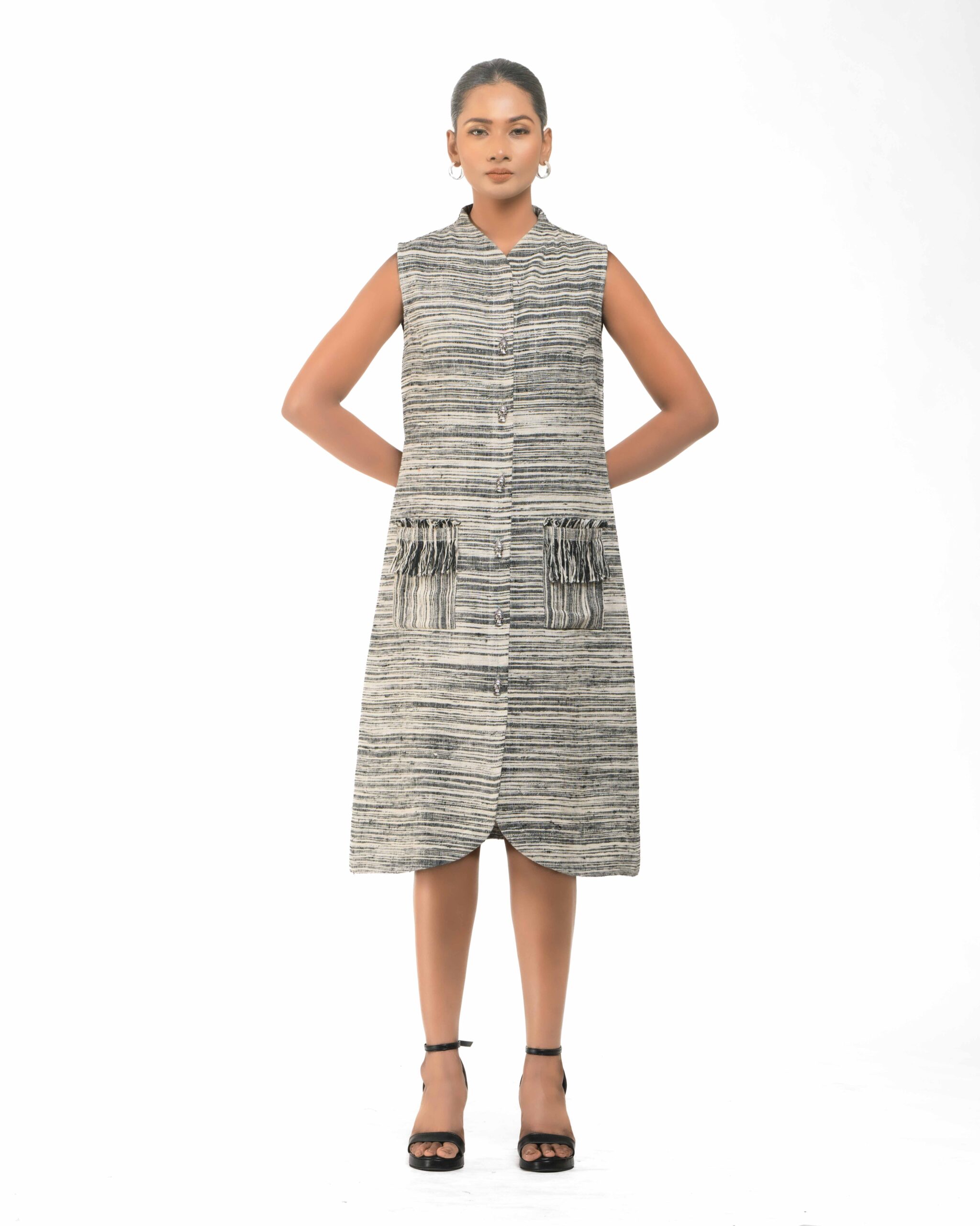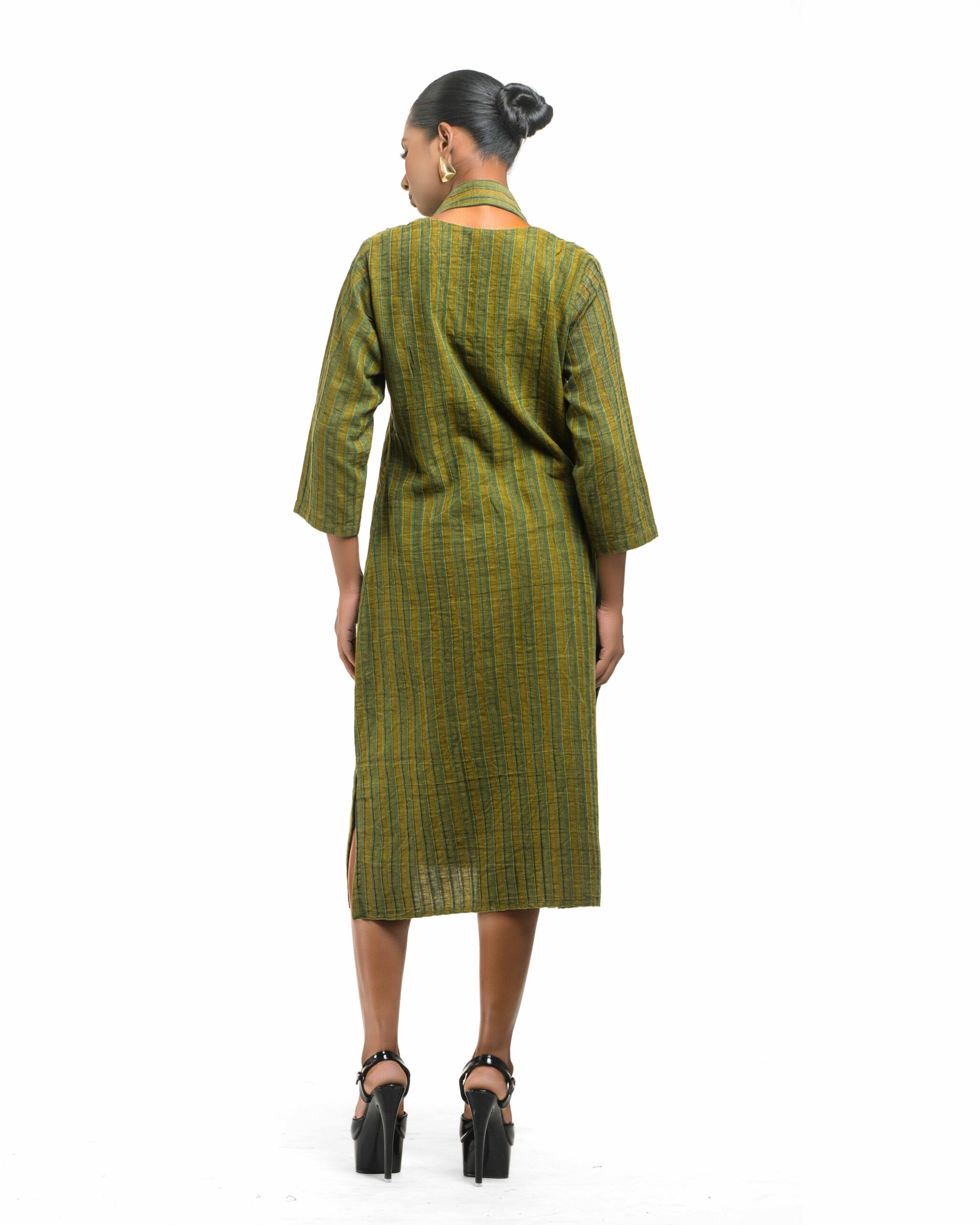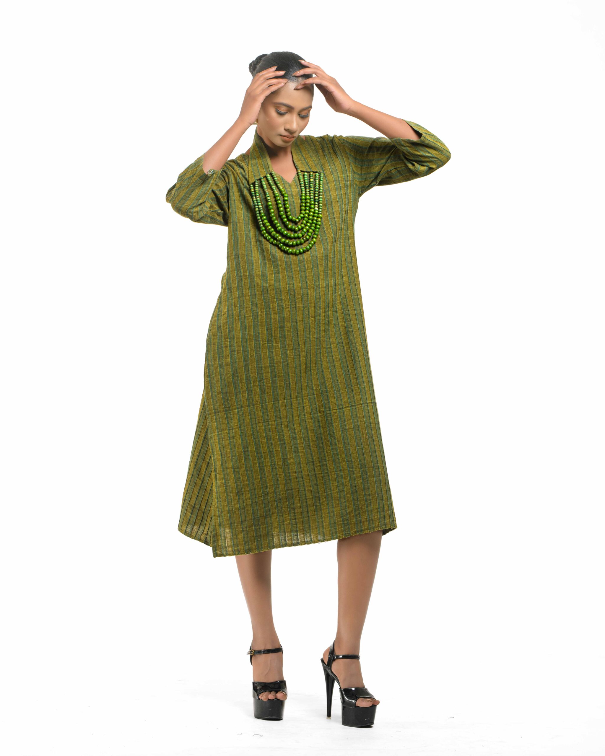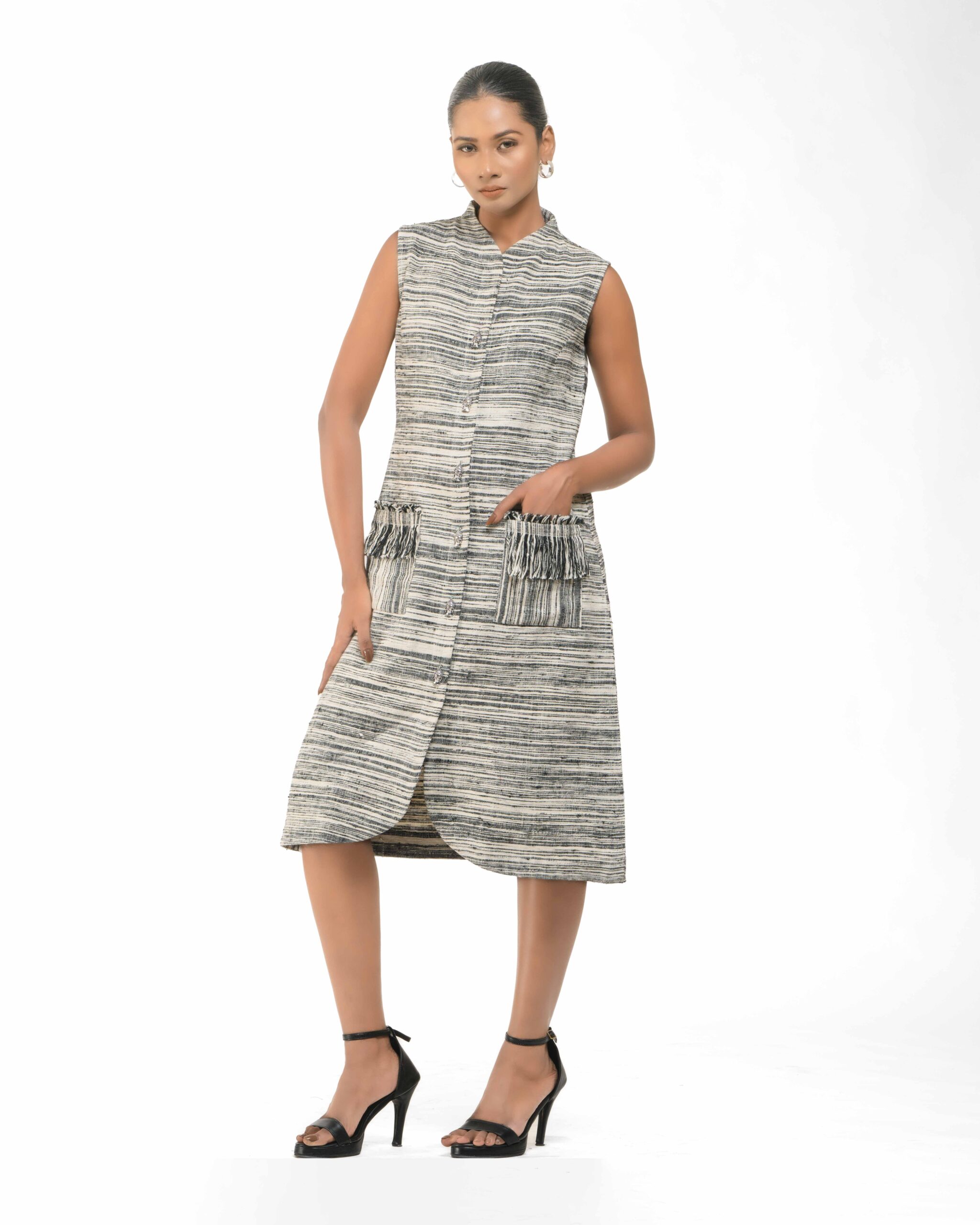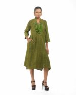 Raw elegance with a rustic edge: This stripe-textured Khadi dress is stone washed to achieve a desirable rustic finish. The garment features a crisp silhouette, perfectly paired with a unique, handmade collar-shaped neckpiece dangling with natural wooden beads. This piece is conscious Indo-Western fusion, woven with the artisan’s “humane touch.”
