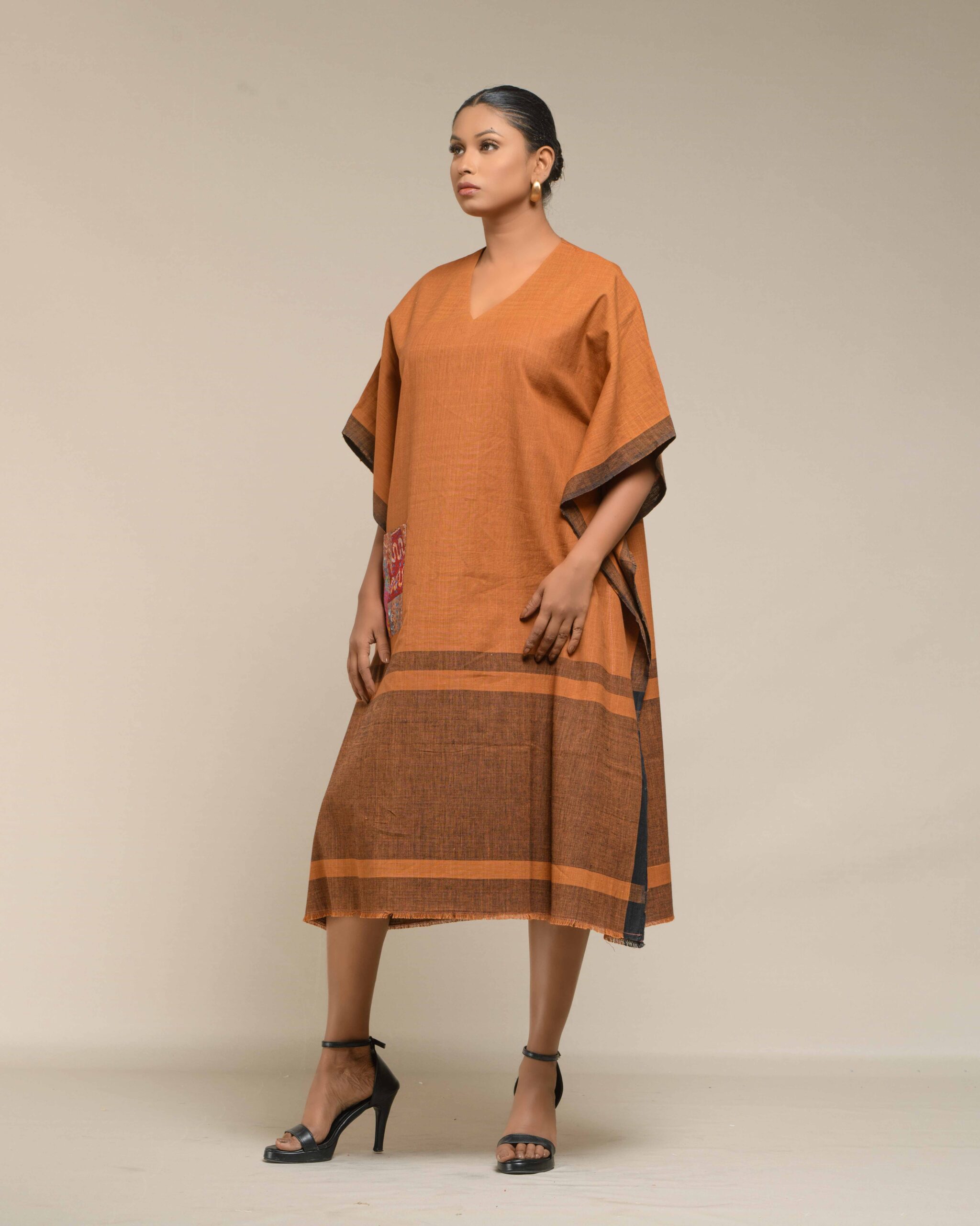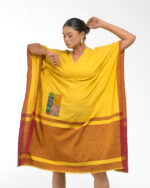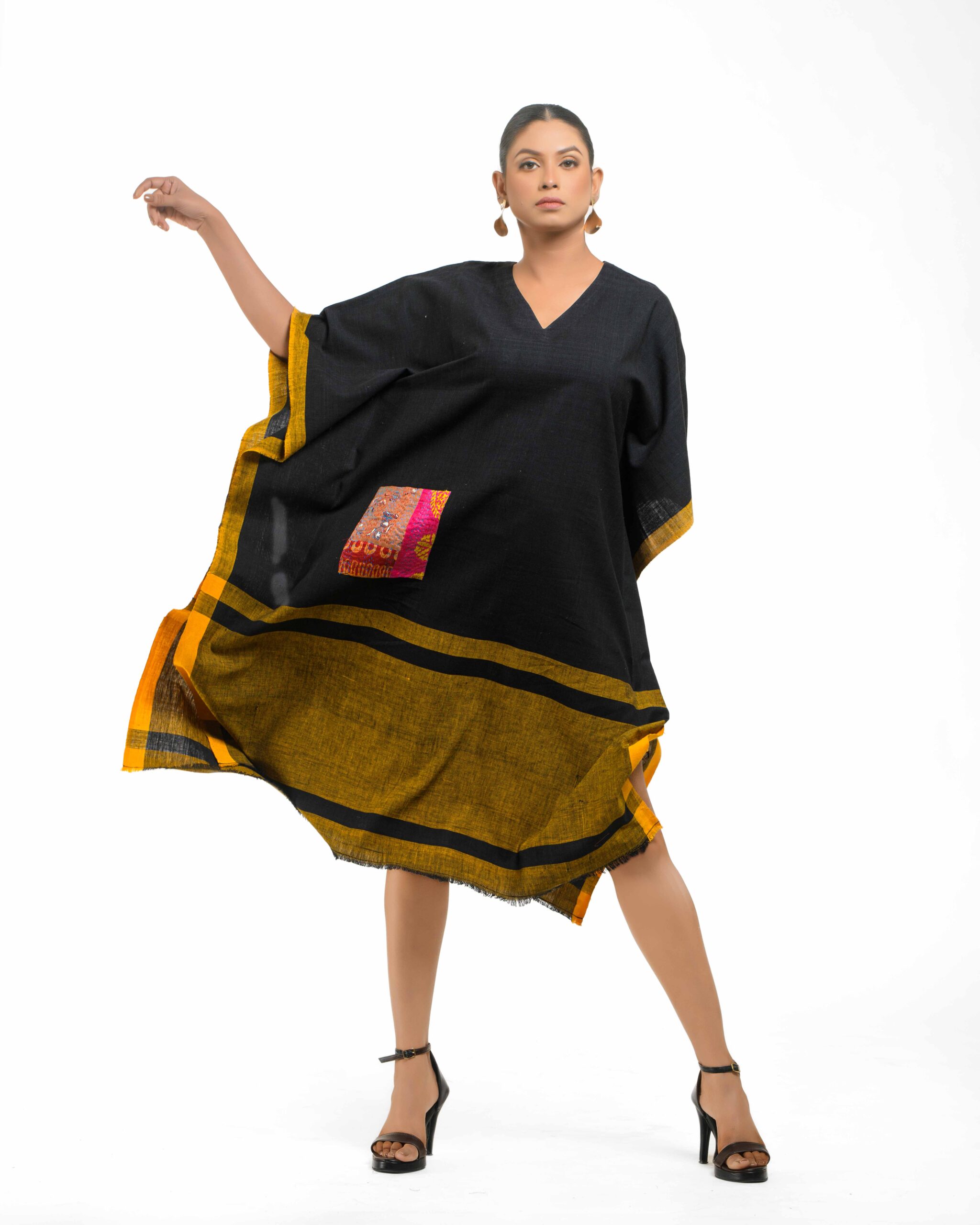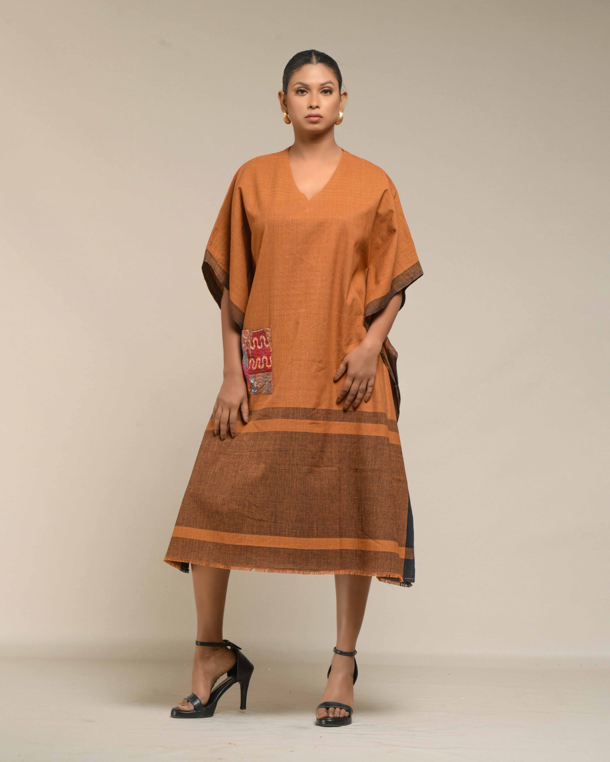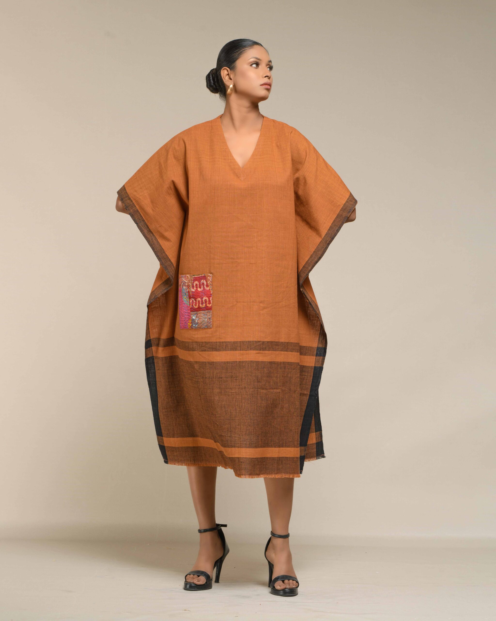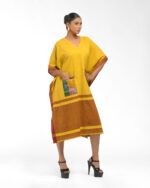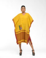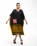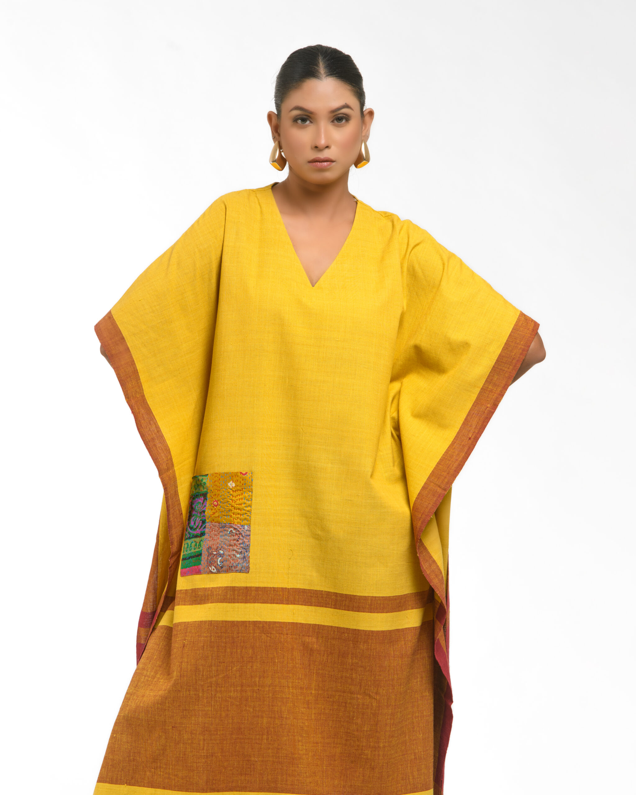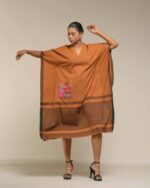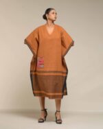 Silhouetted in airy, thin and soft Khadi, this kaftan delivers fluid comfort, perfect for the Summer Chic aesthetic. The fabric is secured with azo-free dyes for purity, while the striking Kantha-embroidered patch pocket champions conscious, artistic design and the artisan’s “humane touch.”