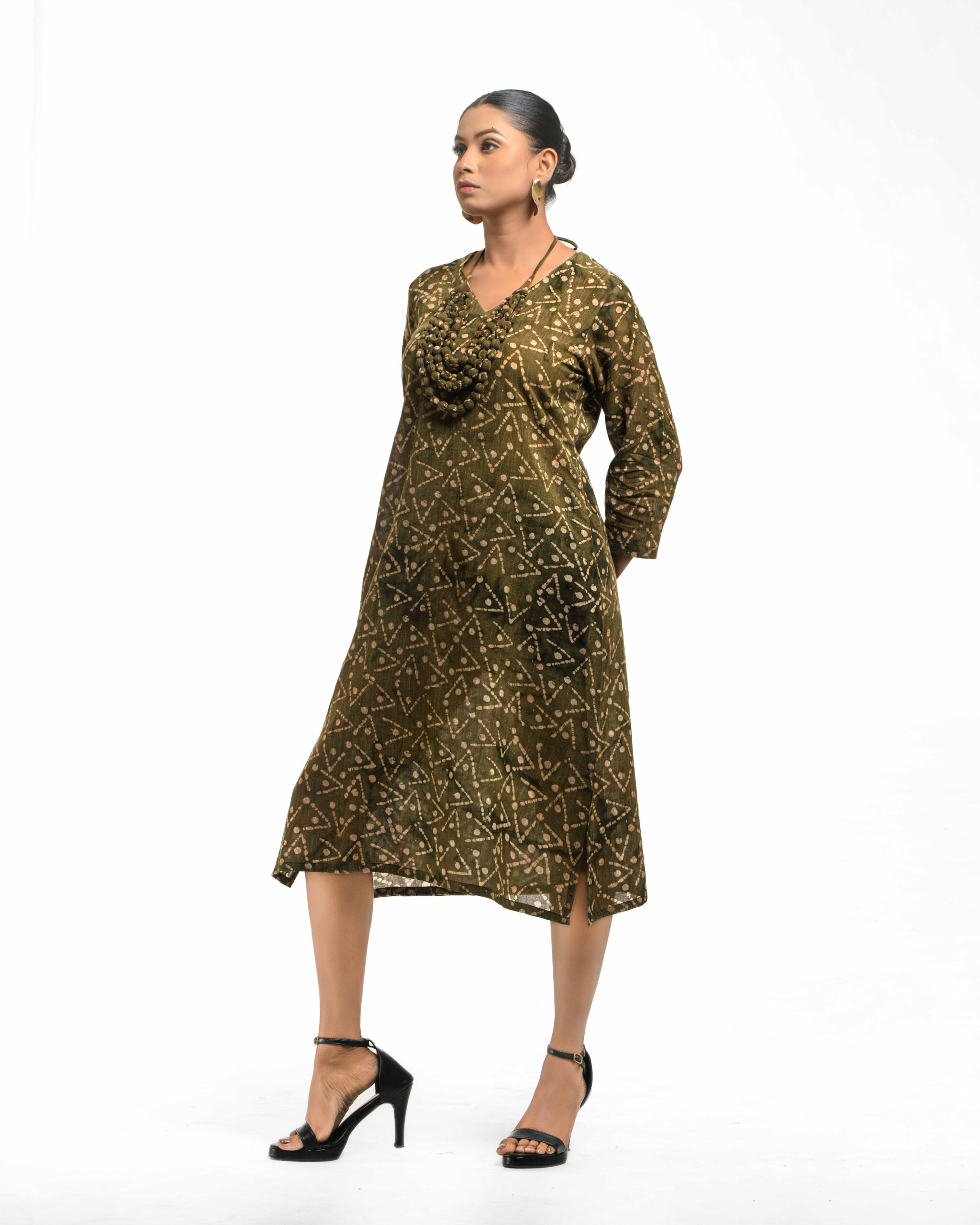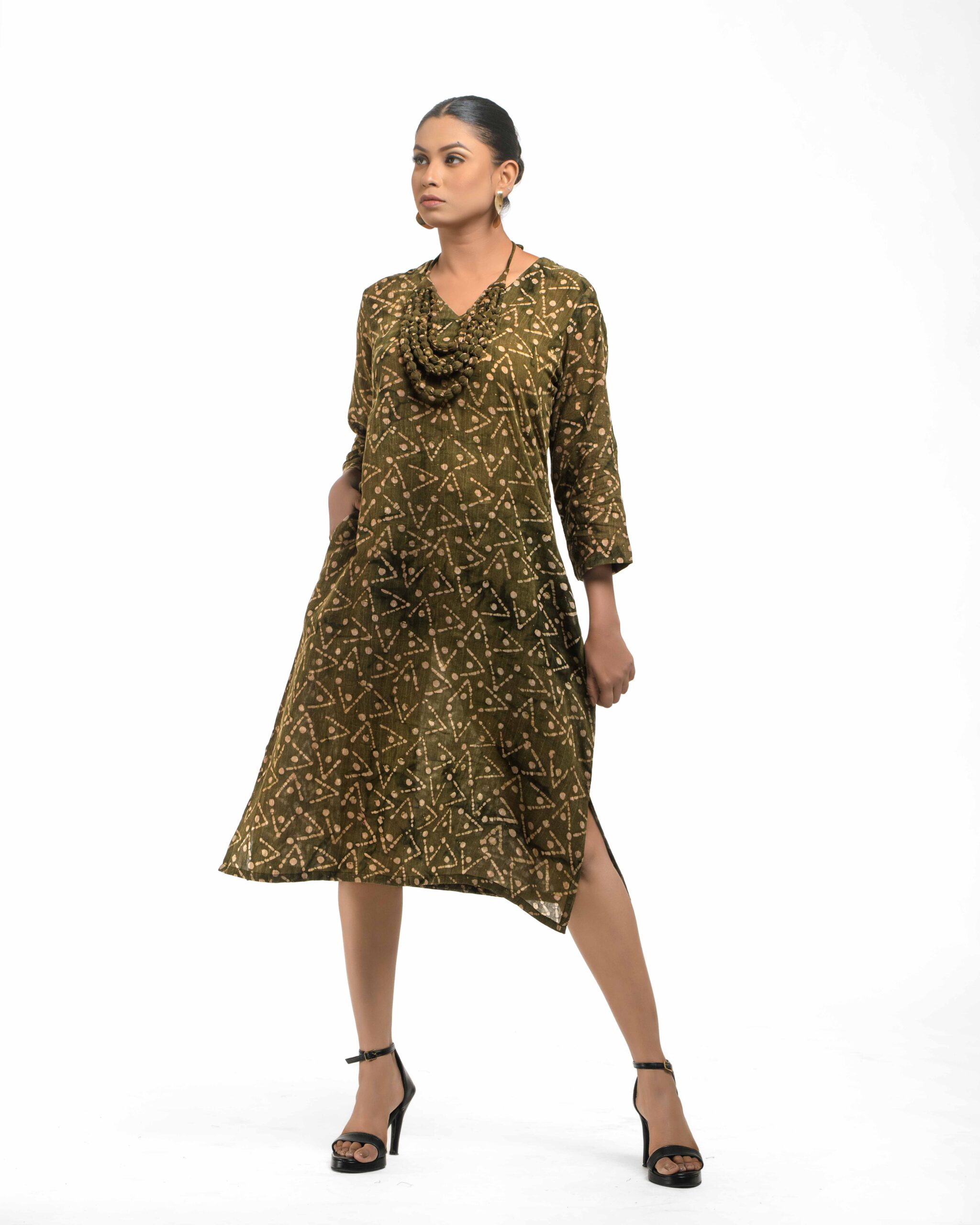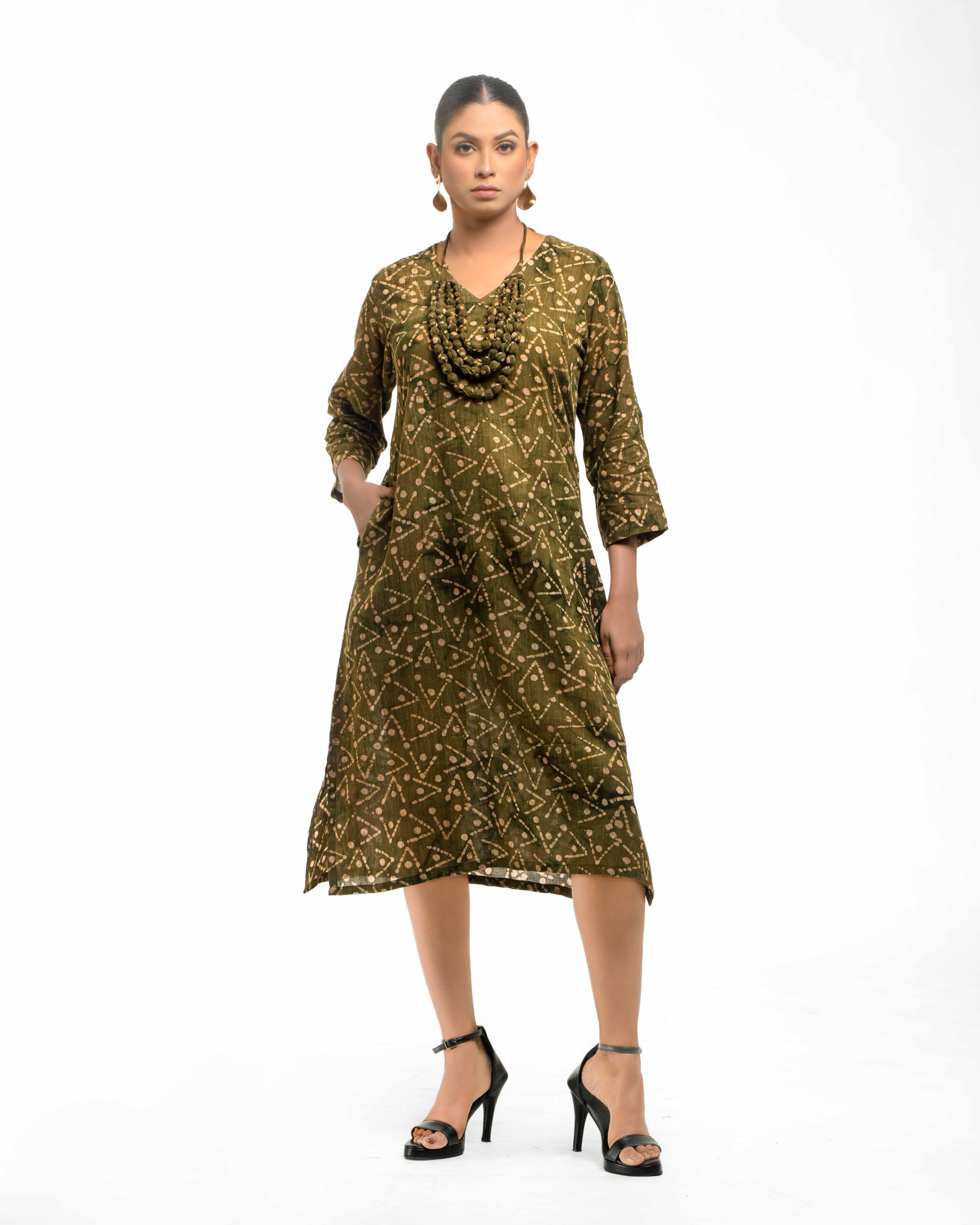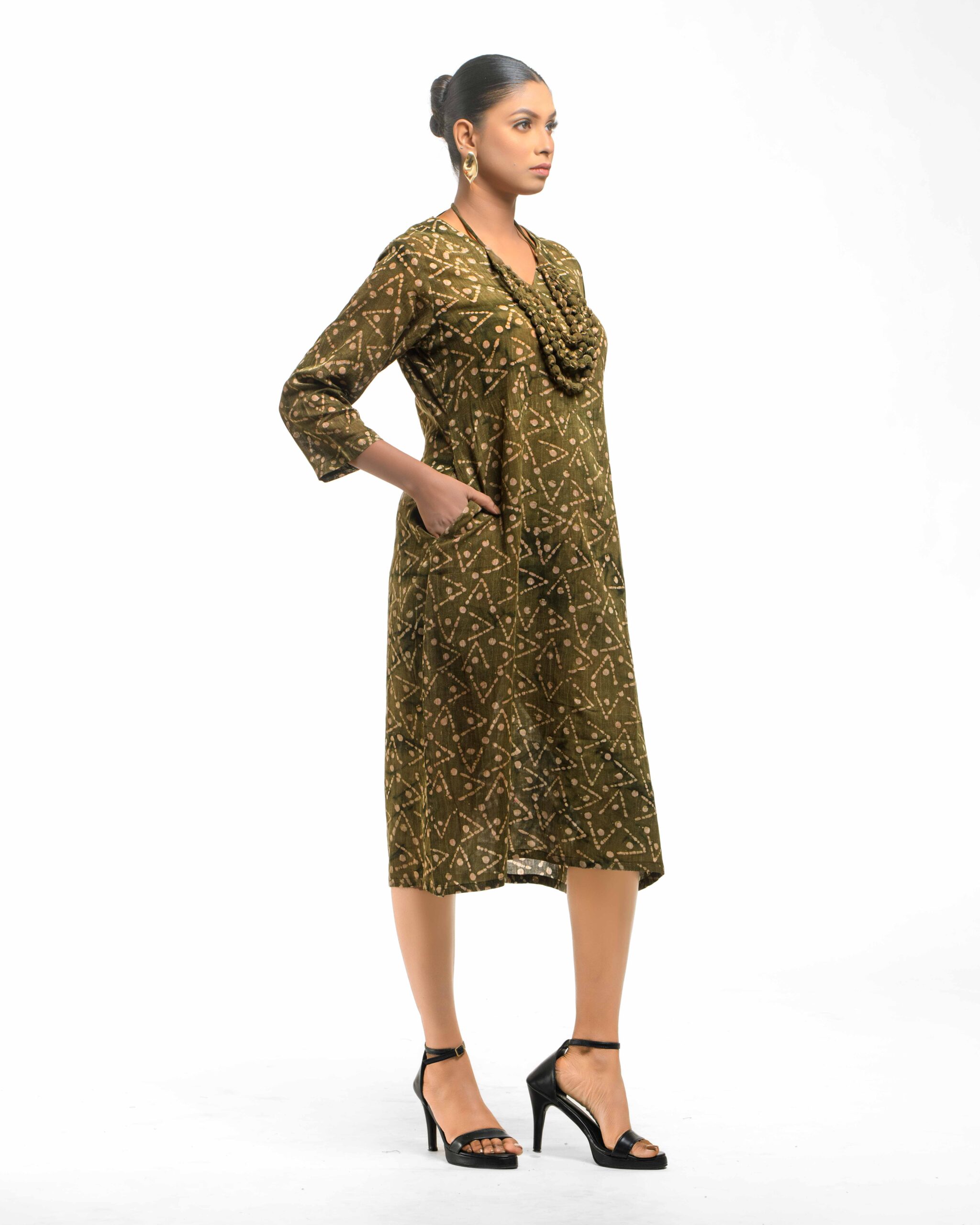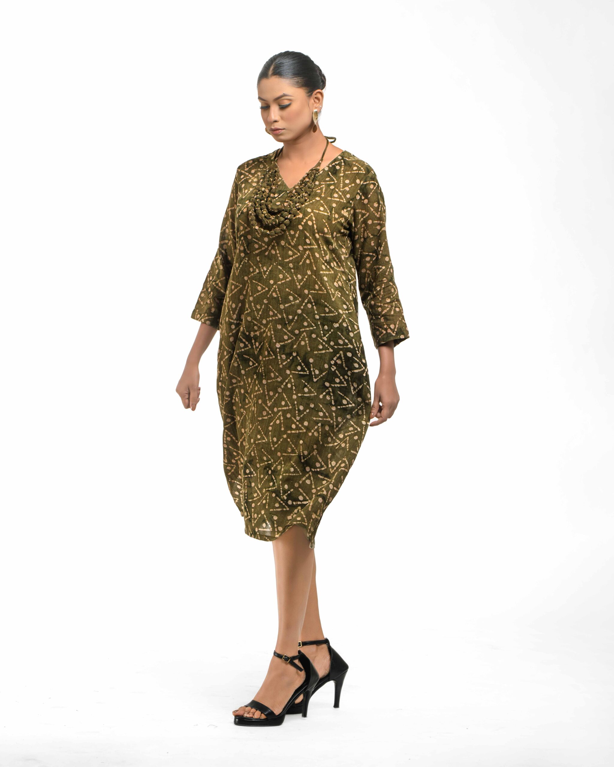 Crafted from soft, stone-washed handloom fabric, this dress features an intricate Batik print for a naturally worn, artistic texture. The simple silhouette is beautifully elevated by the unique hand-made necklace detail, transforming a basic piece into a conscious statement of subtle artisanal luxury.