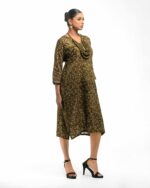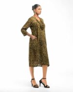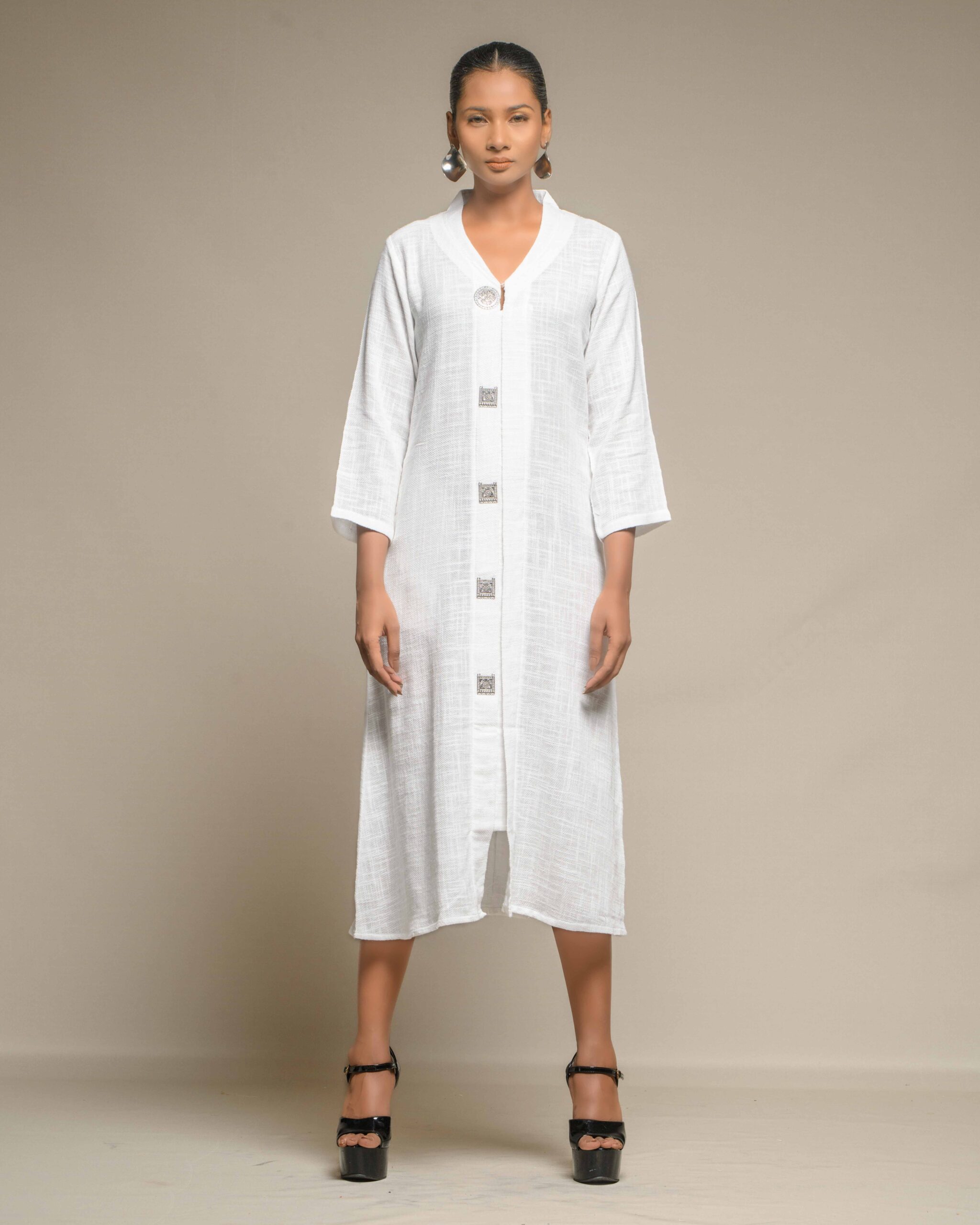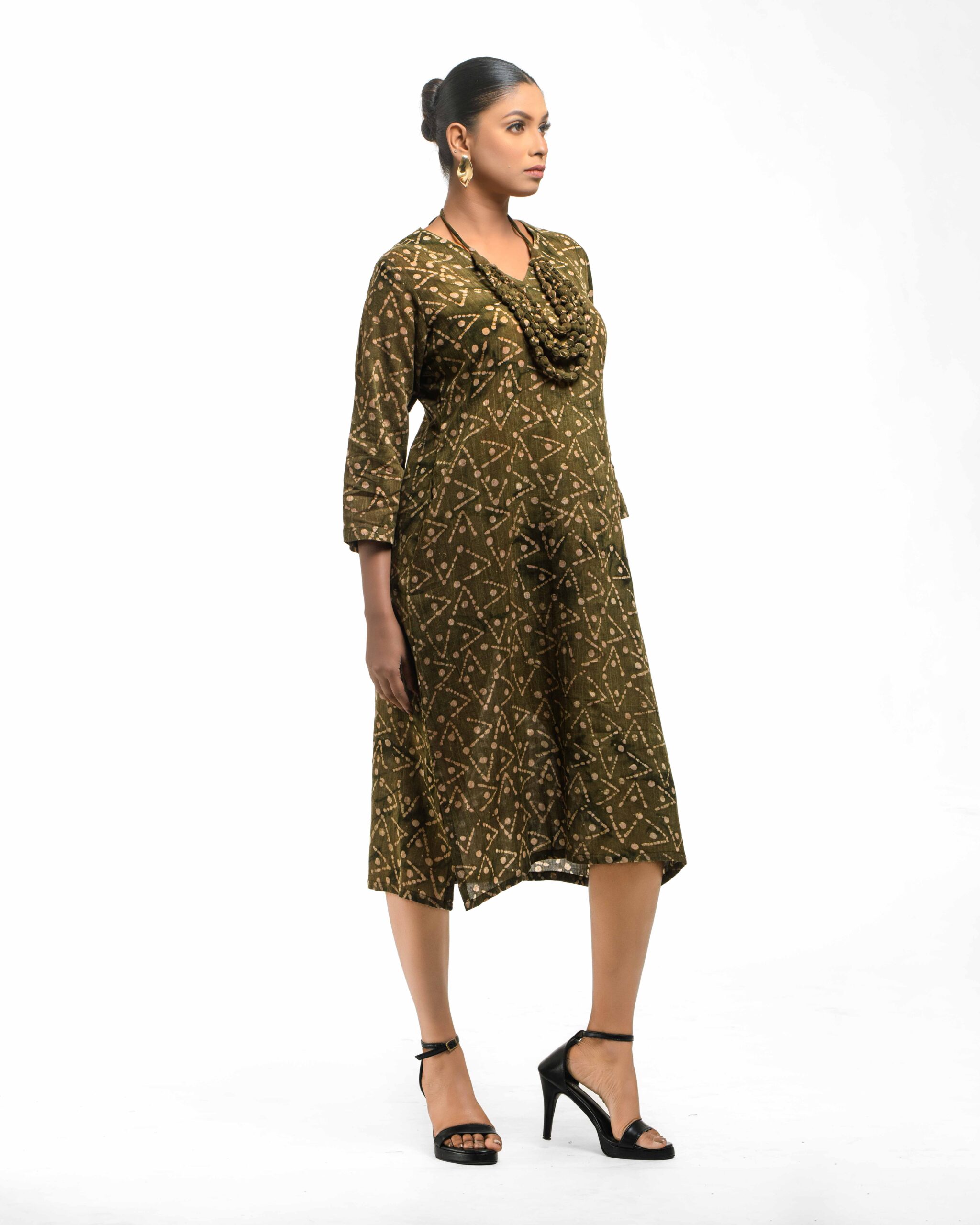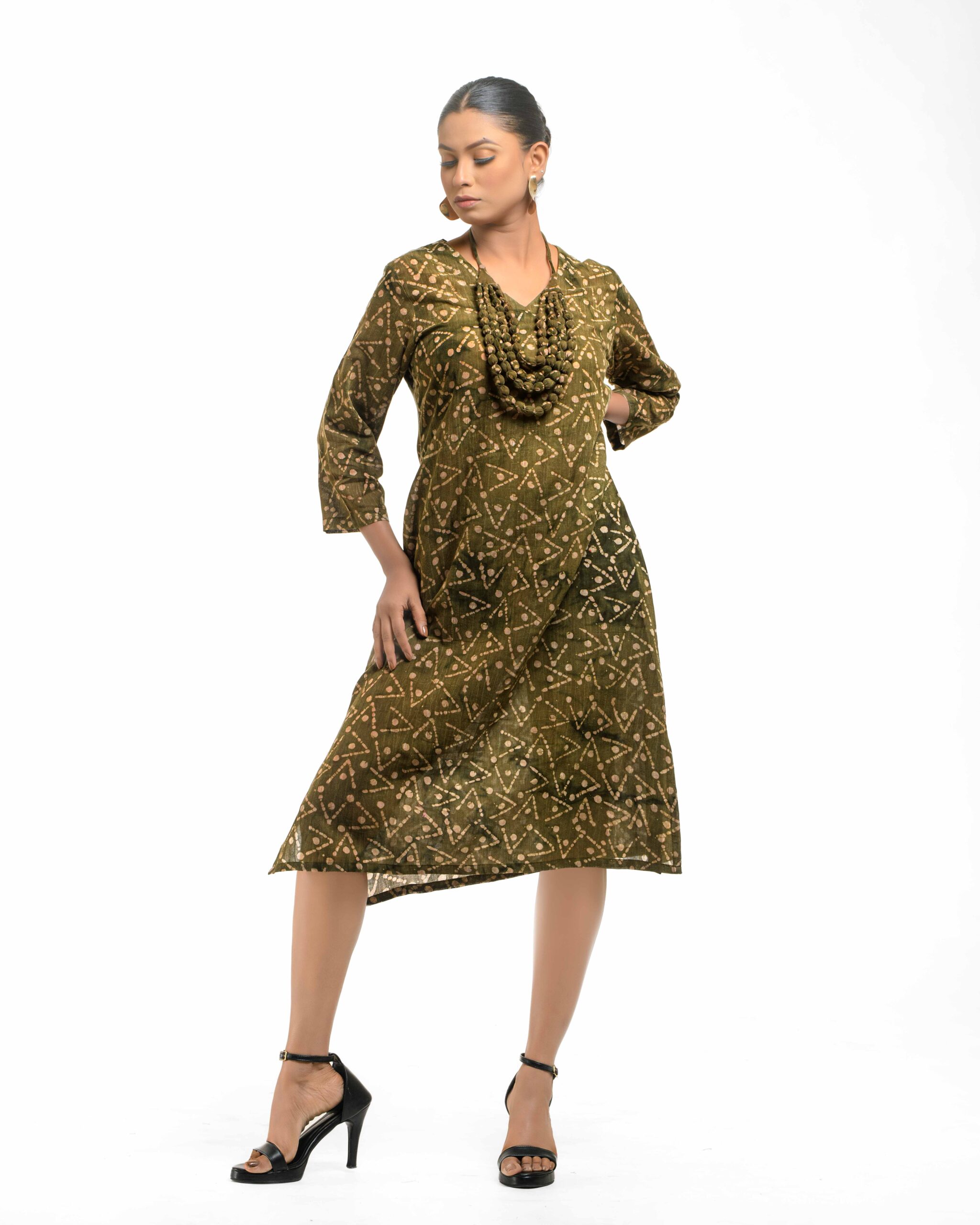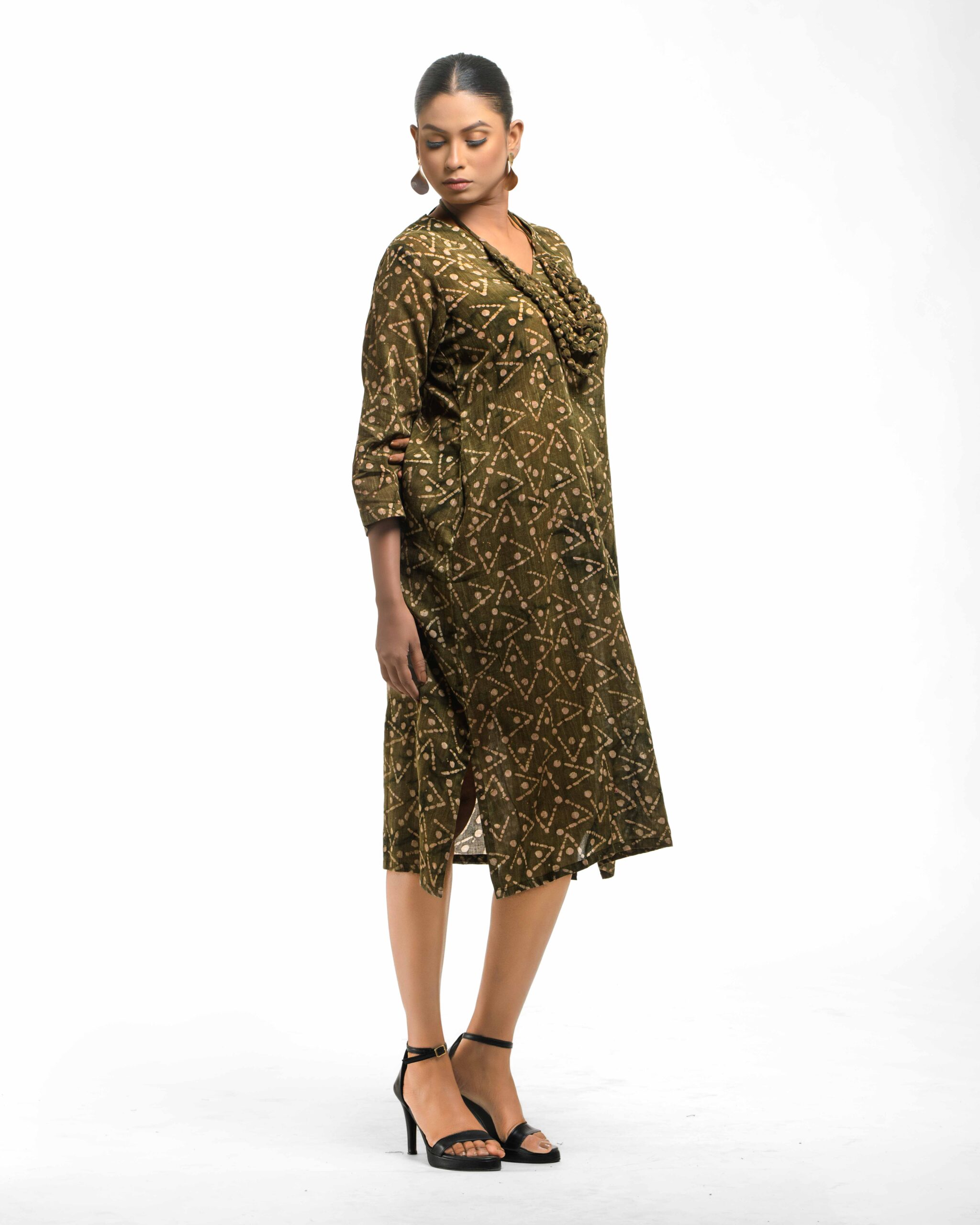 Crafted from soft, stone-washed handloom fabric, this dress features an intricate Batik print for a naturally worn, artistic texture. The simple silhouette is beautifully elevated by the unique hand-made necklace detail, transforming a basic piece into a conscious statement of subtle artisanal luxury.