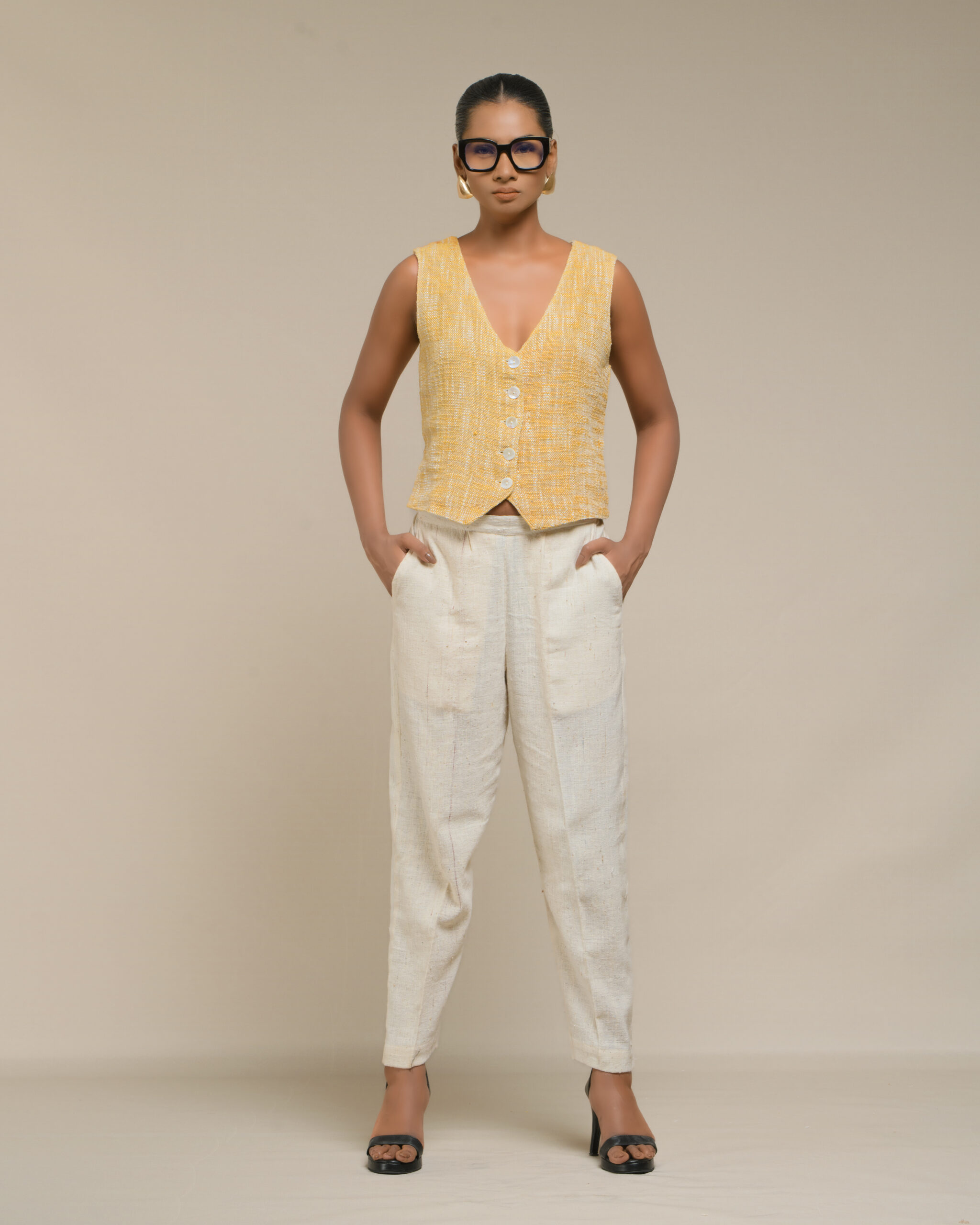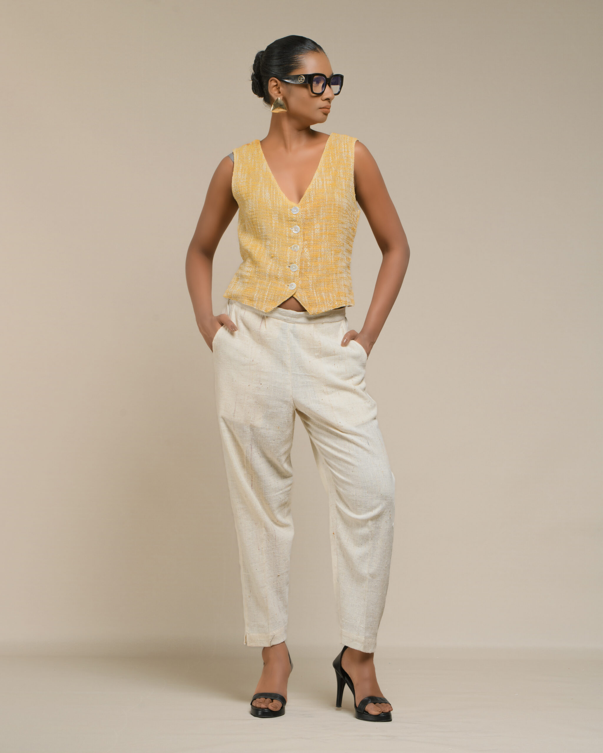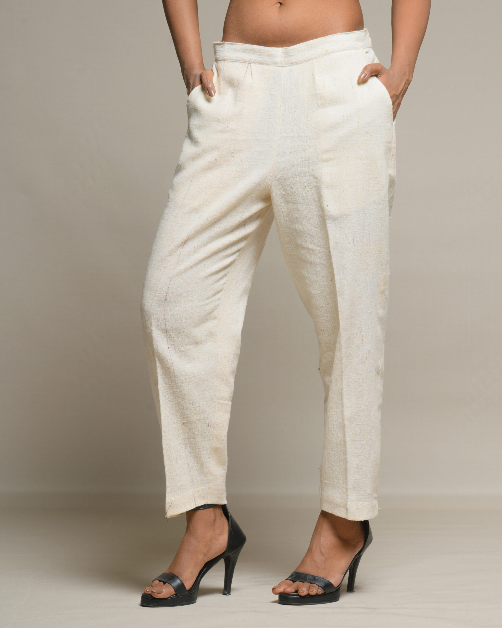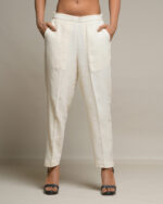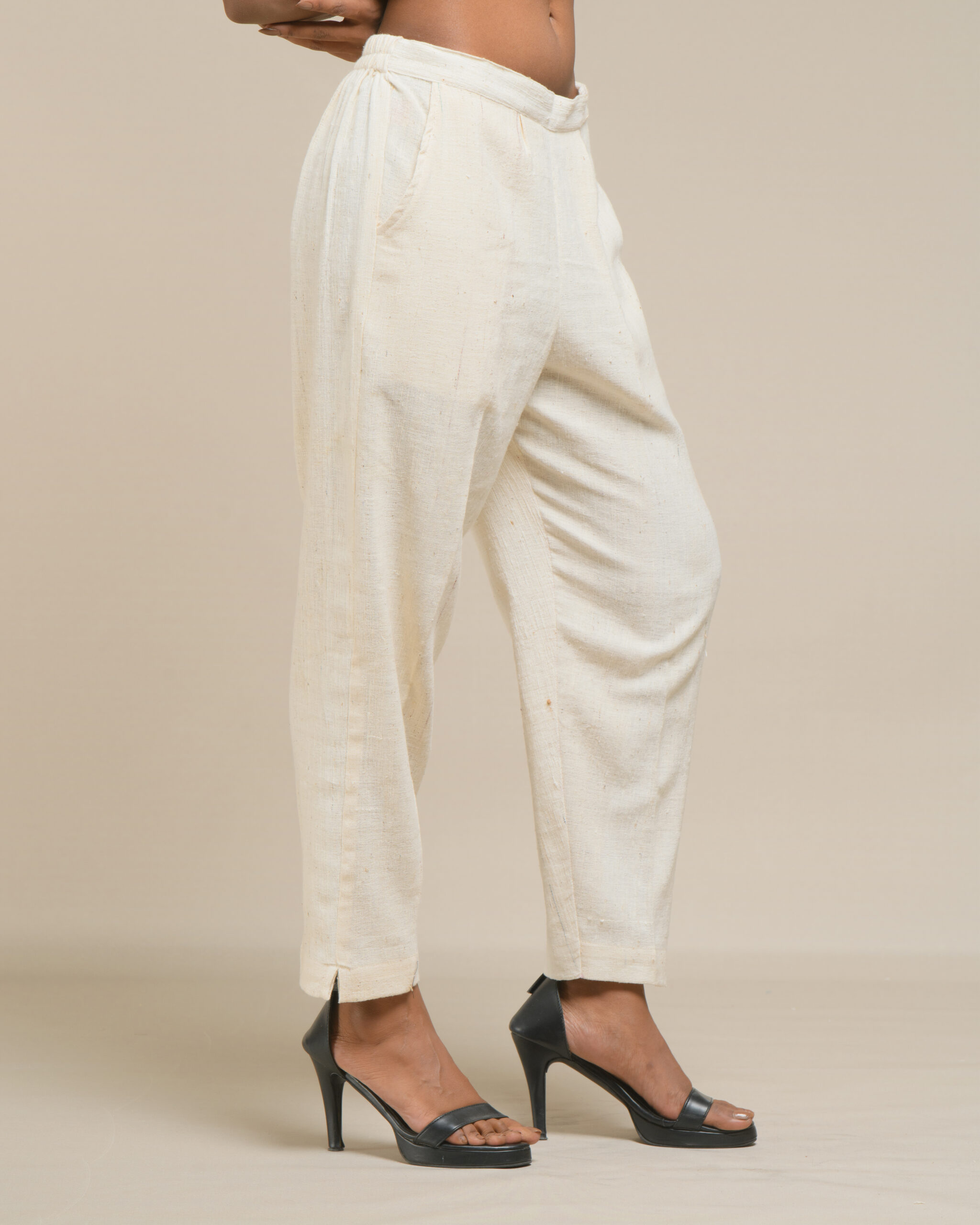 Modernity meets heritage in The Freedom Straight, a cigarette pant reimagined for the young and the restless. Crafted from our most authentic, hand-woven Khadi, this piece is a masterclass in simple silhouettes and timeless versatility, designed to be the foundation of a sustainable wardrobe that never goes out of fashion.The design honors your need for both effortless style and absolute comfort, featuring a clean, flat-front aesthetic paired with a discreet elasticated back and deep, functional pockets.