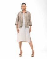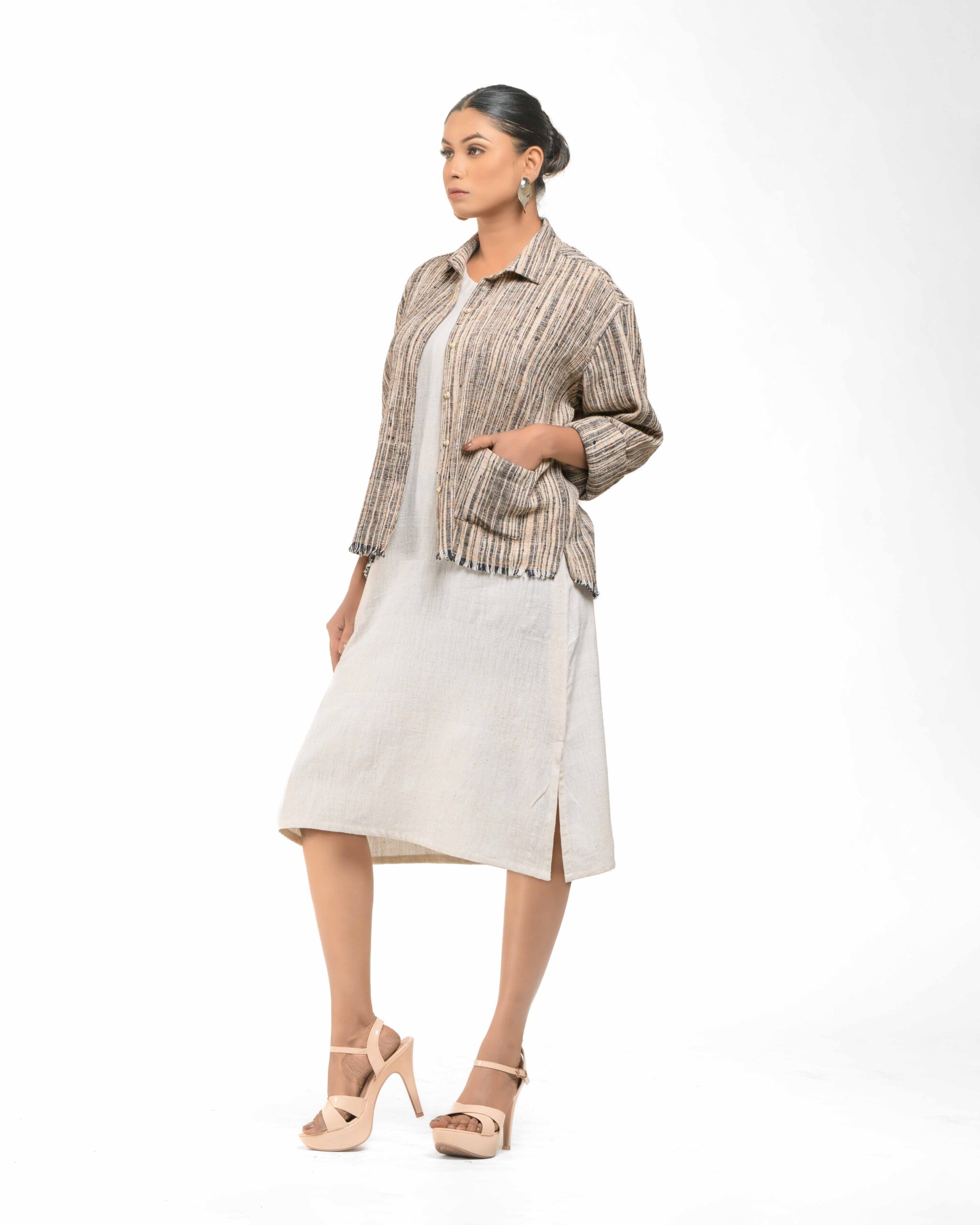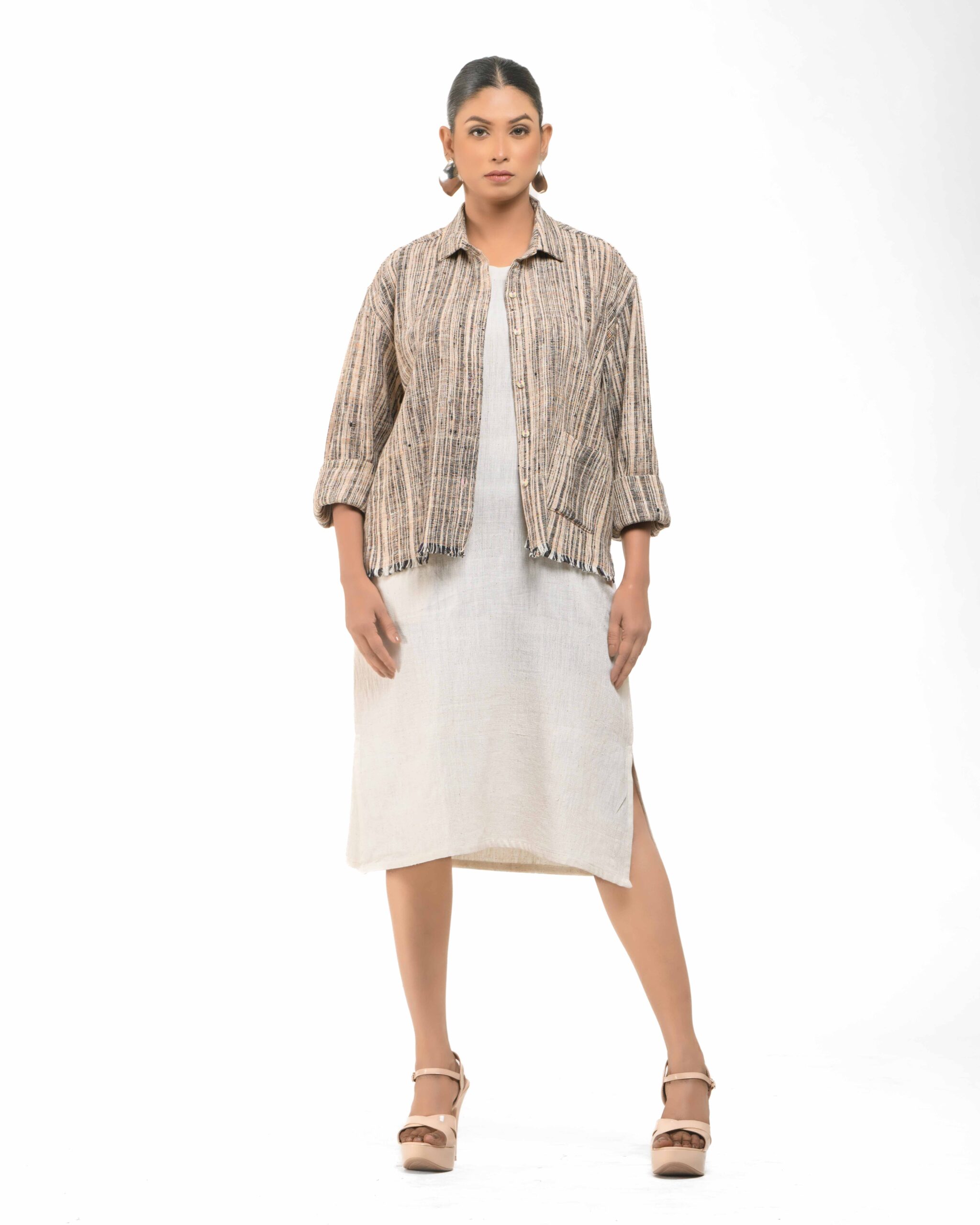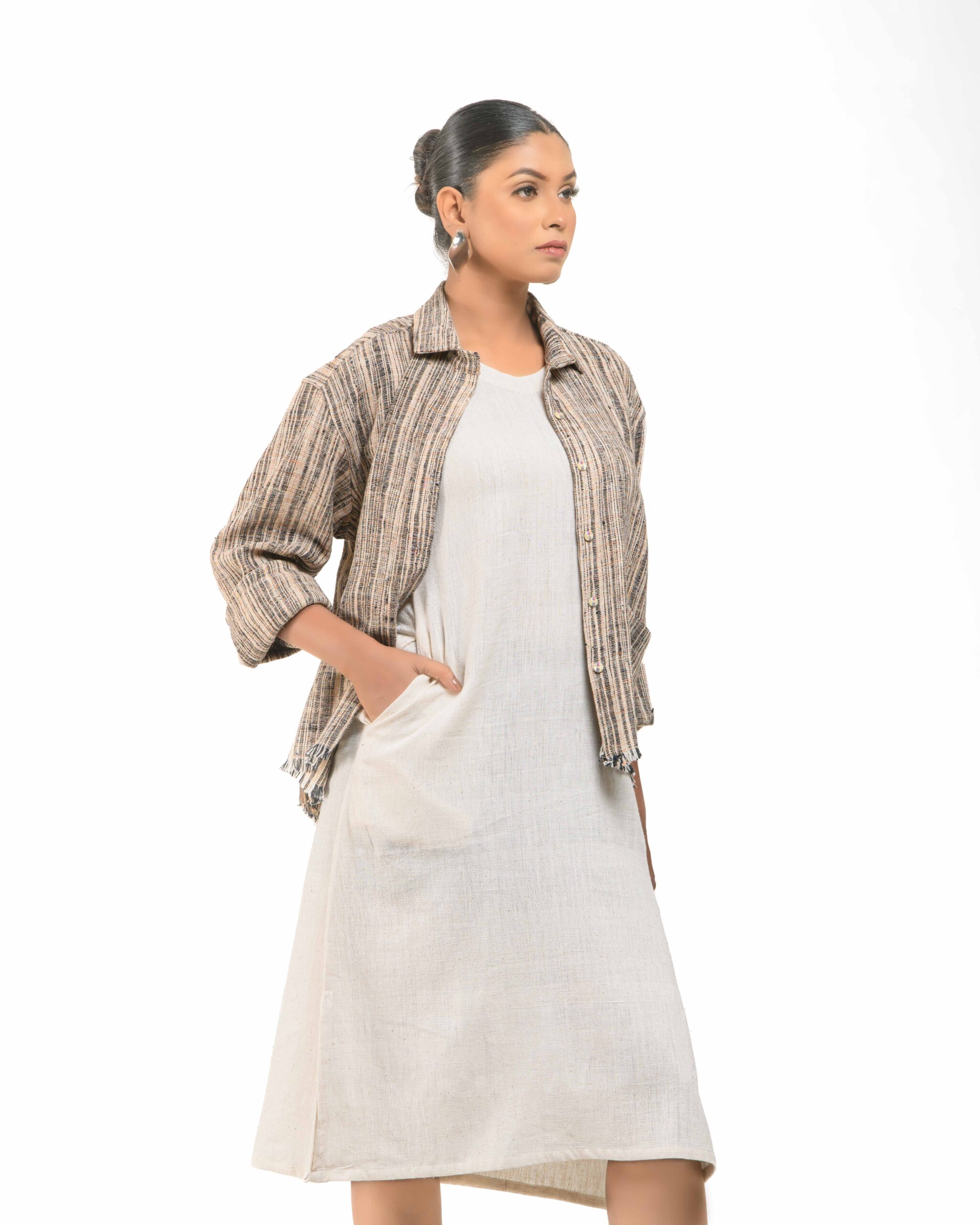 Layered perfection in sustainable luxury: The raw Khaddar free size short shirt (featuring our fringed USP) sets off the soft, undyed Kora Khadi tunic (pre-treated for exceptional softness). This zero-chemical, Indo-Western set embodies award-winning fusion and the artisan’s “humane touch.”