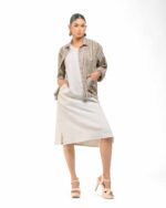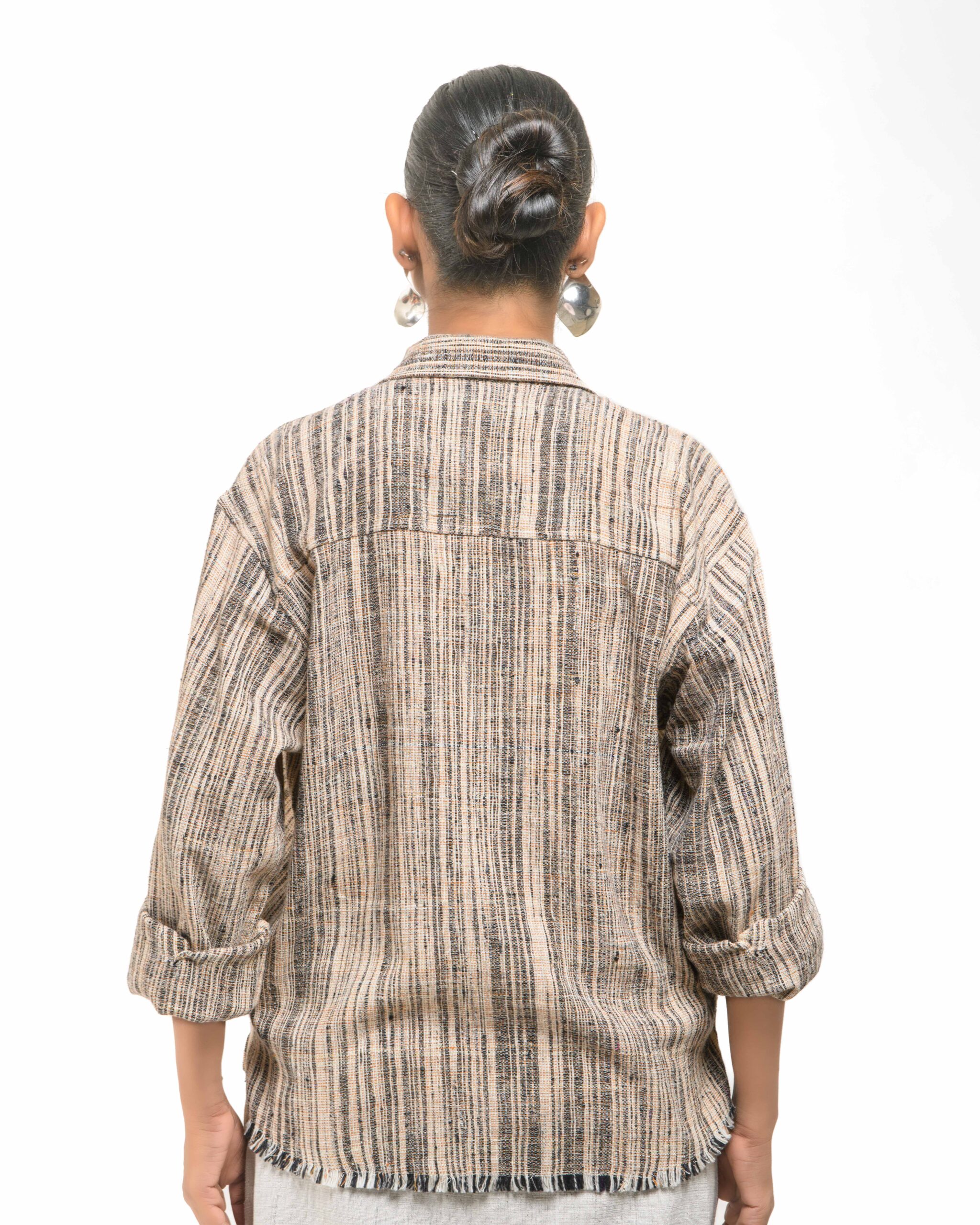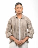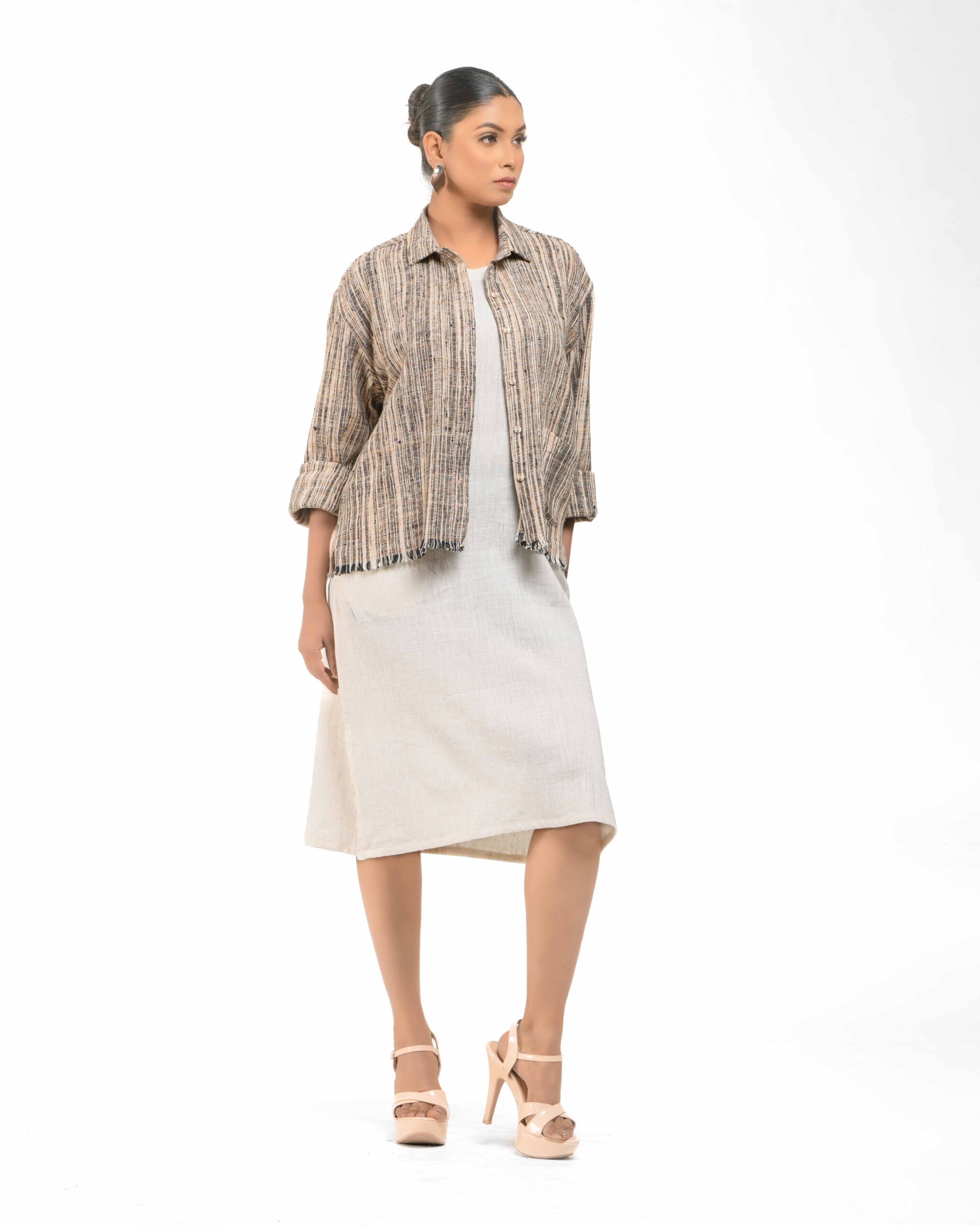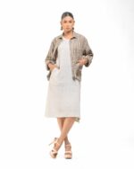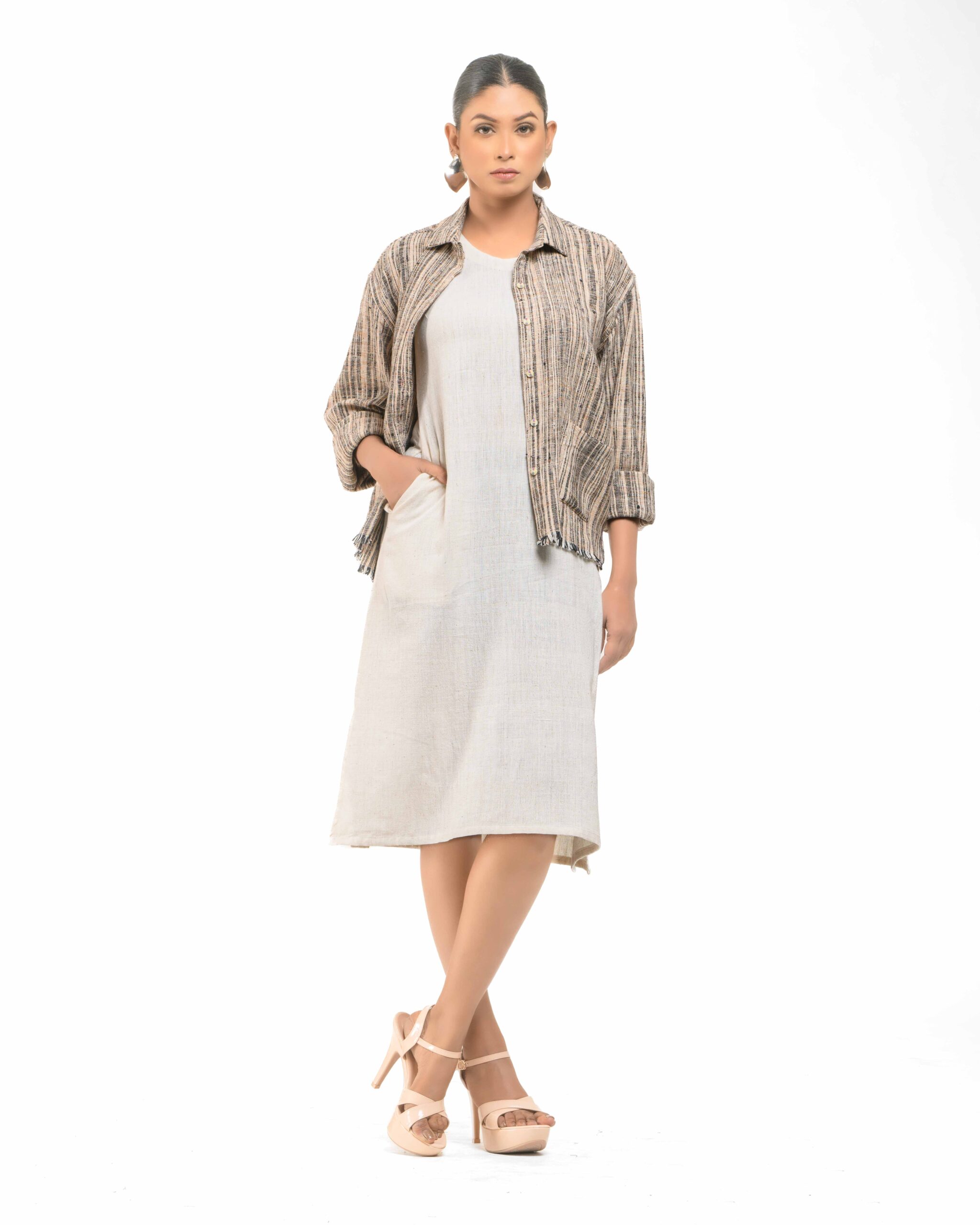 Layered perfection in sustainable luxury: The raw Khaddar free size short shirt (featuring our fringed USP) sets off the soft, undyed Kora Khadi tunic (pre-treated for exceptional softness). This zero-chemical, Indo-Western set embodies award-winning fusion and the artisan’s “humane touch.”