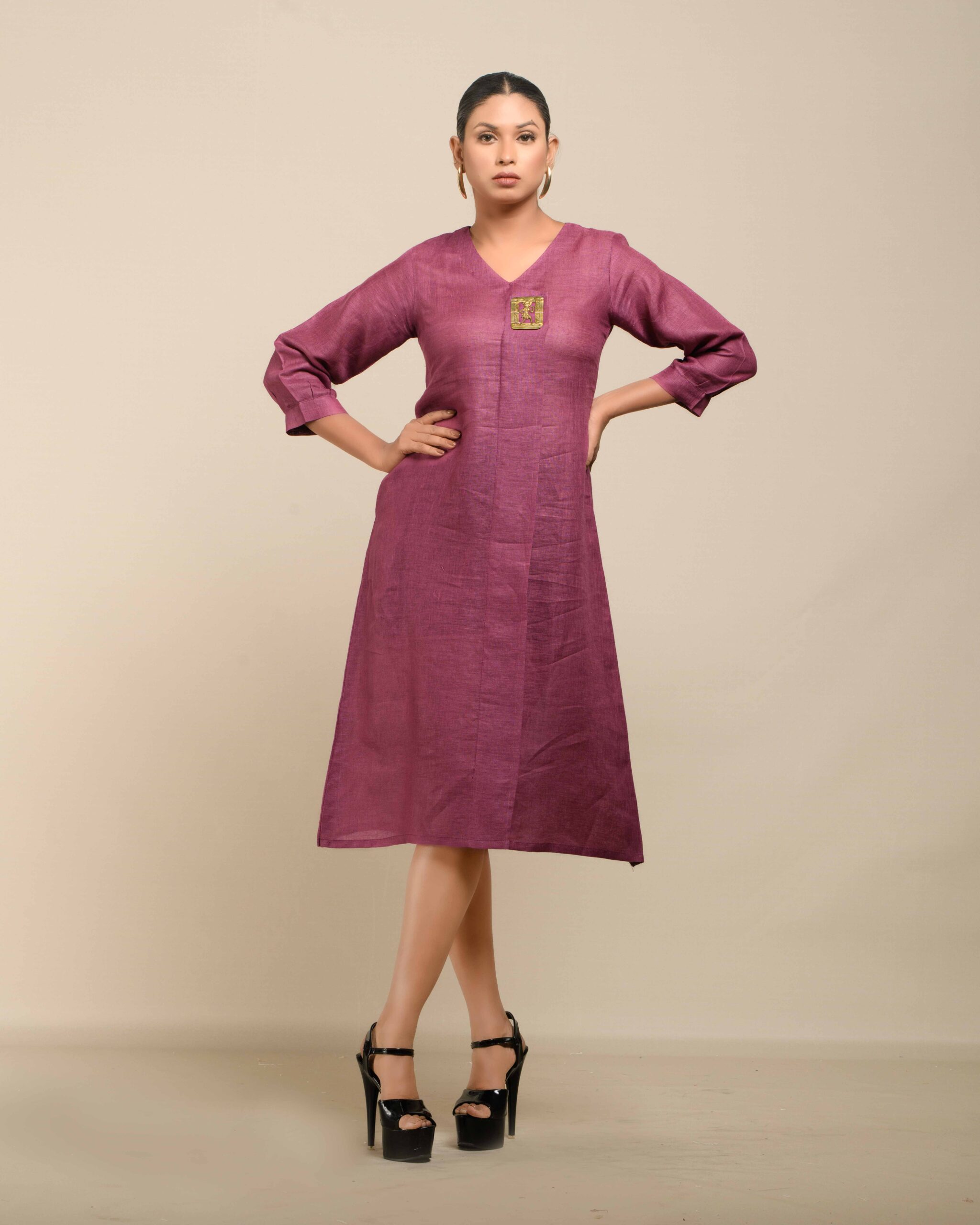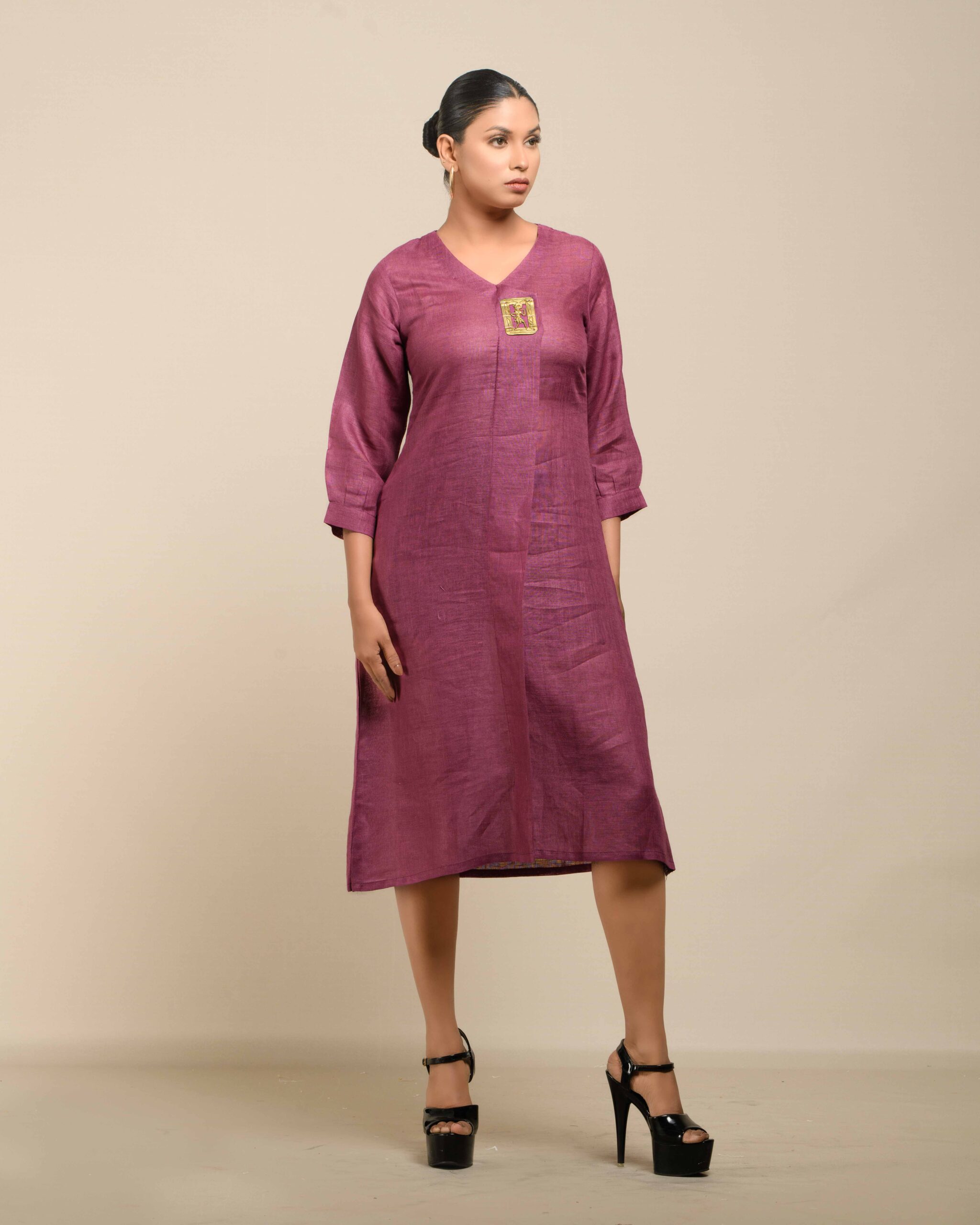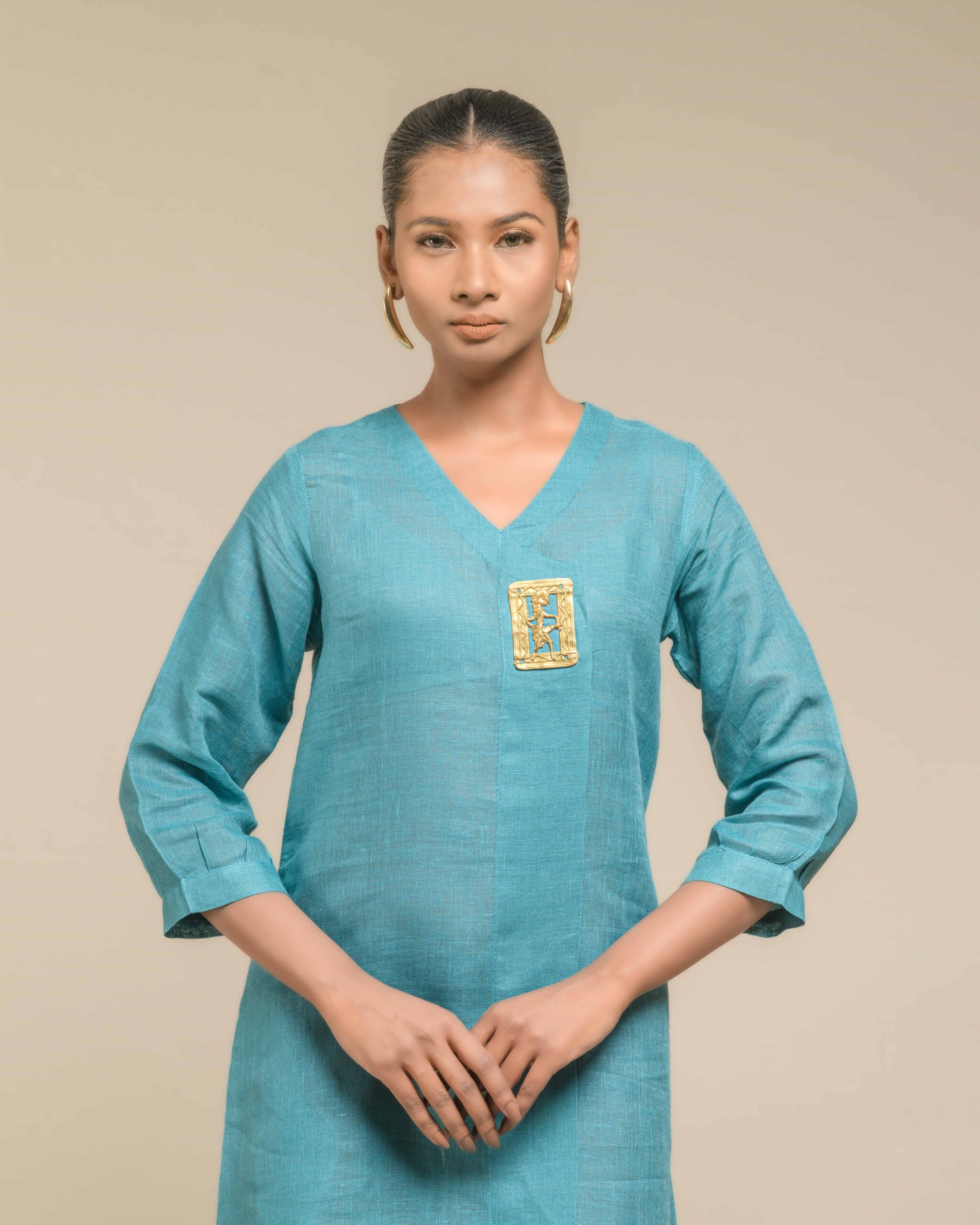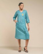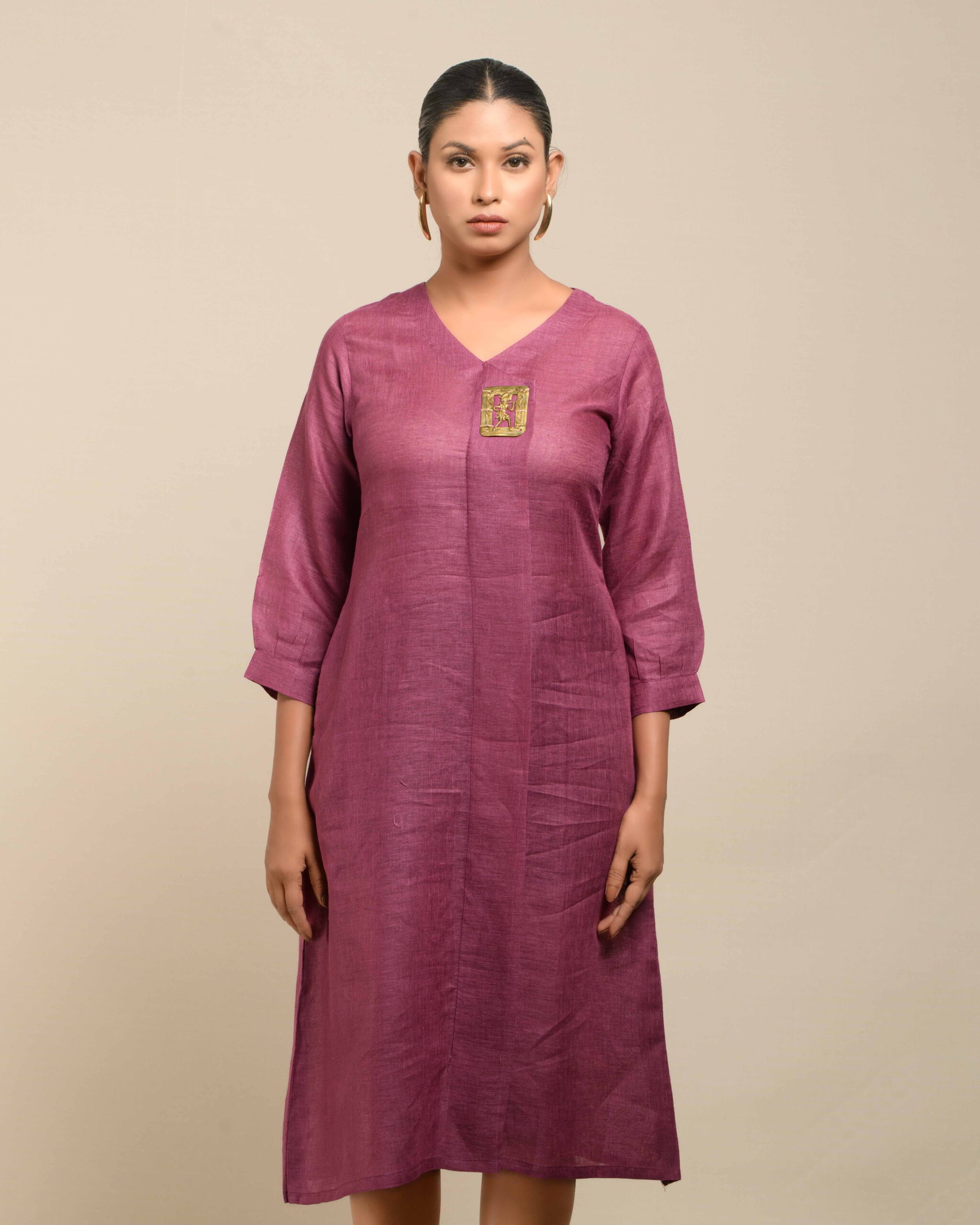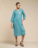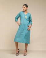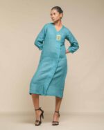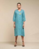 Crafted from breathable, sustainable linen, the Linen Dokra Dress offers effortless elegance. Its clean lines are highlighted by an authentic Dokra metal art piece, a traditional craft from Chhattisgarh. This dress is a conscious celebration of heritage, proving sustainable fashion can beautifully showcase artisan traditions.