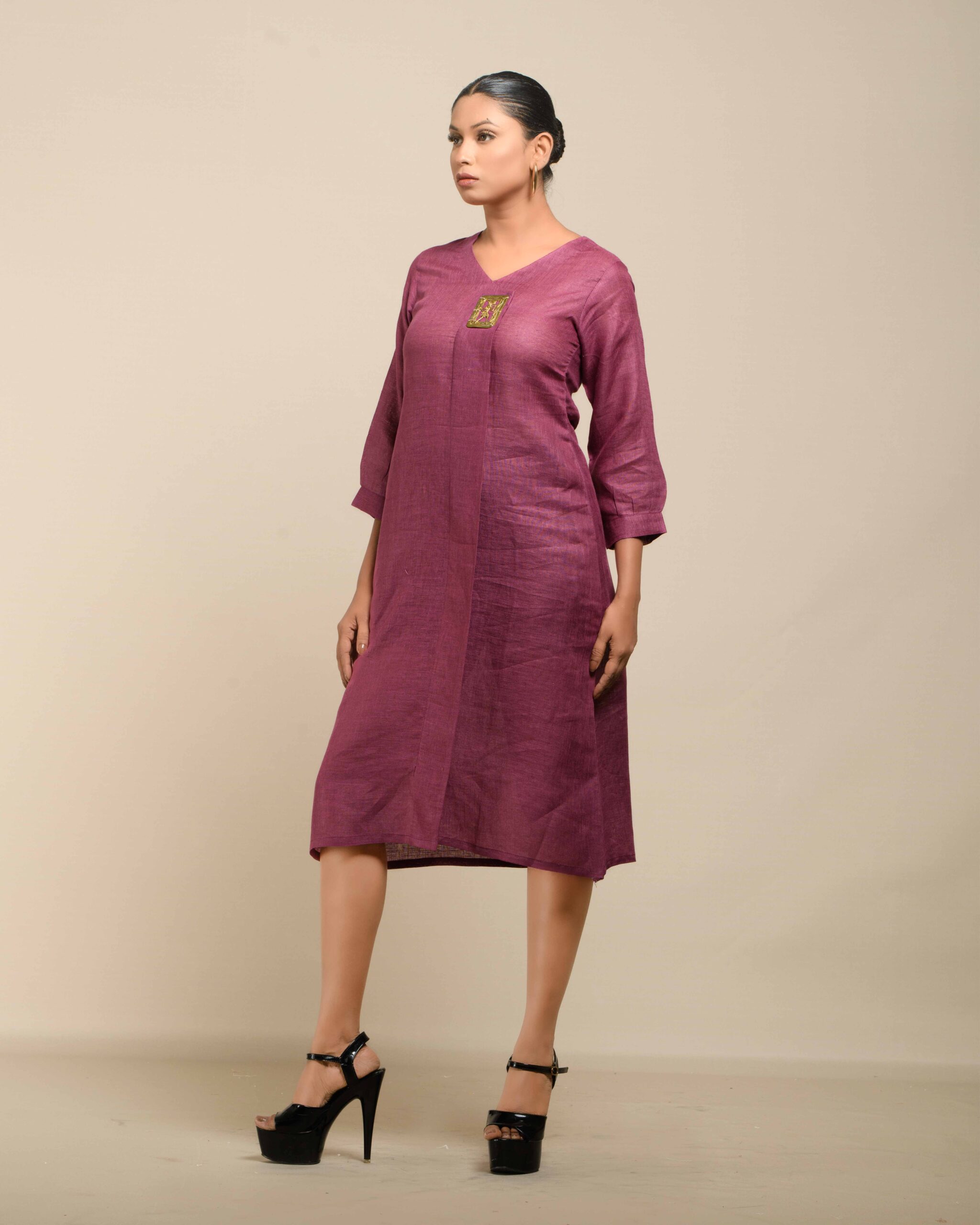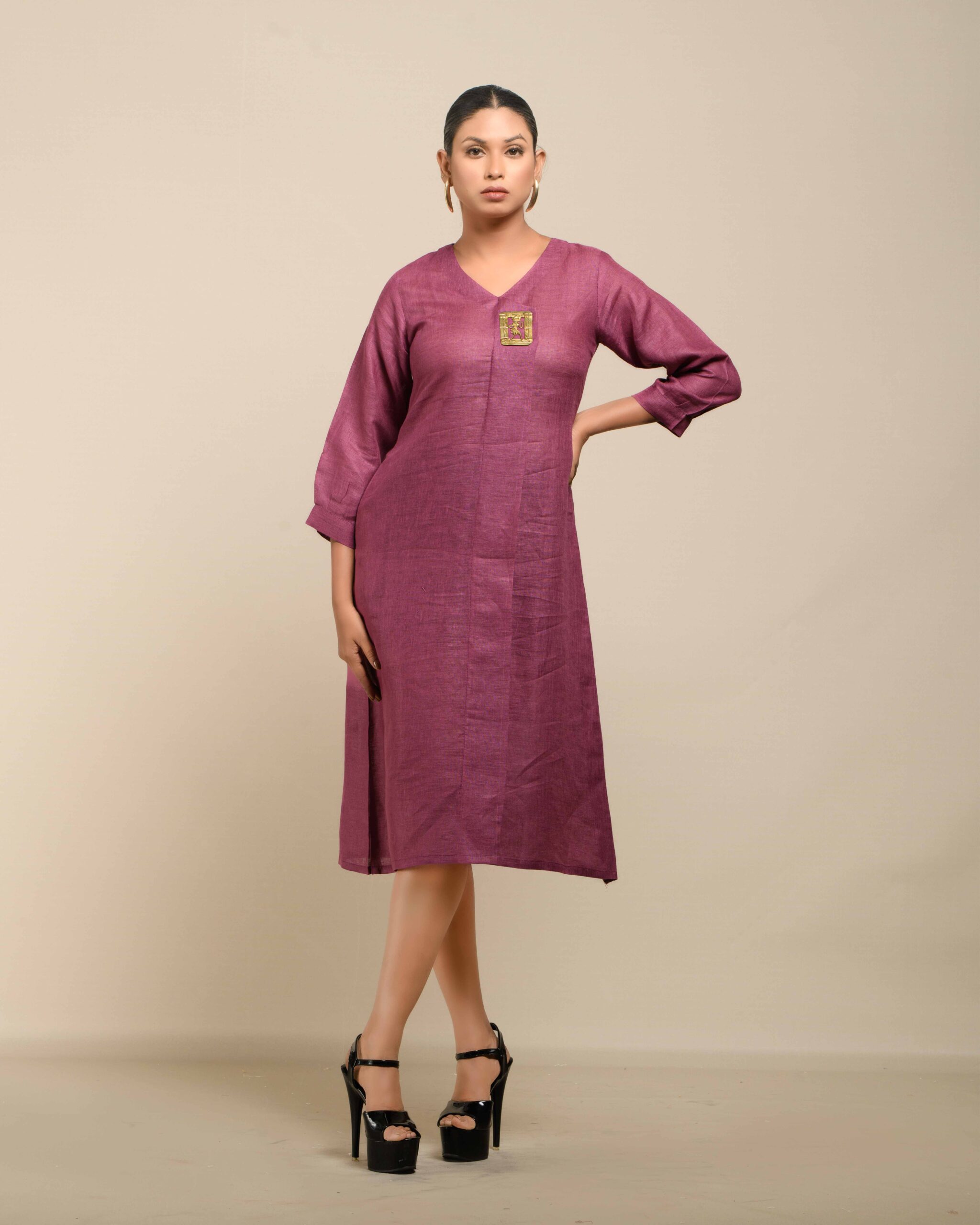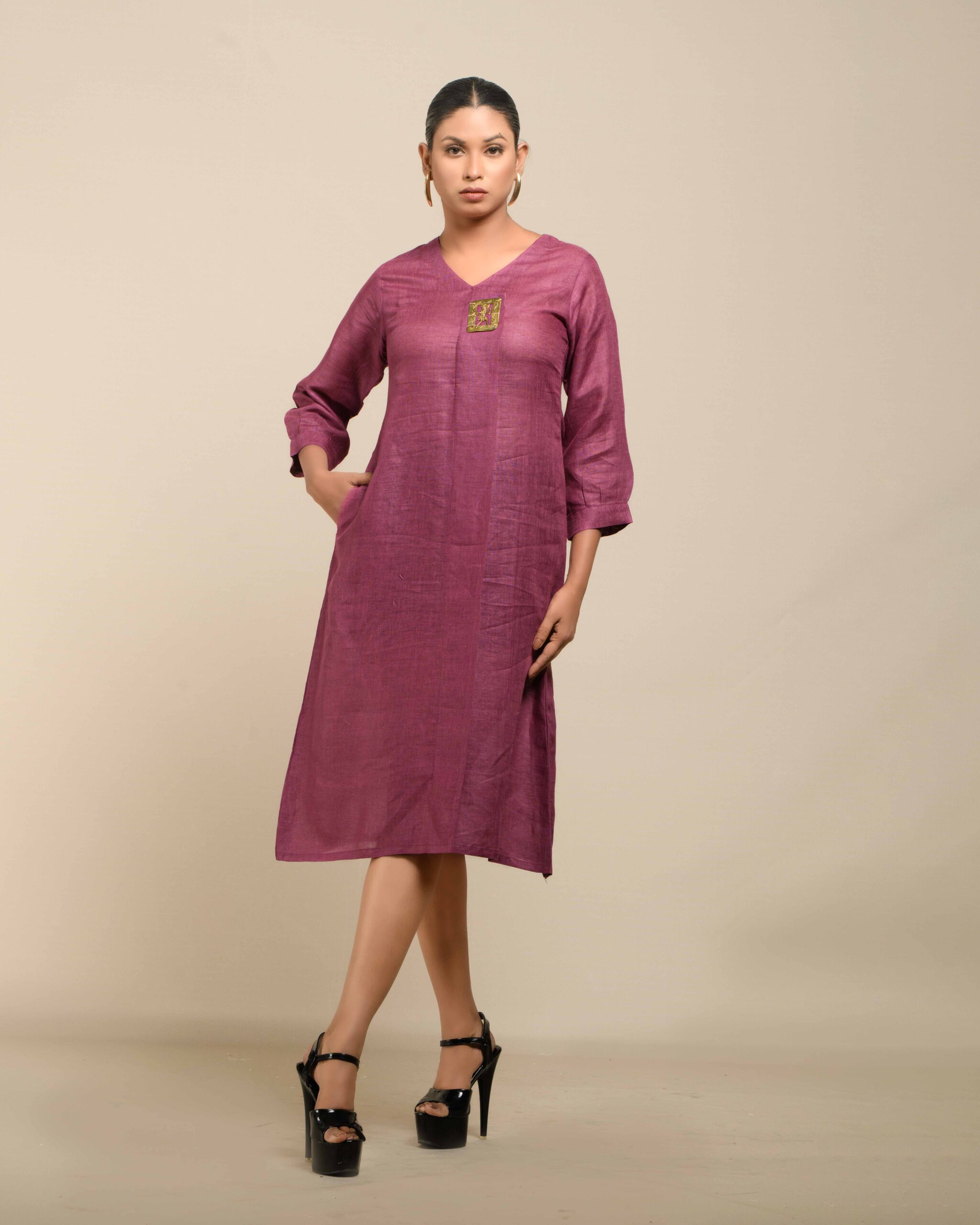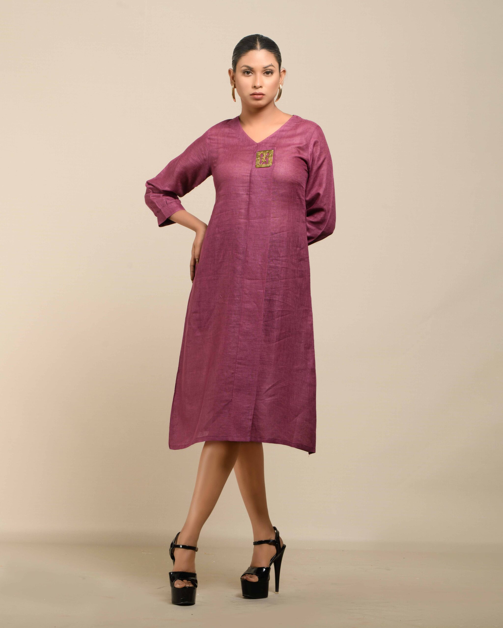 Crafted from breathable, sustainable linen, the Linen Dokra Dress offers effortless elegance. Its clean lines are highlighted by an authentic Dokra metal art piece, a traditional craft from Chhattisgarh. This dress is a conscious celebration of heritage, proving sustainable fashion can beautifully showcase artisan traditions.