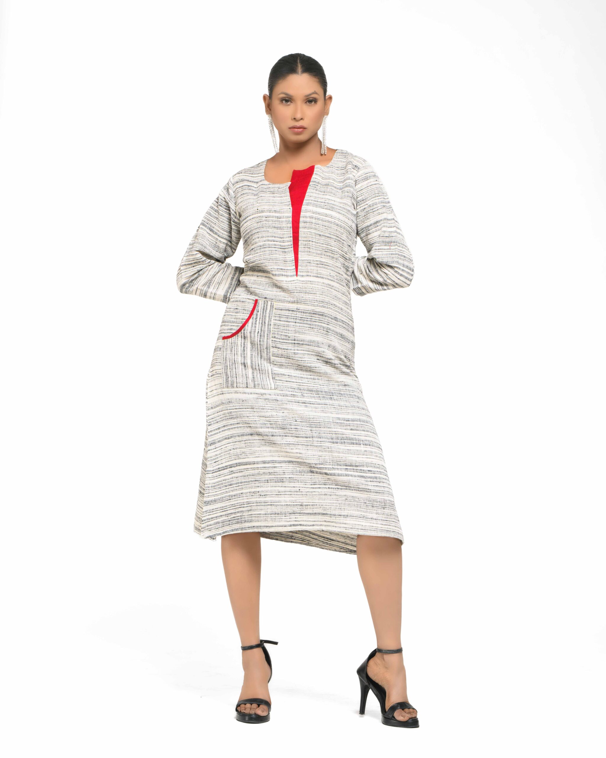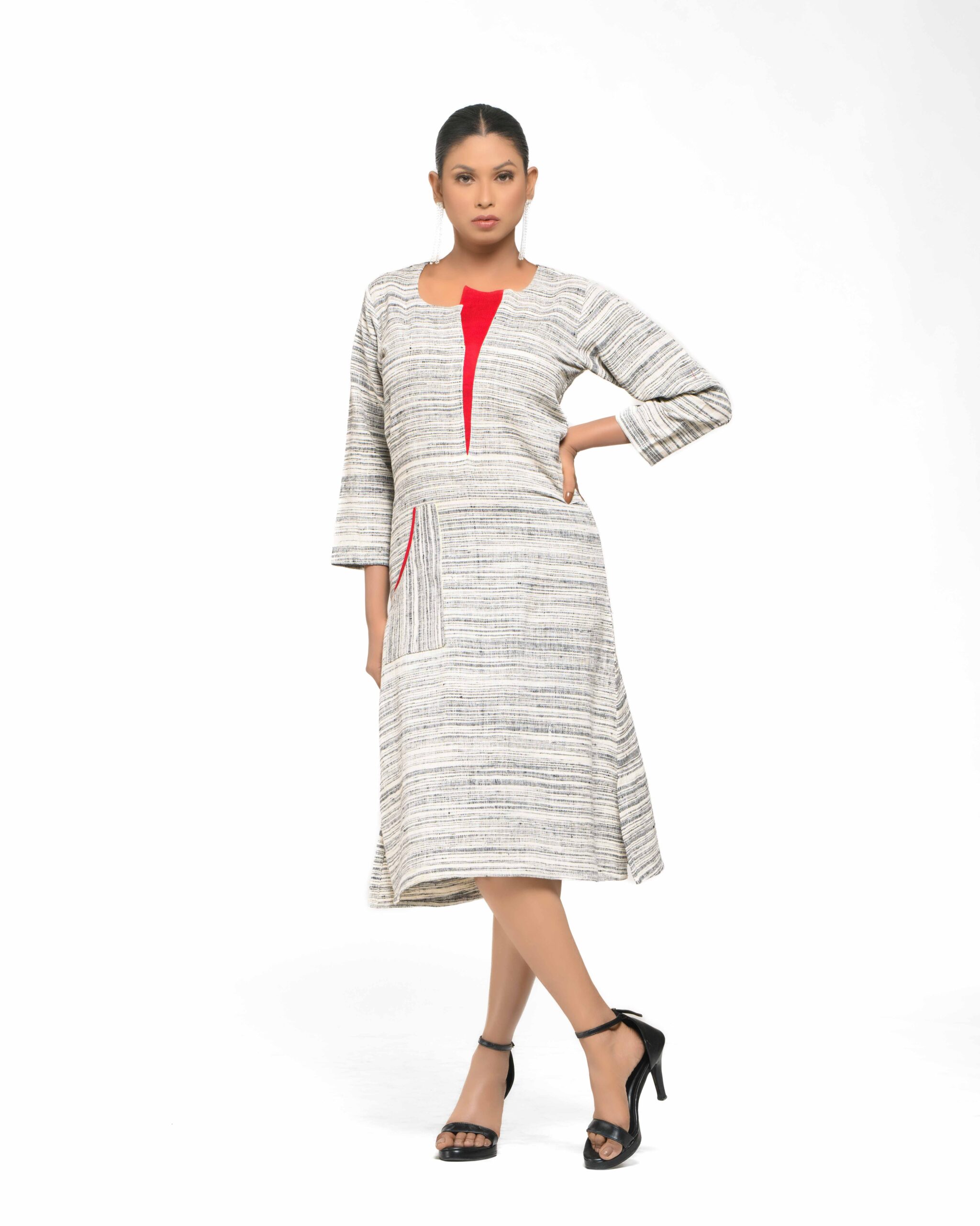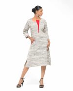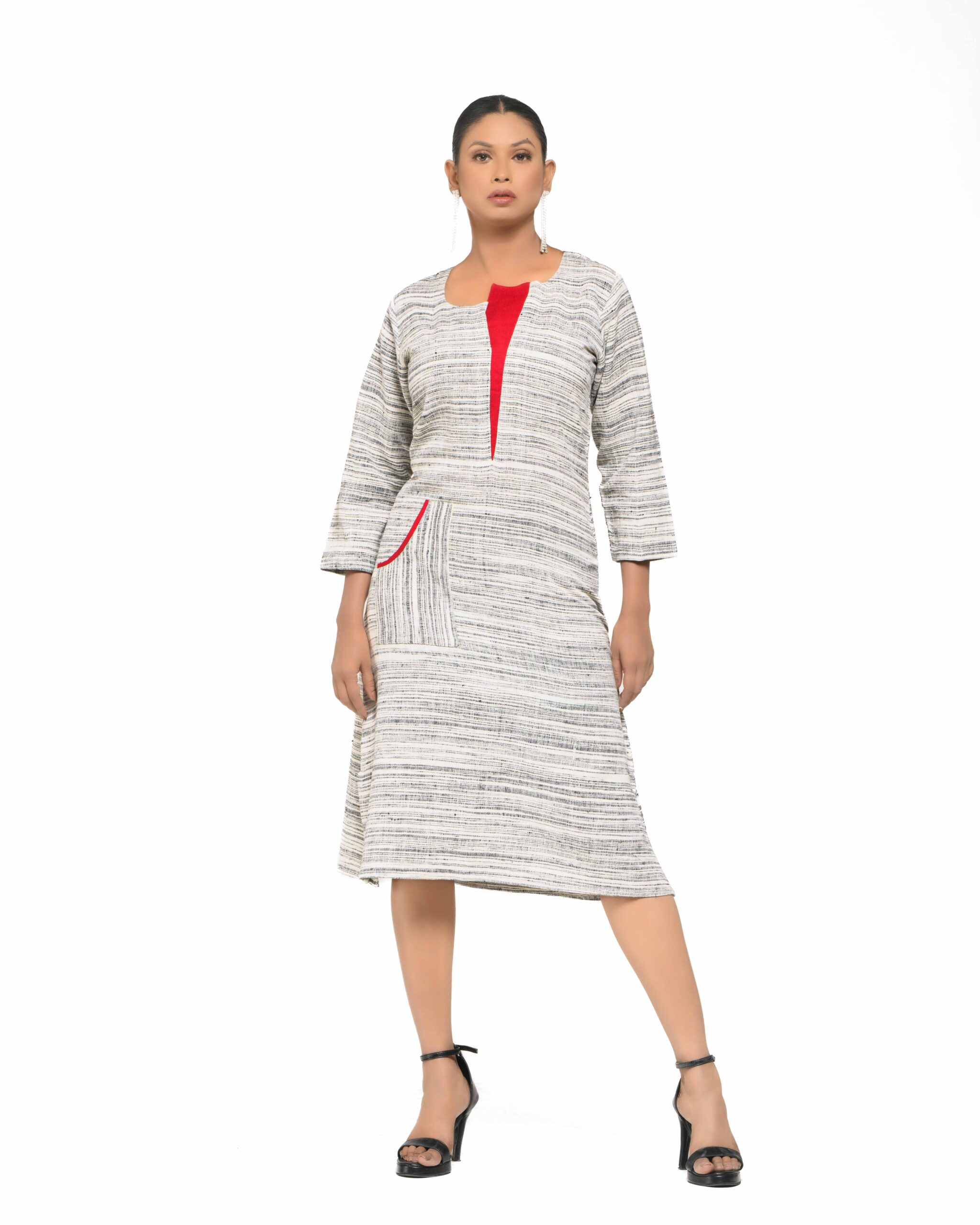 The The Nitya Red Flap Dress is a brand classic, defined by its soft, textured Raw Khaddar and clean, timeless silhouette. Its minimal base is given a modern, subtle edge by the unique red fabric patch at the neckline and coordinating pocket accent, proving that conscious classics can be elegantly dramatic.