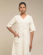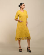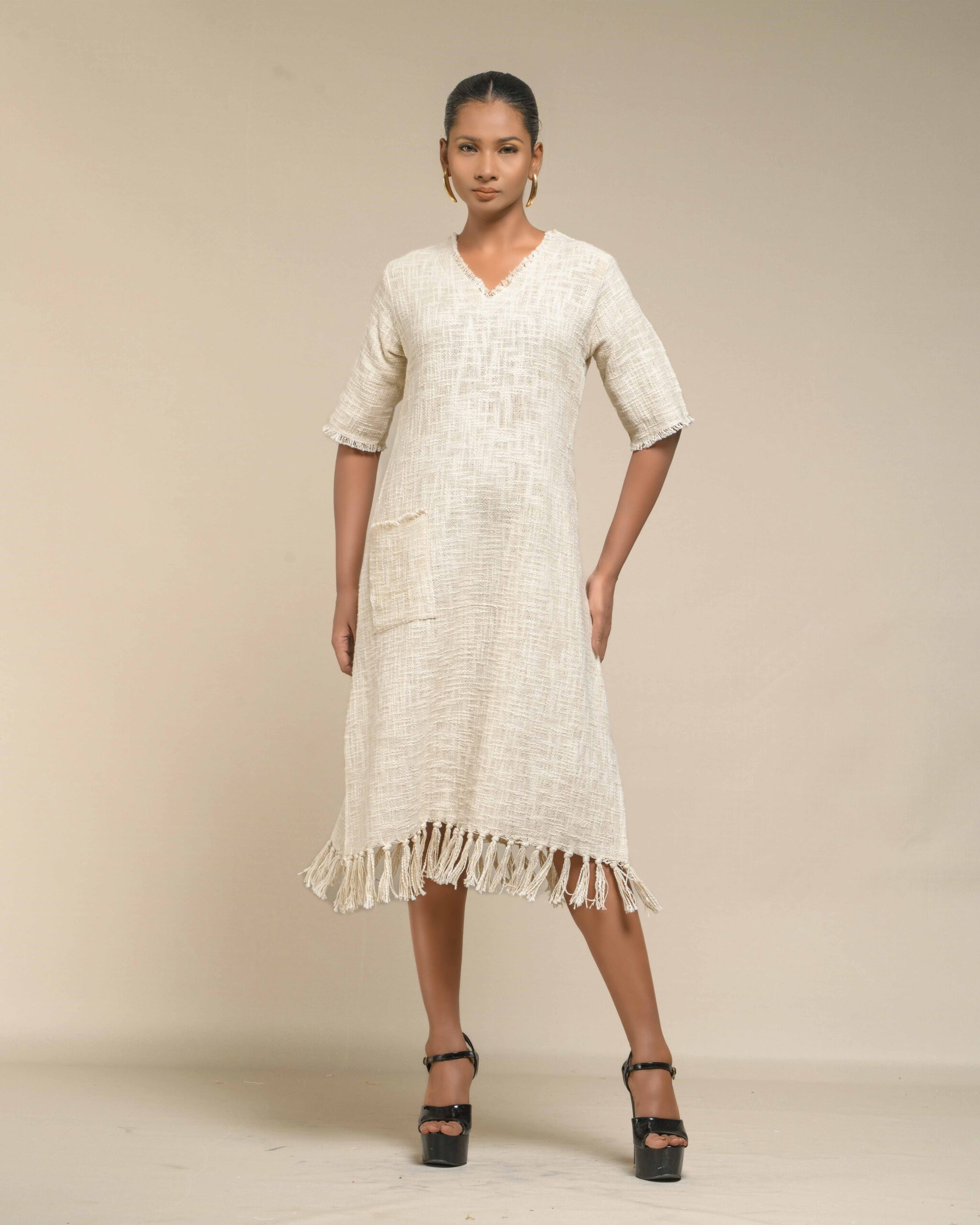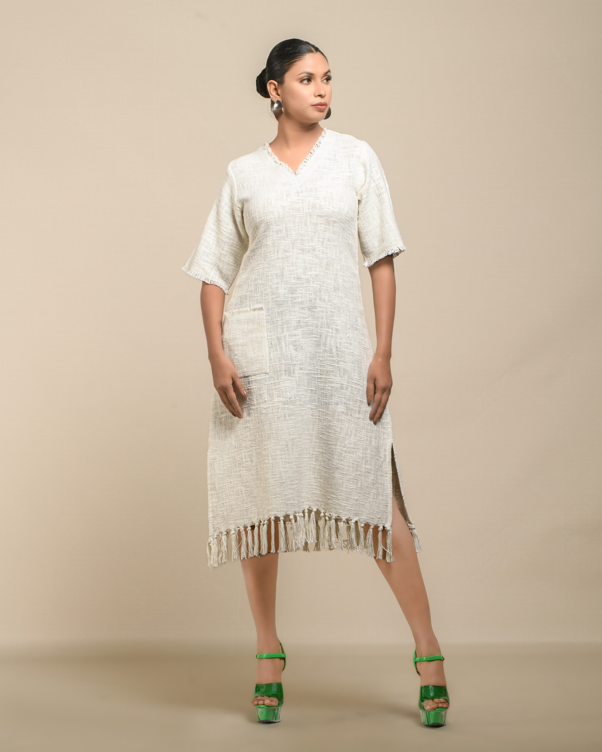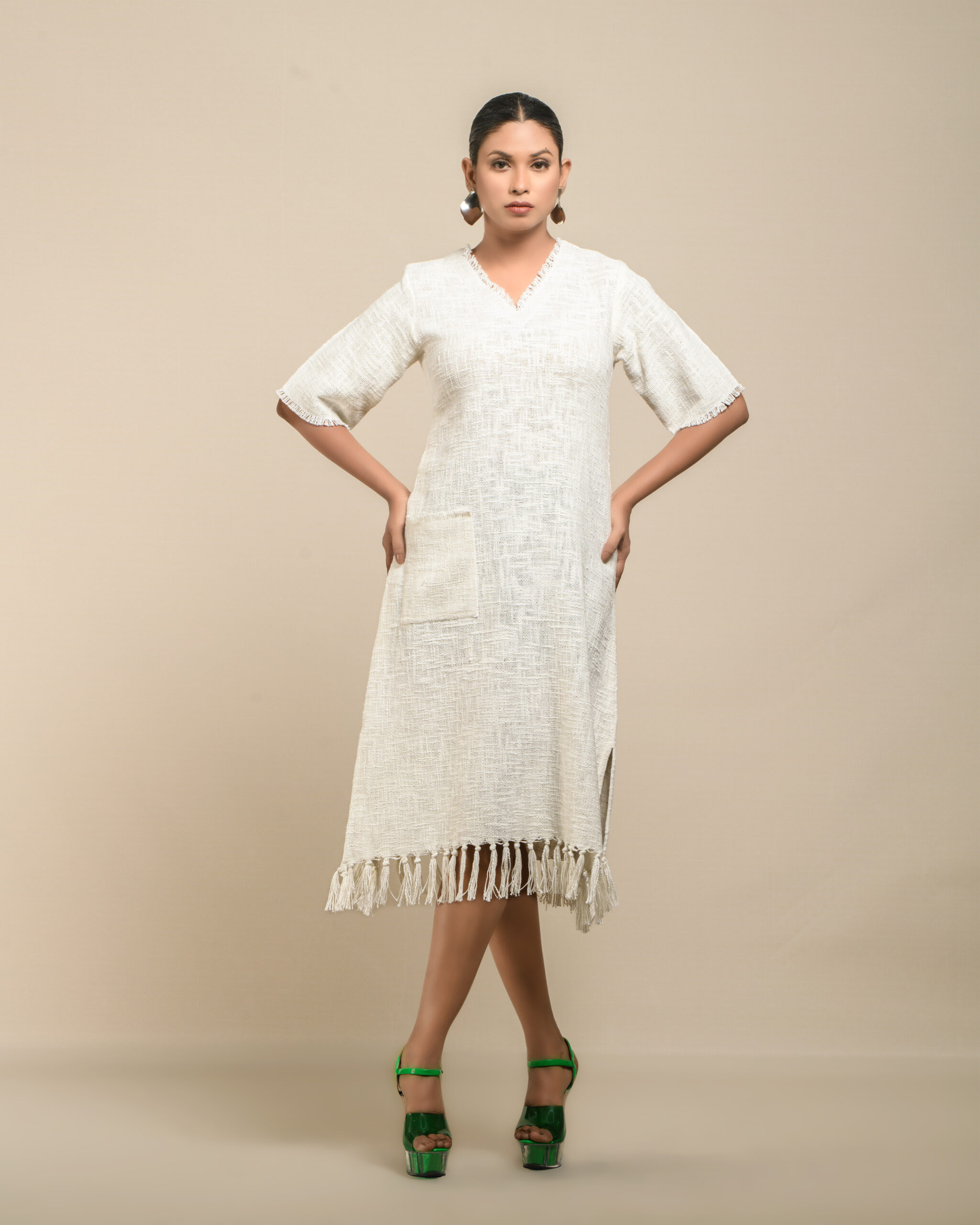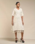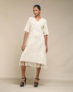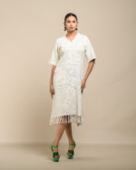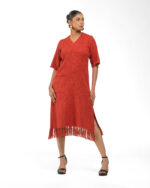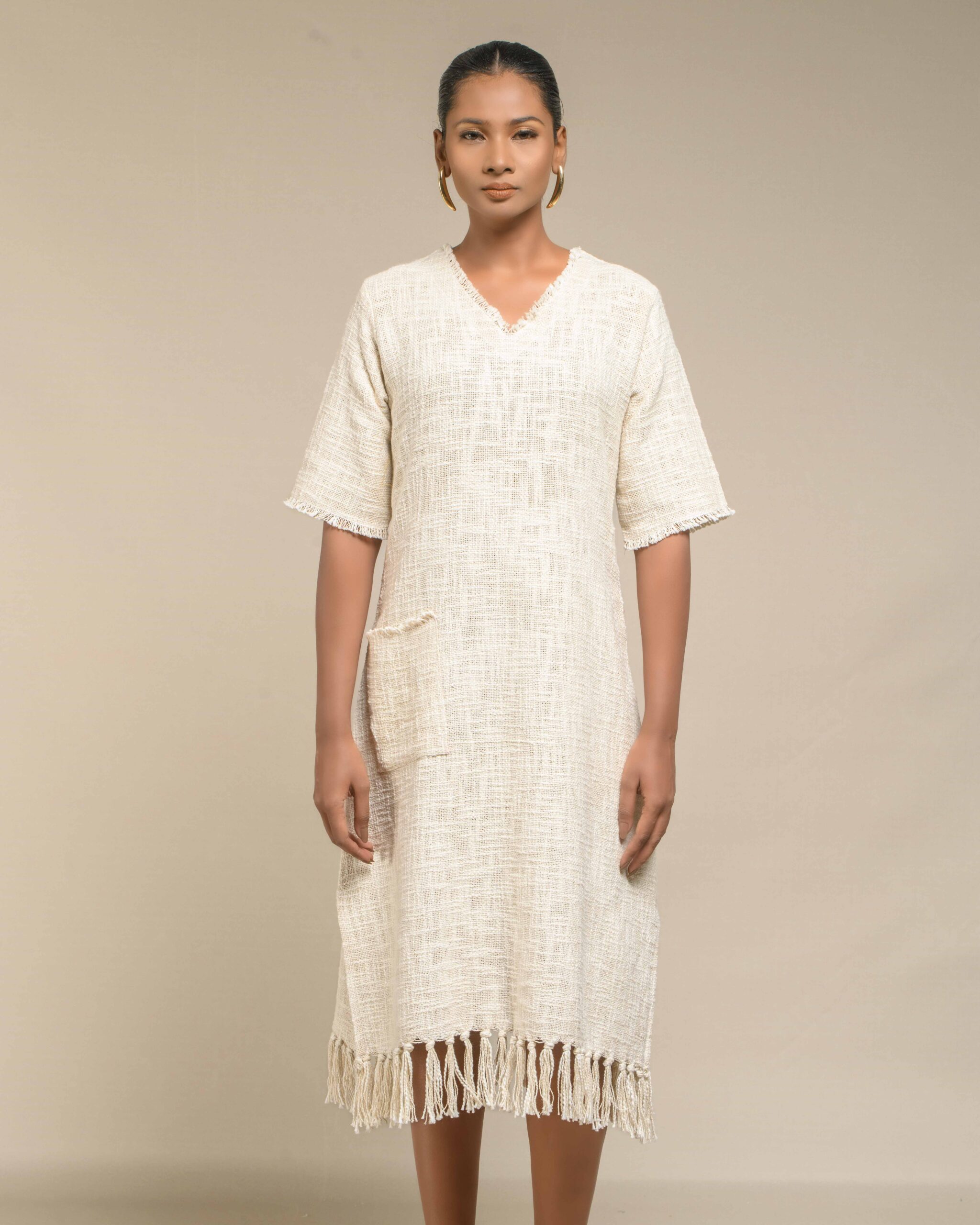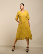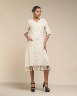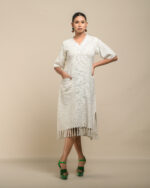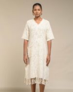Textured depth meets versatile wear: This premium slub Khadi dress features a stunning texture created by its thick yarn and slightly loose weave, making it comfortable and airy for summers. The modern silhouette is adorned with unique fringes at the neck and sleeves, and finished with delicate tassels at the hem. It’s an expression of Indo-Western fusion woven with ease & comfort that elevates everyday style with its simple, tactile elegance.