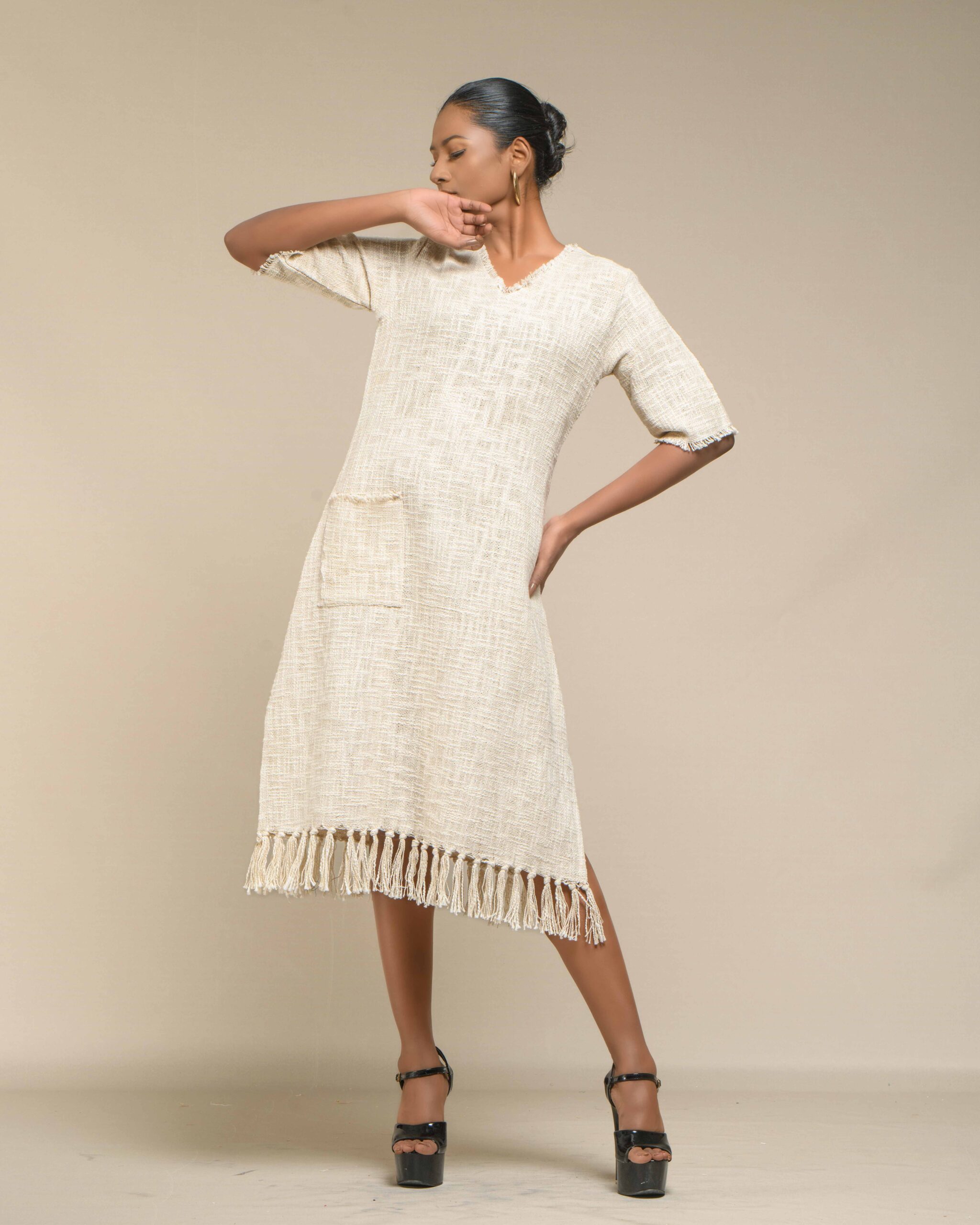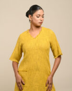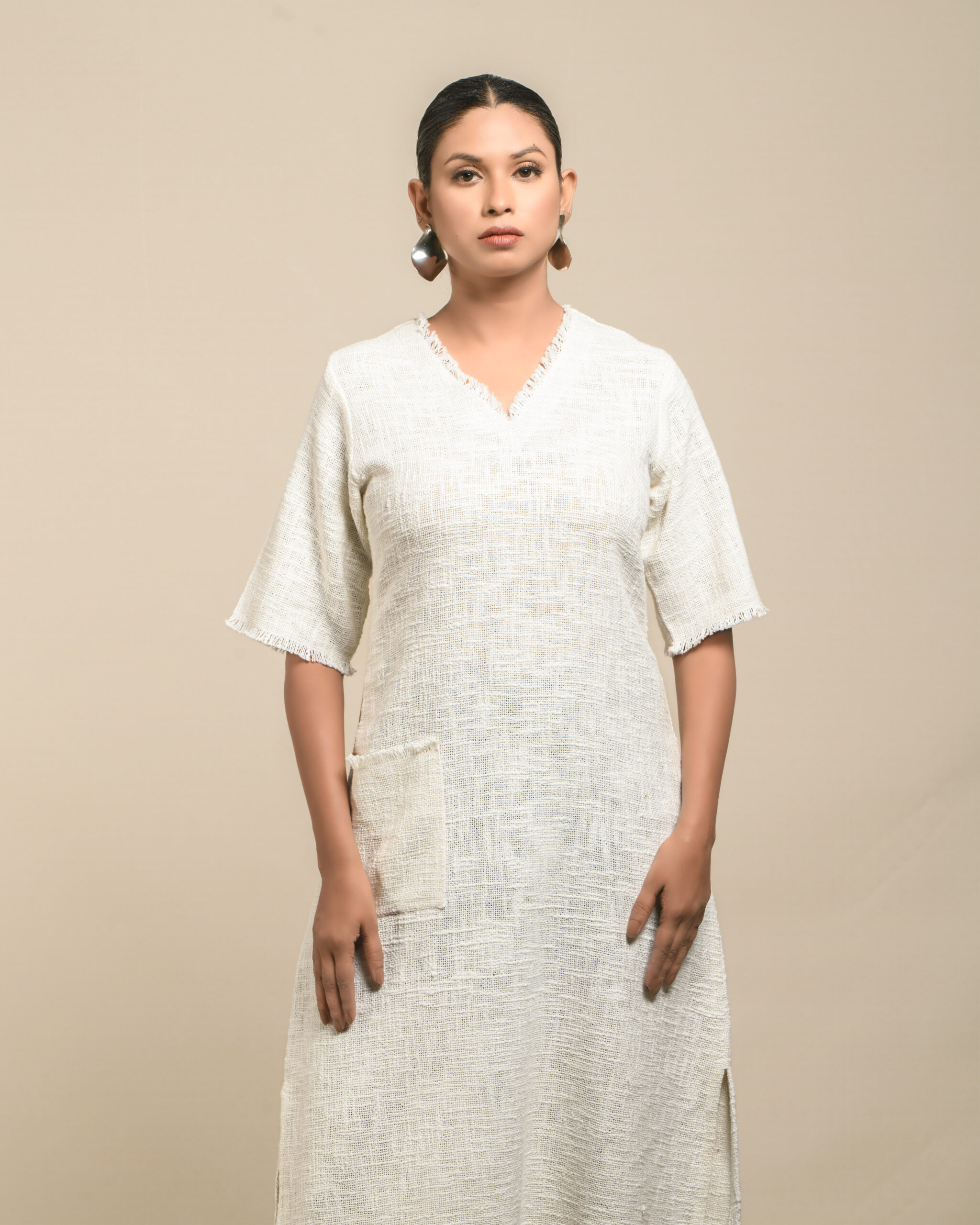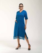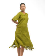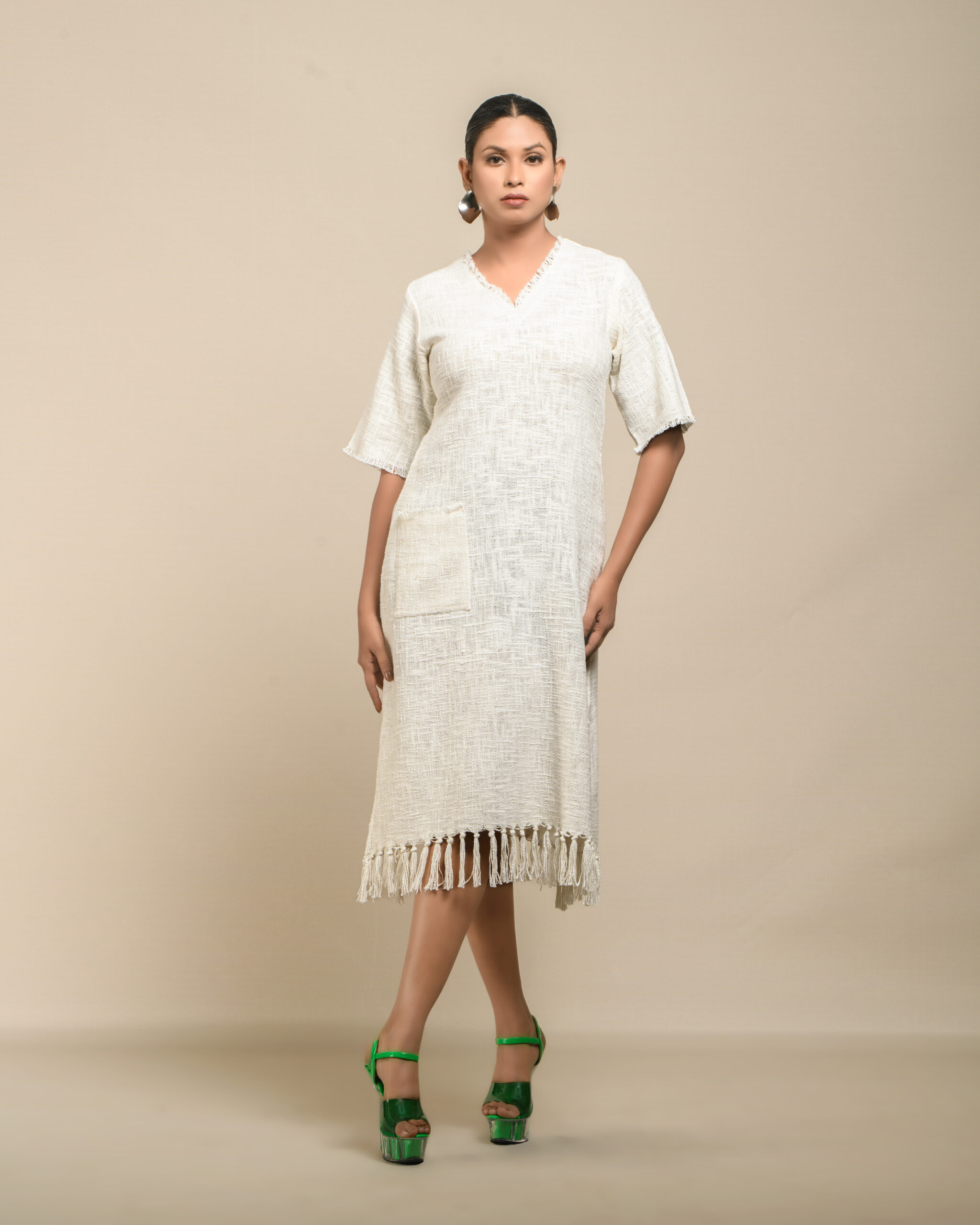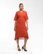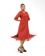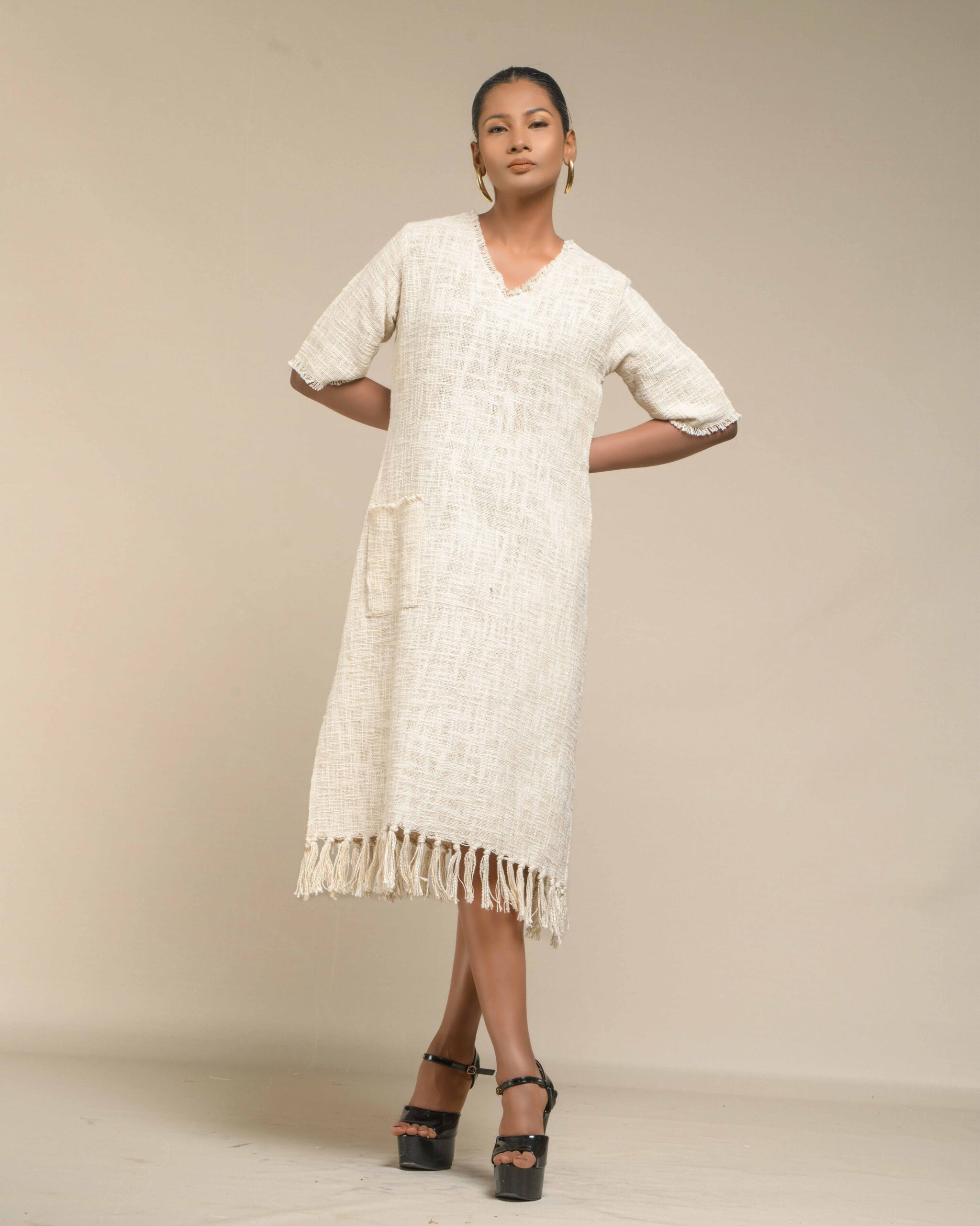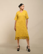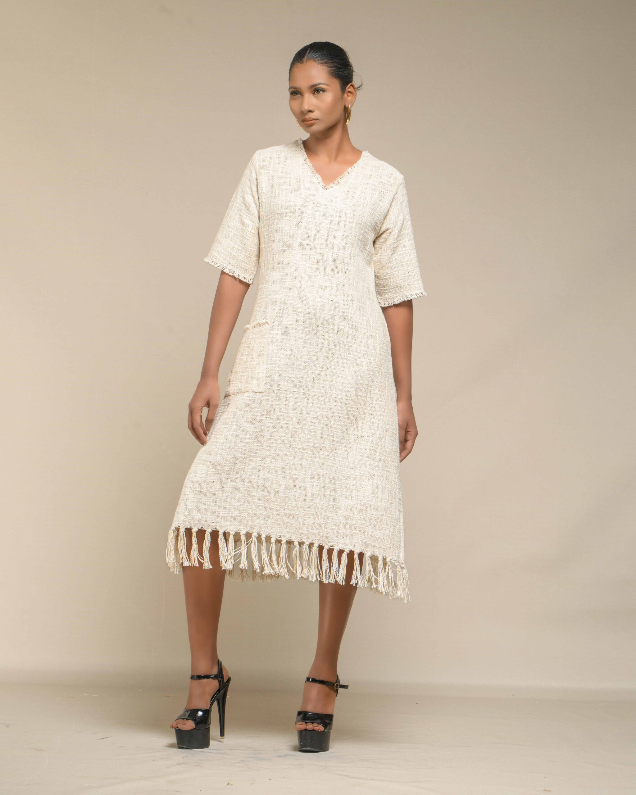 Textured depth meets versatile wear: This premium slub Khadi dress features a stunning texture created by its thick yarn and slightly loose weave, making it comfortable and airy for summers. The modern silhouette is adorned with unique fringes at the neck and sleeves, and finished with delicate tassels at the hem. It’s an expression of Indo-Western fusion woven with ease & comfort that elevates everyday style with its simple, tactile elegance.