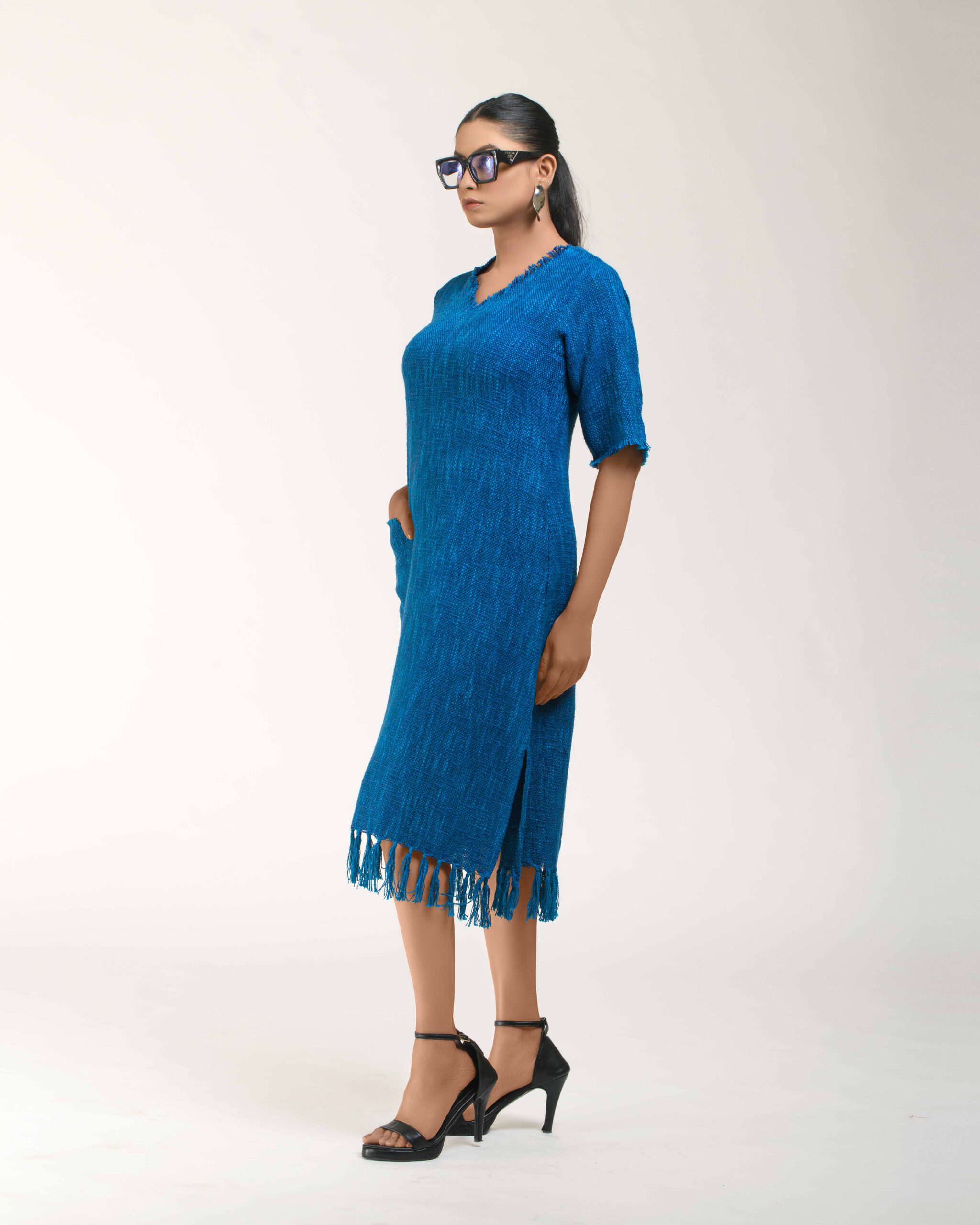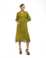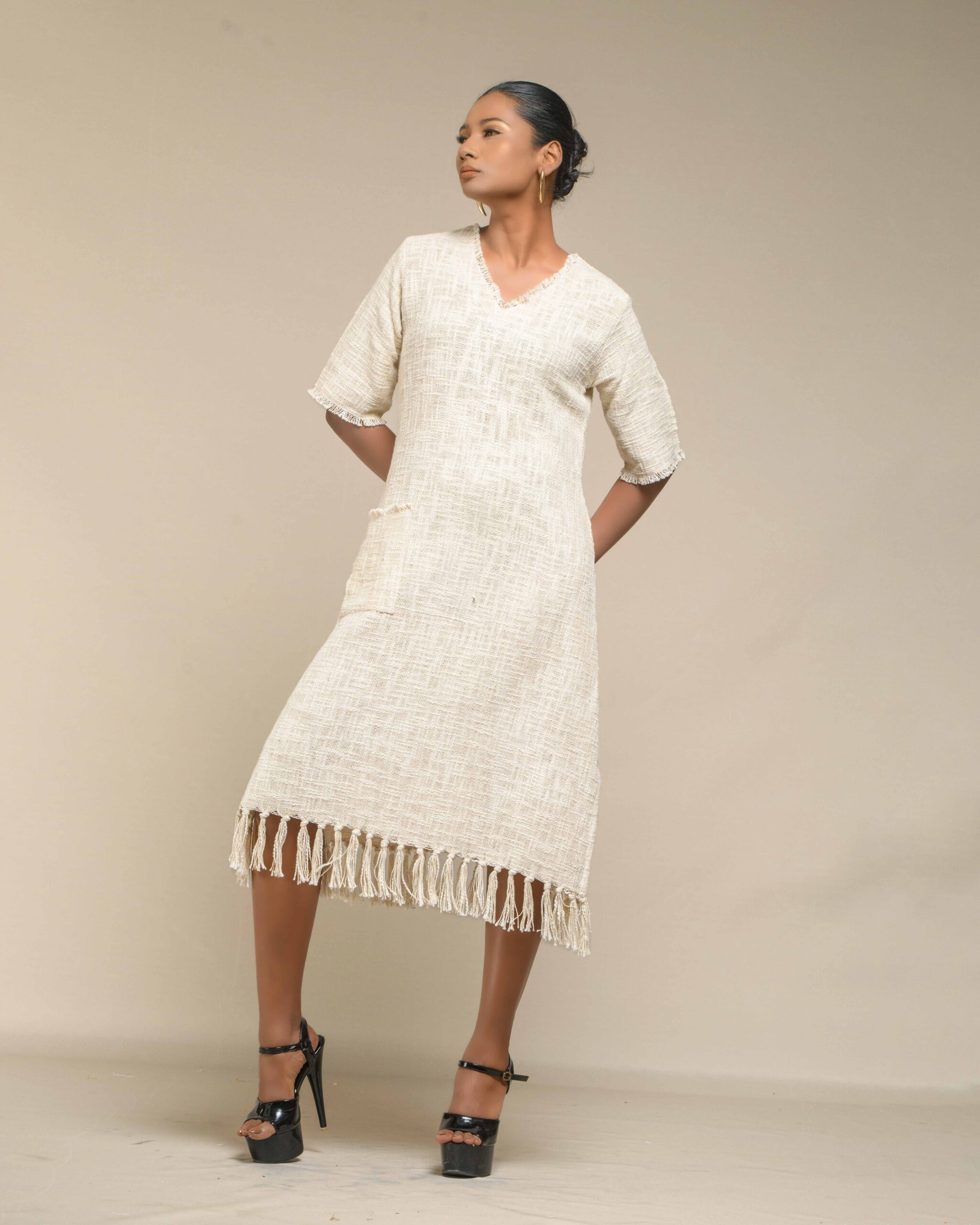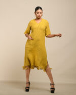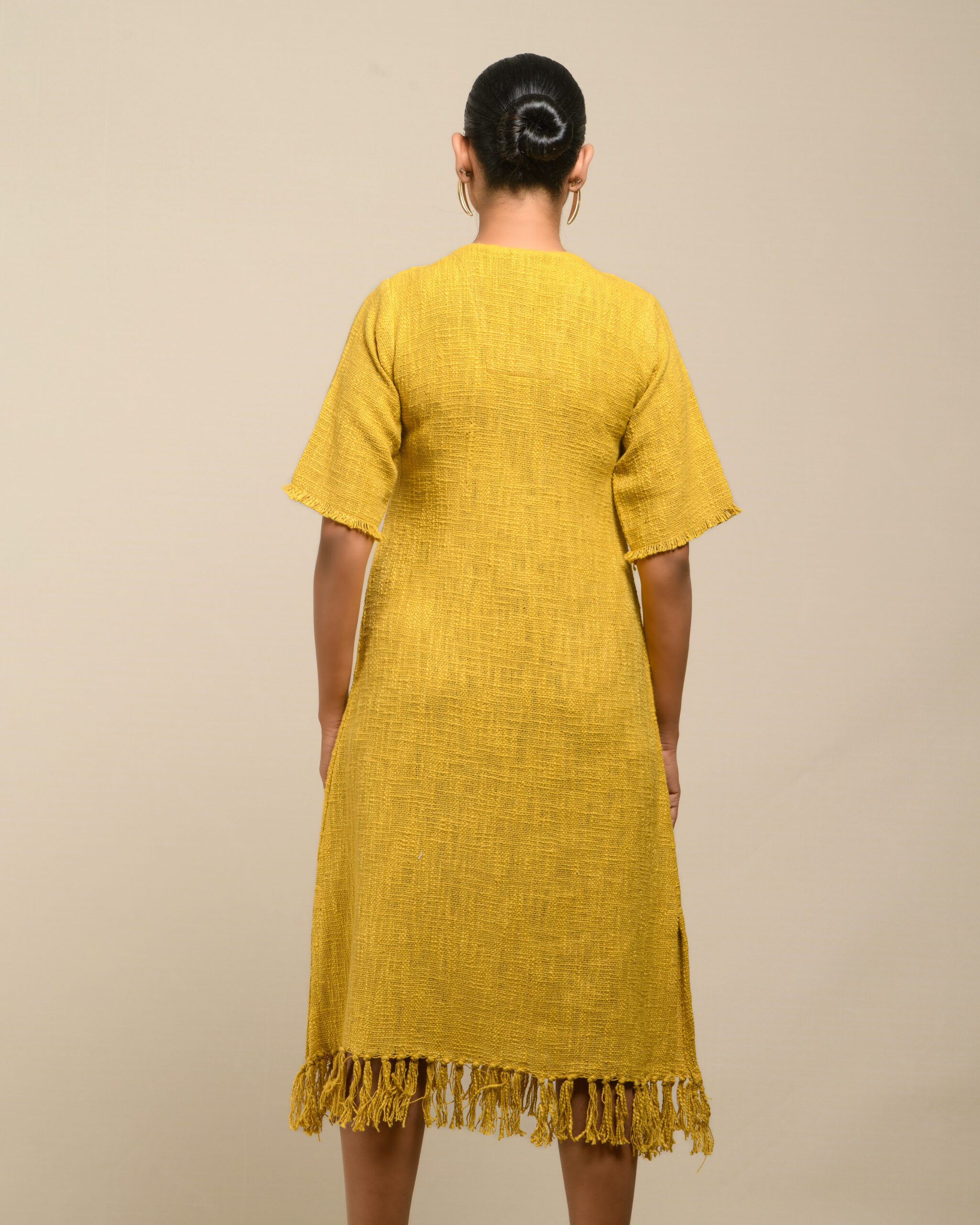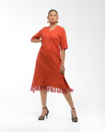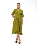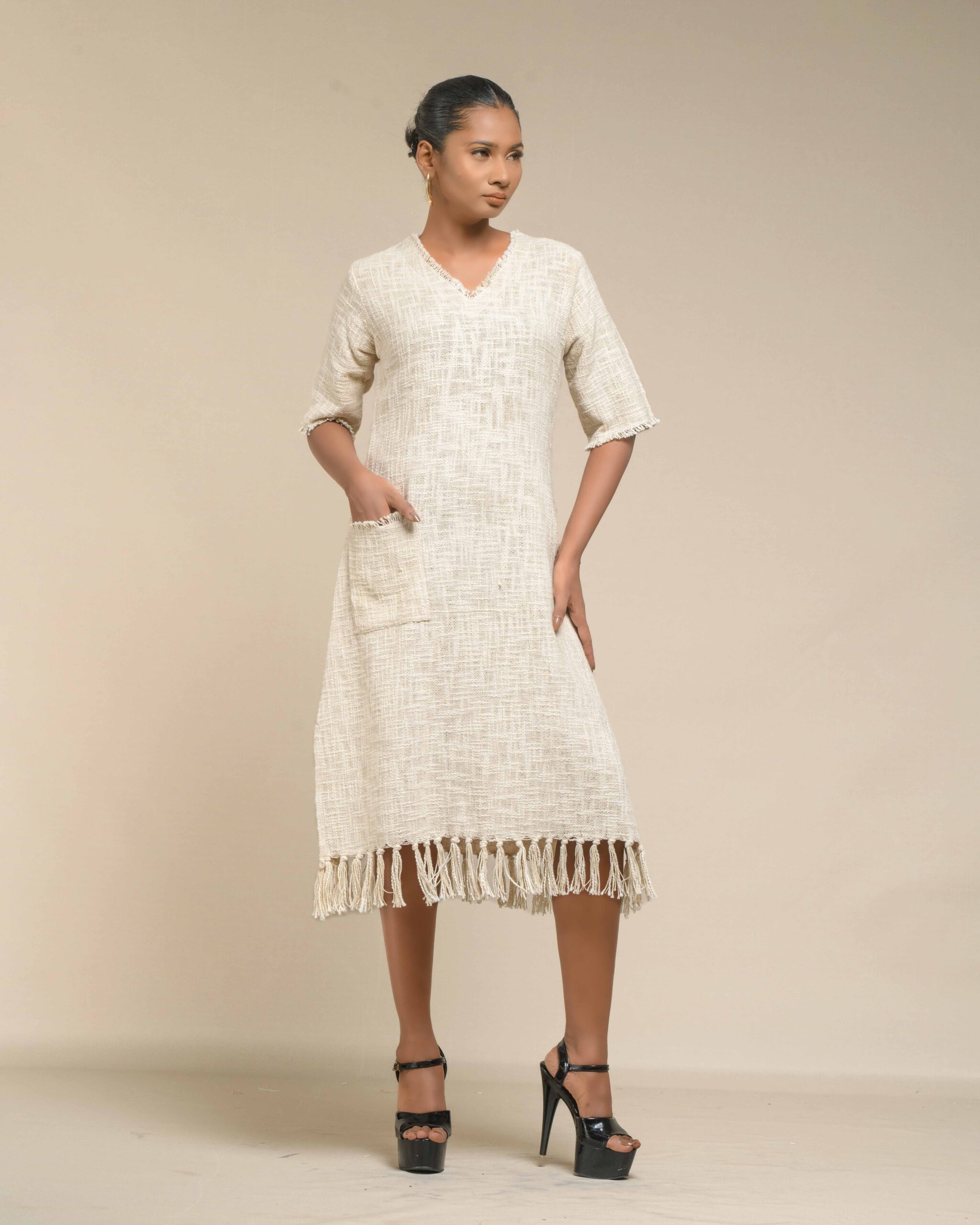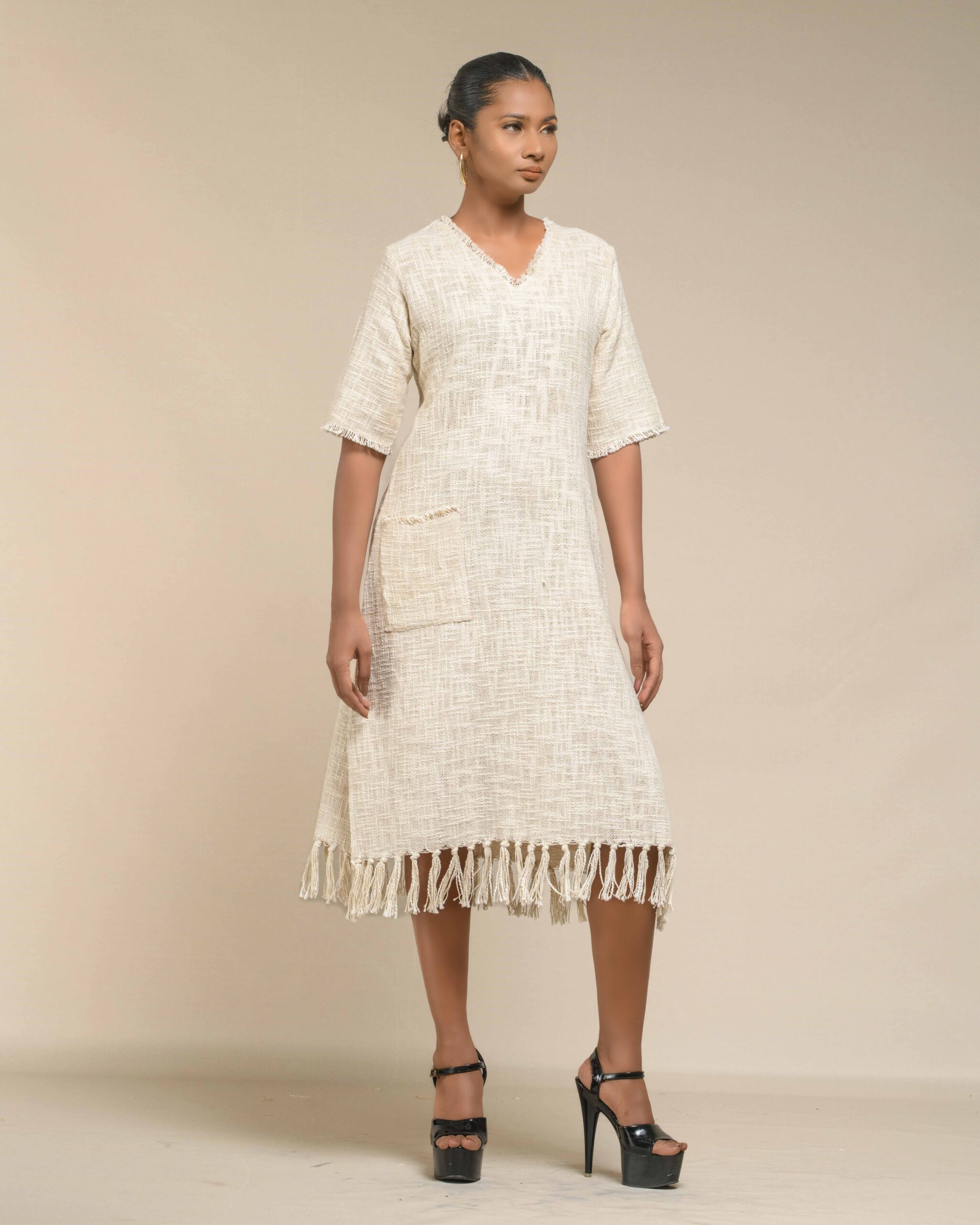Textured depth meets versatile wear: This premium slub Khadi dress features a stunning texture created by its thick yarn and slightly loose weave, making it comfortable and airy for summers. The modern silhouette is adorned with unique fringes at the neck and sleeves, and finished with delicate tassels at the hem. It’s an expression of Indo-Western fusion woven with ease & comfort that elevates everyday style with its simple, tactile elegance.