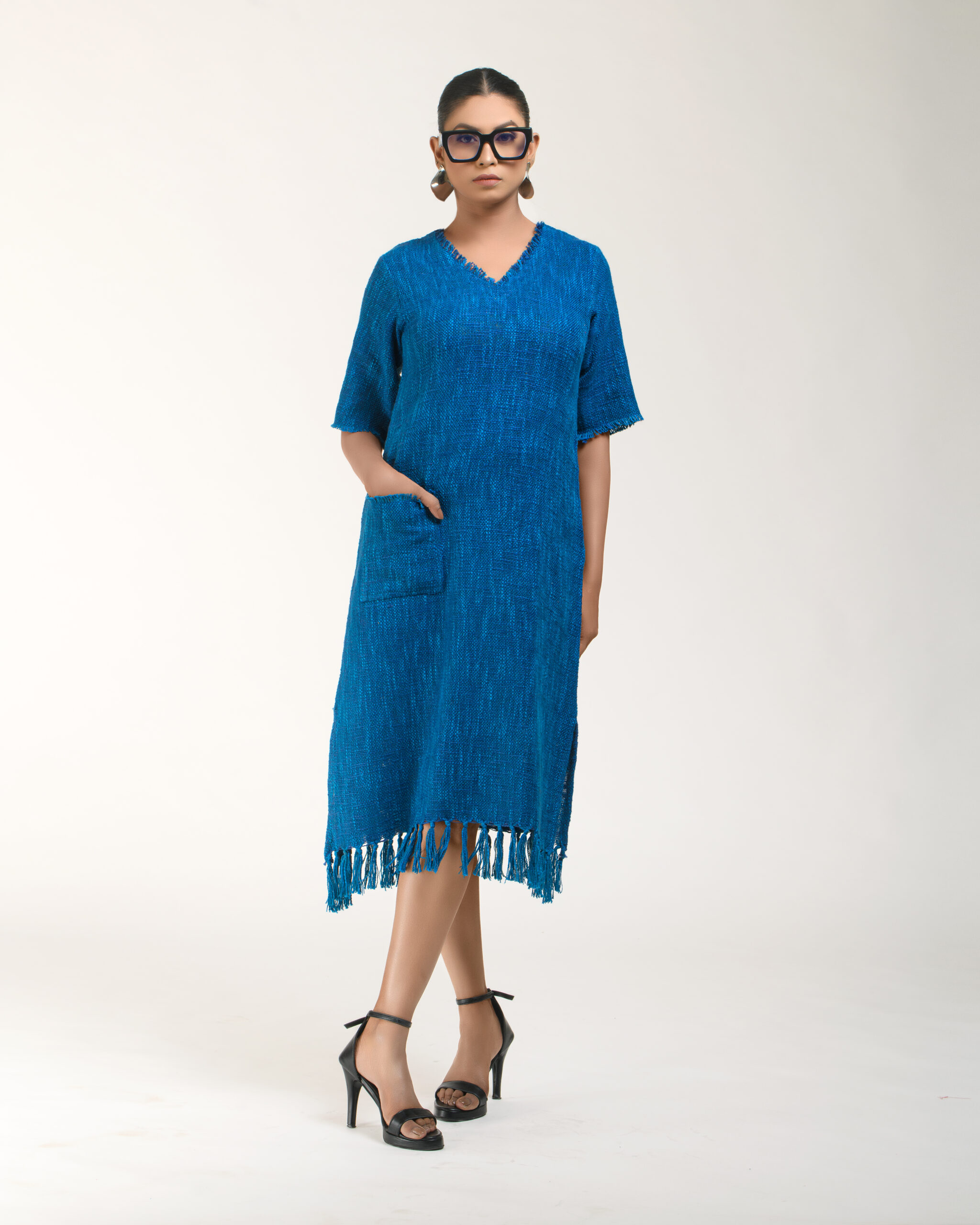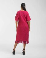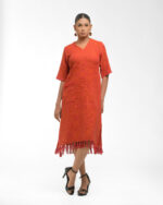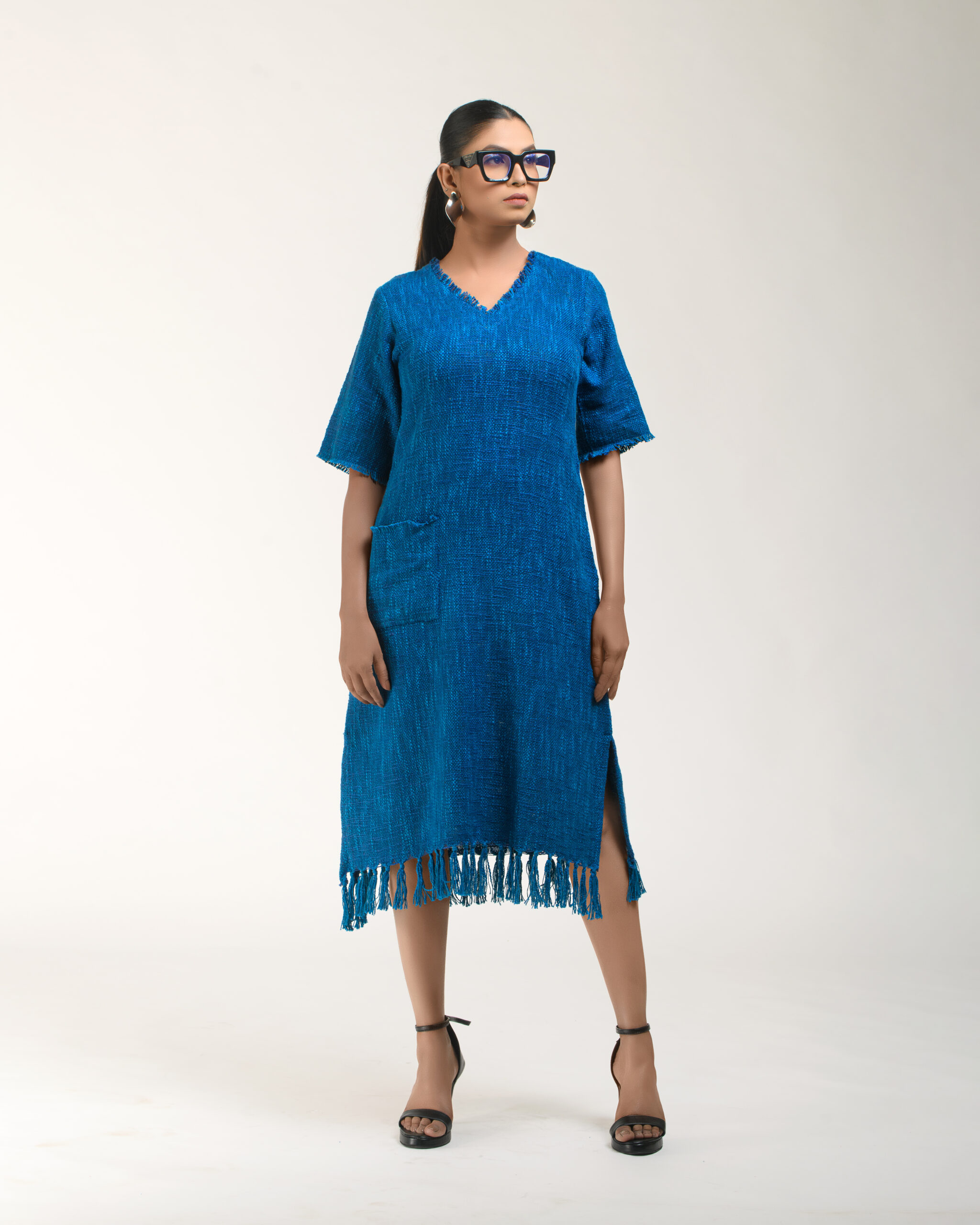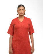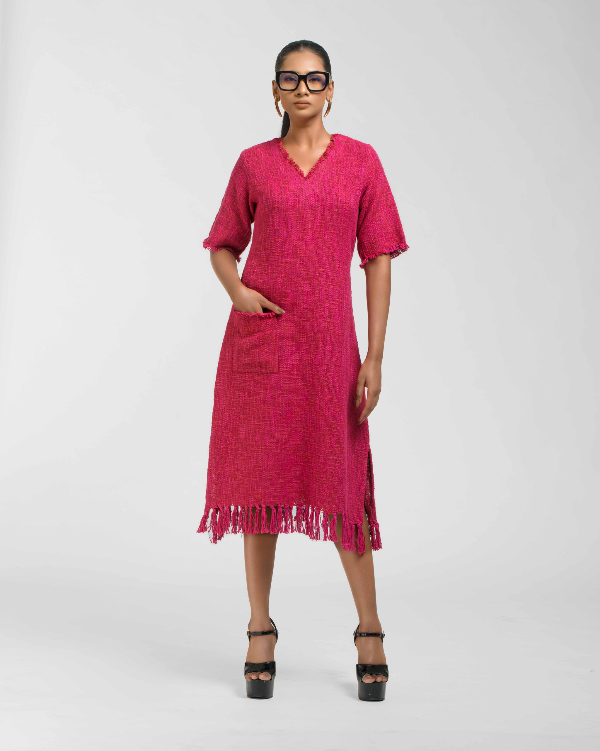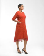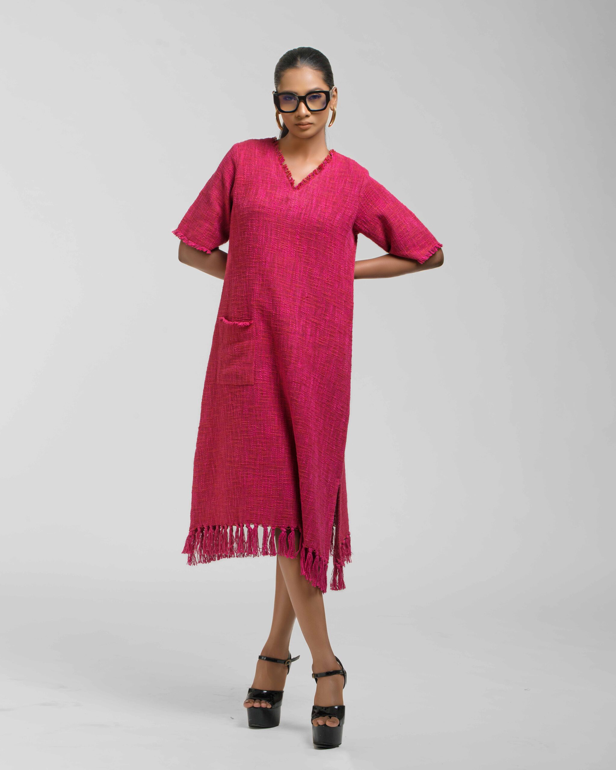 Textured depth meets versatile wear: This premium slub Khadi dress features a stunning texture created by its thick yarn and slightly loose weave, making it comfortable and airy for summers. The modern silhouette is adorned with unique fringes at the neck and sleeves, and finished with delicate tassels at the hem. It’s an expression of Indo-Western fusion woven with ease & comfort that elevates everyday style with its simple, tactile elegance.