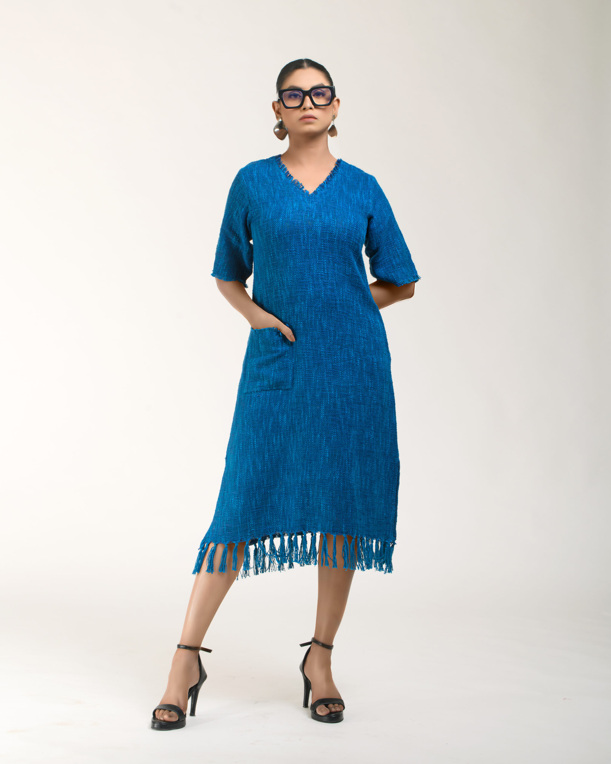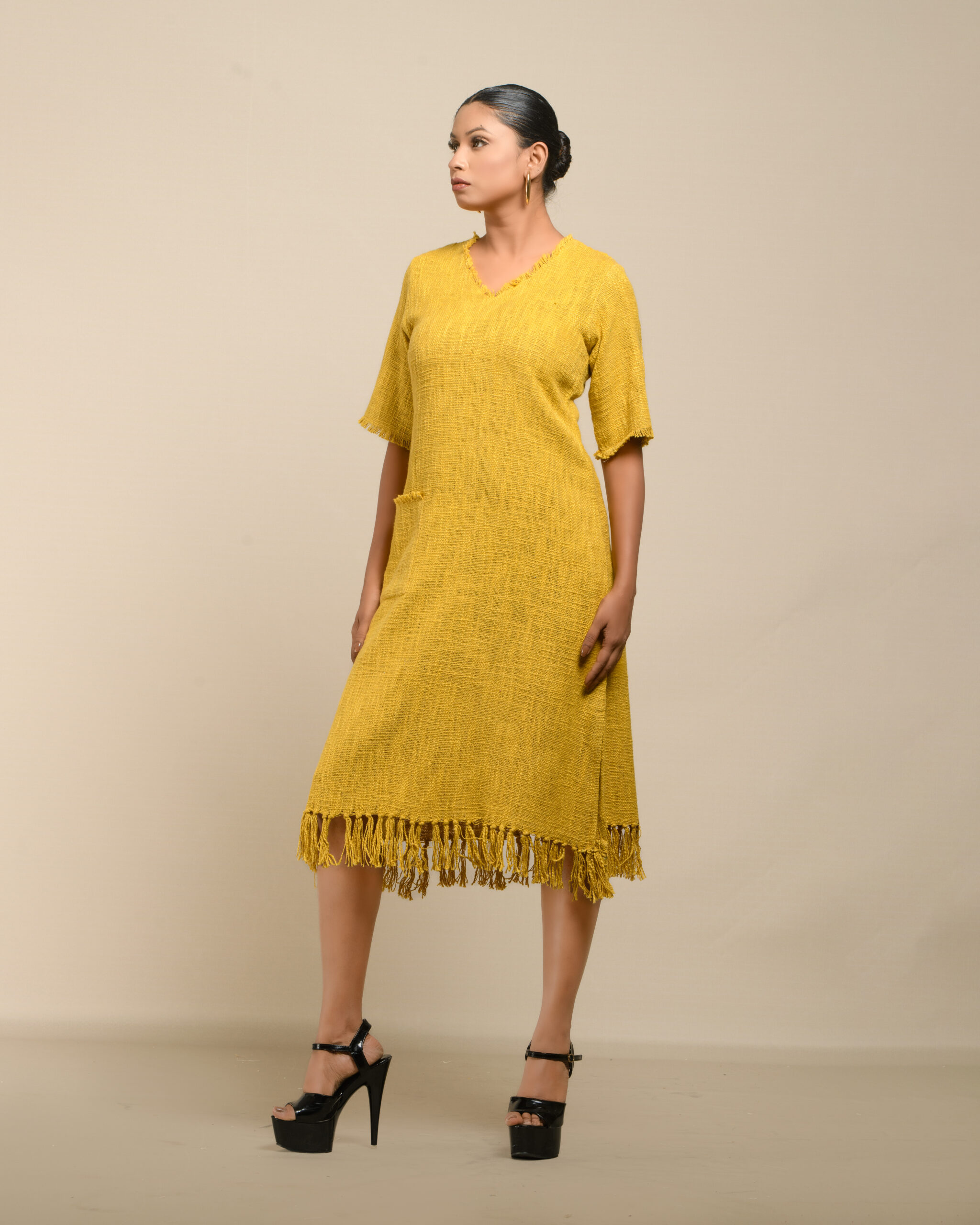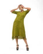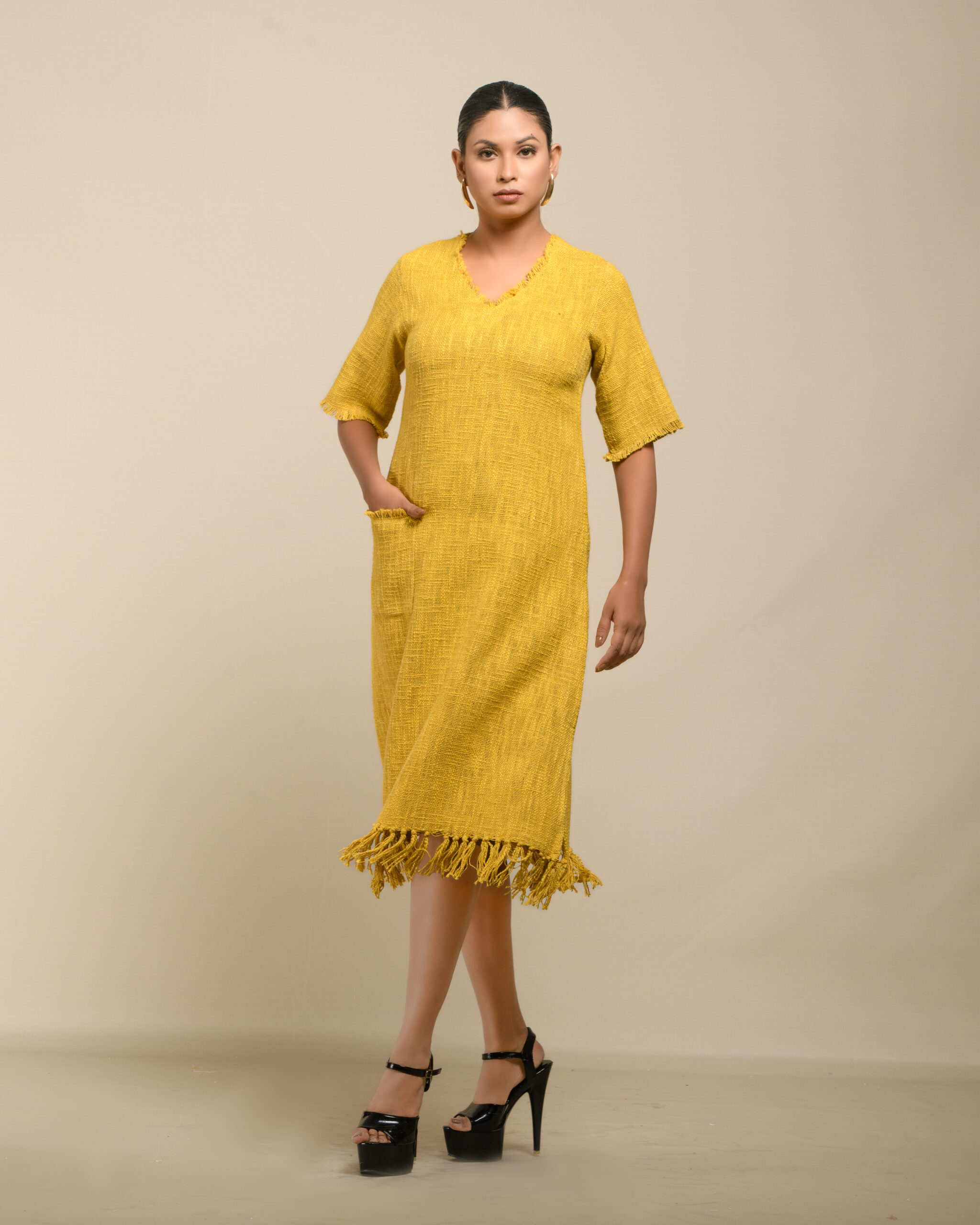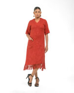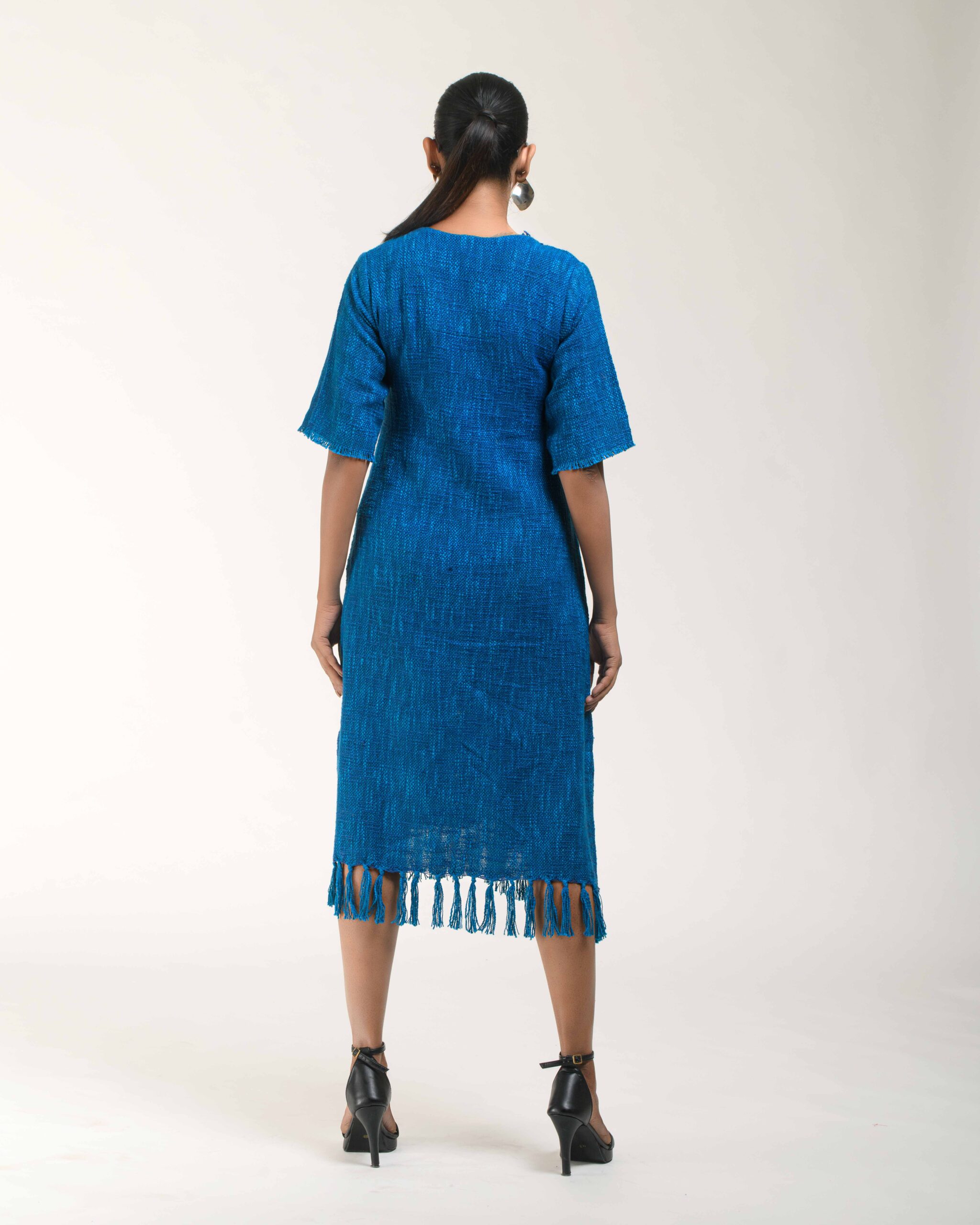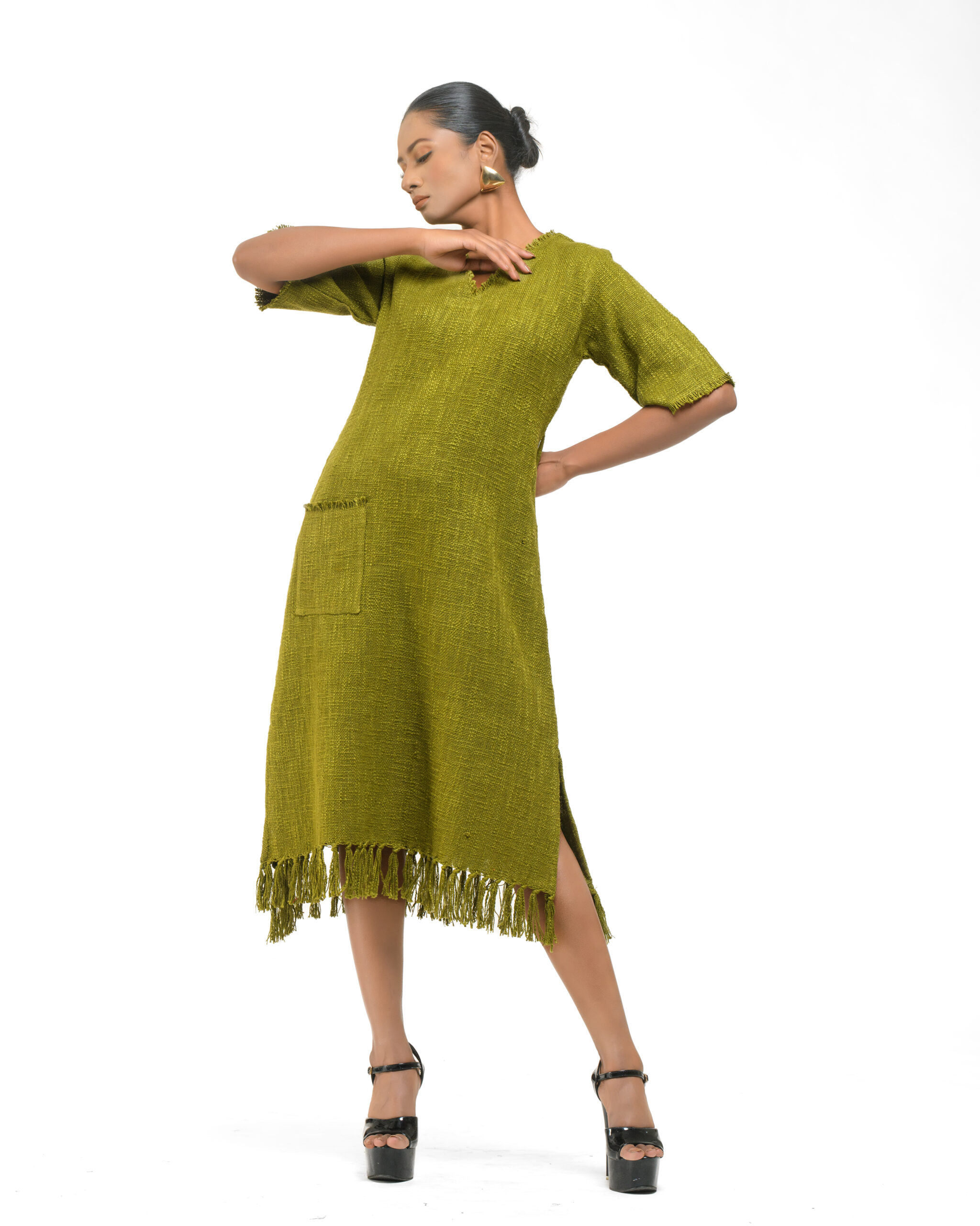 Textured depth meets versatile wear: This premium slub Khadi dress features a stunning texture created by its thick yarn and slightly loose weave, making it comfortable and airy for summers. The modern silhouette is adorned with unique fringes at the neck and sleeves, and finished with delicate tassels at the hem. It’s an expression of Indo-Western fusion woven with ease & comfort that elevates everyday style with its simple, tactile elegance.