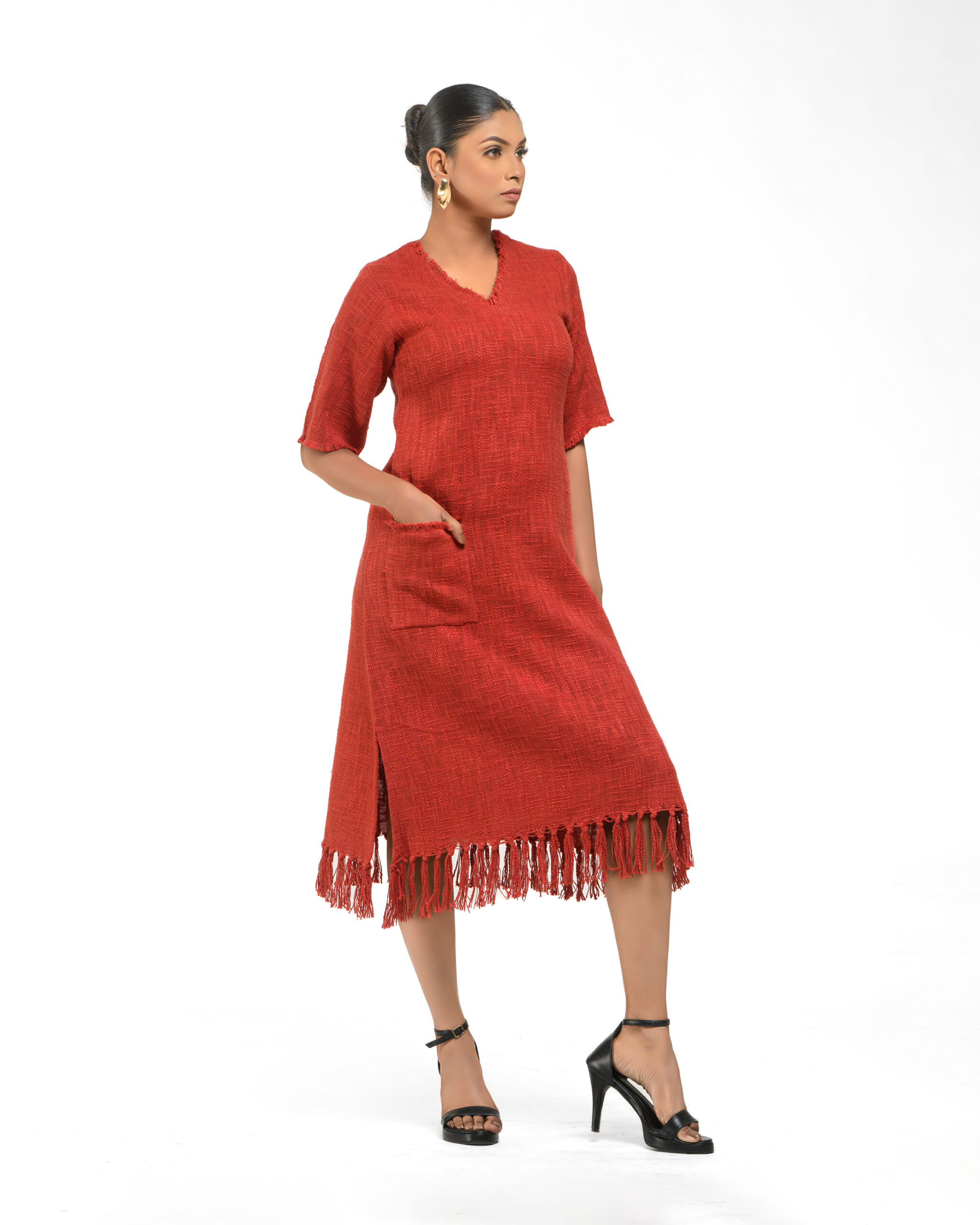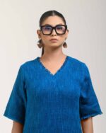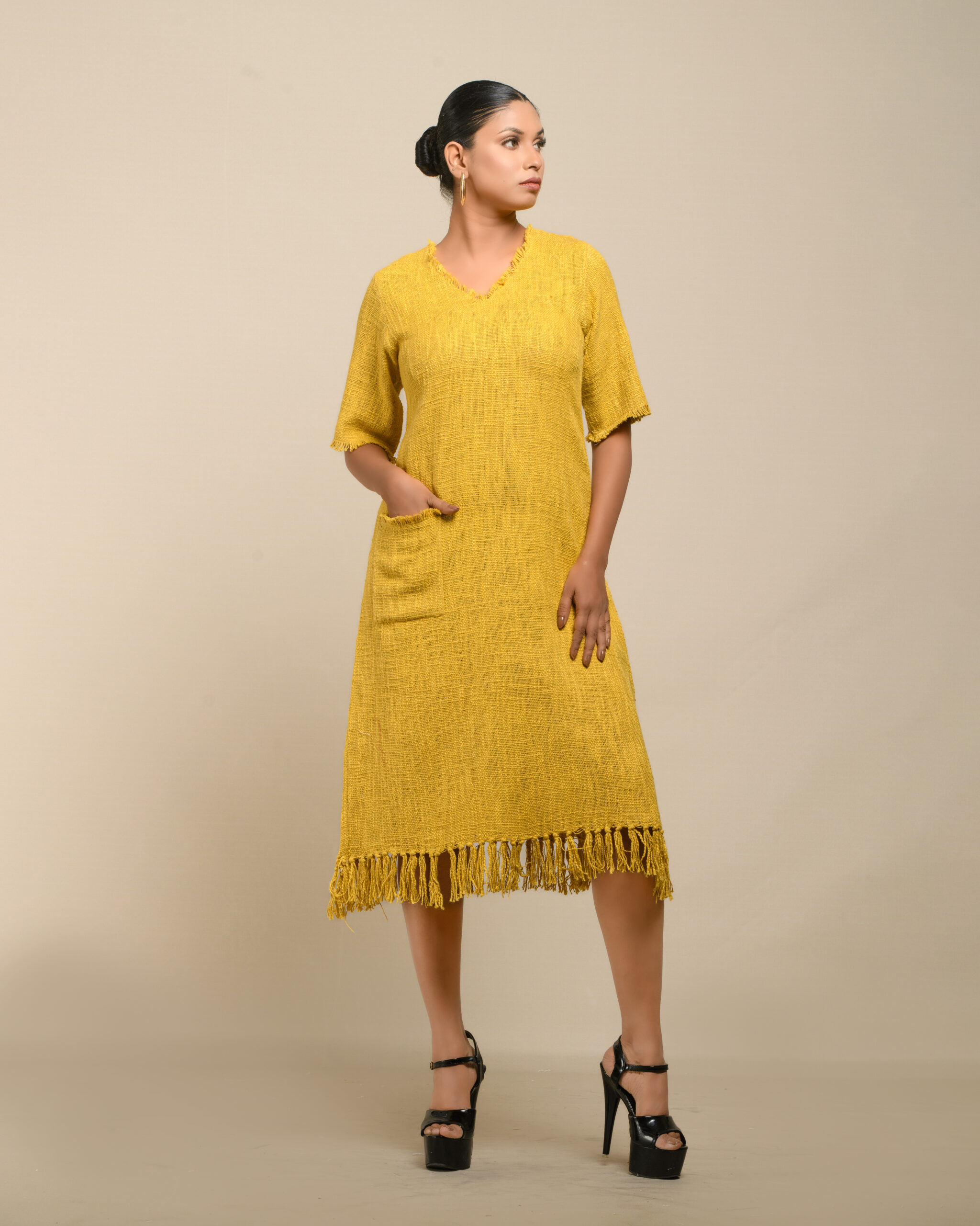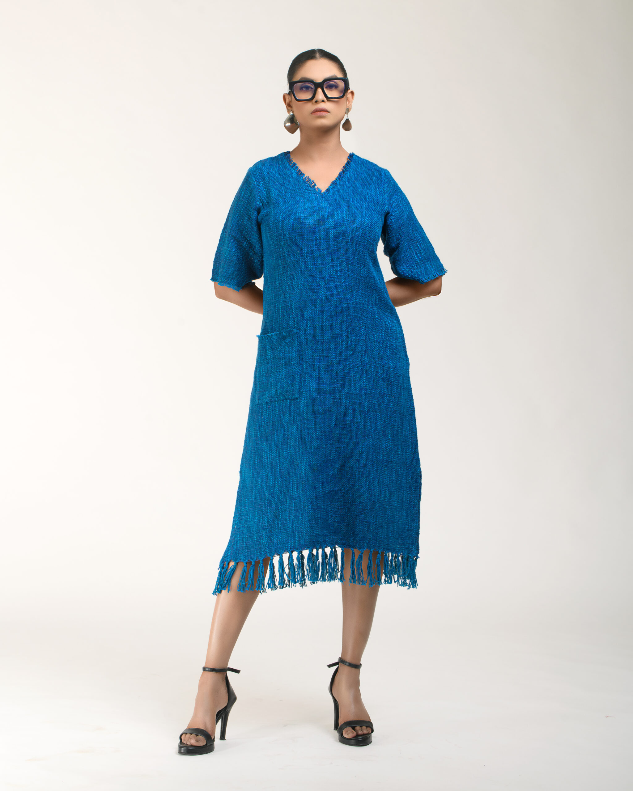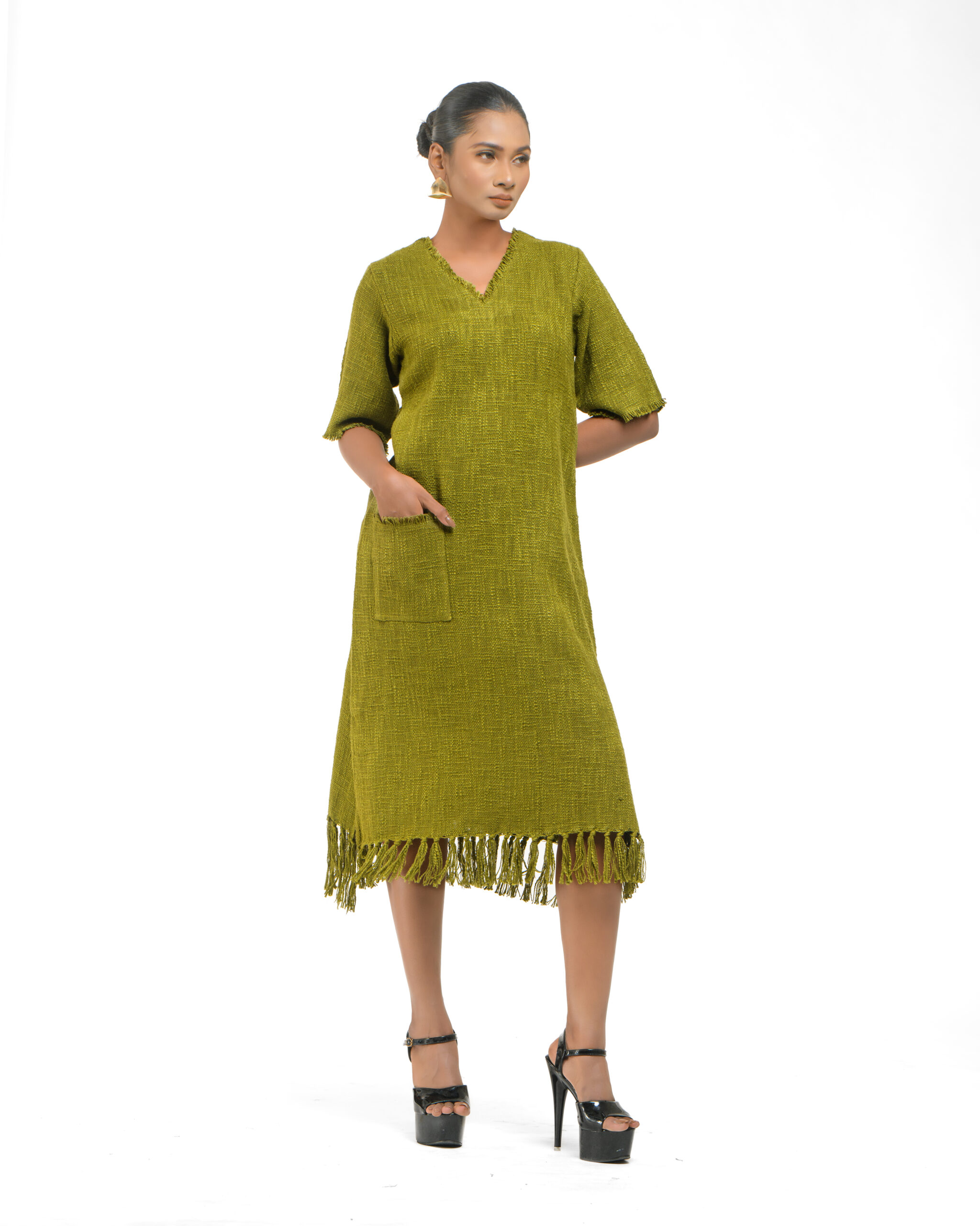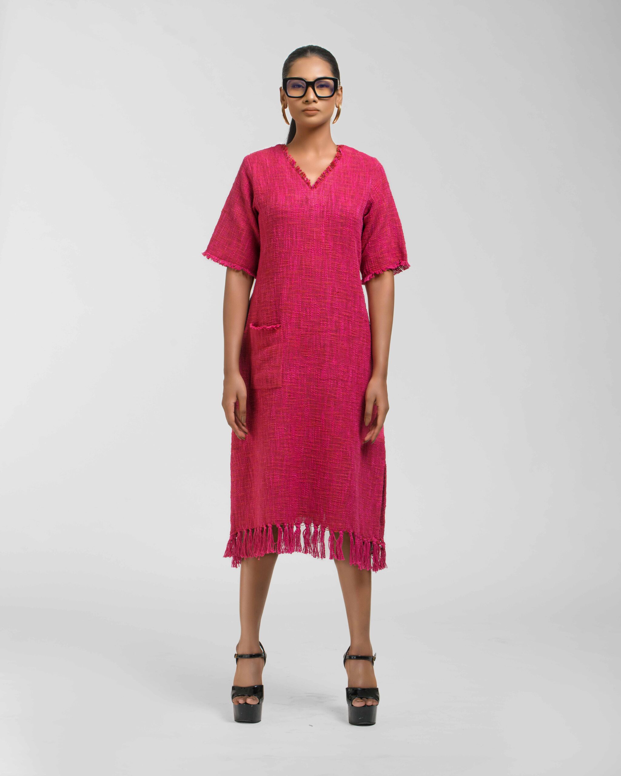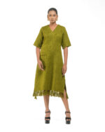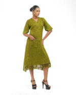 Textured depth meets versatile wear: This premium slub Khadi dress features a stunning texture created by its thick yarn and slightly loose weave, making it comfortable and airy for summers. The modern silhouette is adorned with unique fringes at the neck and sleeves, and finished with delicate tassels at the hem. It’s an expression of Indo-Western fusion woven with ease & comfort that elevates everyday style with its simple, tactile elegance.