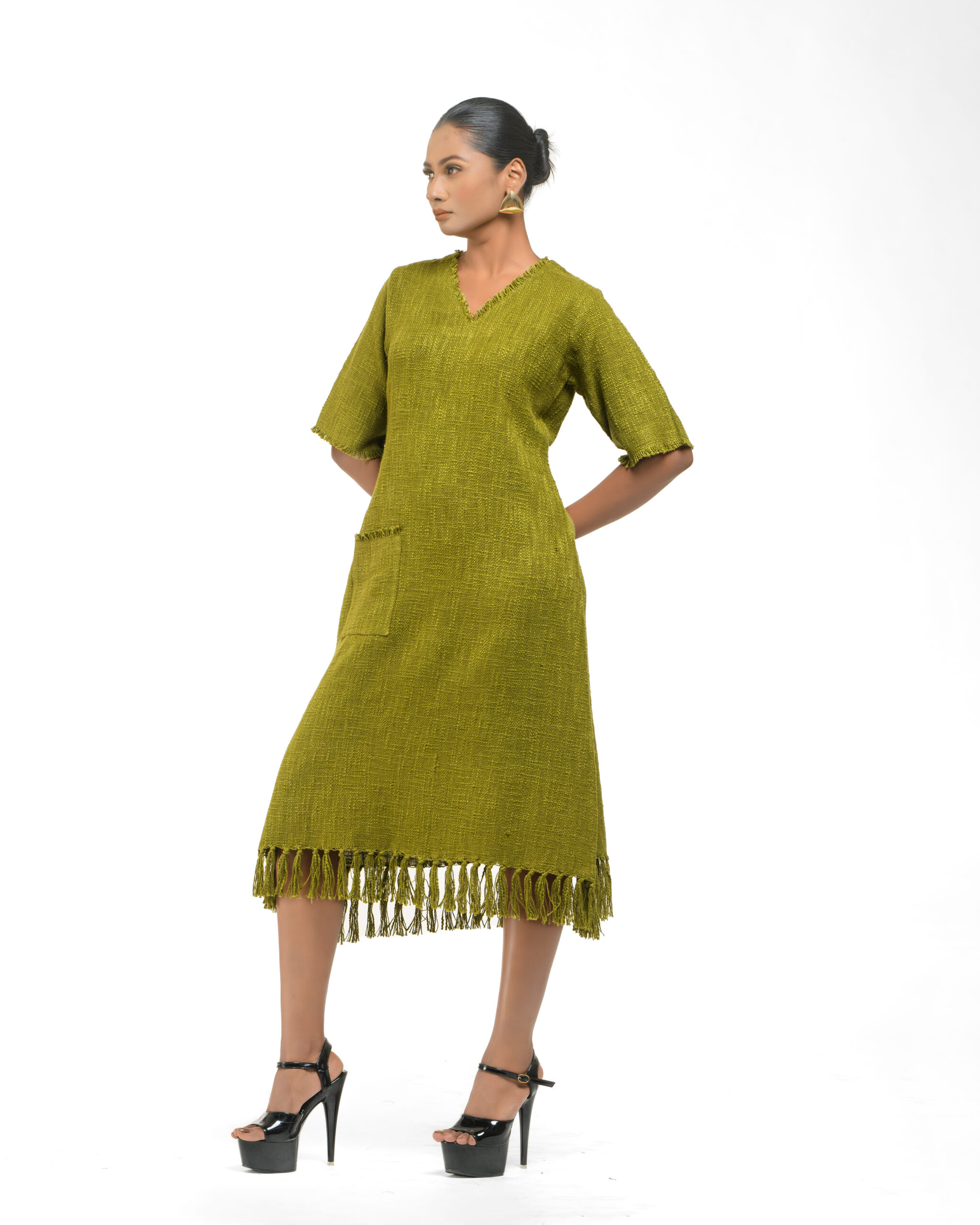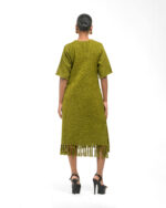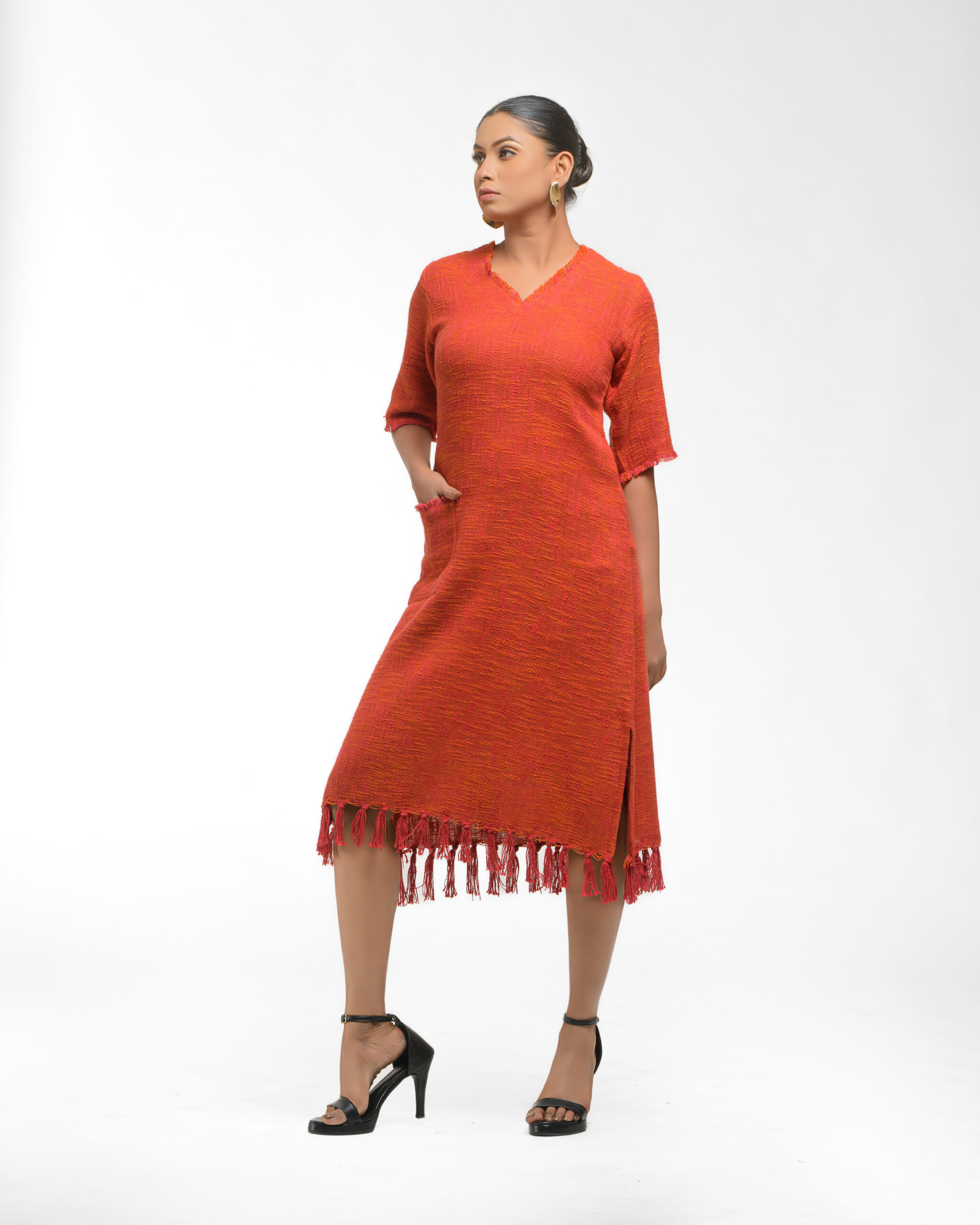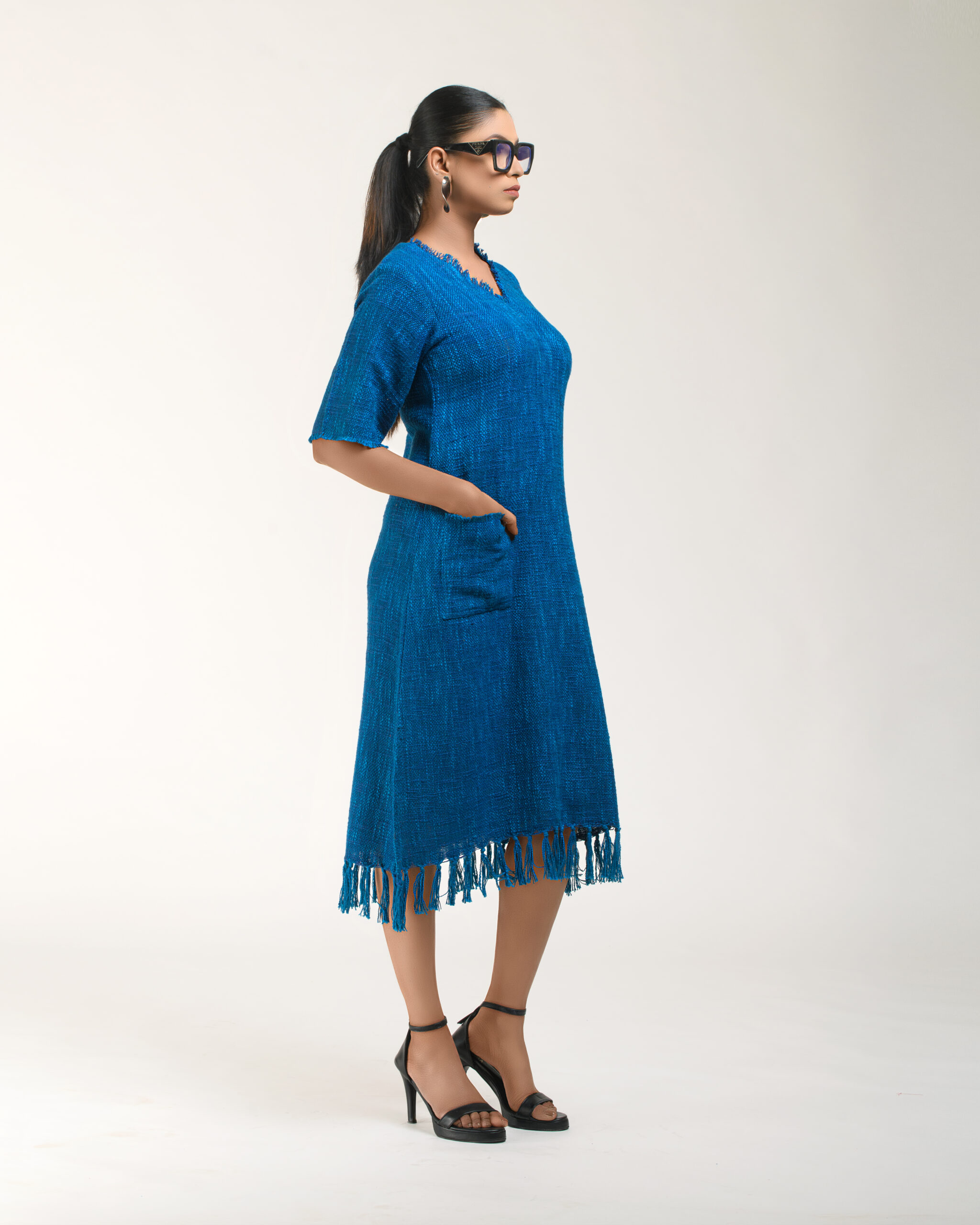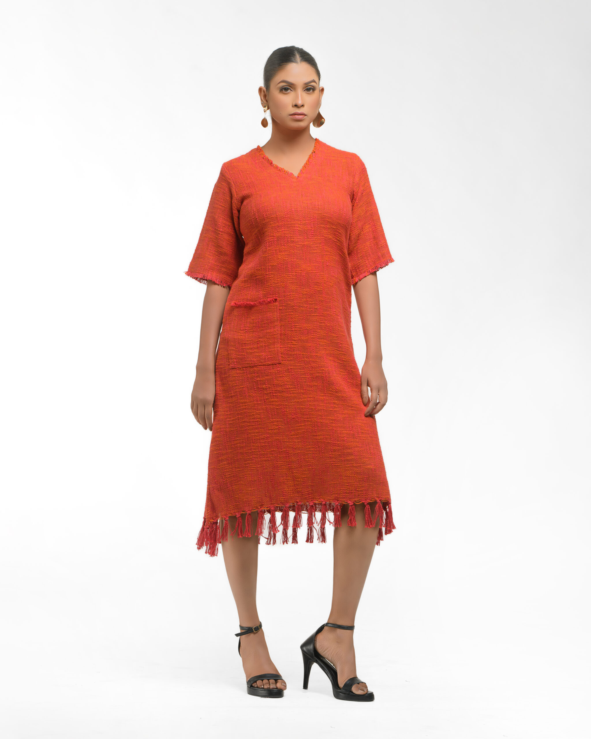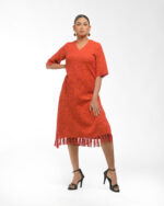 Textured depth meets versatile wear: This premium slub Khadi dress features a stunning texture created by its thick yarn and slightly loose weave, making it comfortable and airy for summers. The modern silhouette is adorned with unique fringes at the neck and sleeves, and finished with delicate tassels at the hem. It’s an expression of Indo-Western fusion woven with ease & comfort that elevates everyday style with its simple, tactile elegance.