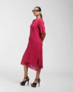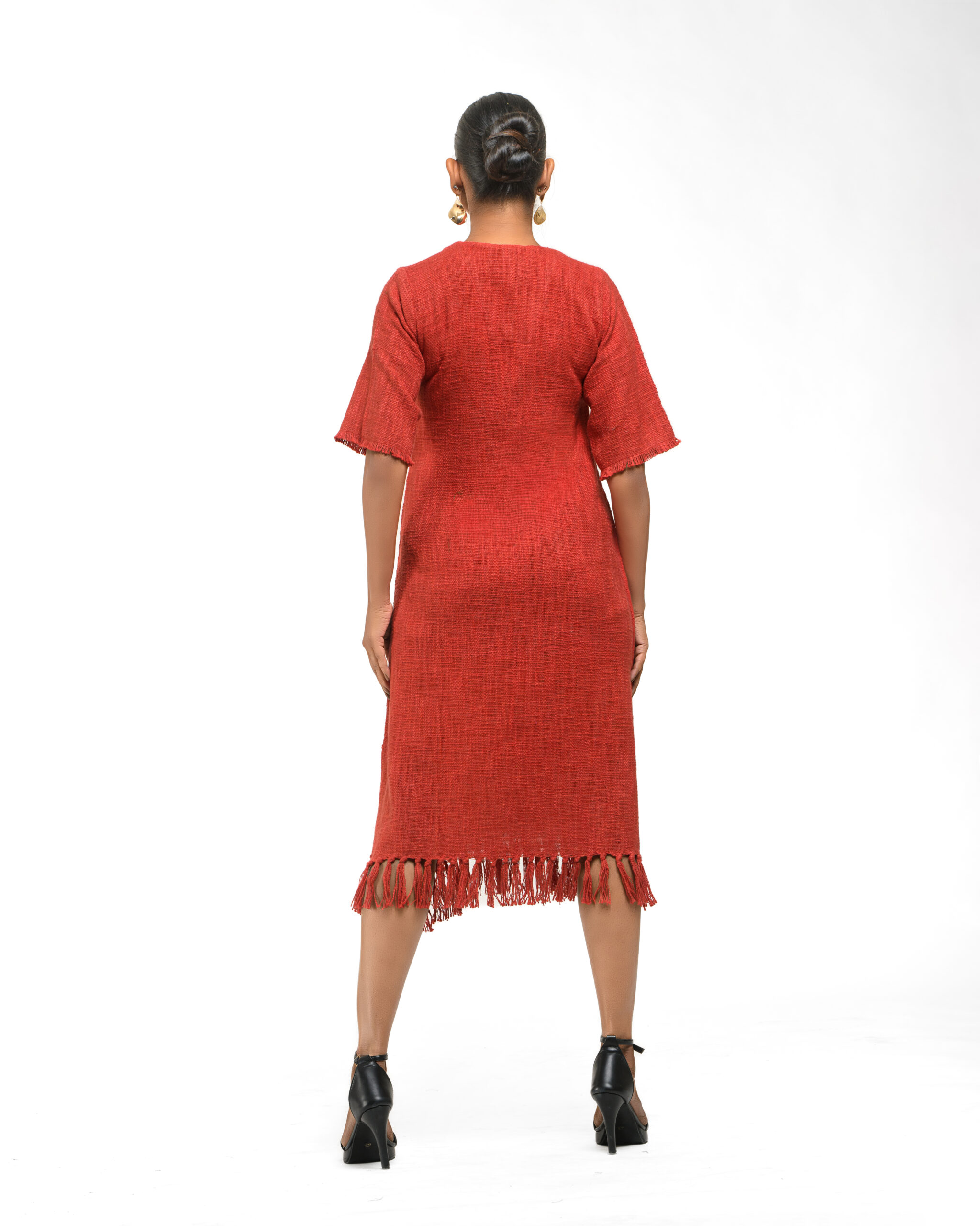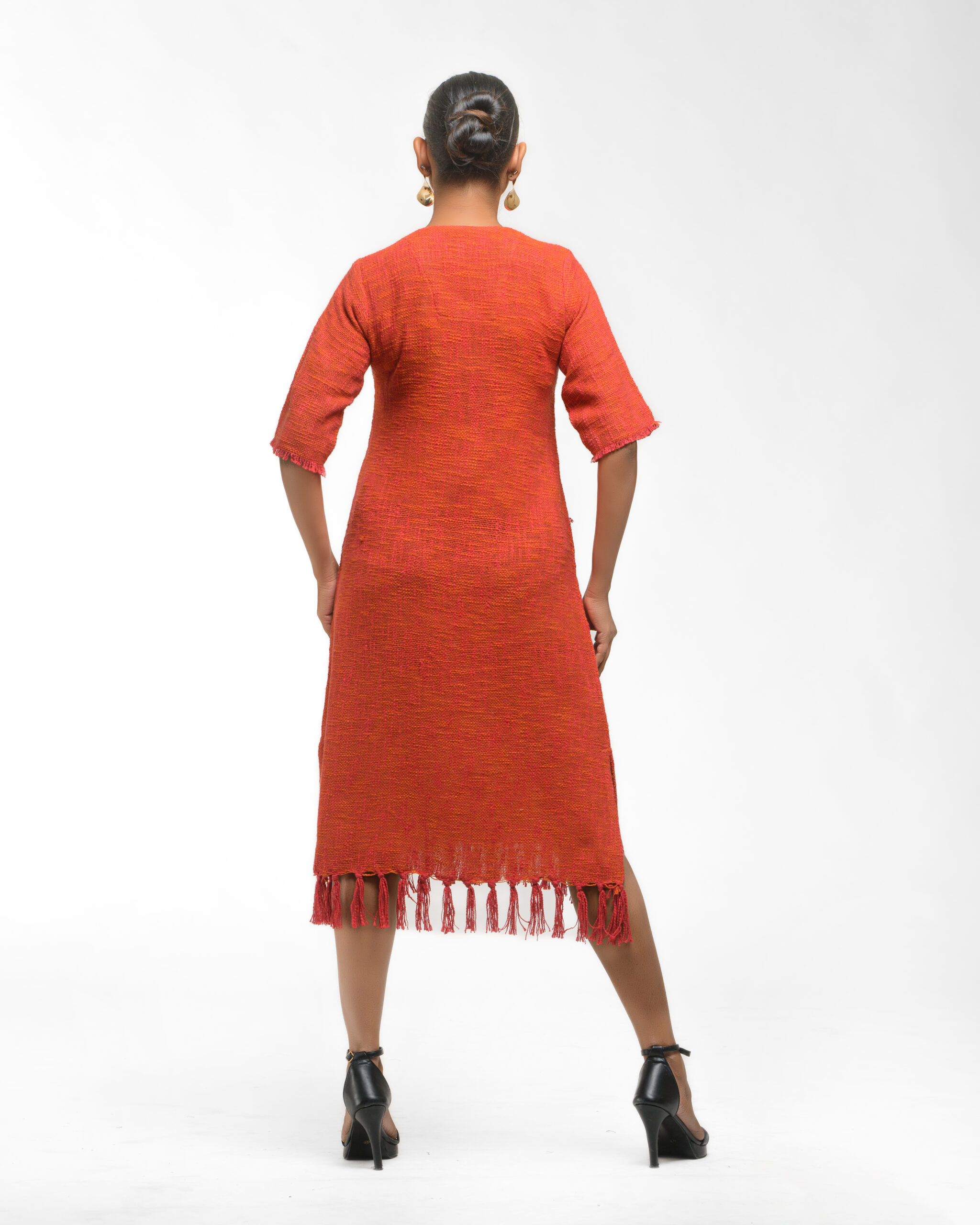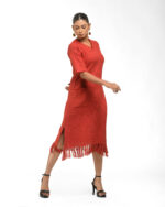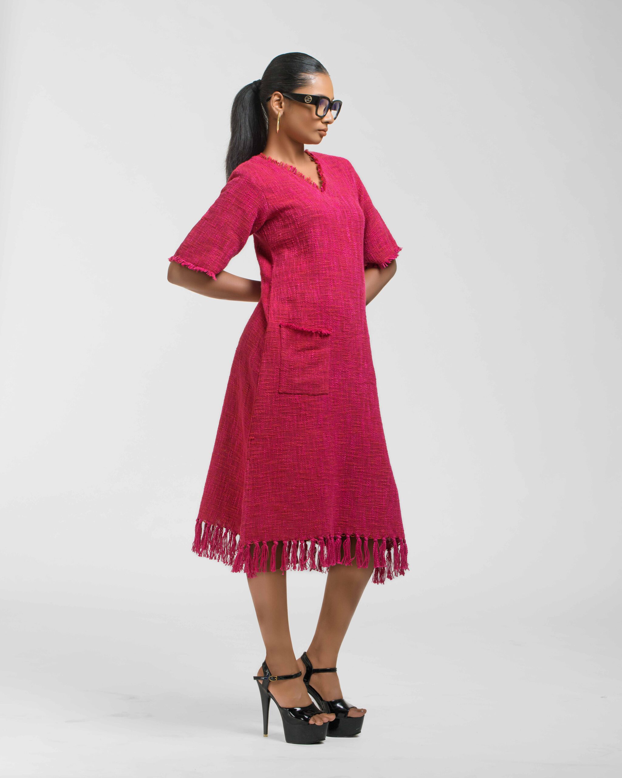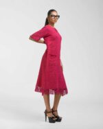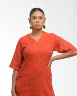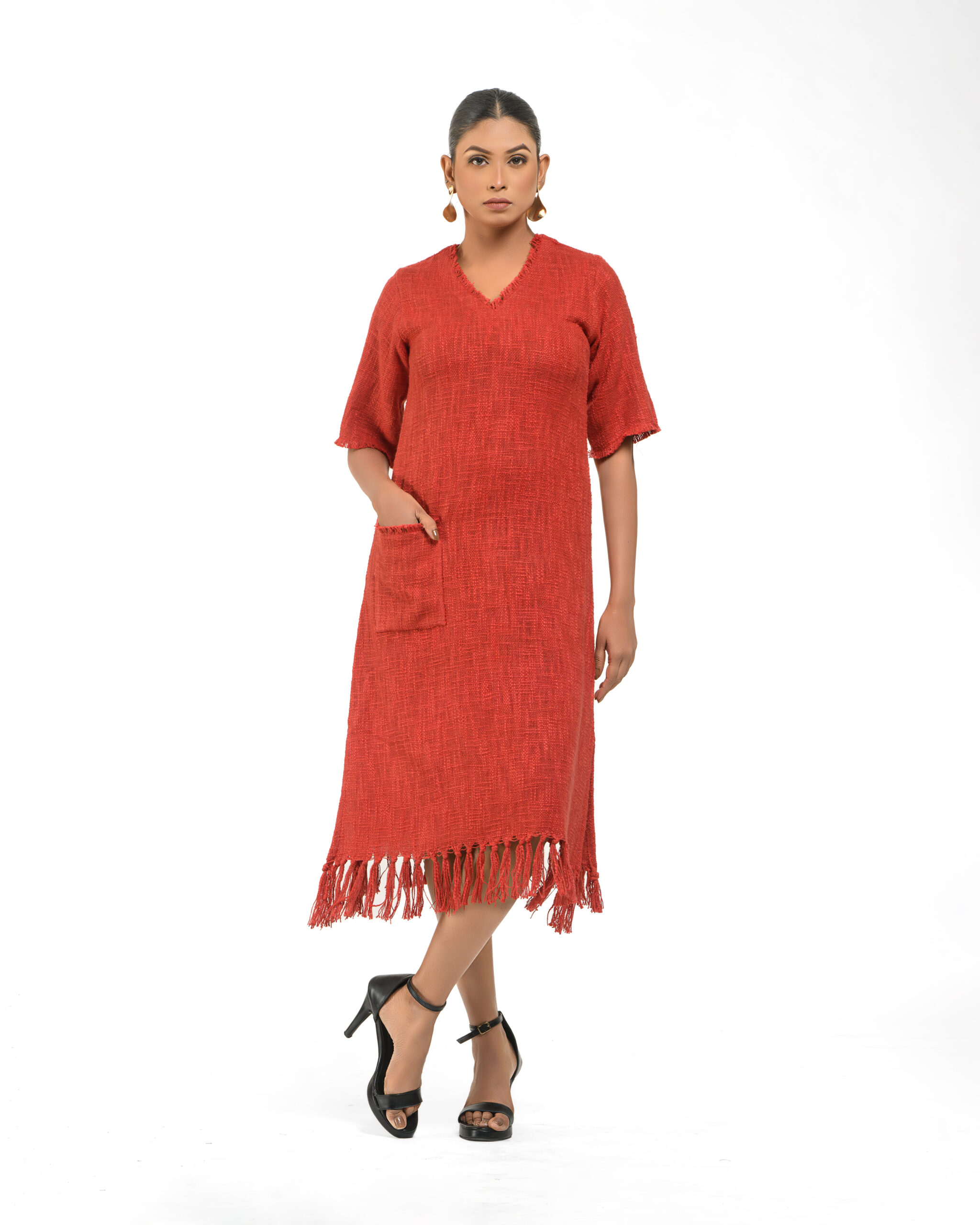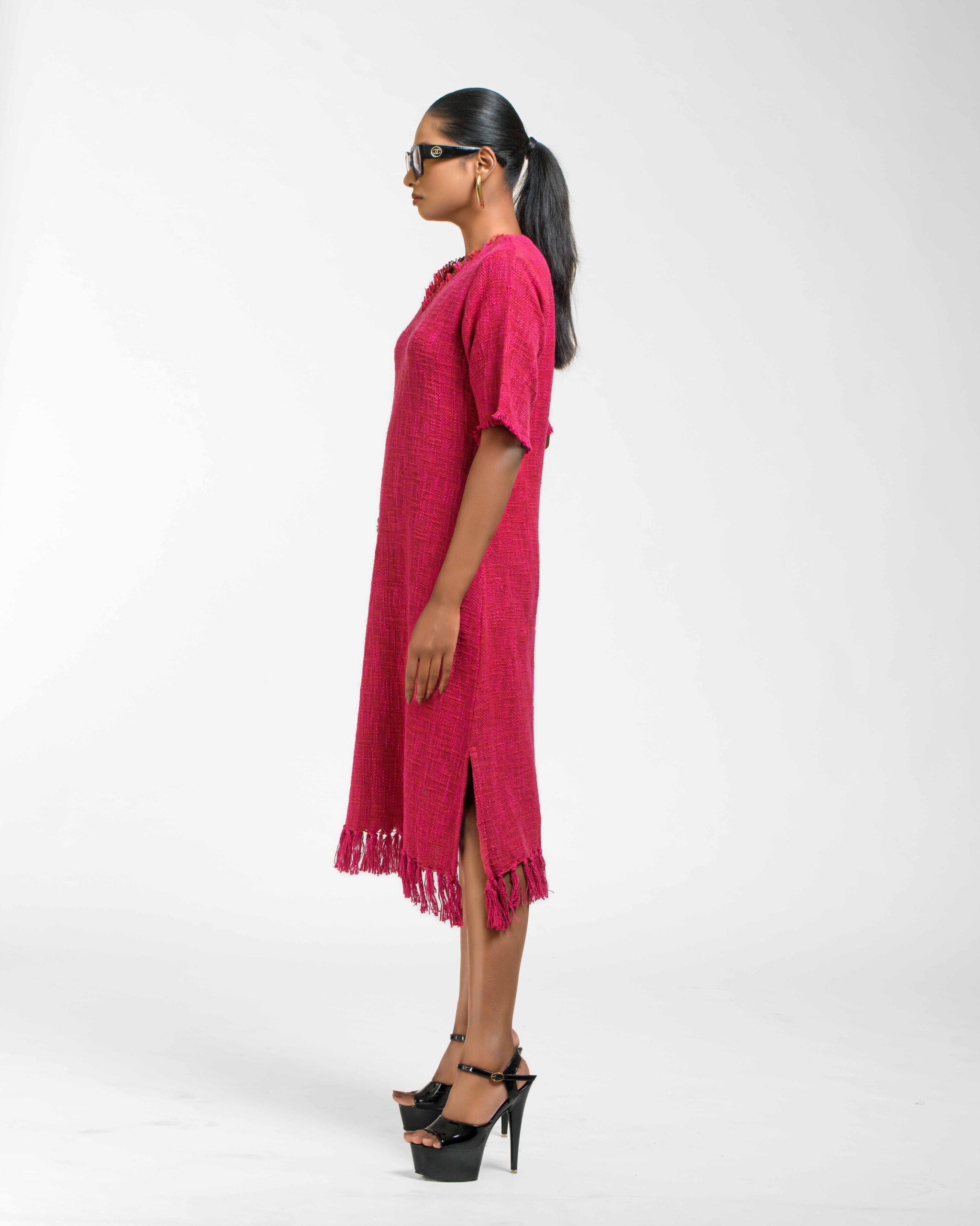 Textured depth meets versatile wear: This premium slub Khadi dress features a stunning texture created by its thick yarn and slightly loose weave, making it comfortable and airy for summers. The modern silhouette is adorned with unique fringes at the neck and sleeves, and finished with delicate tassels at the hem. It’s an expression of Indo-Western fusion woven with ease & comfort that elevates everyday style with its simple, tactile elegance.