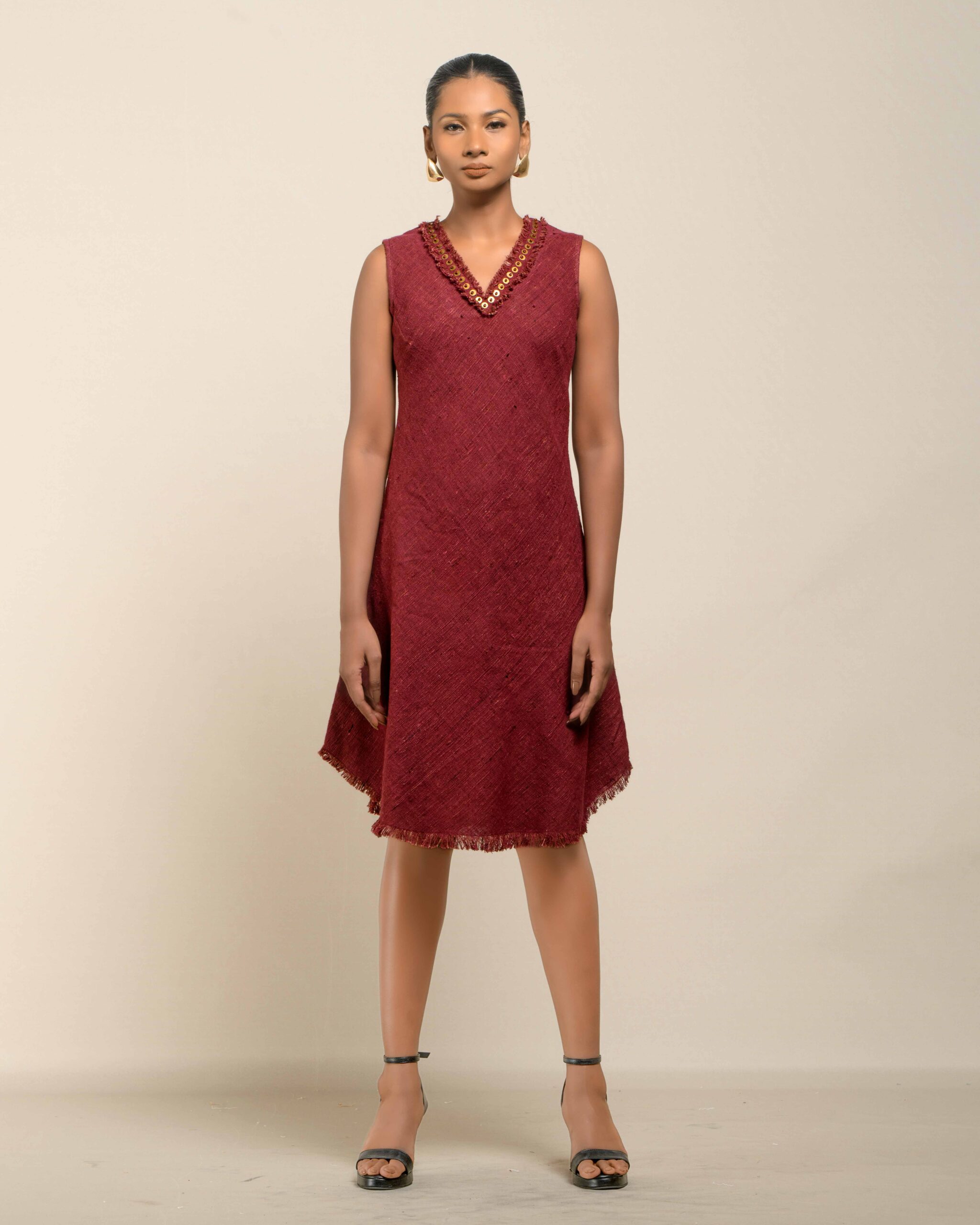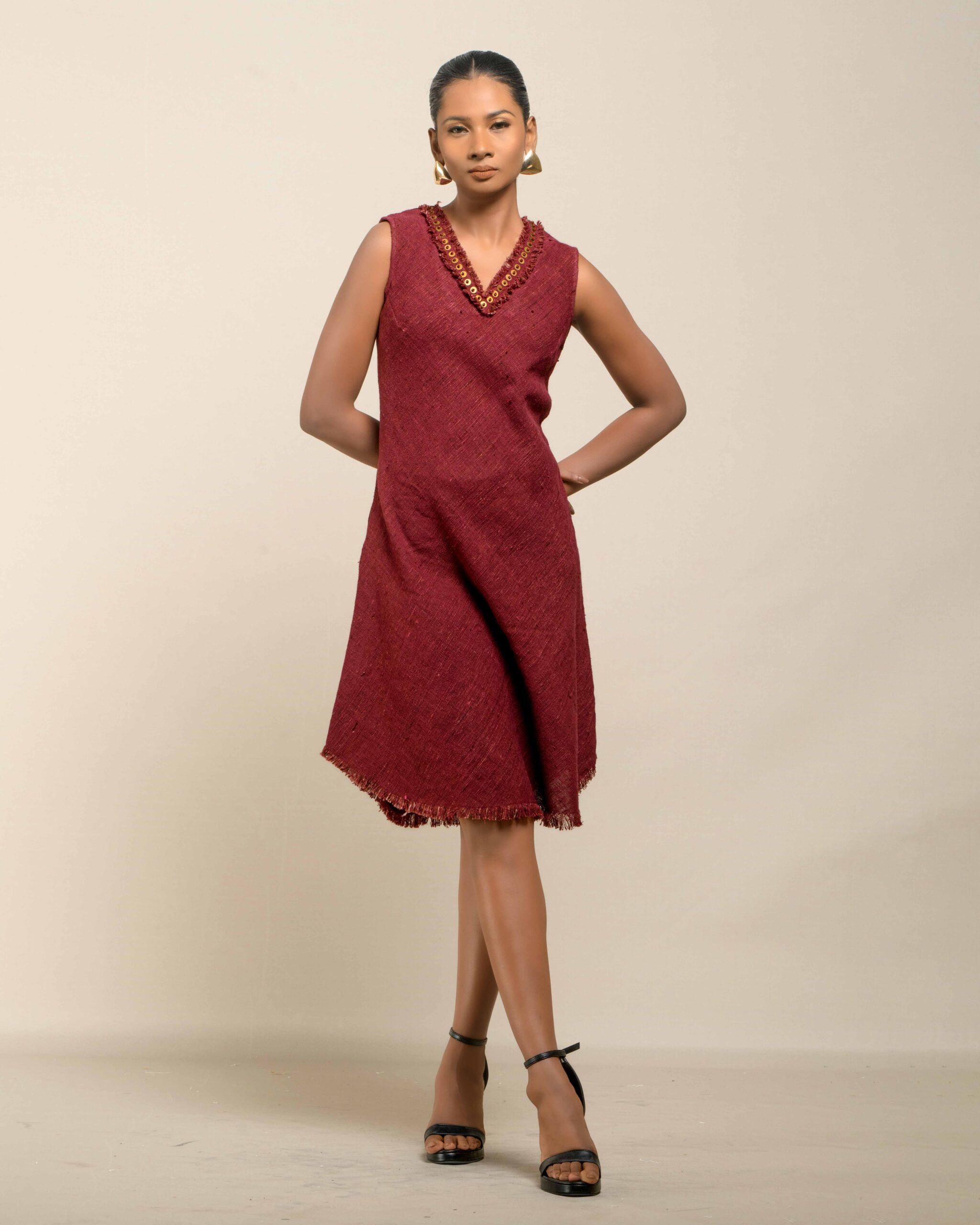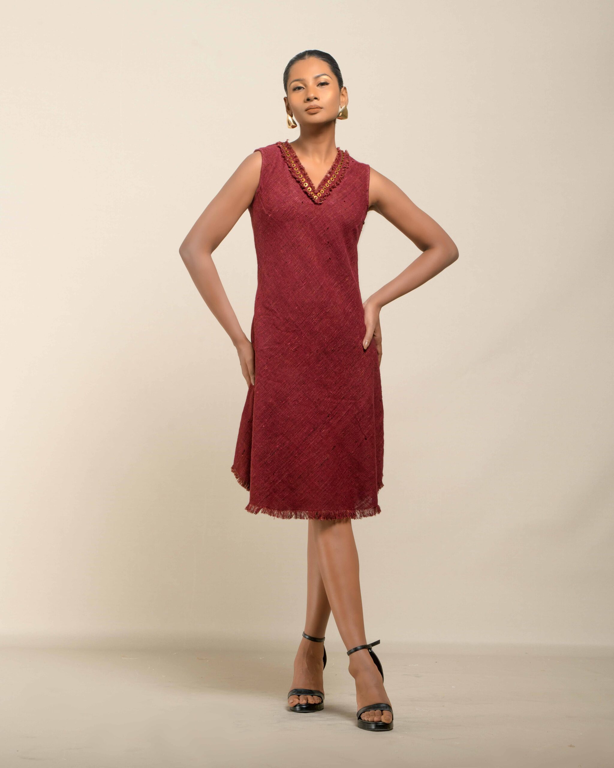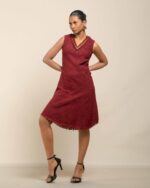 Experience conscious luxury in this dress made from premium Malaysian Khadi, featuring a rich, vibrant colour achieved with Azo-Free dyes. The Khadi feels super soft and breathable. The elegant silhouette is finished with fringes at the bottom and a sophisticated double fringe neckline featuring meticulous handwork in-between, offering refined artisan elegance.