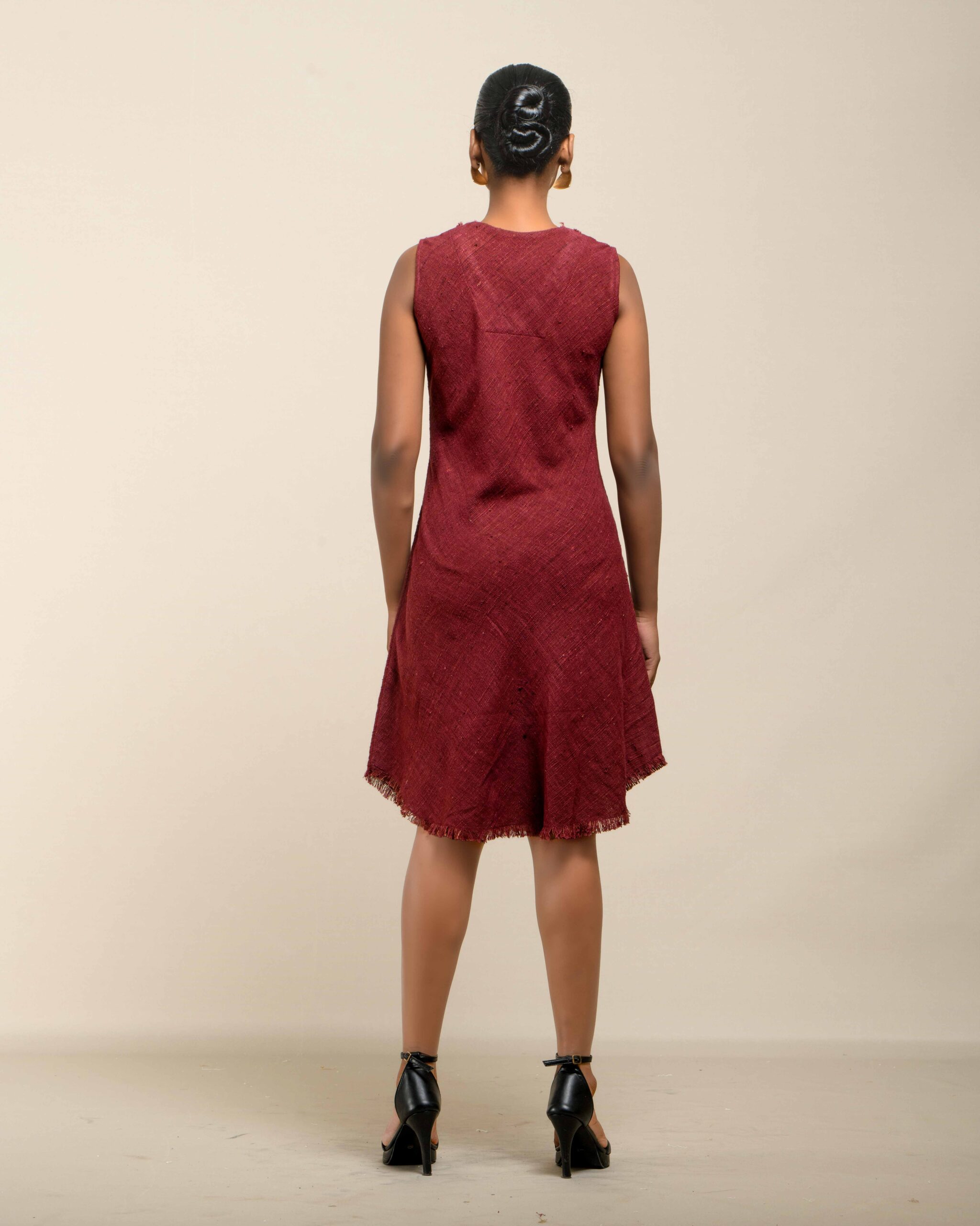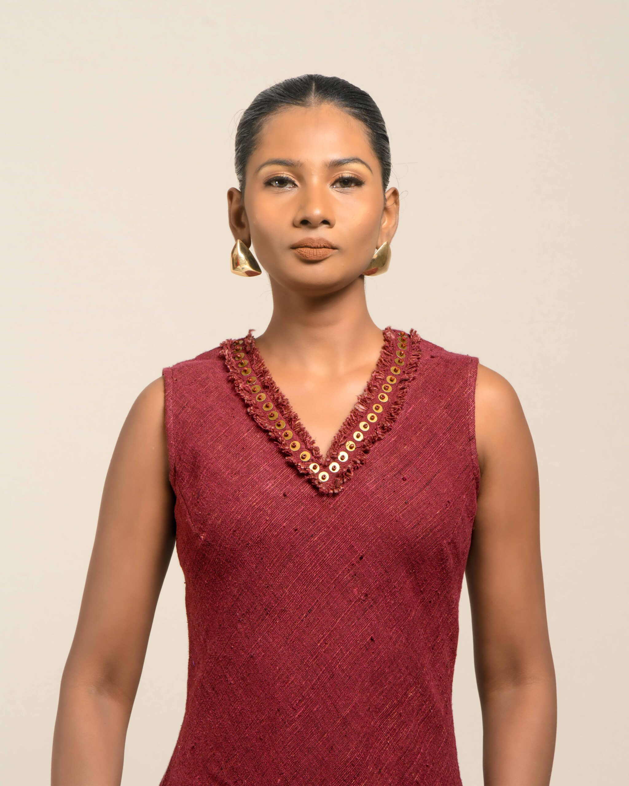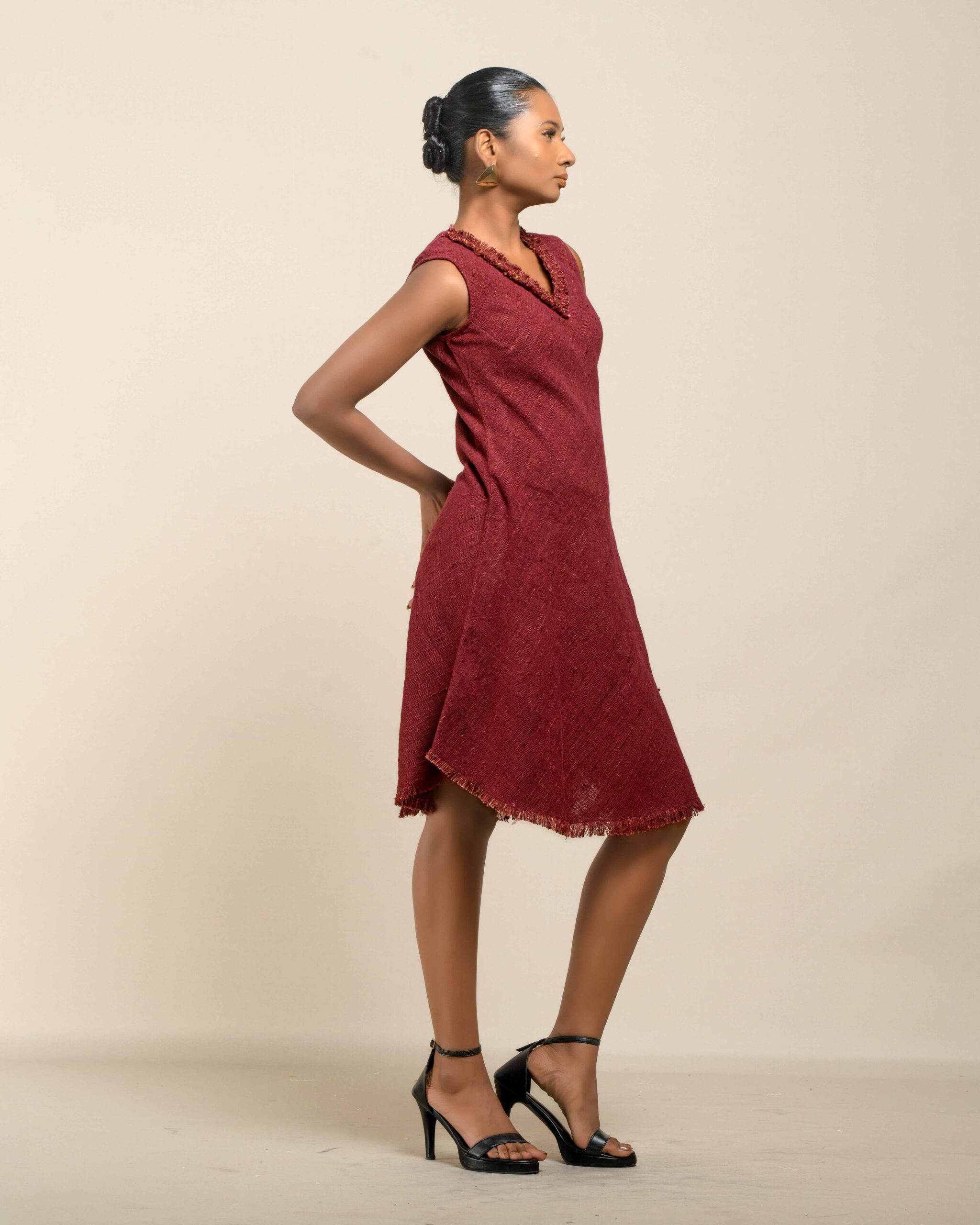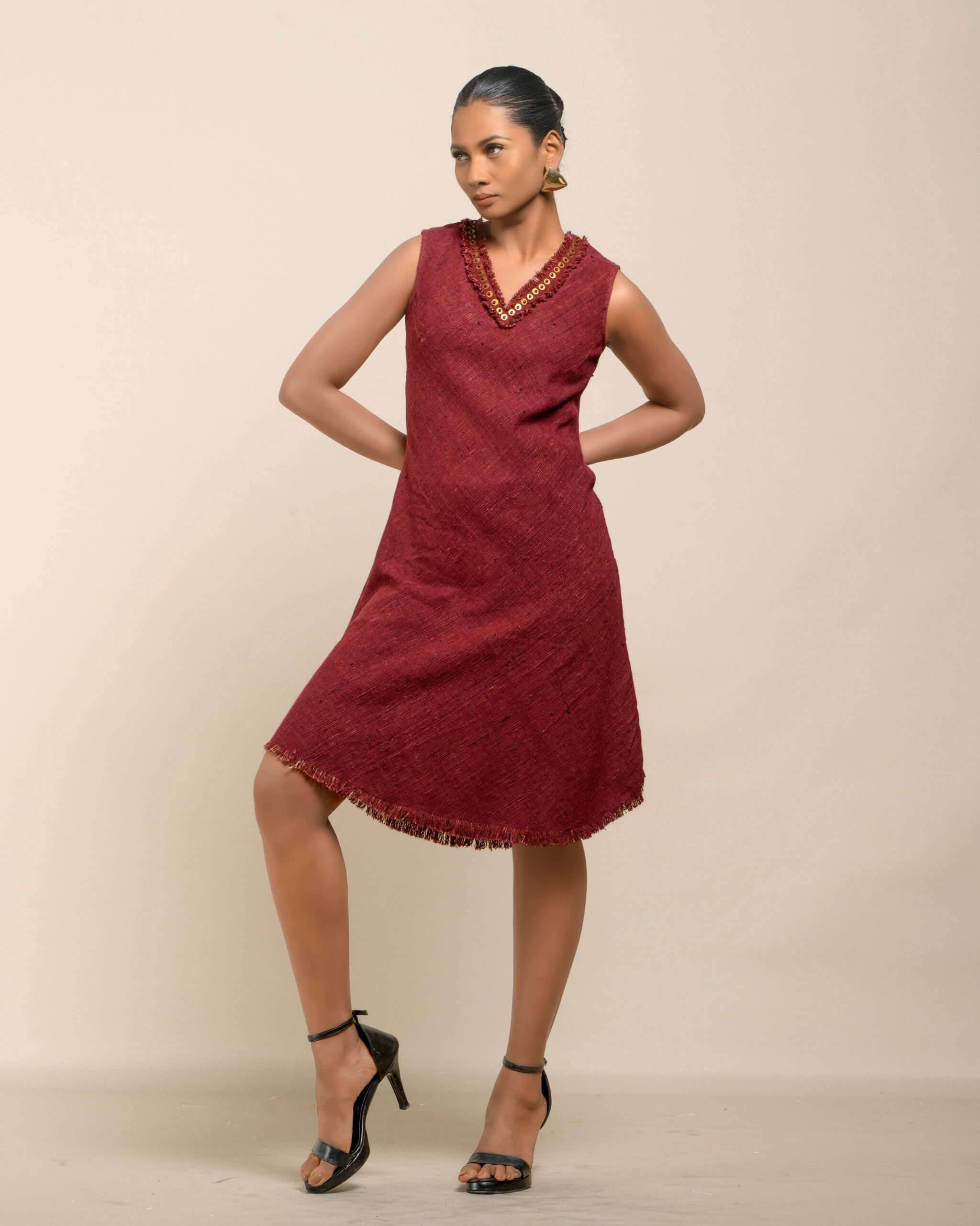 Experience conscious luxury in this dress made from premium Malaysian Khadi, featuring a rich, vibrant colour achieved with Azo-Free dyes. The Khadi feels super soft and breathable. The elegant silhouette is finished with fringes at the bottom and a sophisticated double fringe neckline featuring meticulous handwork in-between, offering refined artisan elegance.