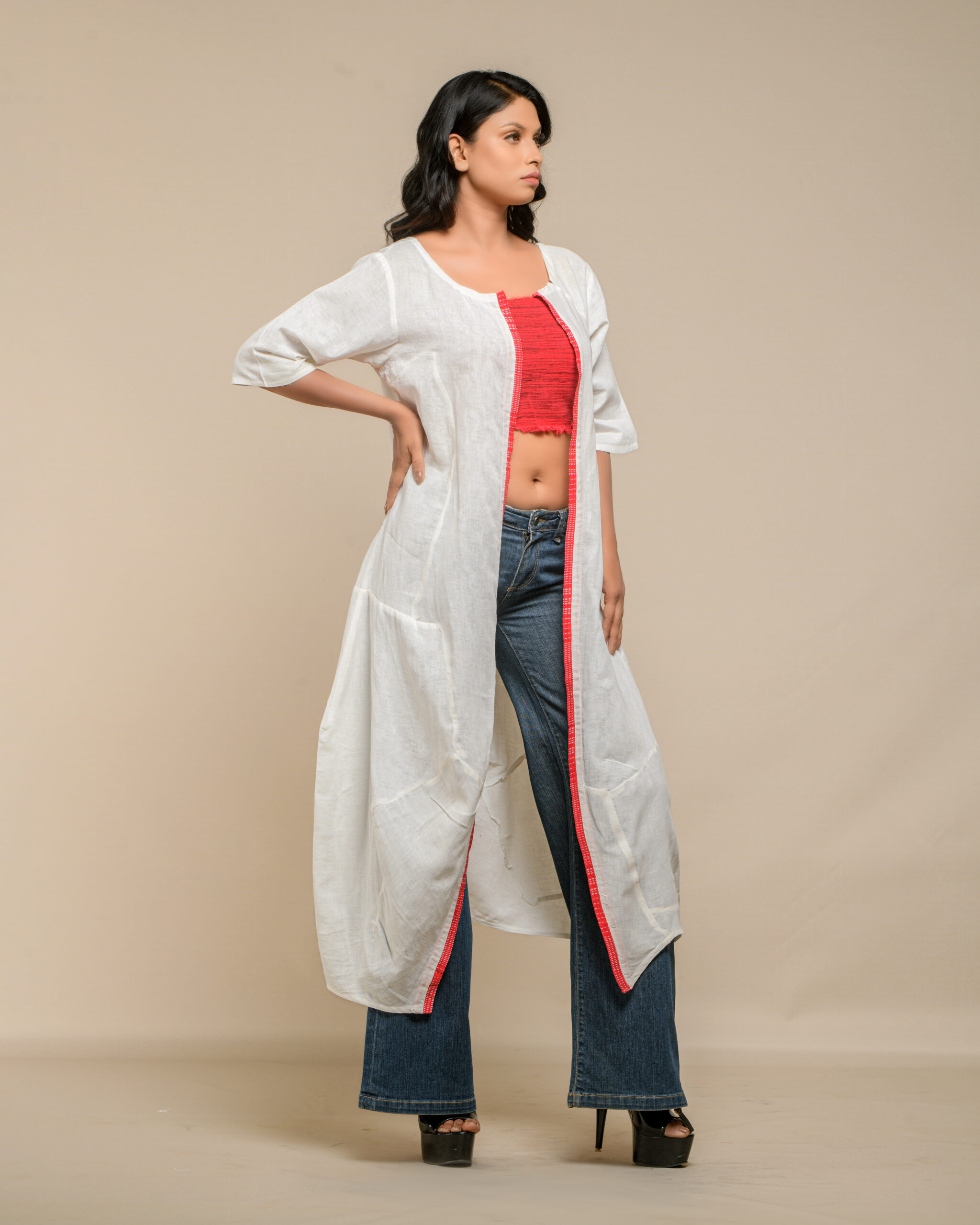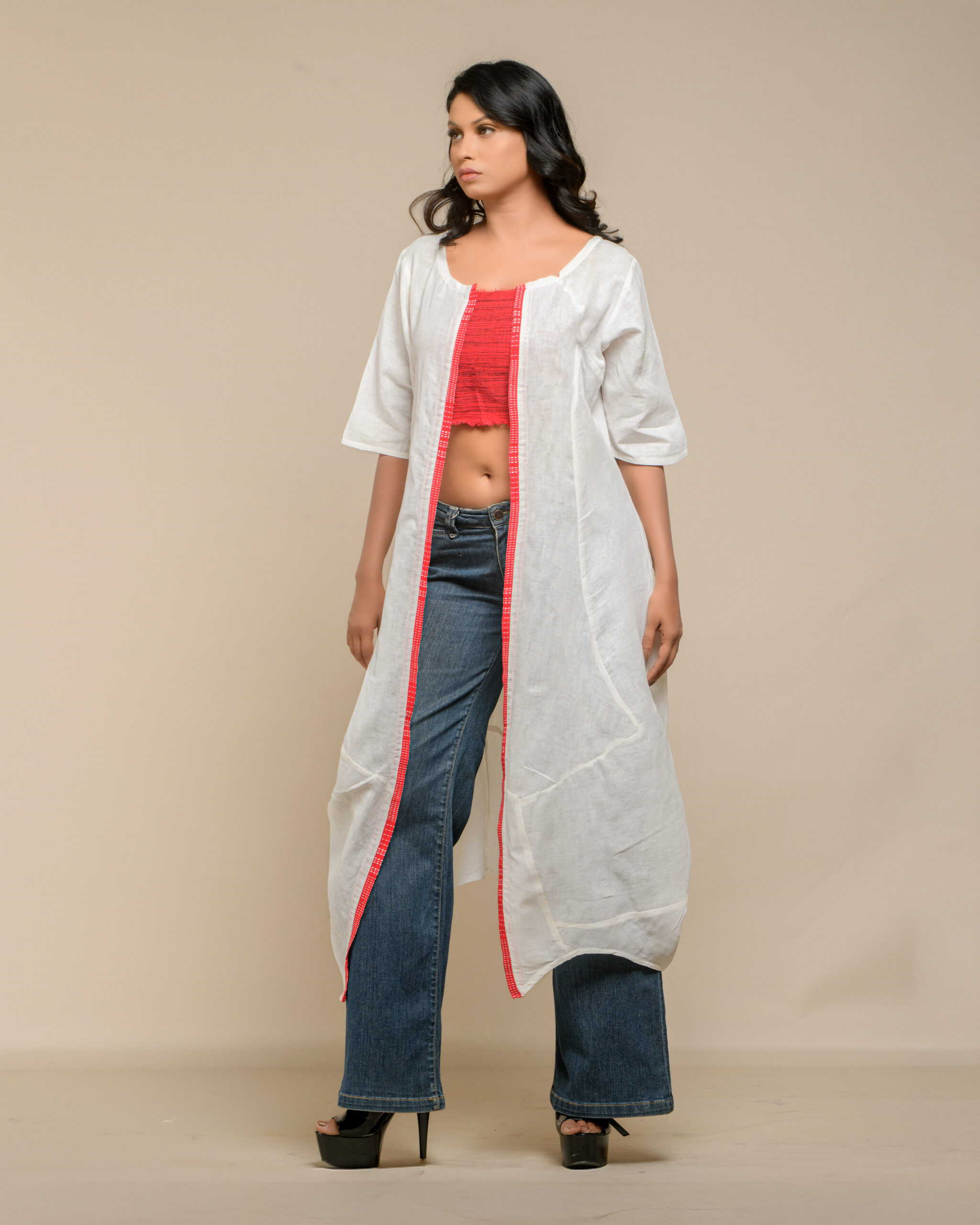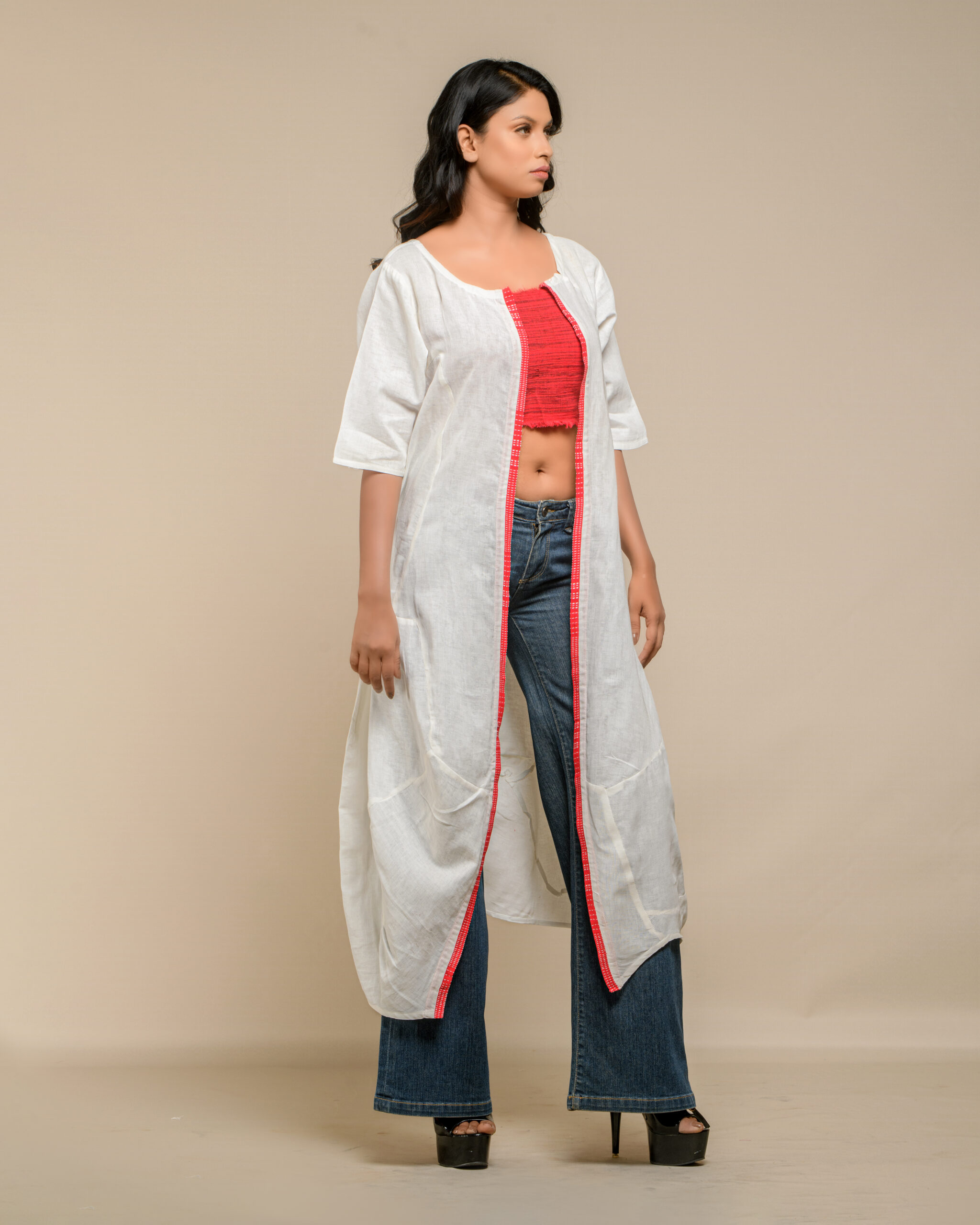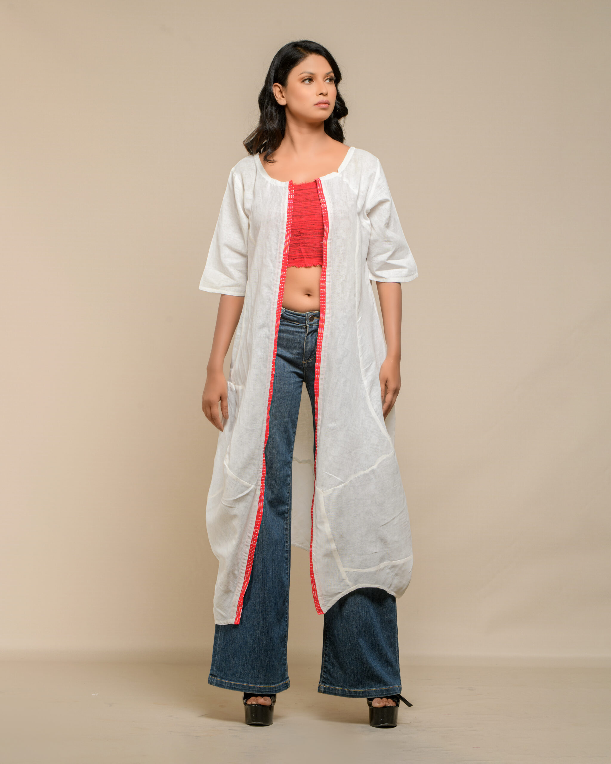 This lightweight handloom shrug is crafted from ultra-light, breathable fabric and features a vibrant red fabric piping along the opening for a sharp, modern contrast. The unique pattern and cut give it a subtle balloon-like look at the bottom, making this Western-style piece the perfect Gen Z-friendly layering essential for a breezy, contemporary look.