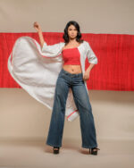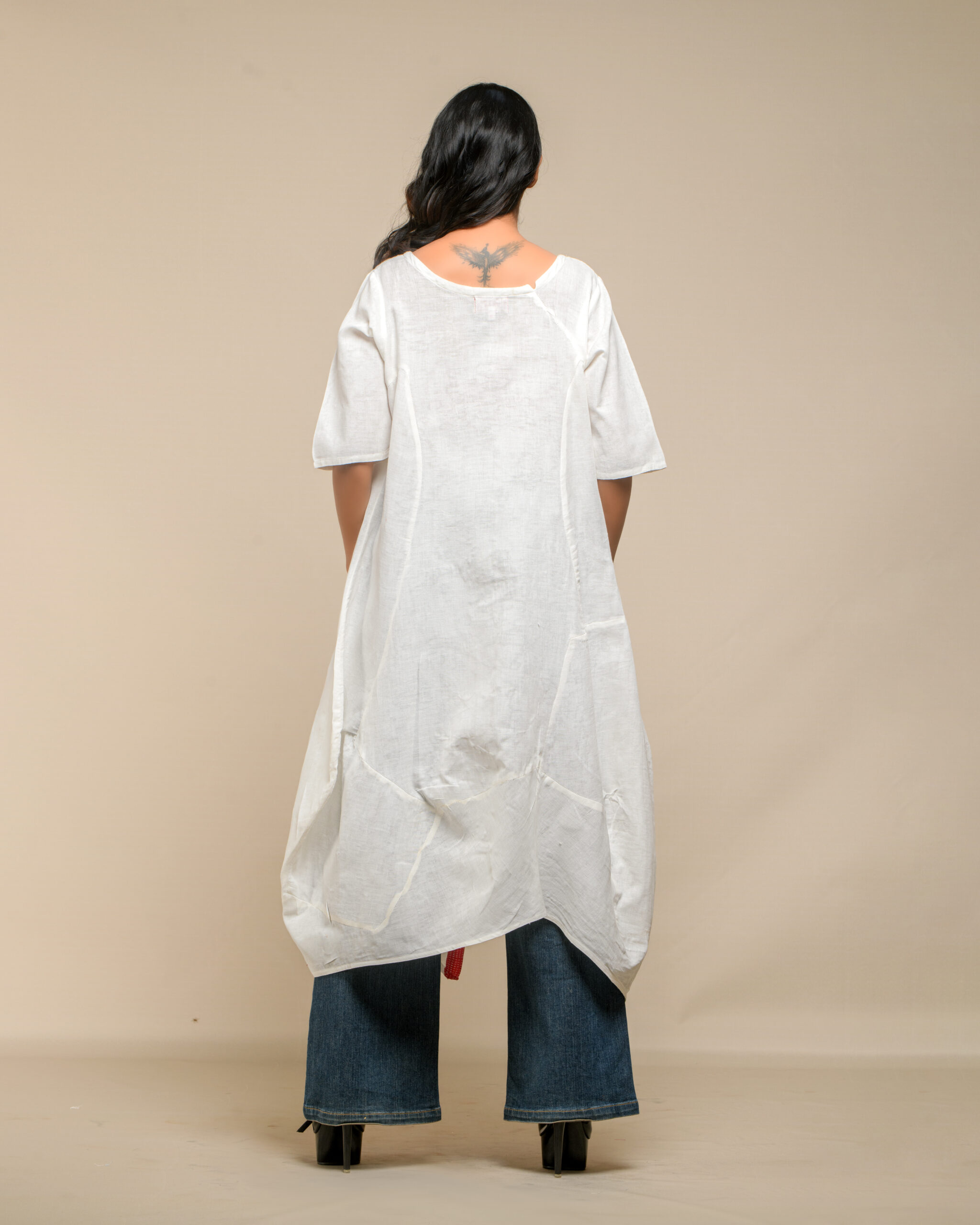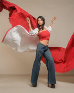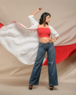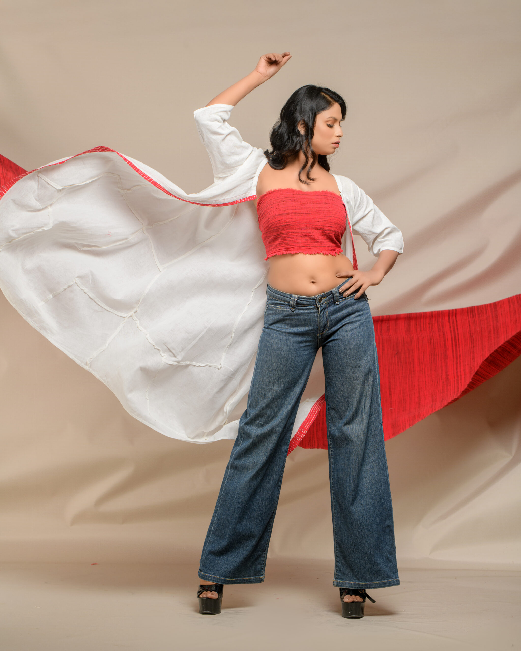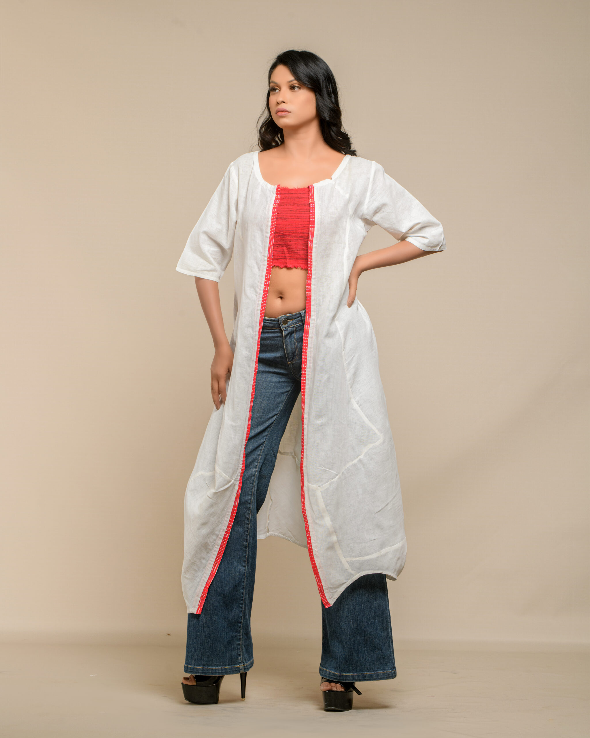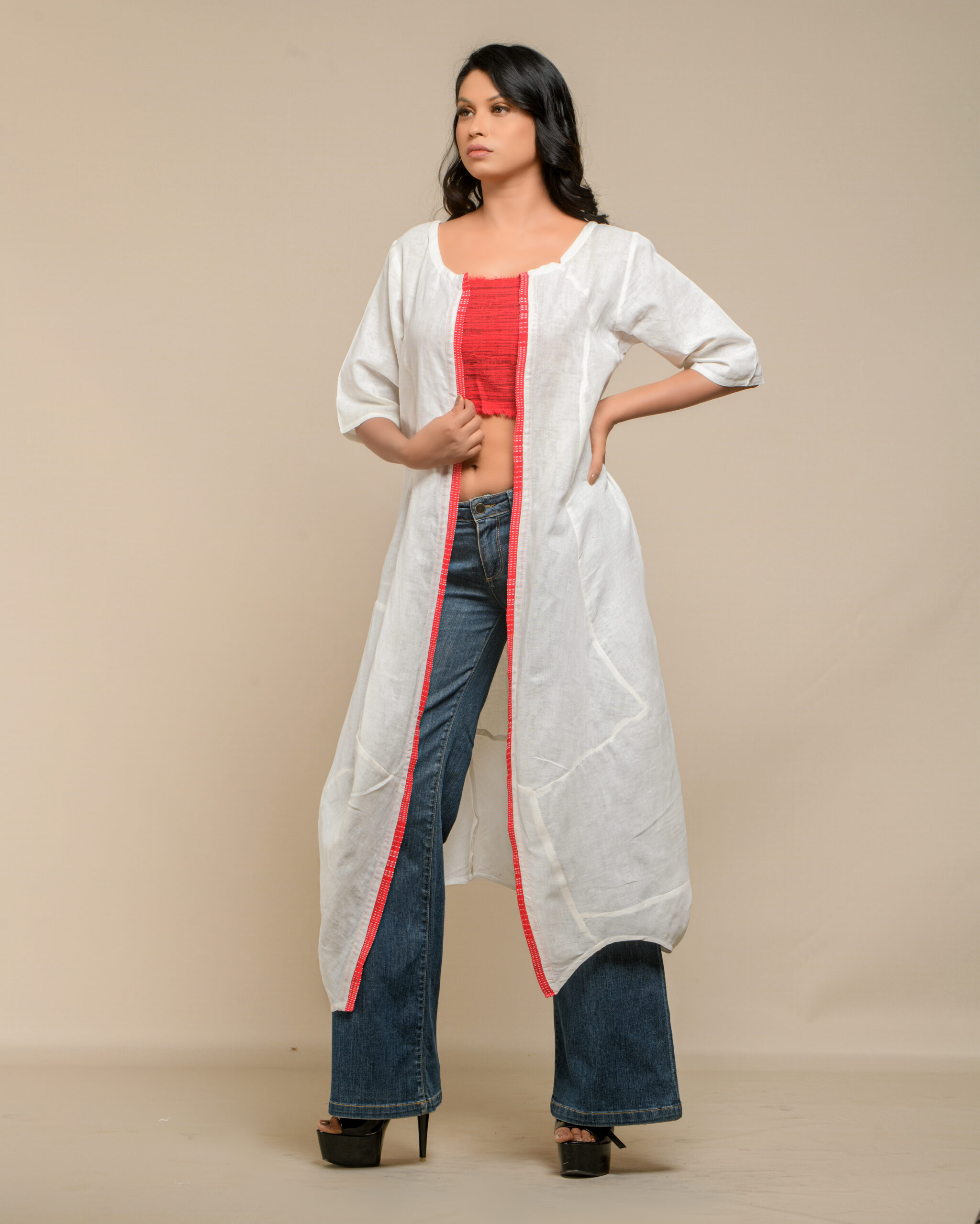 This lightweight handloom shrug is crafted from ultra-light, breathable fabric and features a vibrant red fabric piping along the opening for a sharp, modern contrast. The unique pattern and cut give it a subtle balloon-like look at the bottom, making this Western-style piece the perfect Gen Z-friendly layering essential for a breezy, contemporary look.
