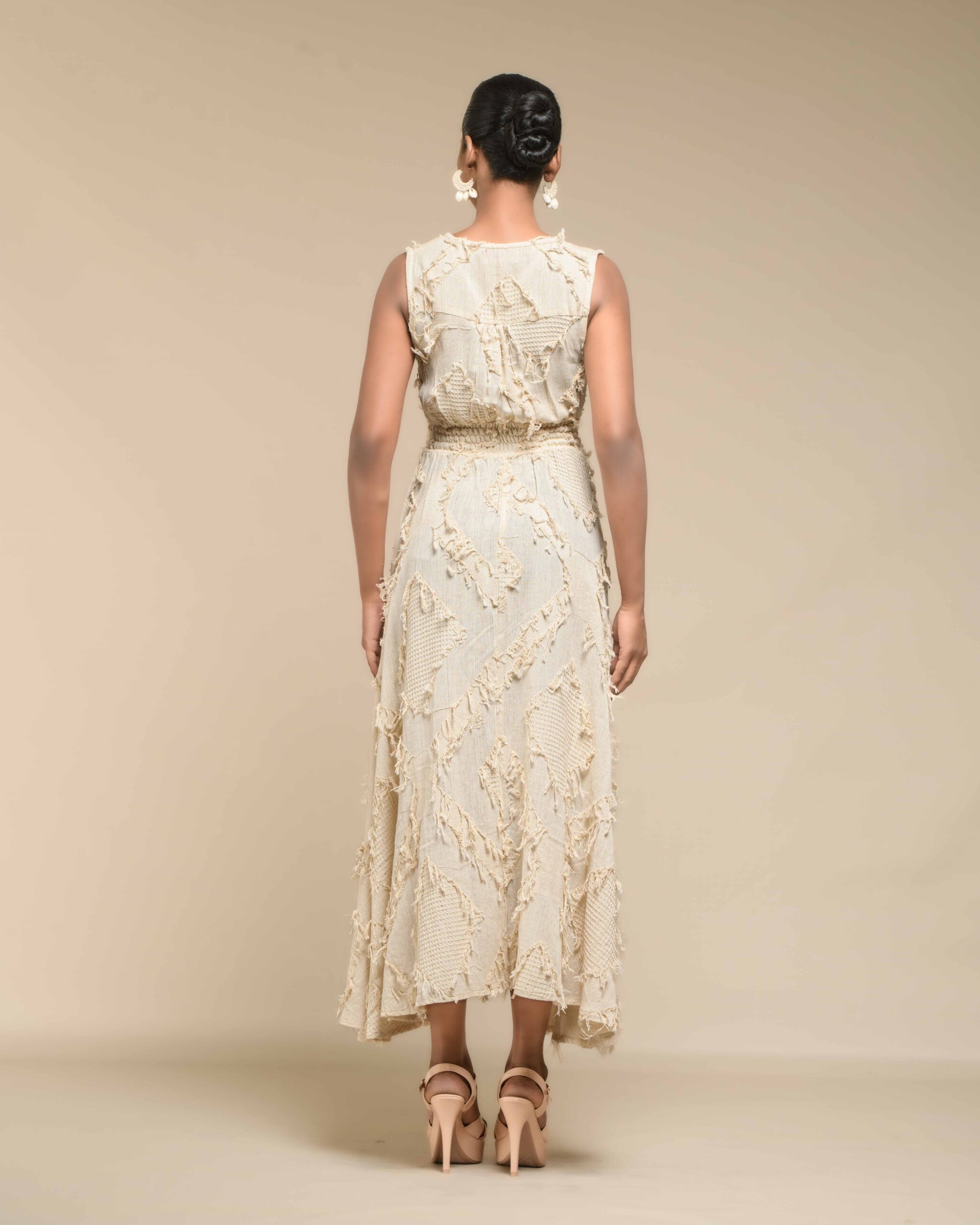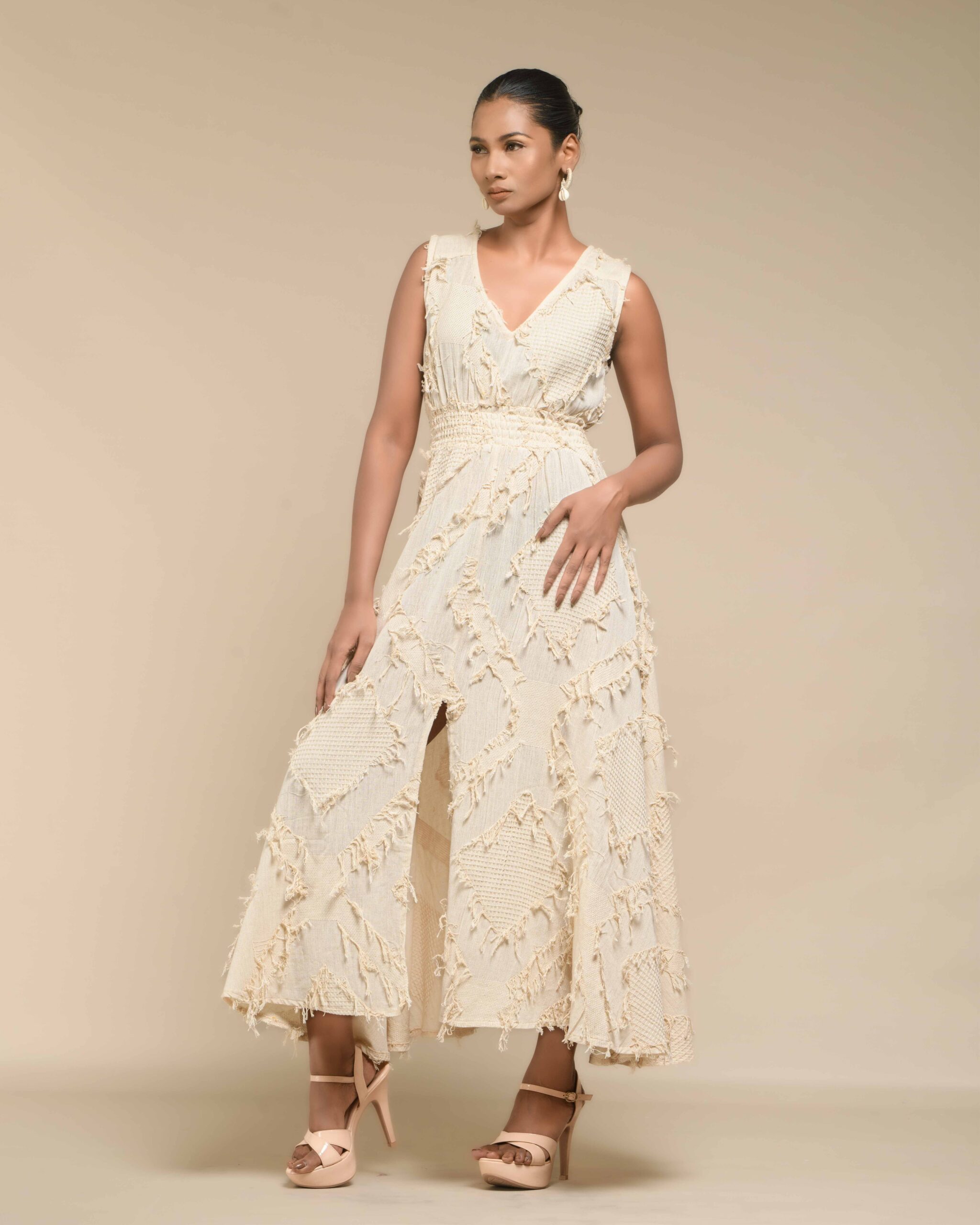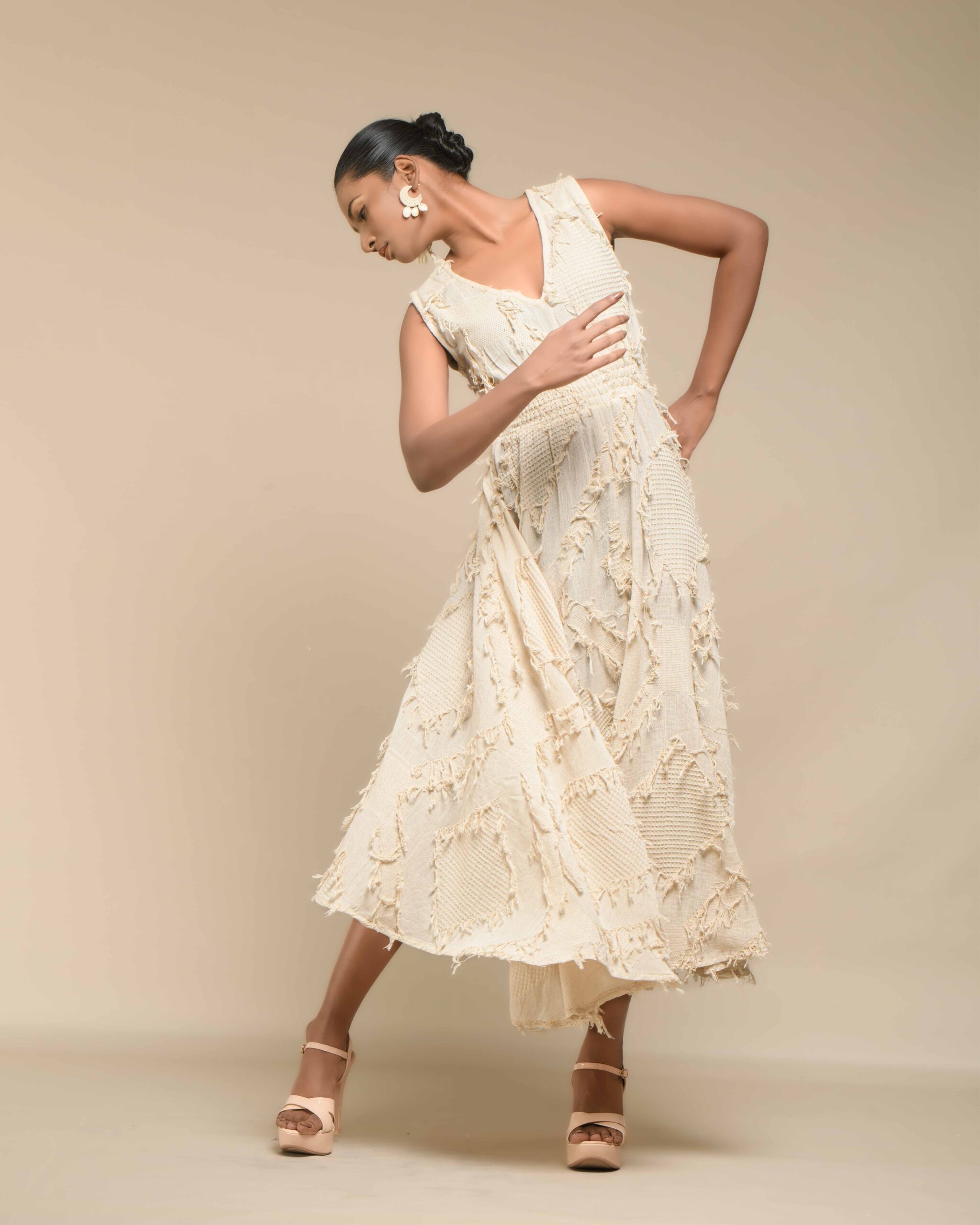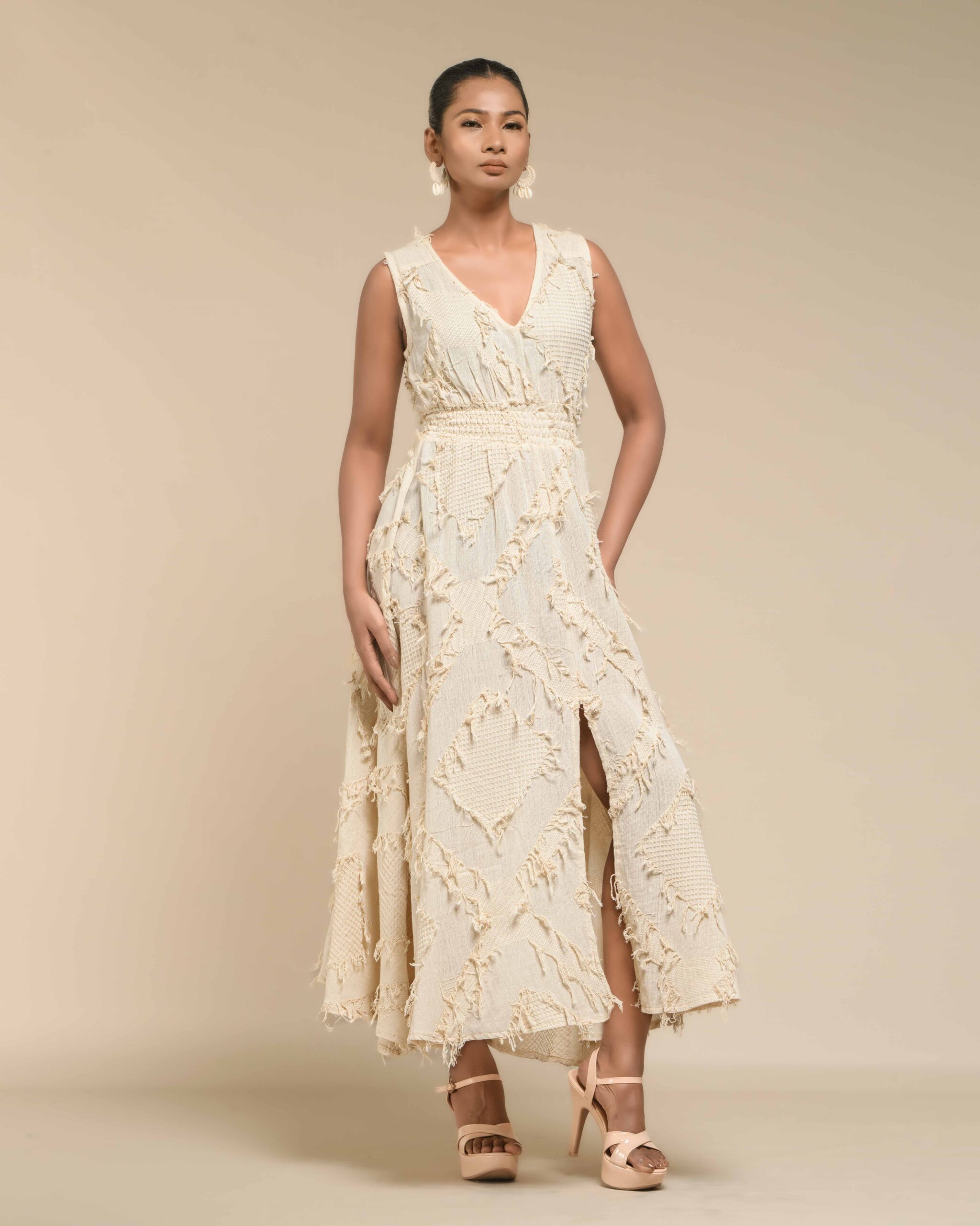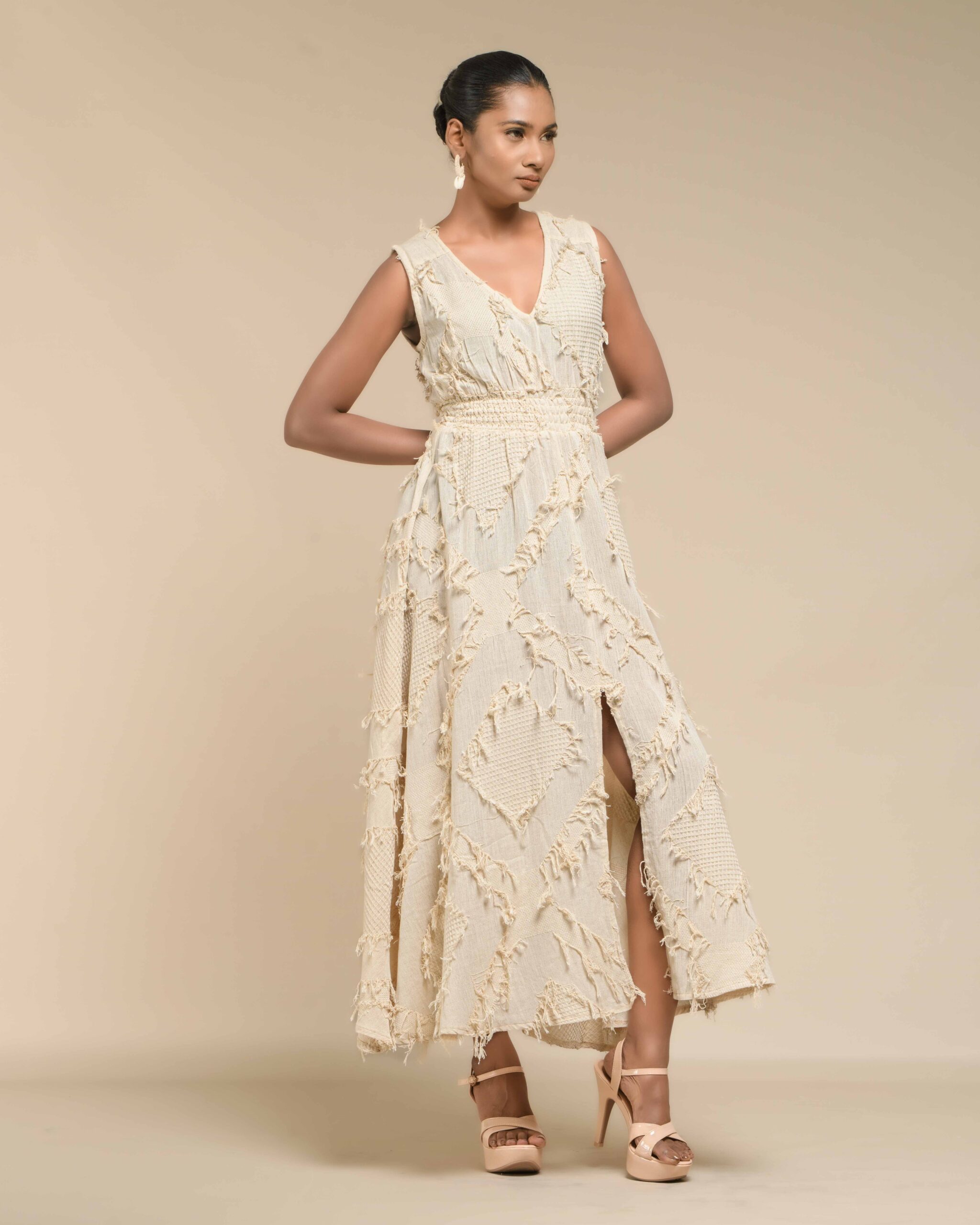 A true statement in artisanal luxury, this long Handloom cotton dress showcases our USP fringed and textured fabric, creating dynamic surface dimension.