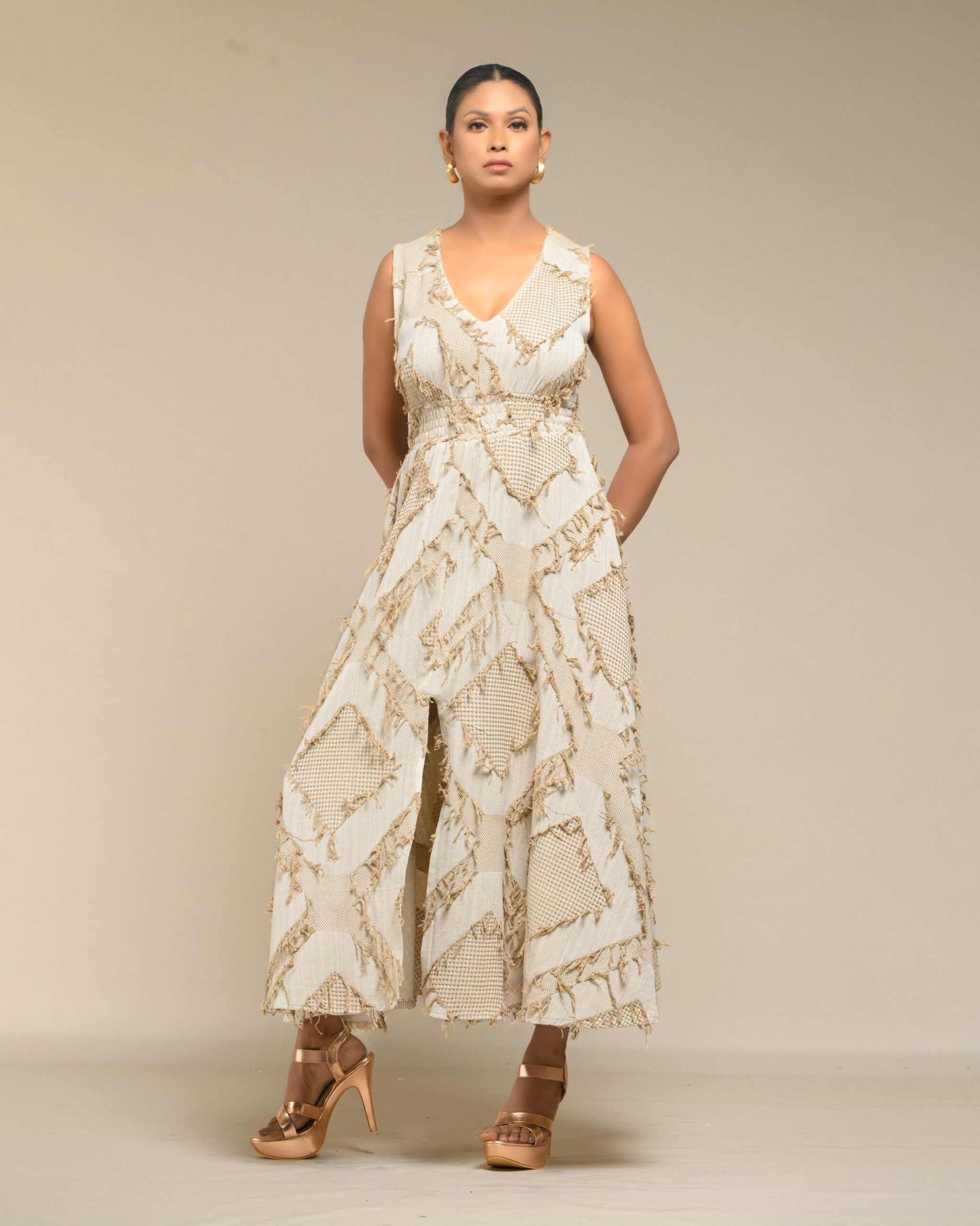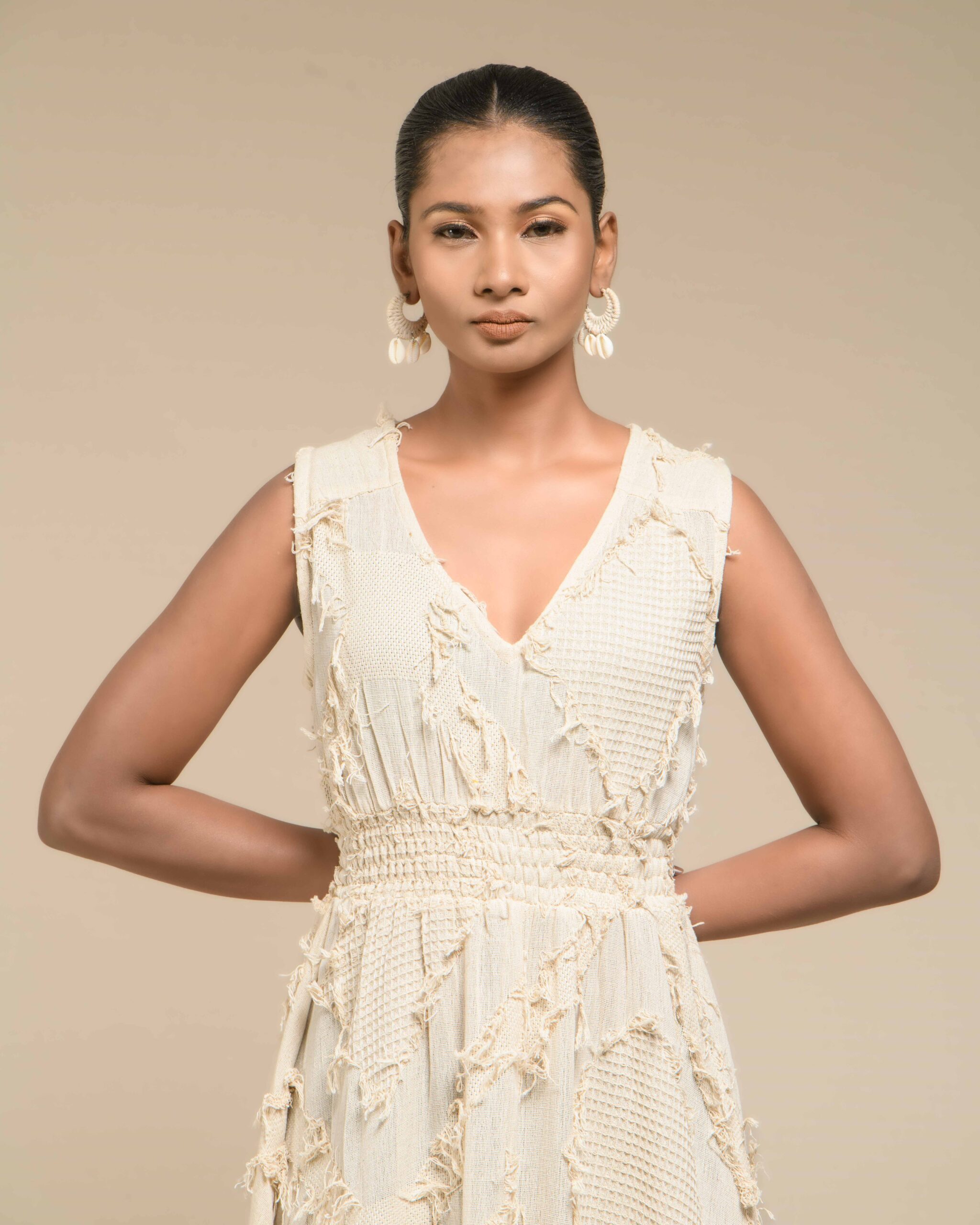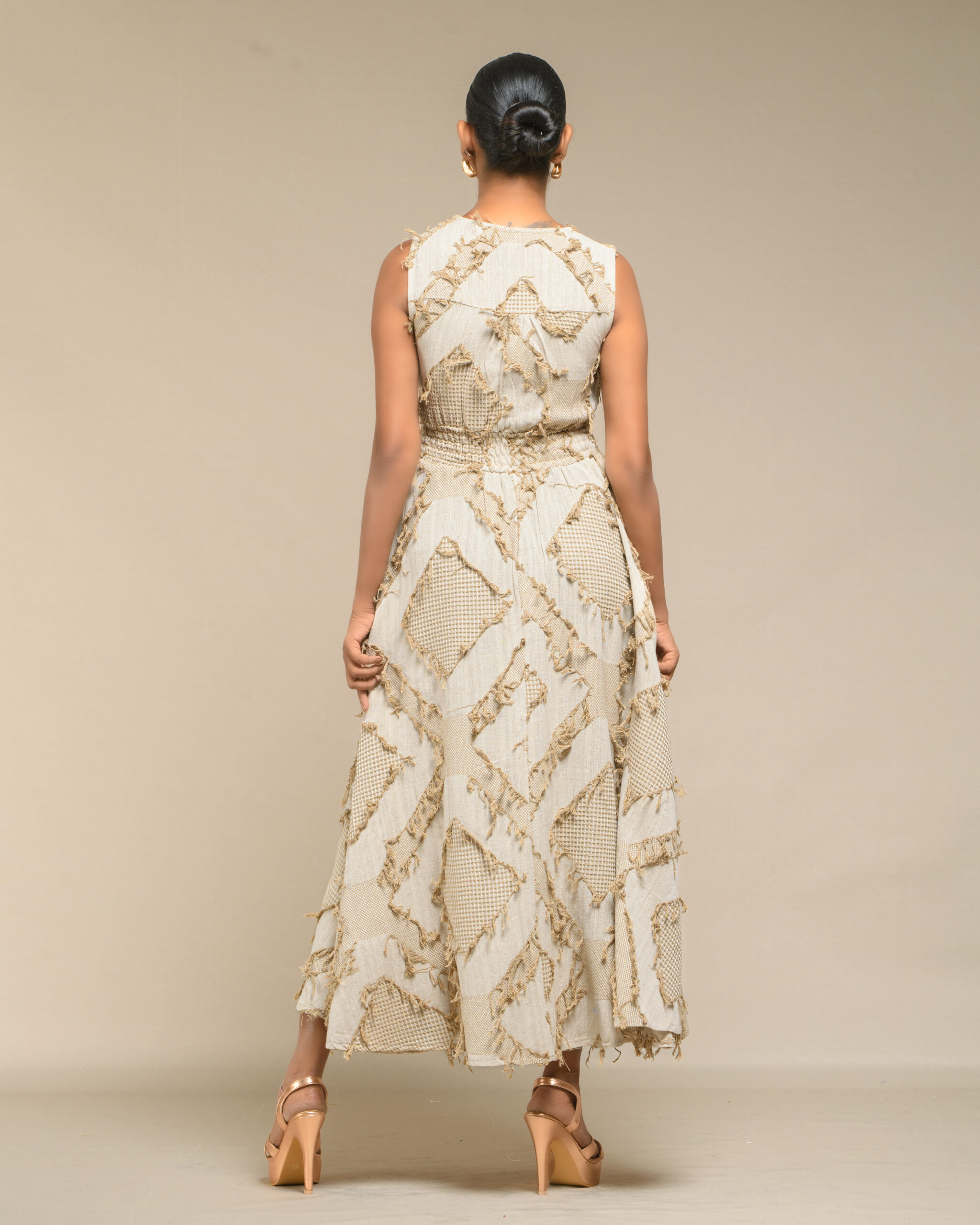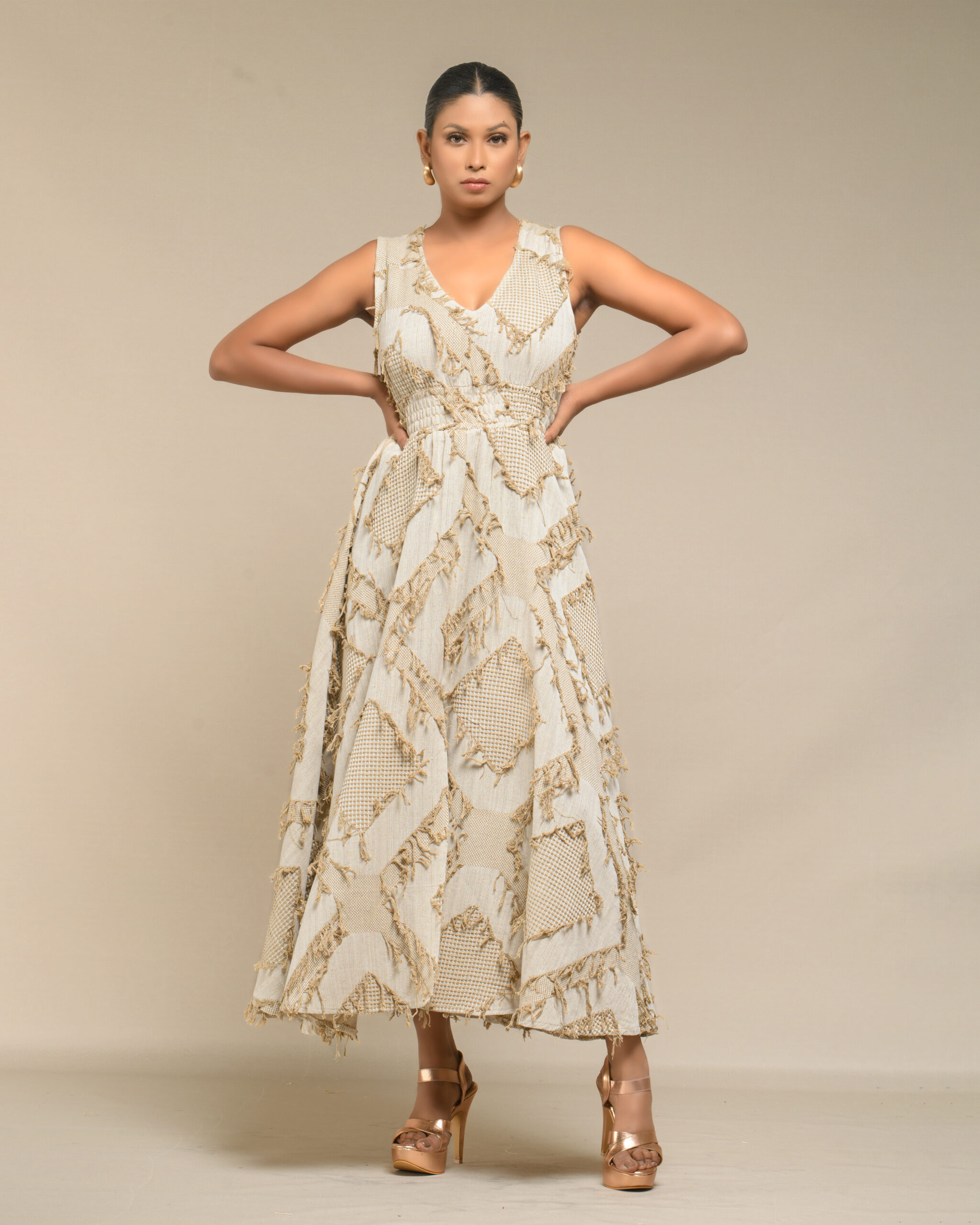 A true statement in artisanal luxury, this long Handloom cotton dress showcases our USP fringed and textured fabric, creating dynamic surface dimension.