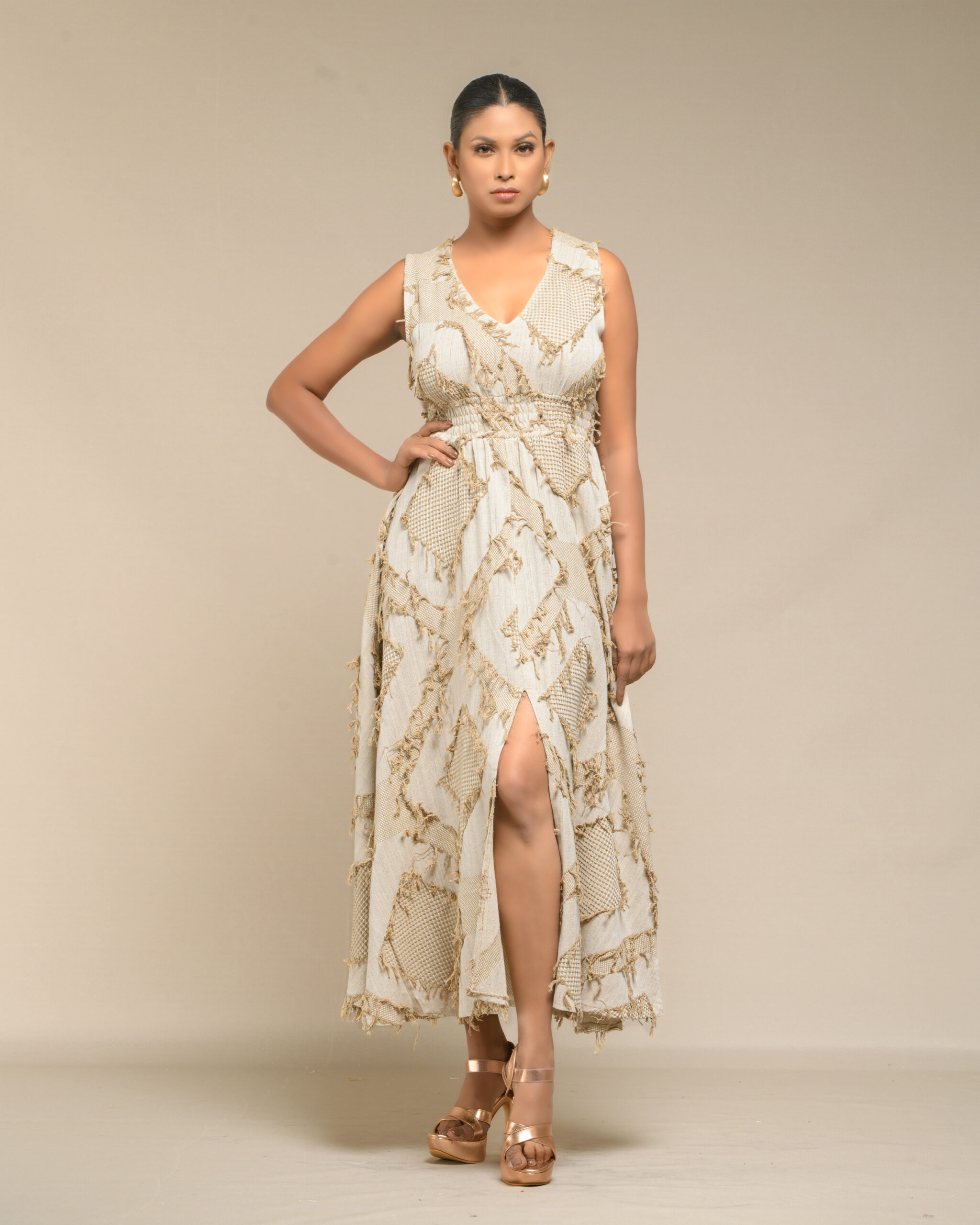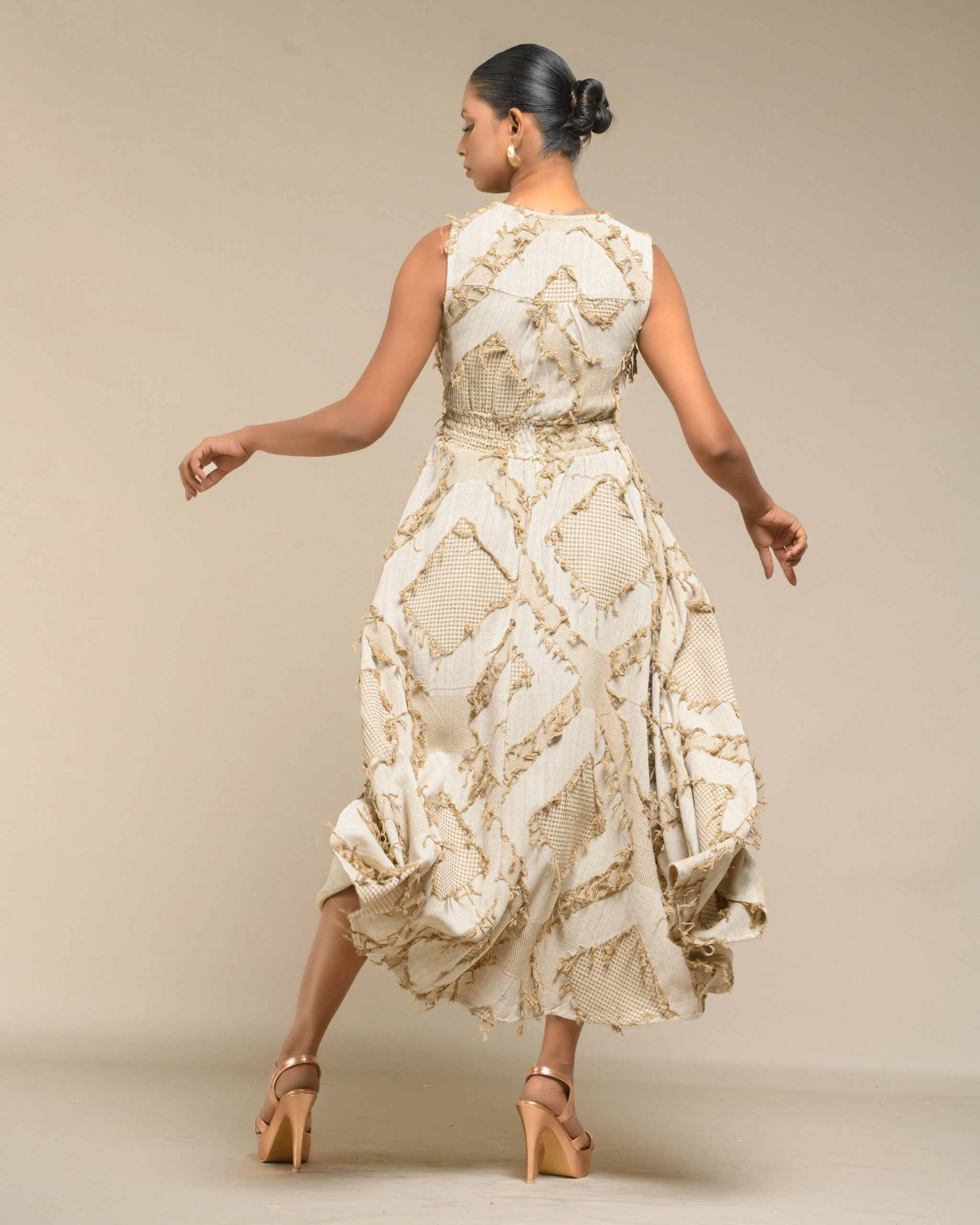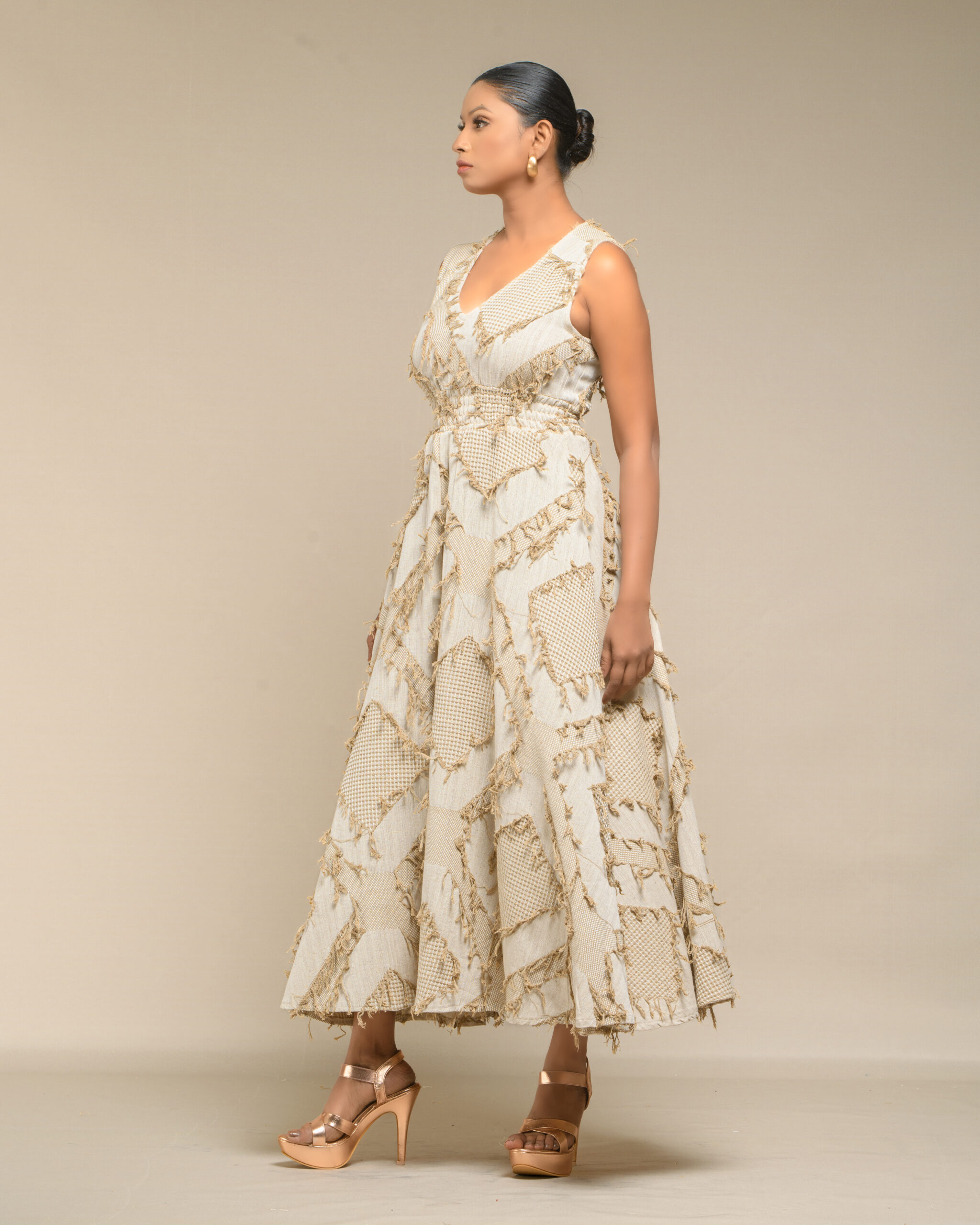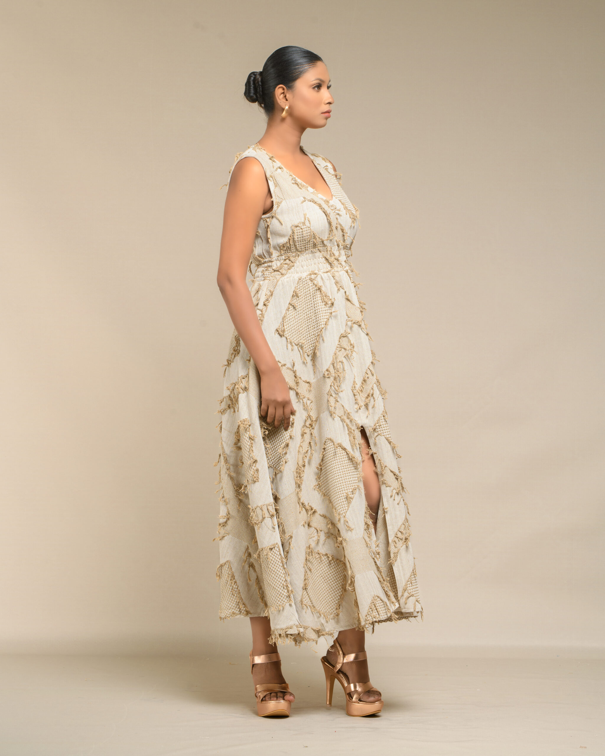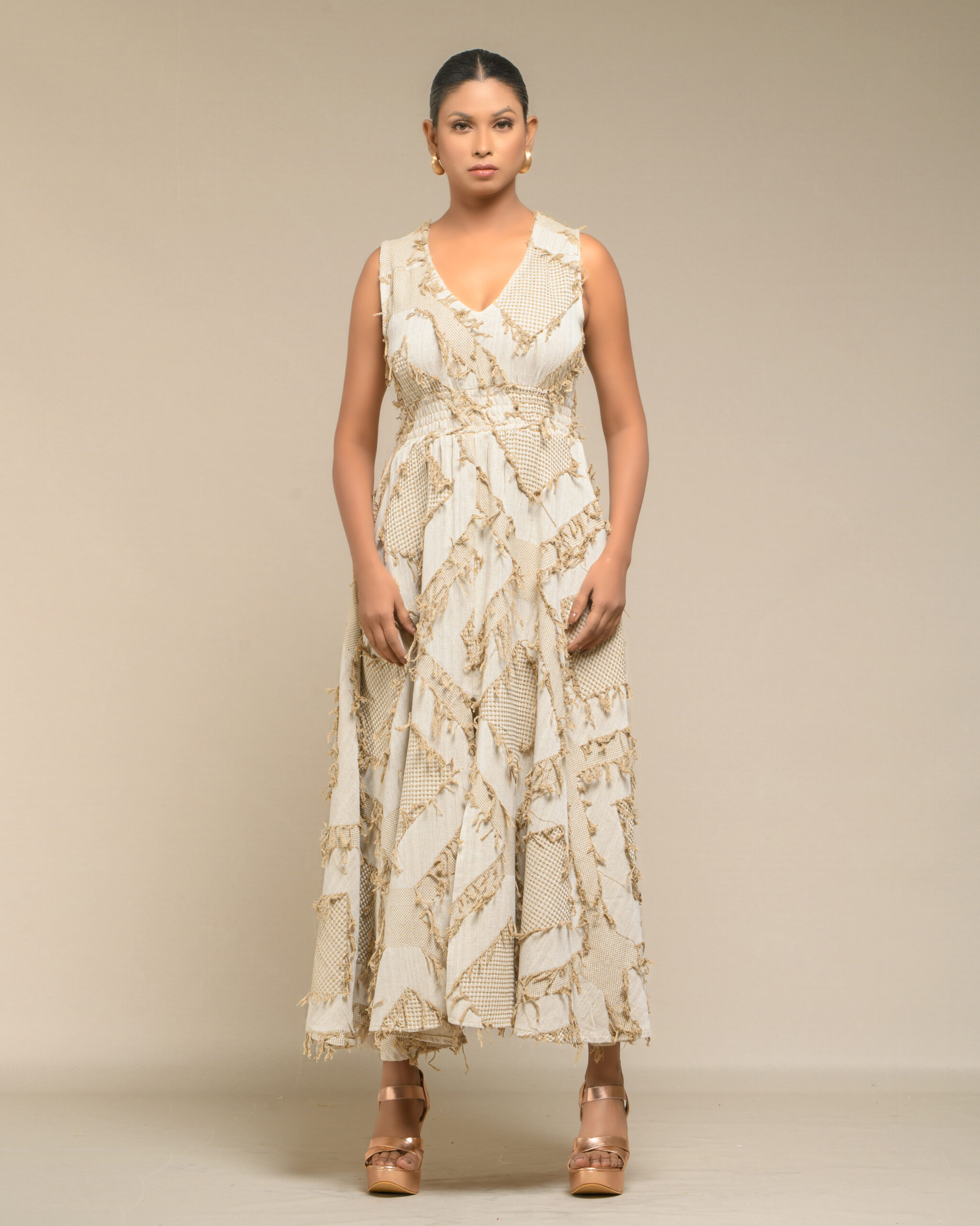 A true statement in artisanal luxury, this long Handloom cotton dress showcases our USP fringed and textured fabric, creating dynamic surface dimension.
