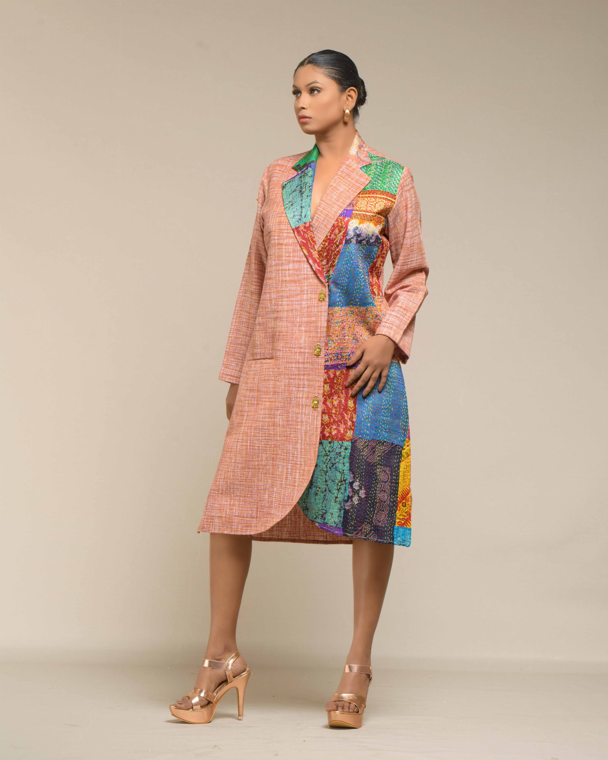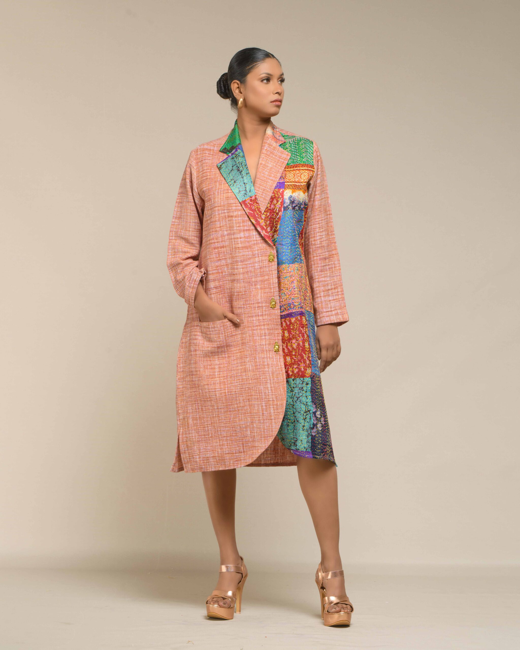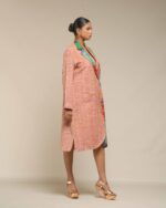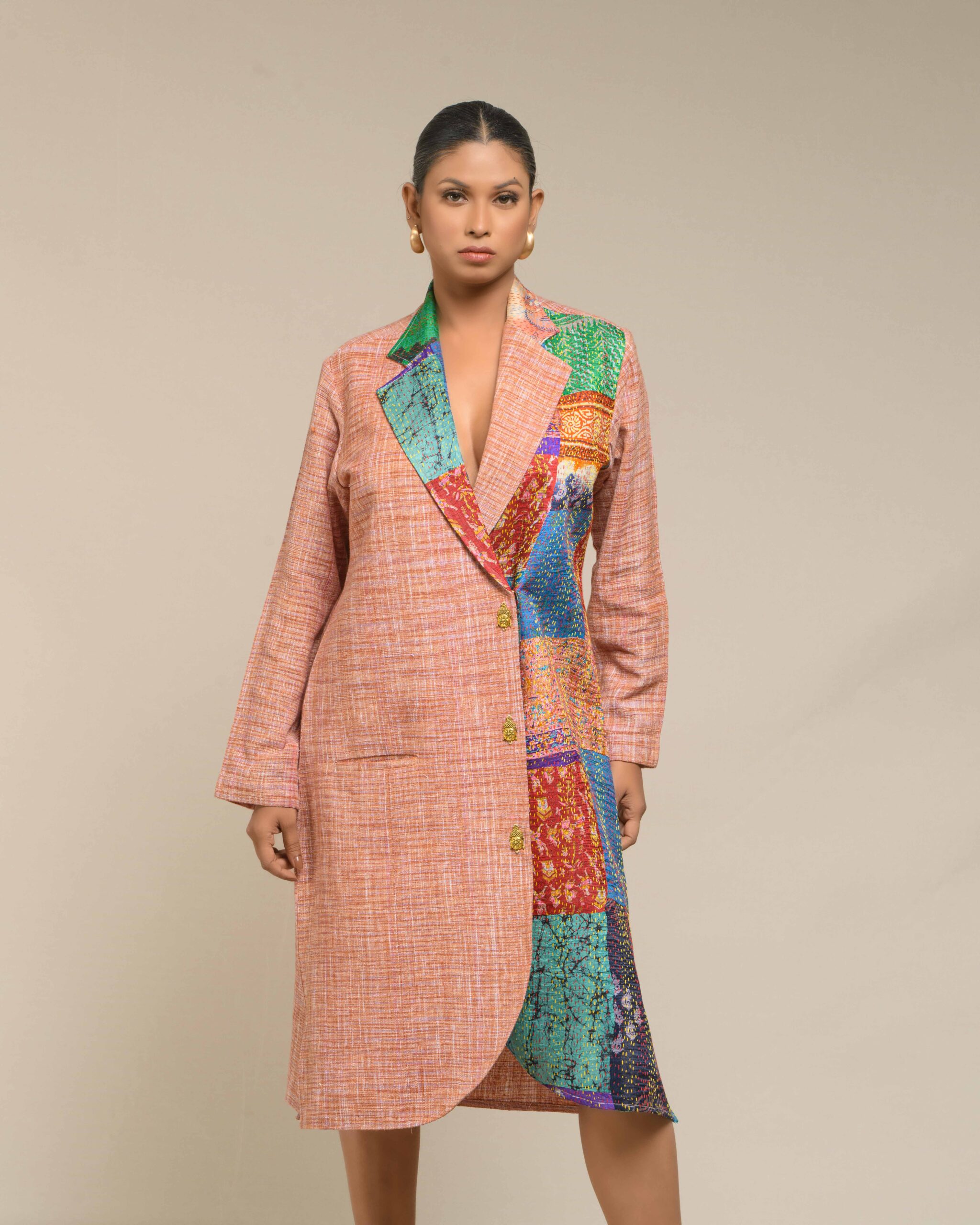 A pure symbol of luxury and sophisticated fashion, this fused coat style dress is crafted from pure, light weight Khaddar Khadi in a sharp, classy, knee-length silhouette. This is a limited edition design, defined by its extensive handwork and unique artistry: vibrant multicolor Kantha patches embellish one side, creating a unique, fashionable fusion that requires significant time and artisanal skill to make.