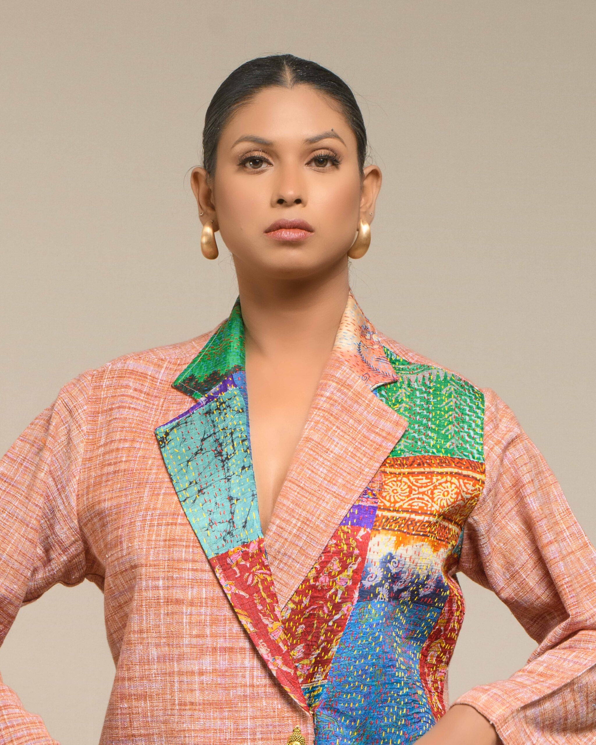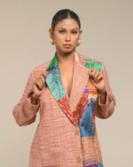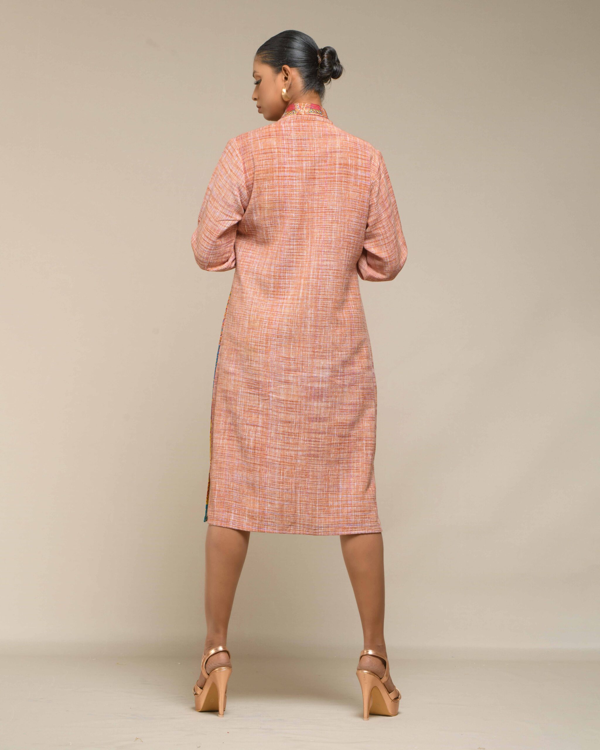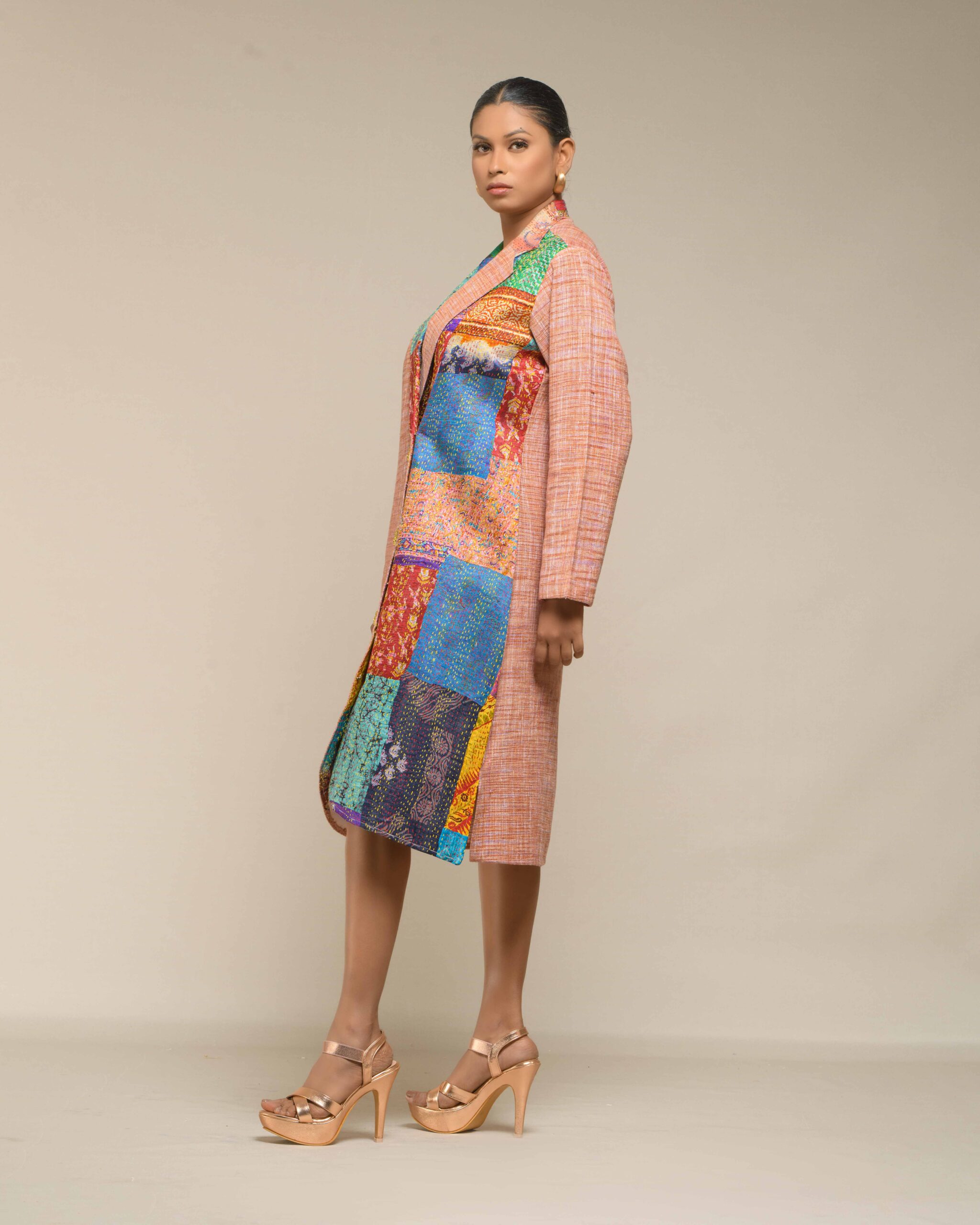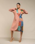 A pure symbol of luxury and sophisticated fashion, this fused coat style dress is crafted from pure, light weight Khaddar Khadi in a sharp, classy, knee-length silhouette. This is a limited edition design, defined by its extensive handwork and unique artistry: vibrant multicolor Kantha patches embellish one side, creating a unique, fashionable fusion that requires significant time and artisanal skill to make.